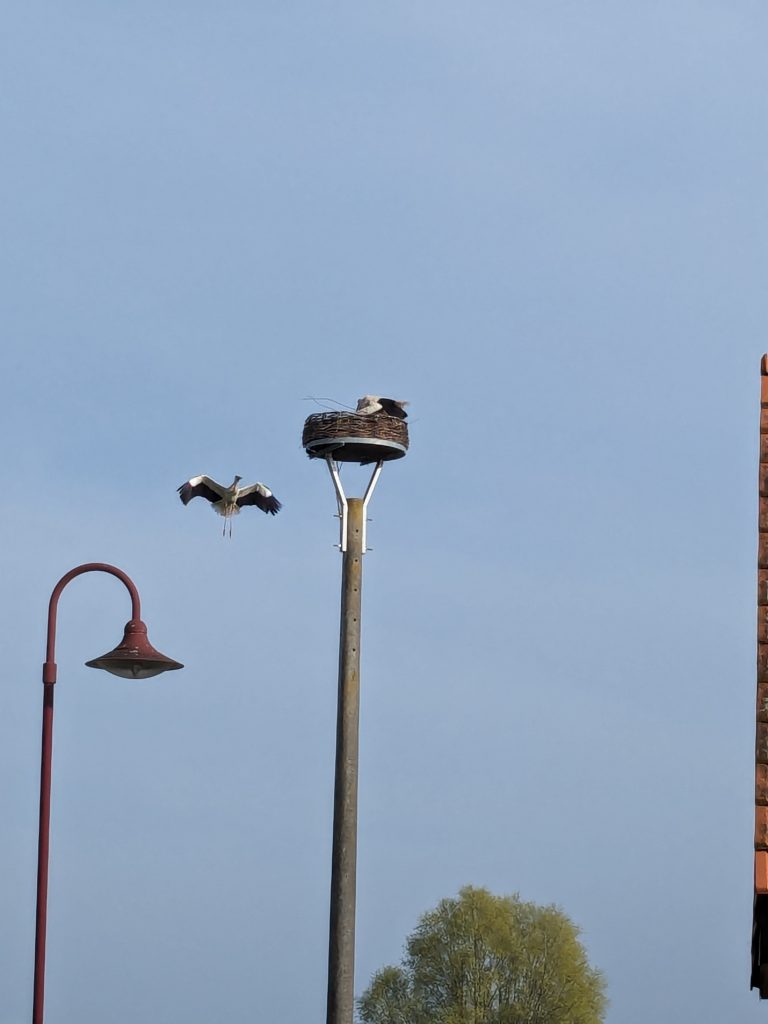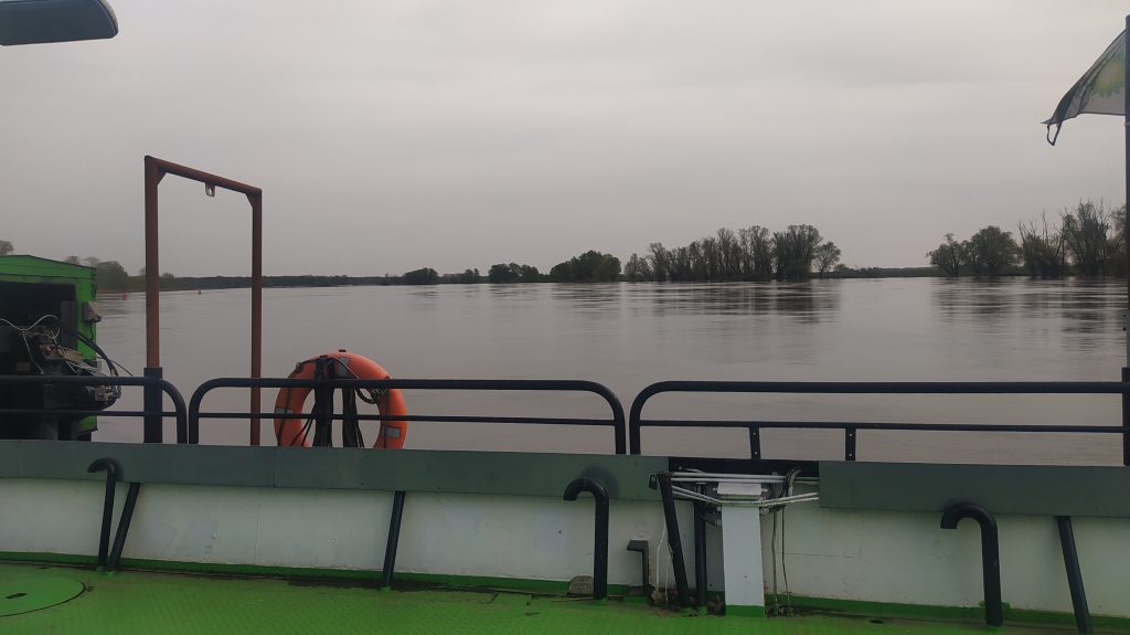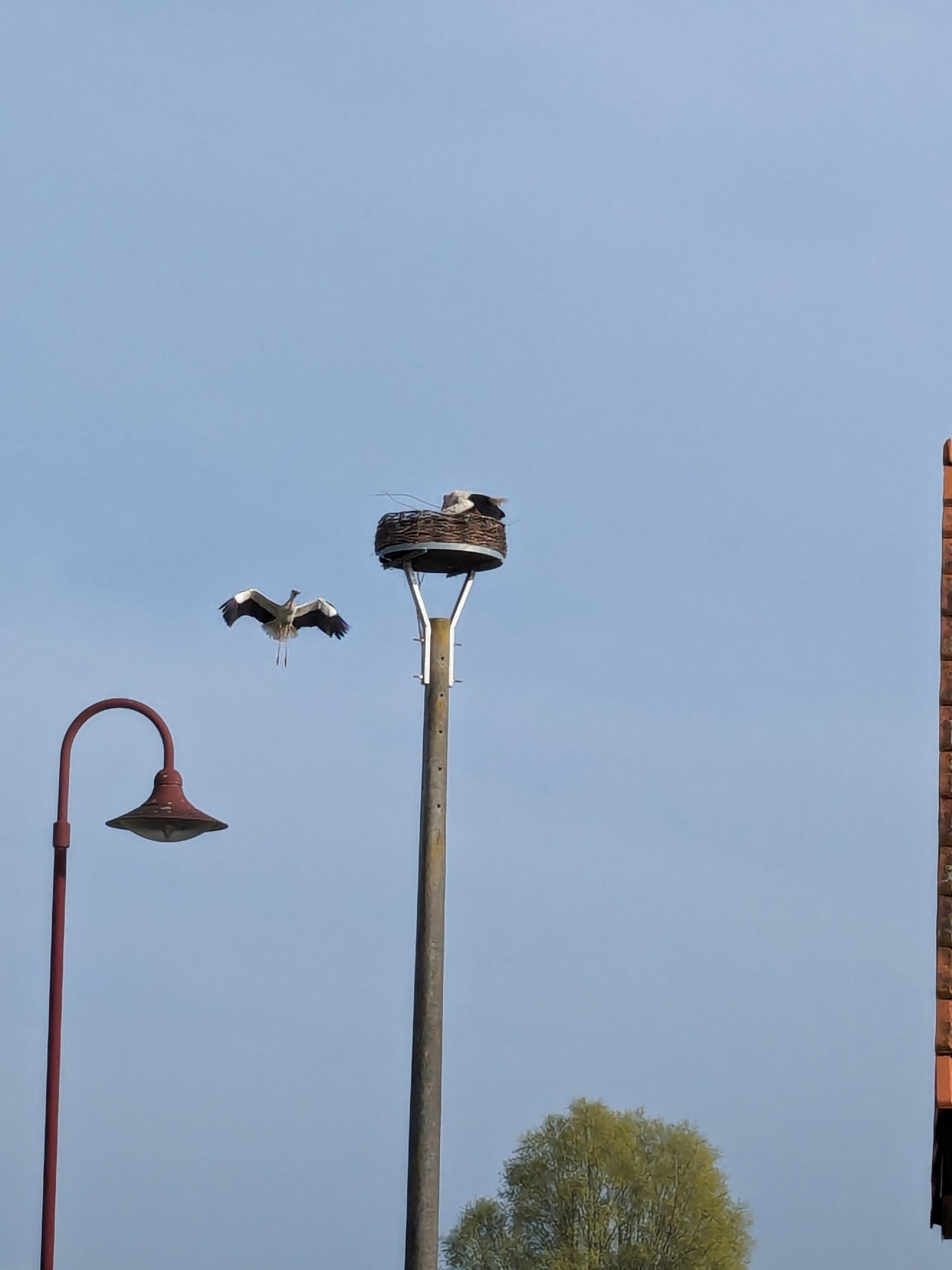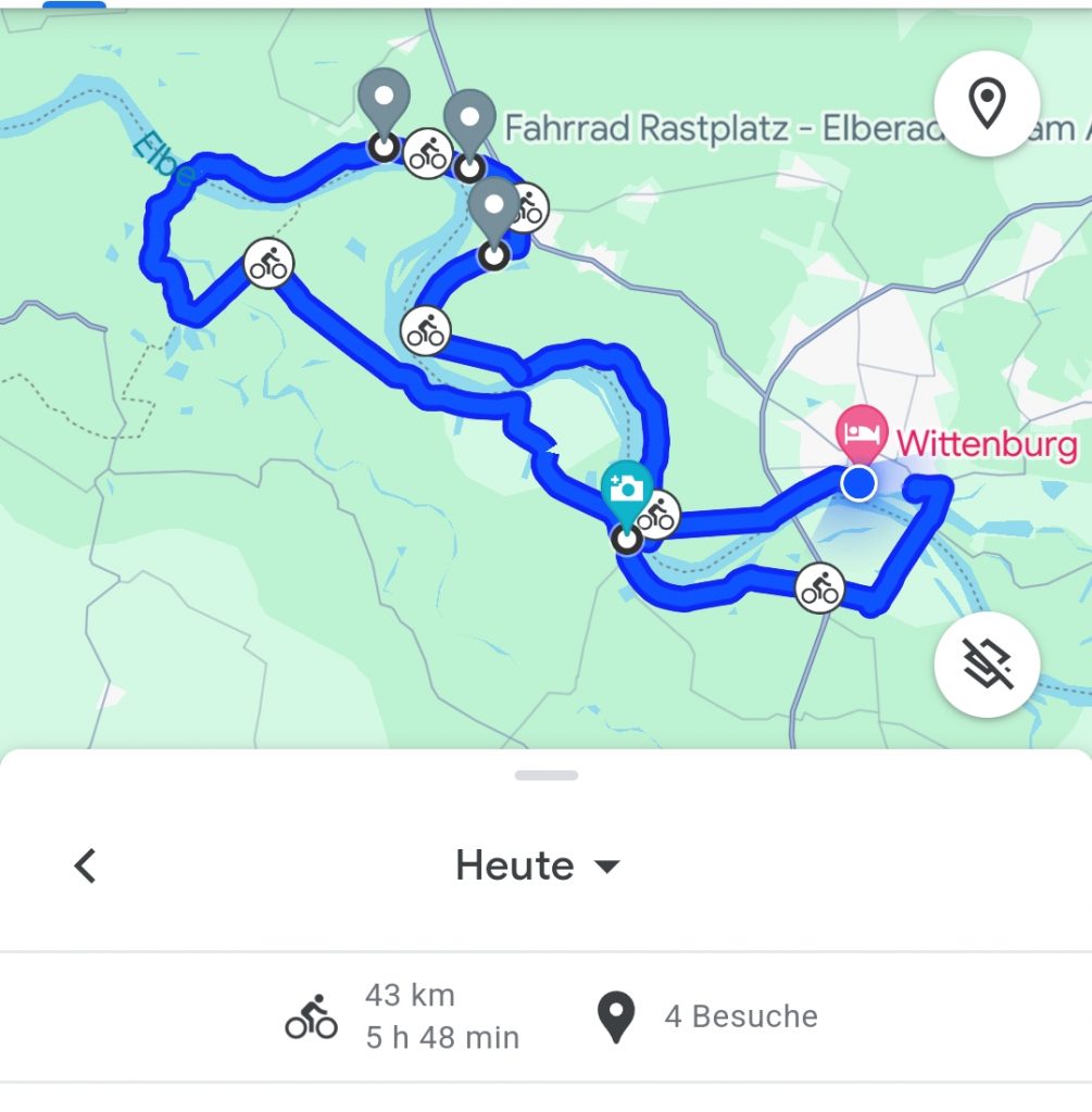 Nach dem Frühstück geht es mit den Rädern auf dem Elbe-Radweg stromabwärts. Zu Gucken gibt es ganz viel Elbe, nasse Wiesen und Vögel. Zwischendurch immer mal wieder ein Geocache. Dass man teilweise eine Powerbank braucht, hatten wir noch nicht. Nach 21 km erreichen wir Schnackenburg. Hier setzen wir mit der Fähre für 4 Euro über die Elbe und radeln auf der anderen Seite zurück. Oder versuchen es zumindest, zunächst einmal stehen wir vor einer Baustelle. Hier hat wohl das Hochwasser zugeschlagen, unseren Weg gibt es nicht mehr. Google weiss von nix. Dann schlägt er vor, bitte wenden! Mit der Fähre zurück und alles Retour. Nein danke. Wir studieren die Karten und fahren dann einen Umweg, aber wir kommen irgendwann, nach einem Espresso to Go auf der Wiese, wieder auf unseren Weg. Leider ist der größtenteils aus guten DDR-Betonplatten und wir werden ordentlich durchgeschüttelt.  Im Storchendorf Wahrenberg gibt es Störche (sie sind schon da), und ein Apfelkuchen und Rhabarberschorle lädt zu einer Pause ein. Dann geht es weiter. Irgendwann ist der Weg zu Ende und wir tragen die Räder, wie Google befiehlt, über ein Hindernis 😉 . Nach 43 km sind wir um 18:30 Uhr wieder am Womo. Ach so, 15 Euro am Tag, darin enthalten 2,60 Entsorgung pro Tag plus Duschen, den Betrag konnten wir nicht genau ermitteln.