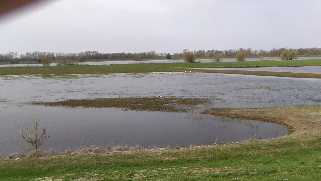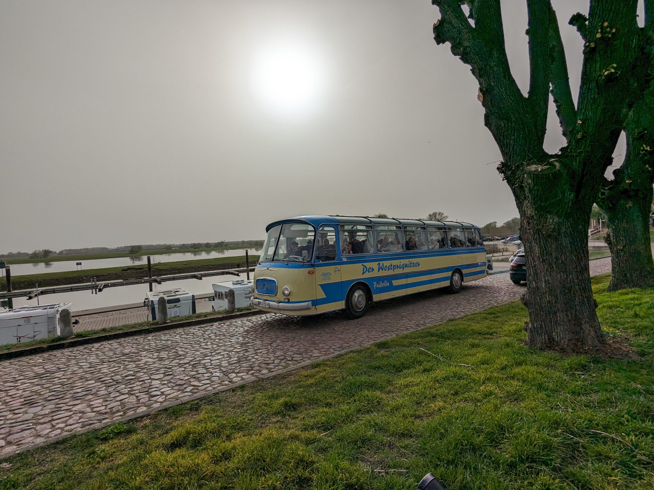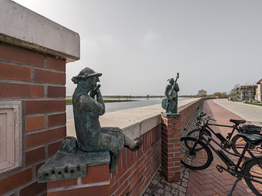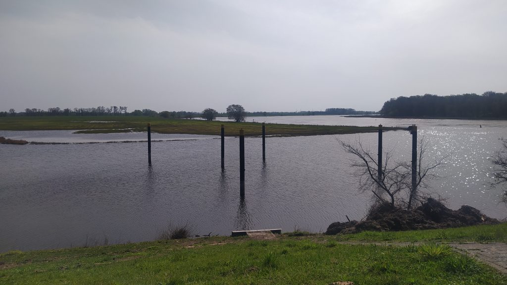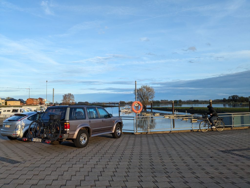 Nach dem Frühstück geht es mit den Rädern auf dem Elbe-Radweg stromabwärts. Zu Gucken gibt es ganz viel Elbe, nasse Wiesen und Vögel. Zwischendurch immer mal wieder ein Geocache. Dass man teilweise eine Powerbank braucht, hatten wir noch nicht. Nach 21 km erreichen wir Schnackenburg. Hier setzen wir mit der Fähre für 4 Euro über die Elbe und radeln auf der anderen Seite zurück. Oder versuchen es zumindest, zunächst einmal stehen wir vor einer Baustelle. Hier hat wohl das Hochwasser zugeschlagen, unseren Weg gibt es nicht mehr. Google weiss von nix. Dann schlägt er vor, bitte wenden! Mit der Fähre zurück und alles Retour. Nein danke. Wir studieren die Karten und fahren dann einen Umweg, aber wir kommen irgendwann, nach einem Espresso to Go auf der Wiese, wieder auf unseren Weg. Leider ist der größtenteils aus guten DDR-Betonplatten und wir werden ordentlich durchgeschüttelt.  Im Storchendorf Wahrenberg gibt es Störche (sie sind schon da), und ein Apfelkuchen und Rhabarberschorle lädt zu einer Pause ein. Dann geht es weiter. Irgendwann ist der Weg zu Ende und wir tragen die Räder, wie Google befiehlt, über ein Hindernis 😉 . Nach 43 km sind wir um 18:30 Uhr wieder am Womo. Ach so, 15 Euro am Tag, darin enthalten 2,60 Entsorgung pro Tag plus Duschen, den Betrag konnten wir nicht genau ermitteln.