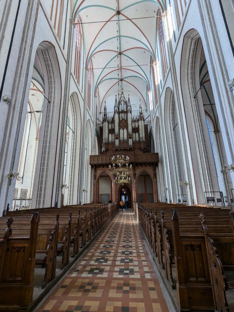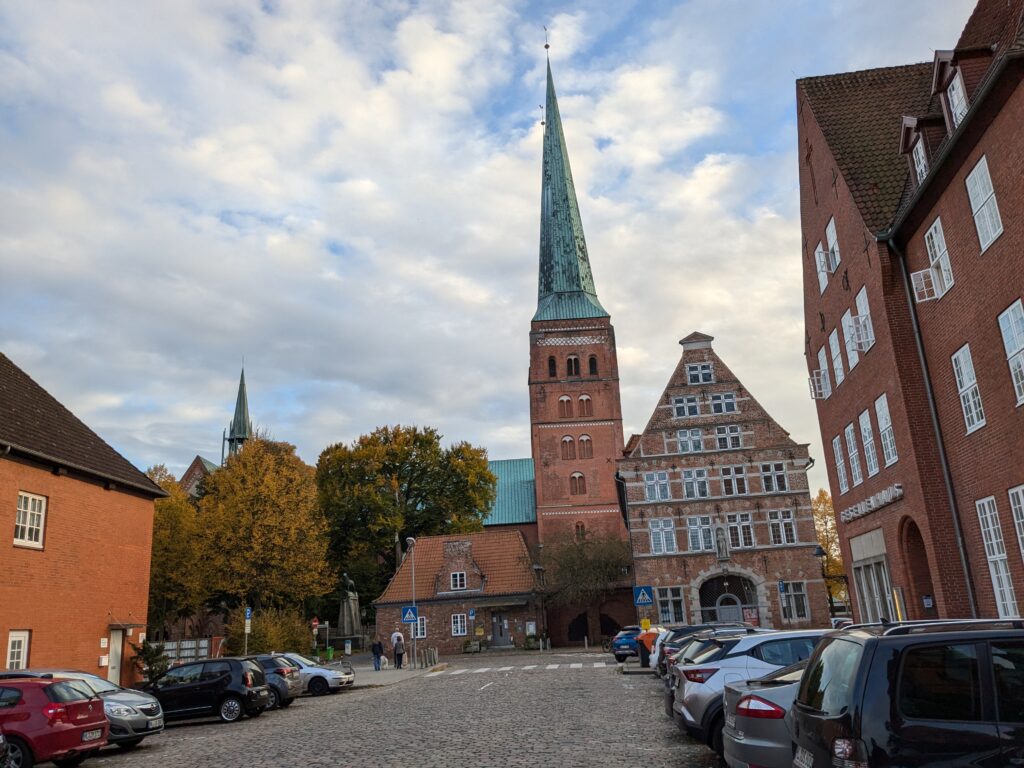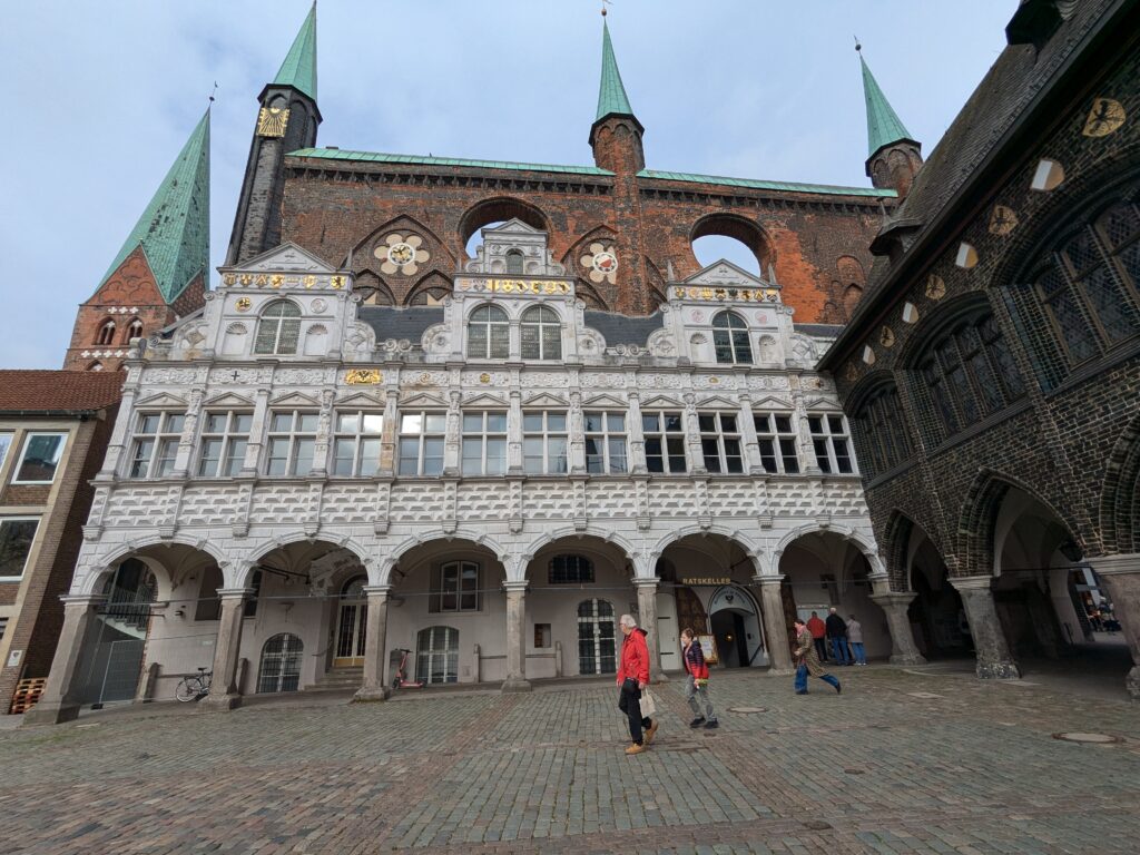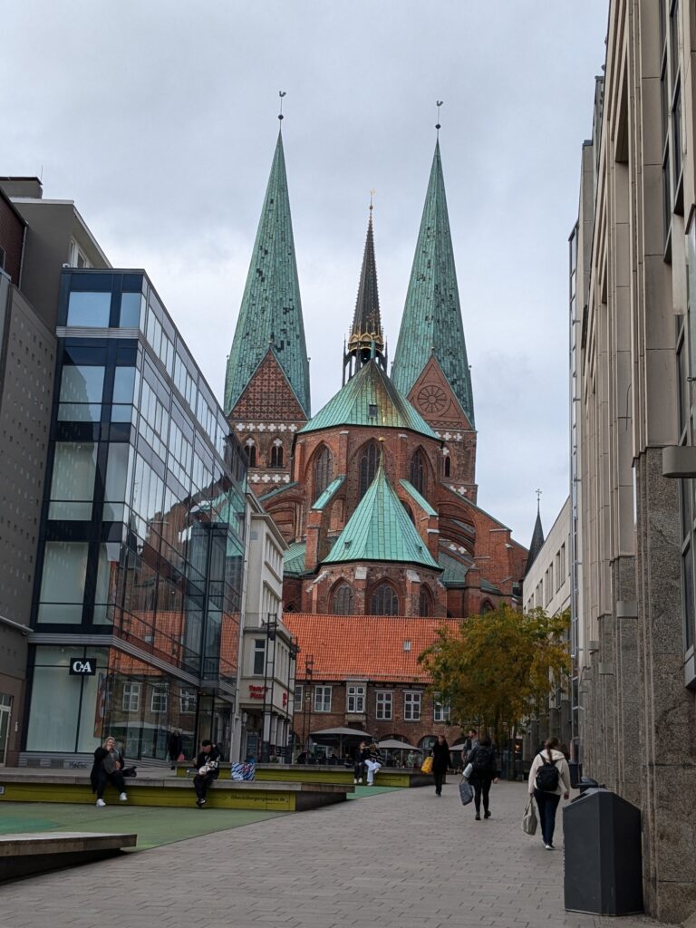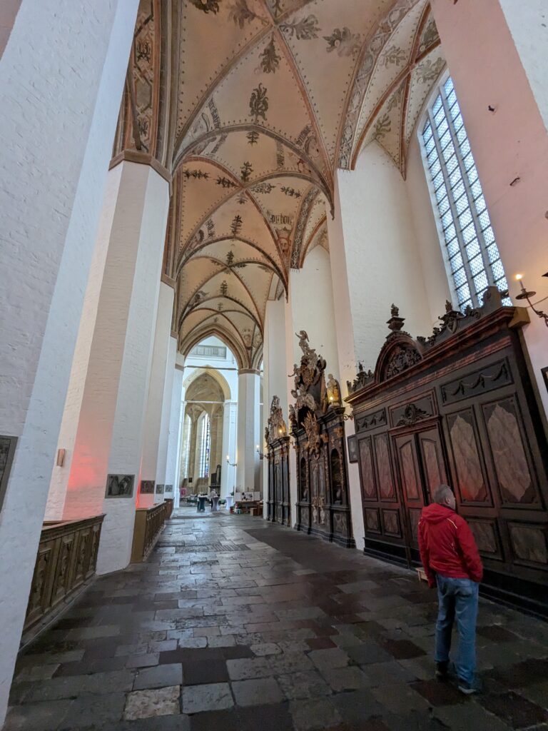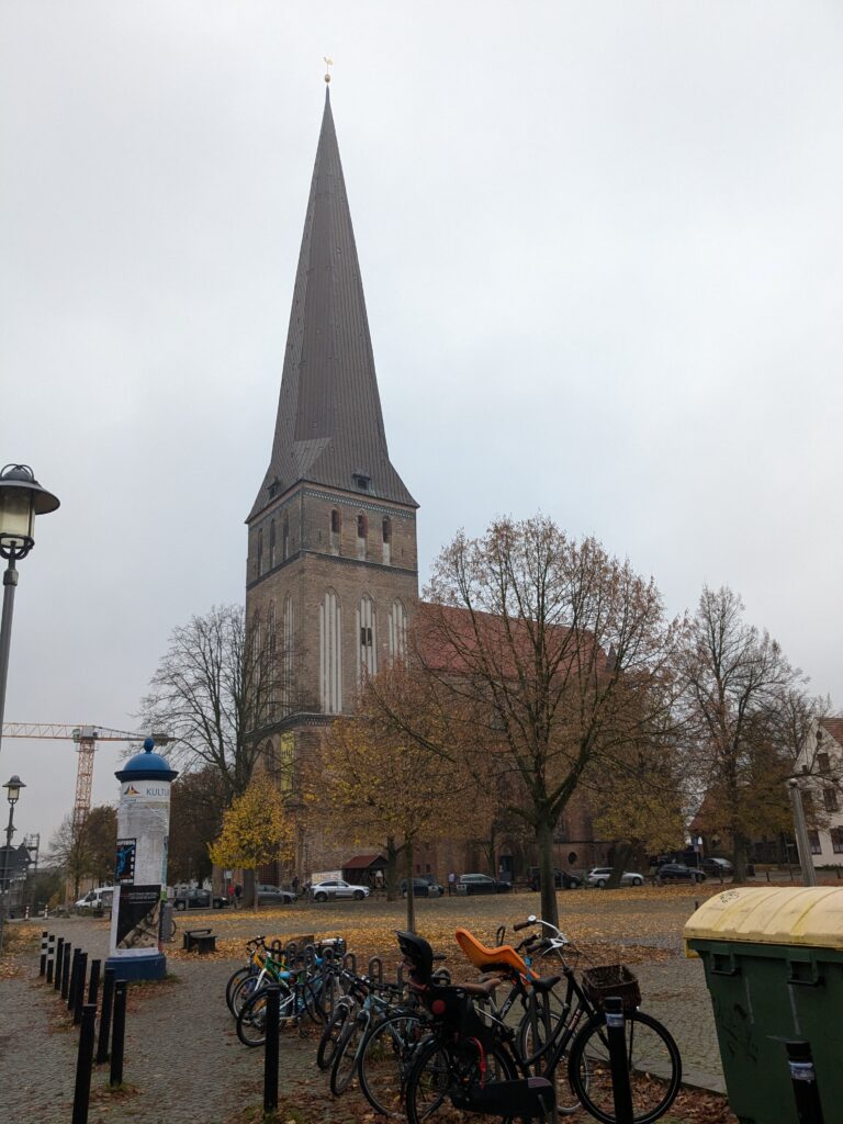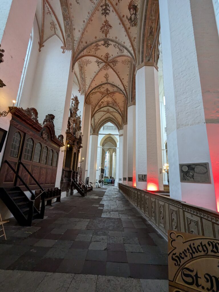 Danach gehen wir zur Nikolaikirche, zum Rathaus, zu Katharinenkirche (heute Meeresmuseum), zum vietnamesischen Imbiss (Absolutes Highlight des Tages, soo lecker), weiter zur Marienkirche. Inzwischen nieselt es und ist windig, trotzdem weiter zur Heiligen Geist Kirche (total niedlich gegen die anderen Riesenkirchen und zu guter Letzt zur Jakobikirche, die heute wegen eines Konzertes geschlossen ist. Das Wetter ist auch nicht mehr so toll, Pacer sagt 9000 Schritte, also zurück zum Auto und dann zum gemütlichen Teil des Tages!