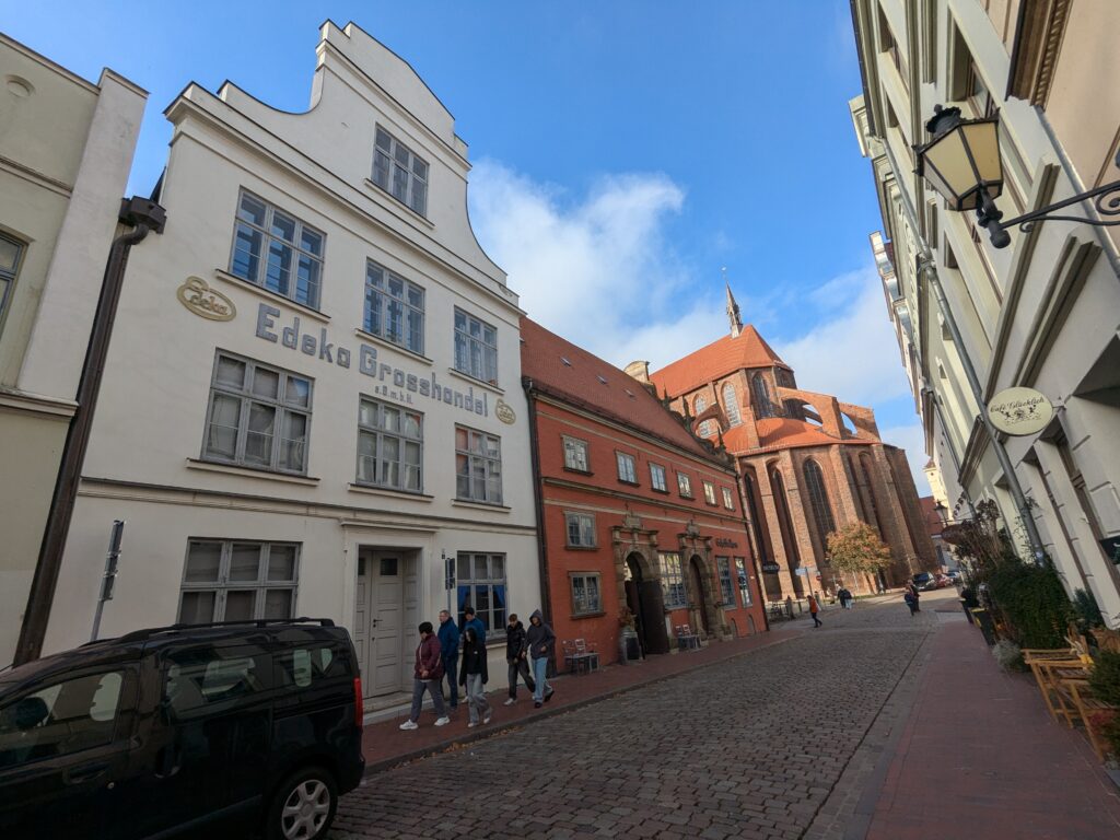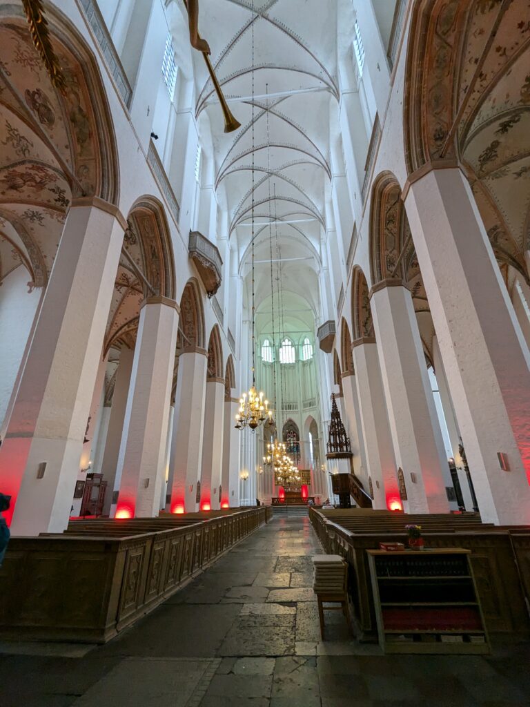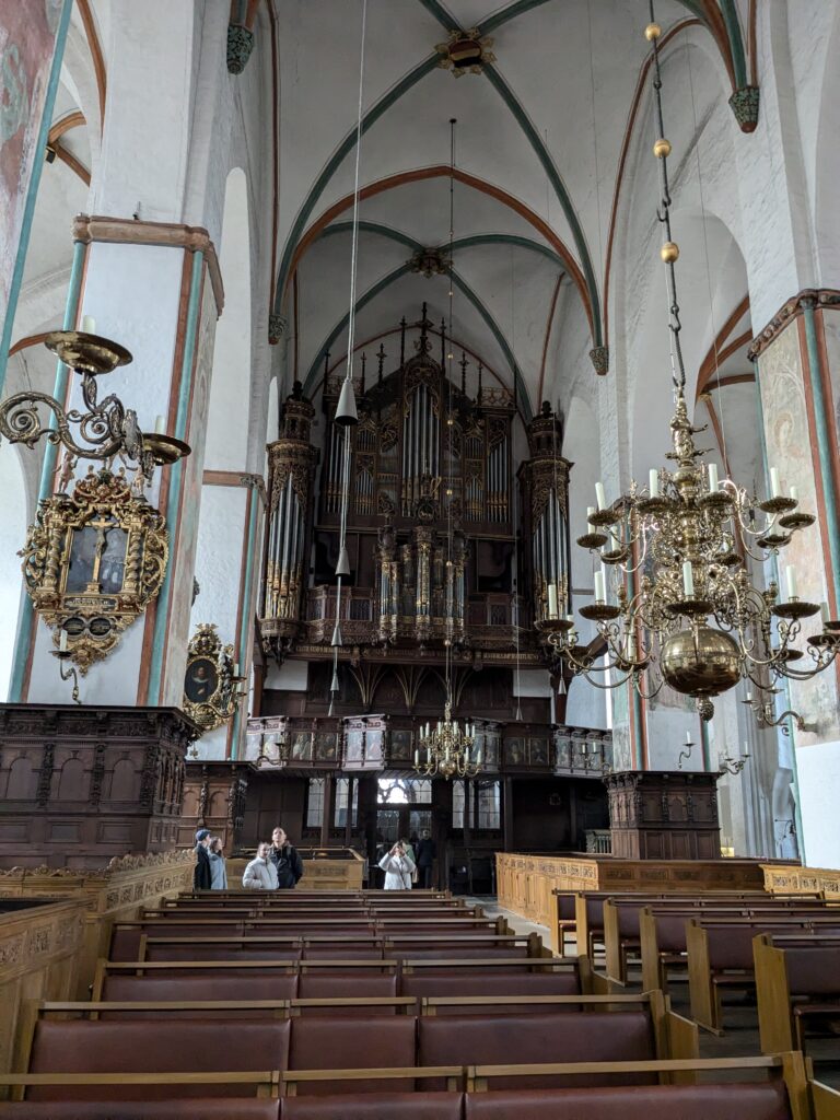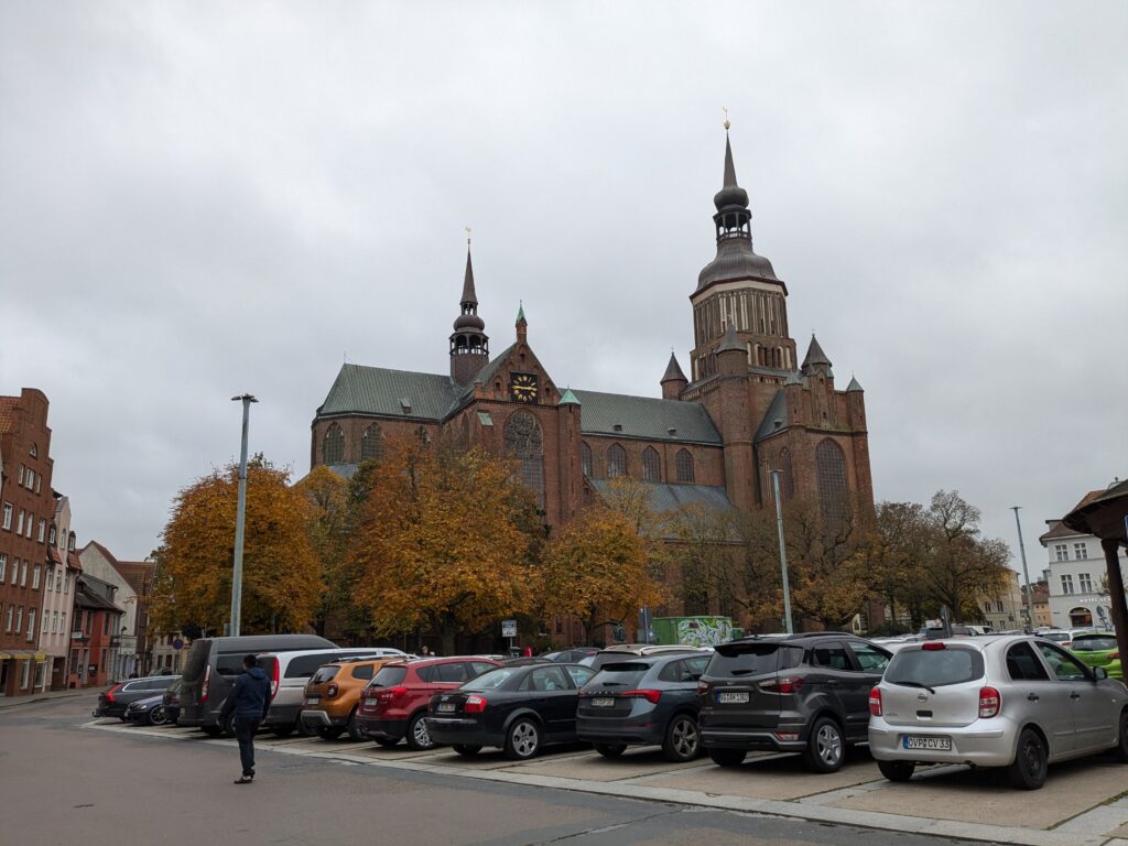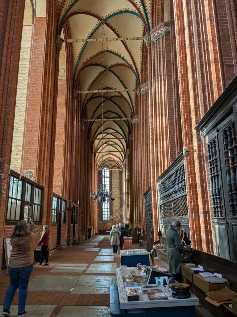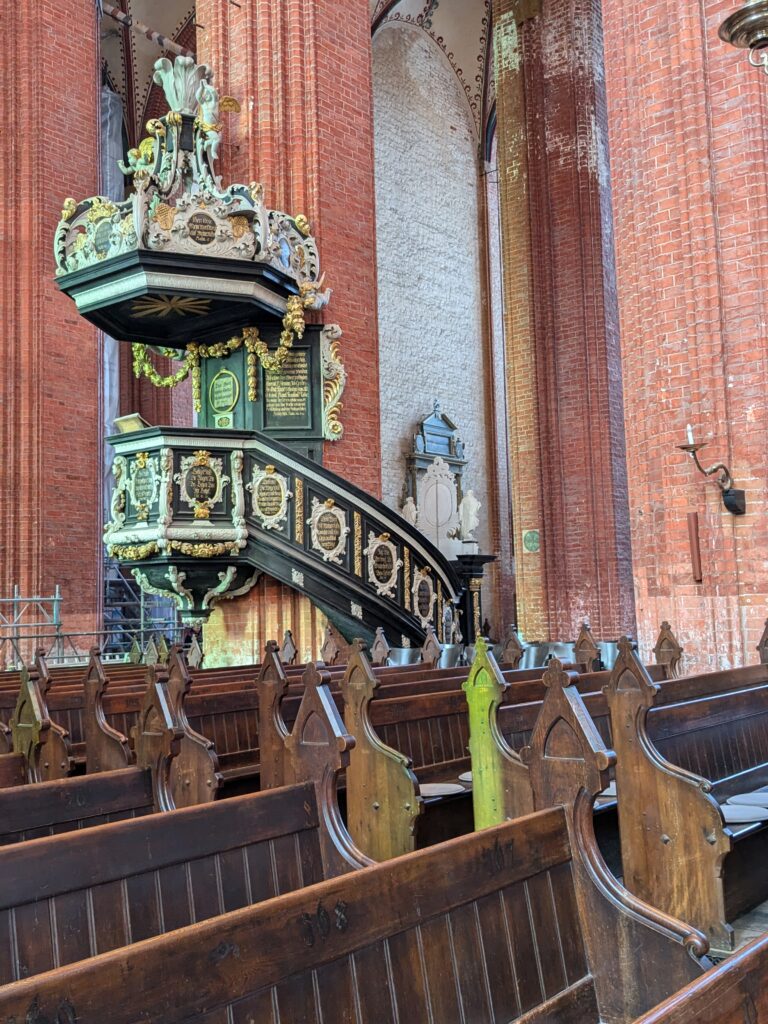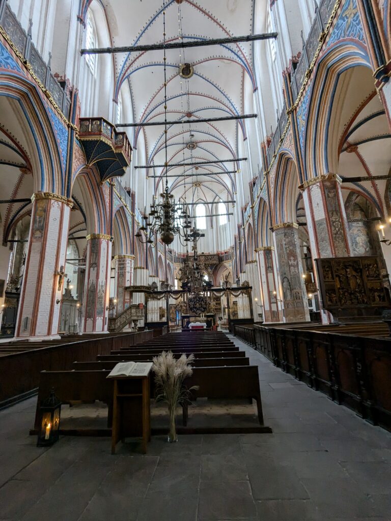 Danach gehen wir zur Nikolaikirche, zum Rathaus, zu Katharinenkirche (heute Meeresmuseum), zum vietnamesischen Imbiss (Absolutes Highlight des Tages, soo lecker), weiter zur Marienkirche. Inzwischen nieselt es und ist windig, trotzdem weiter zur Heiligen Geist Kirche (total niedlich gegen die anderen Riesenkirchen und zu guter Letzt zur Jakobikirche, die heute wegen eines Konzertes geschlossen ist. Das Wetter ist auch nicht mehr so toll, Pacer sagt 9000 Schritte, also zurück zum Auto und dann zum gemütlichen Teil des Tages!