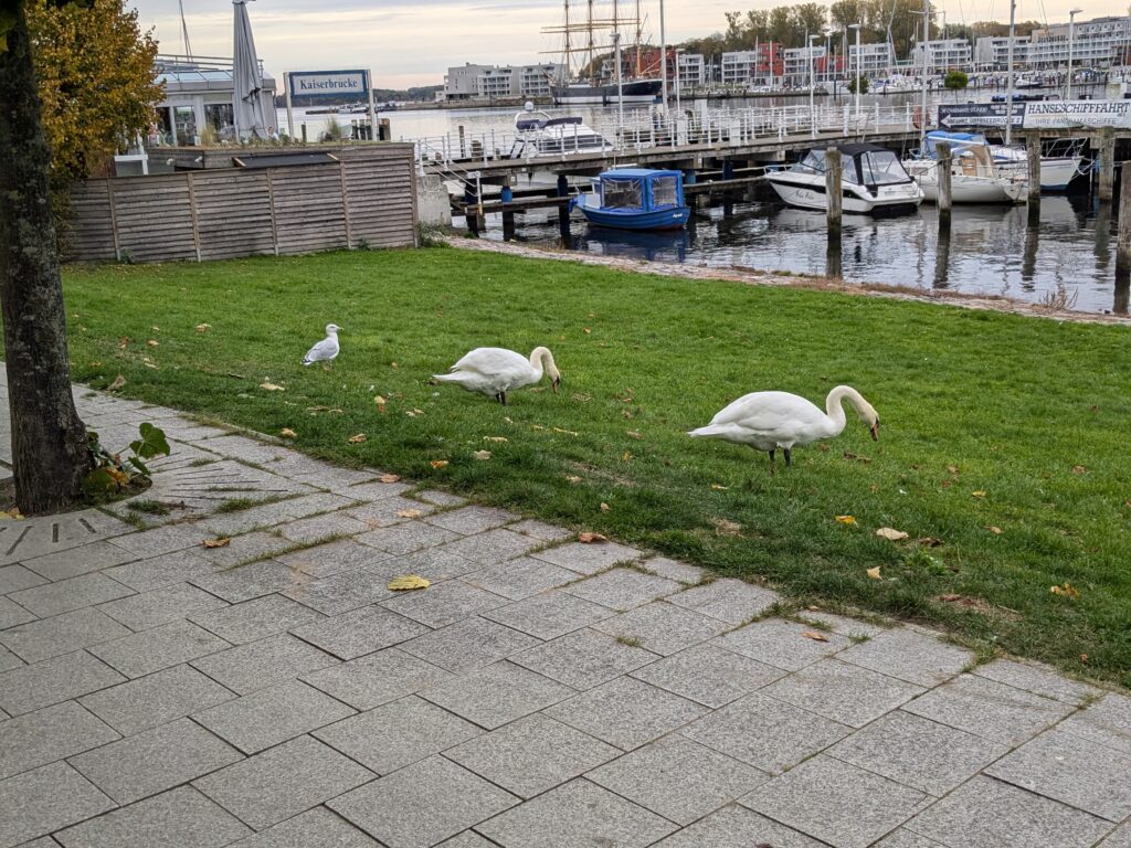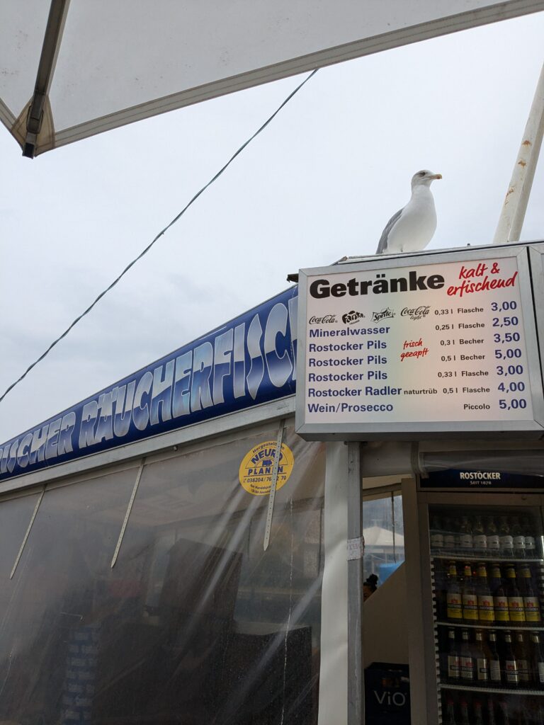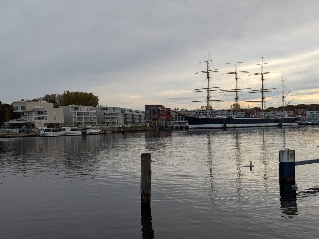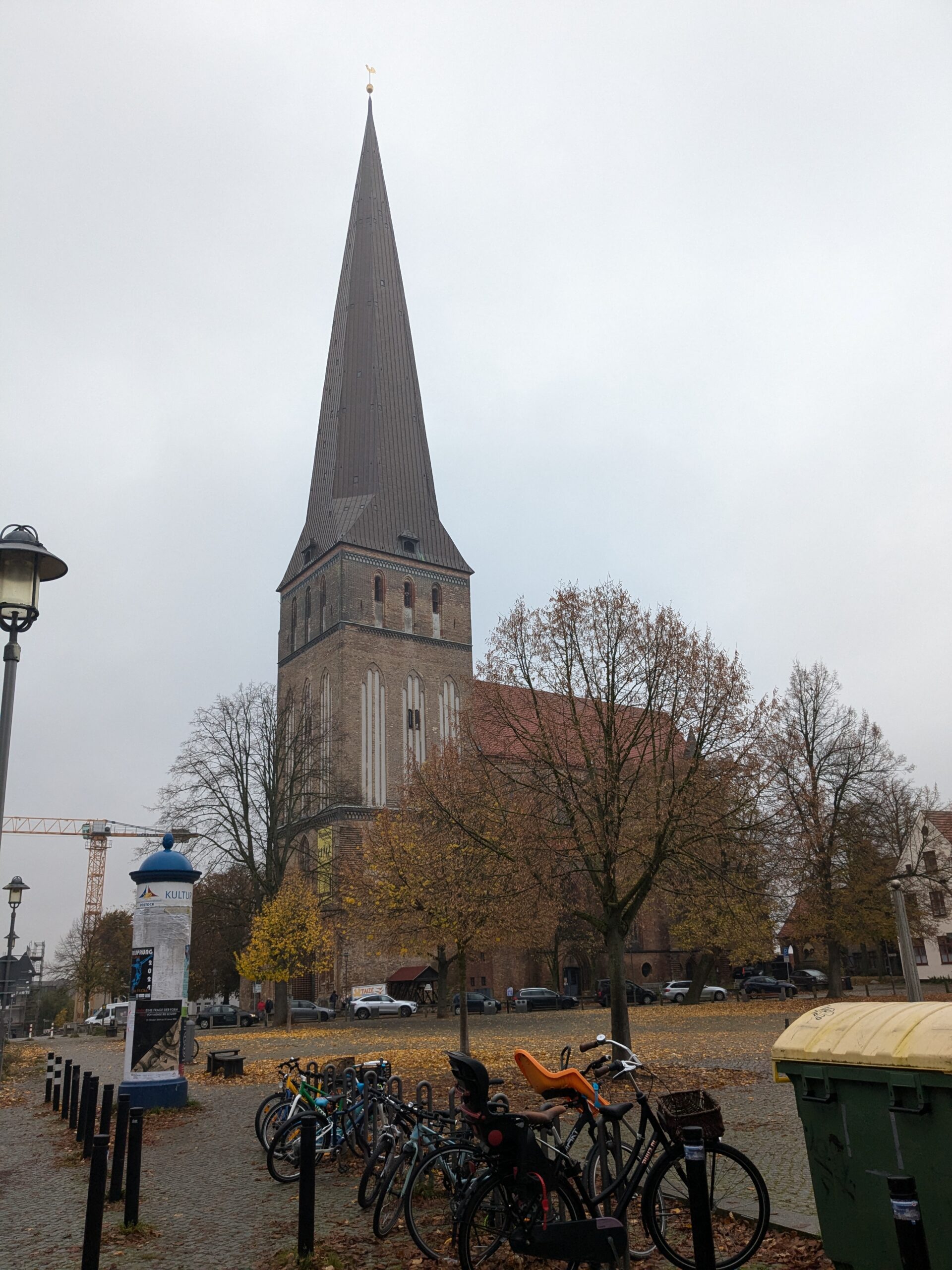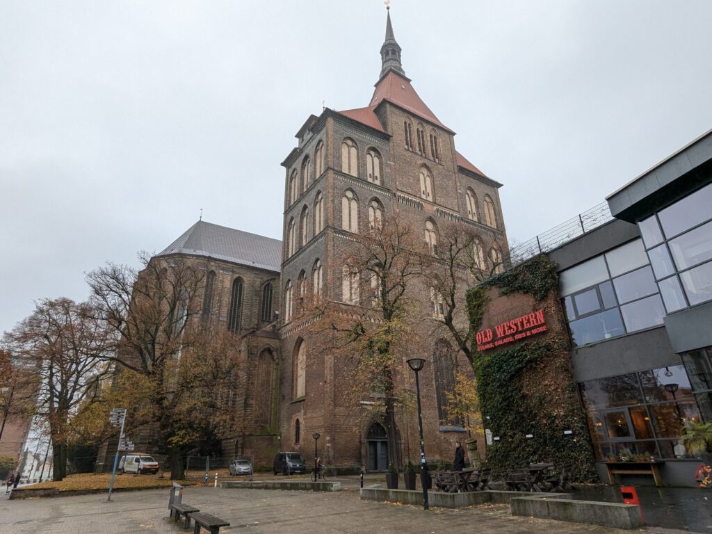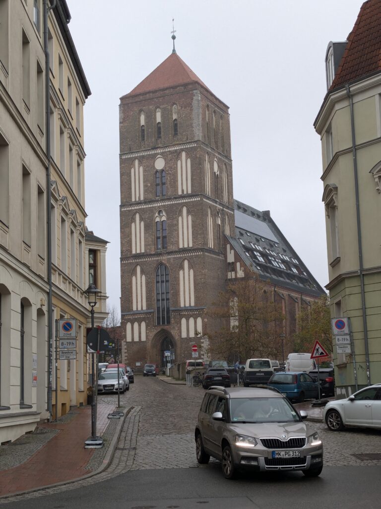 Wir schlafen lange und frühstücken in Ruhe. Ruhe haben wir hier genug. Dann starten wir nach Rostock. Unterwegs staut sich der Verkehr, aber so gegen 12:38 erreichen wir den Parkplatz „Am Stadthafen“ und prompt beginnt es zu nieseln. Wir stapfen trotzdem los. Unser erstes Ziel ist natürlich die Marienkirche. Superschön. Besonders die Orgel. Wir lassen alles in Ruhe auf uns wirken. Dann geht es noch weiter durch die Stadt, es gibt einige schöne Häuser und noch zwei weitere Kirchen, die wir uns ansehen. Aber angesicht des heute herrschenden Sch…ietwetters kommt keine rechte Site-Seeing-Stimmung auf und wir haben Sehnsucht nach unserem warmen trockenen Wobi. Auf dem Platz haben wir dann neue Nachbarn. Mutti entsorgt gleich erstmal Müll, nicht in die Tonnen vom Stellplatz, sondern bei der Nachbarin und Vati läst sich wild gestikulierend von mir das Tor zum Stellplatz öffnen, macht aber keinerlei Anstalten es wieder zu schließen und das, obwohl ich schon ein gutes Stück weiter bin. 🙁 wenigstens lassen die 2 Stellplätze zwischen uns und sich frei. Sonst wäre Ralf, glaube ich, porös geworden.