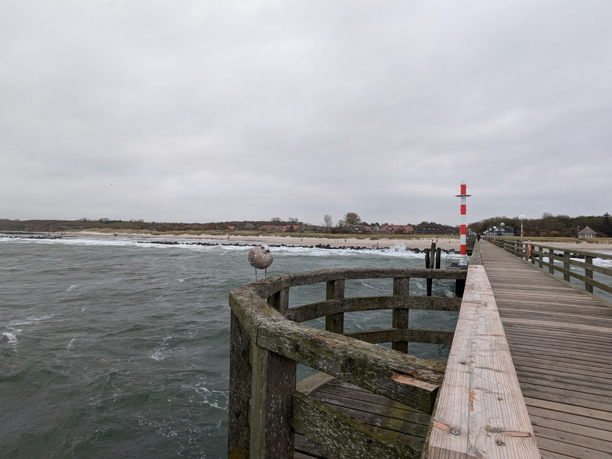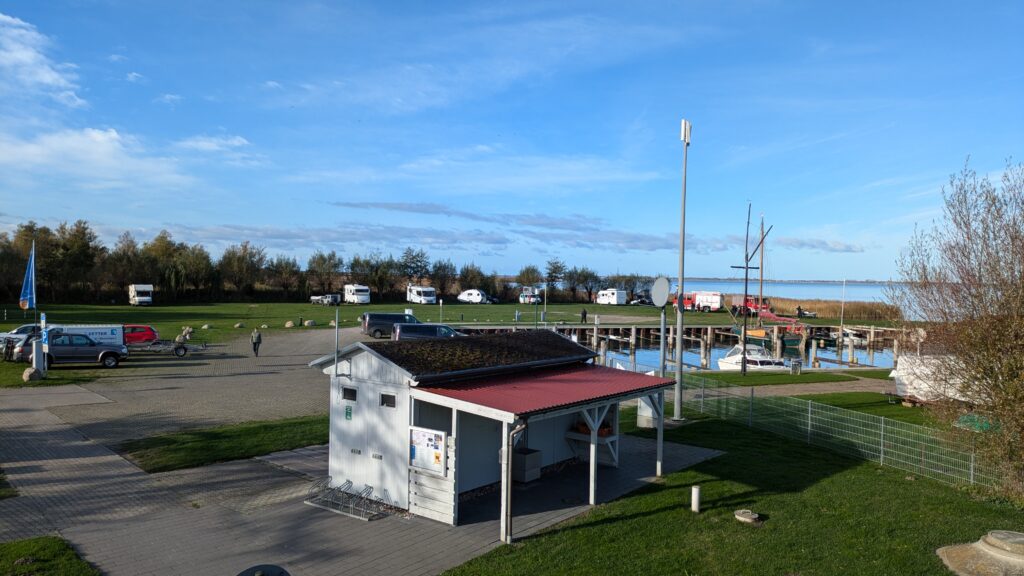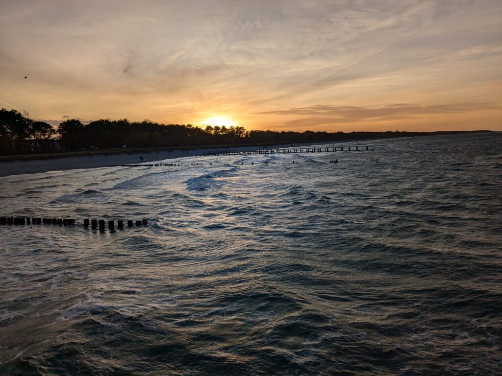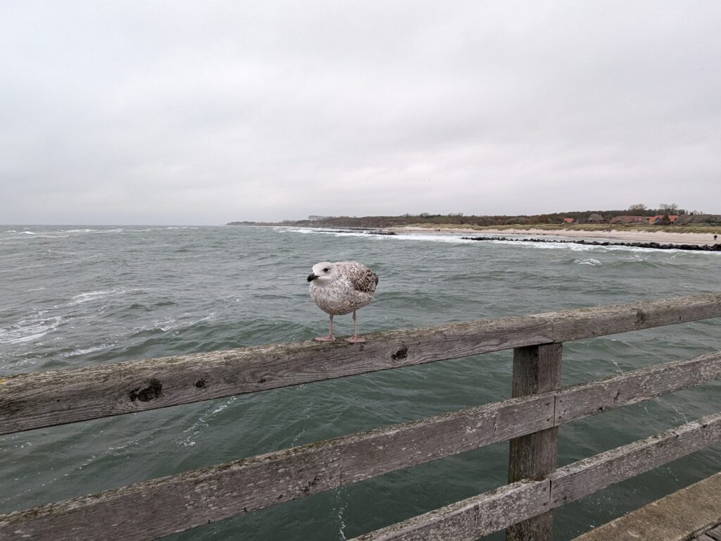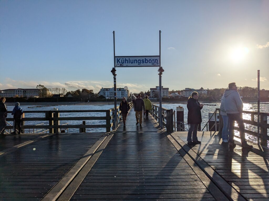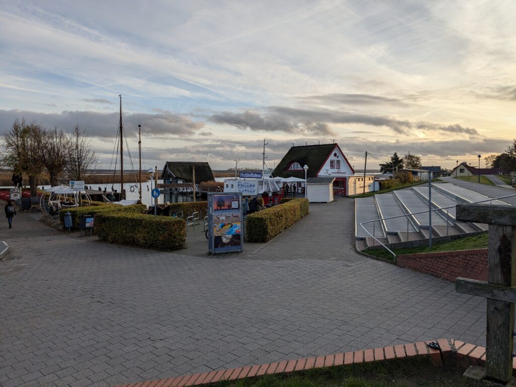 Da noch viel vom Tag über ist, beschliessen wir noch eine kleine Rundfahrt um den Bodden zu machen. In Ribnitz stoppen wir für ein Fischbrötchen am Hafen. In Wustrow besichtigen wir die Seebrücke, durch den Wind sind hier die Wellen ein wenig höher, so 3 m haben sie schon. In Ahrenshoop ist es uns zu voll, an einem Freitag im November! In Prerow wollen wir Kaffee und Kuchen, sollen aber ein Tagesticket für über 7 € lösen, weniger ging nicht. Also weiter. In Zingst klappt es mit dem Parken, nur ist uns der Appetit auf Kuchen vergangen. An der Seebrücke gibt es einen heißen Sanddorn-Punsch ohne Umdrehung. Gegen 17:30 sind wir wieder im Womo.