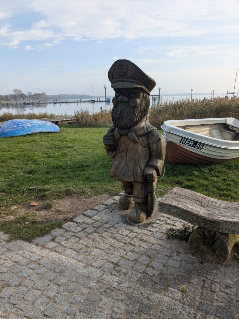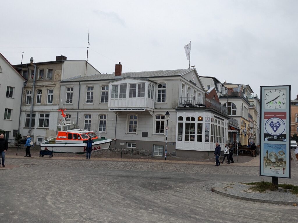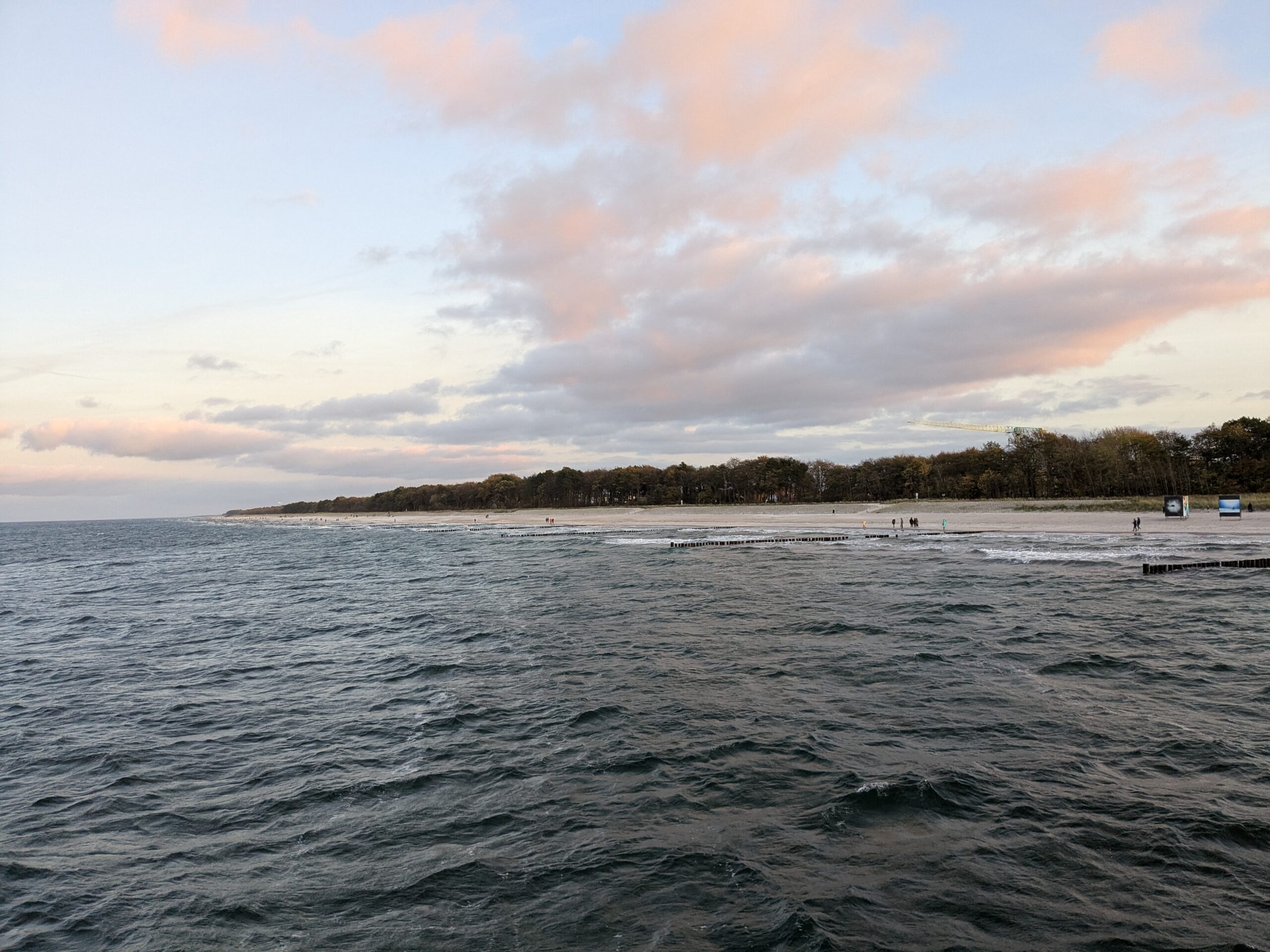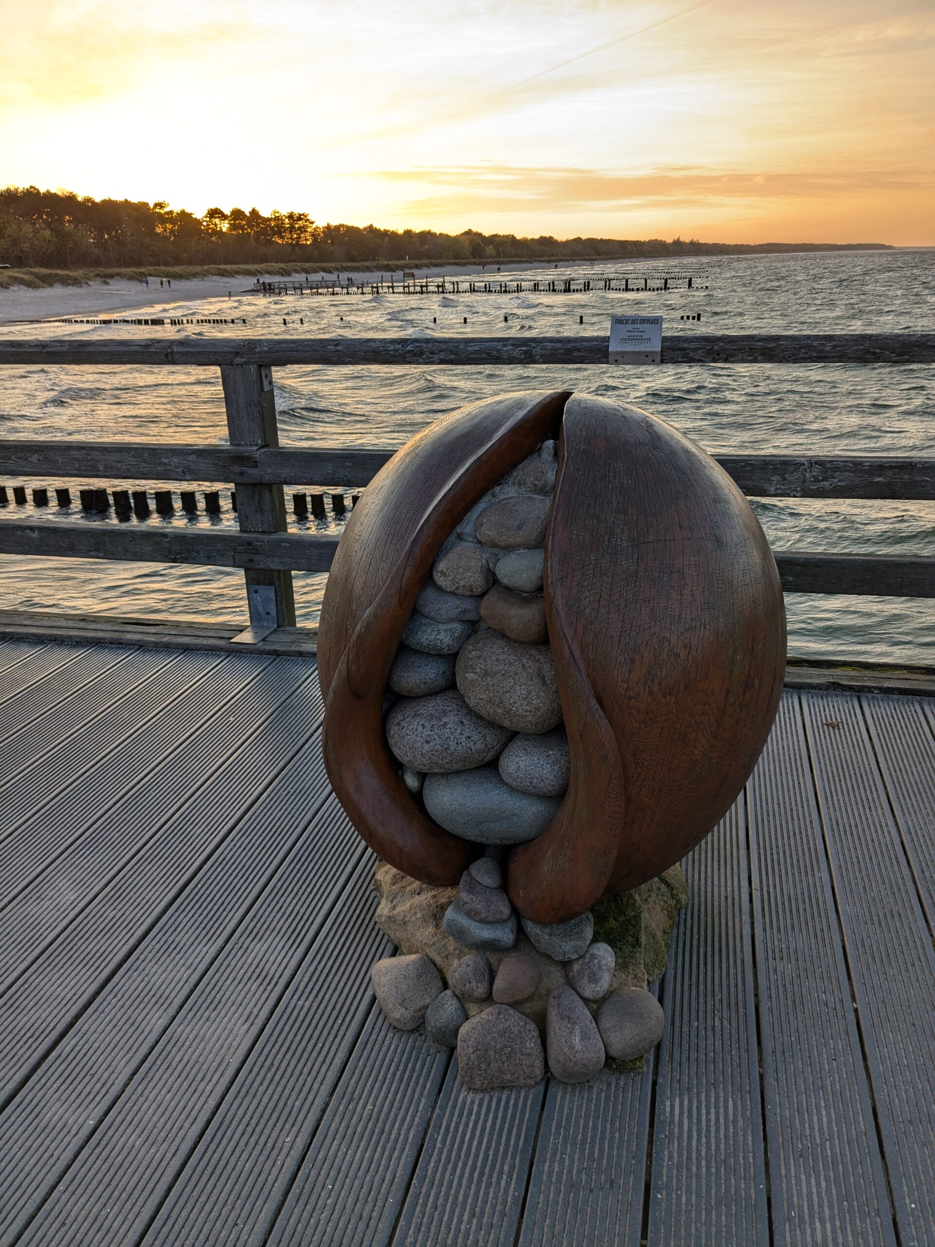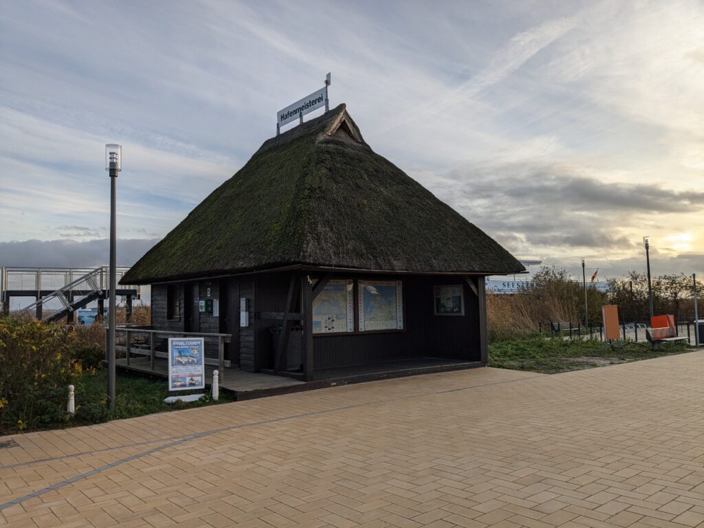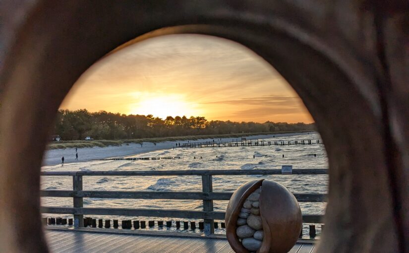 Da noch viel vom Tag über ist, beschliessen wir noch eine kleine Rundfahrt um den Bodden zu machen. In Ribnitz stoppen wir für ein Fischbrötchen am Hafen. In Wustrow besichtigen wir die Seebrücke, durch den Wind sind hier die Wellen ein wenig höher, so 3 m haben sie schon. In Ahrenshoop ist es uns zu voll, an einem Freitag im November! In Prerow wollen wir Kaffee und Kuchen, sollen aber ein Tagesticket für über 7 € lösen, weniger ging nicht. Also weiter. In Zingst klappt es mit dem Parken, nur ist uns der Appetit auf Kuchen vergangen. An der Seebrücke gibt es einen heißen Sanddorn-Punsch ohne Umdrehung. Gegen 17:30 sind wir wieder im Womo.