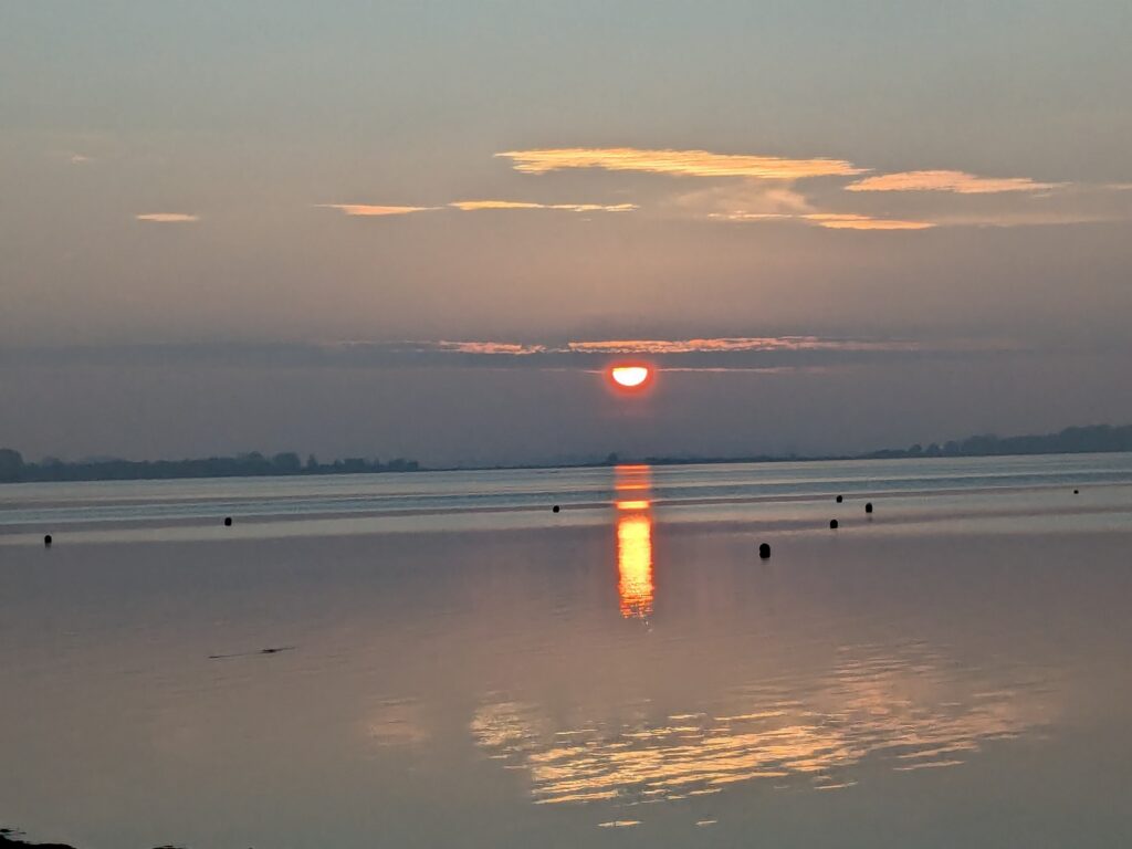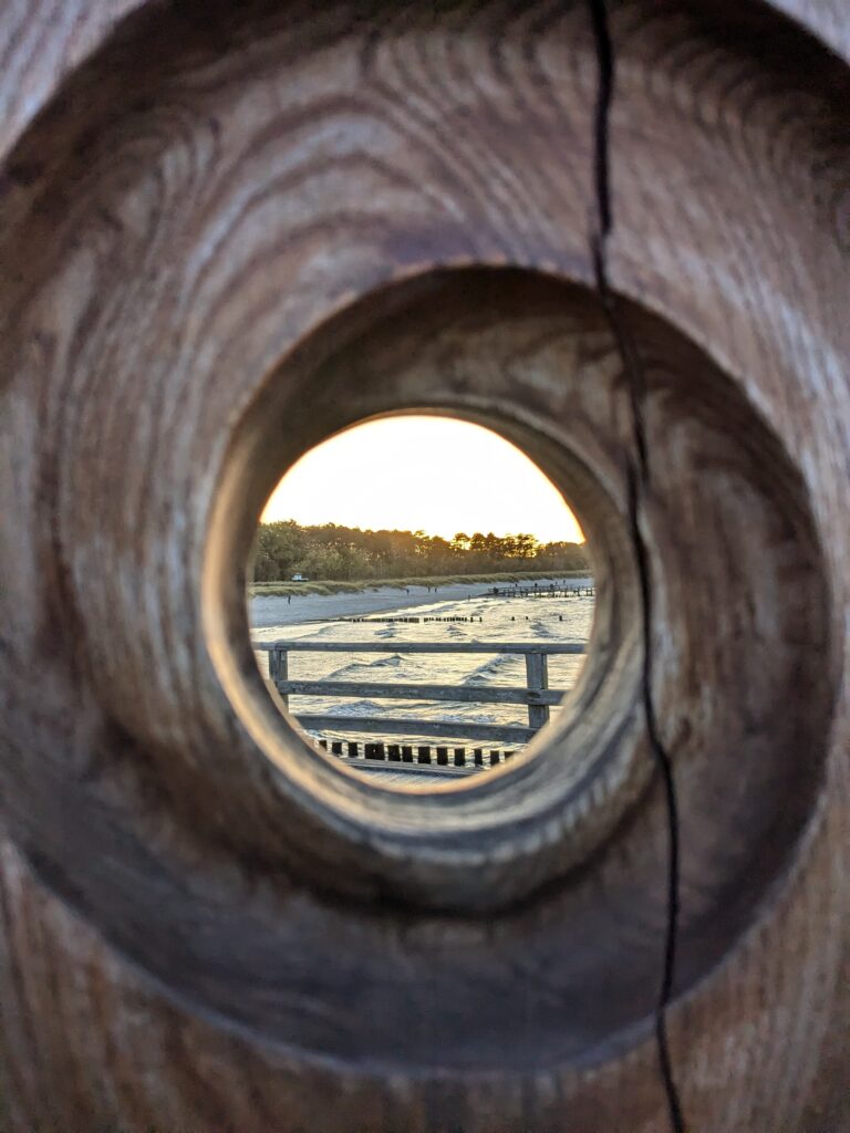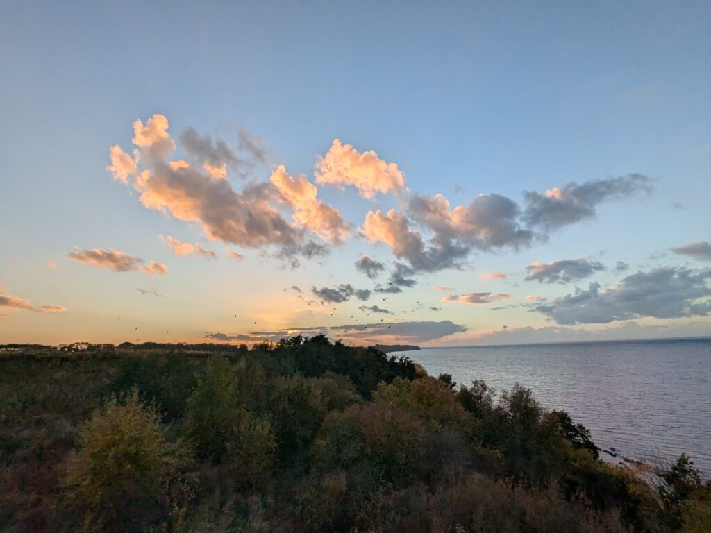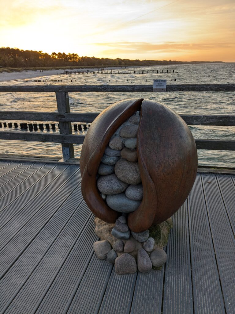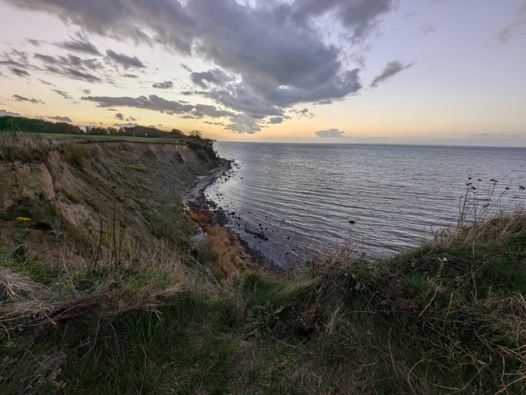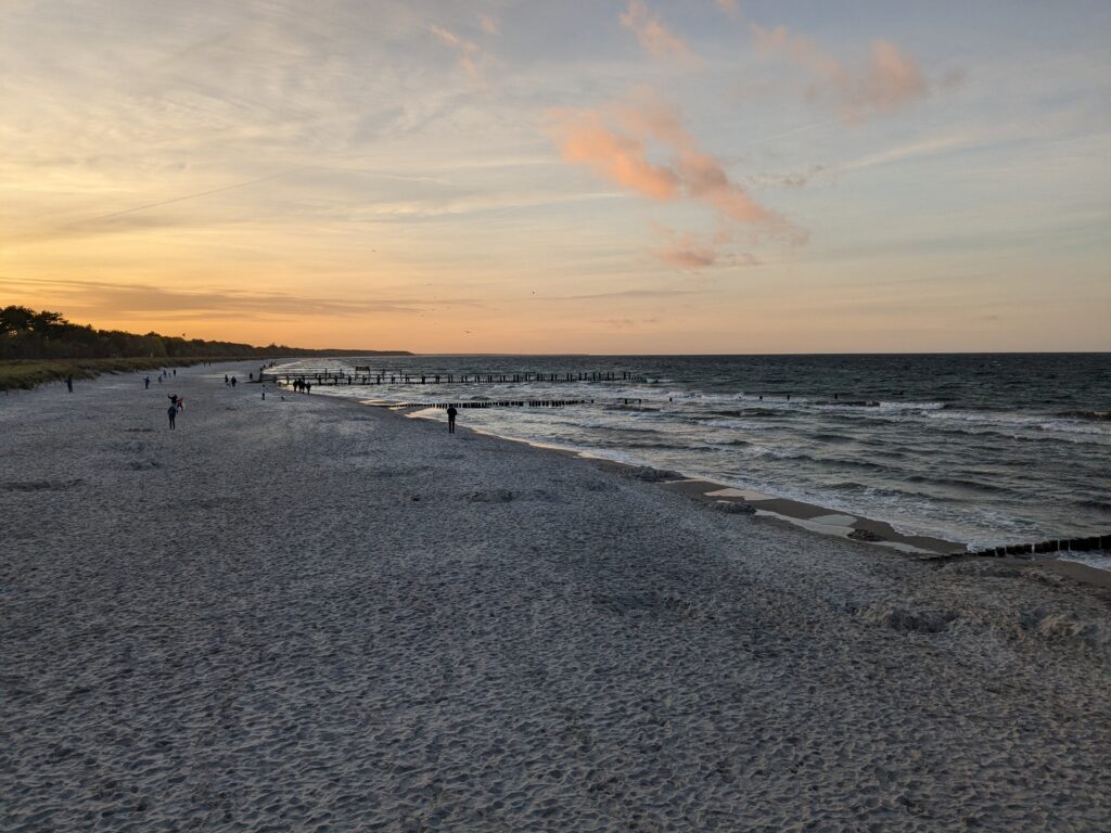 Wir lassen es langsam angehen. Frühstück um 11:00, Abfahrt um 12:00. Unser neues Ziel ist der Stellplatz an der Steilküste in Boltenhagen. Das sind knapp 60 km. Nach einer teils etwas abenteuerlichen Anfahrt erreichen wir Mittags den Stellplatz an einem kleinen, aber feinen Café. Einchecken geht problemlos im Café, der Lütte darf mit auf die Wiese, davon gibt es zwei, auf einer steht schon ein Kastenwagen, also wählen wir die Andere. Da sind wir ganz allein und das bleibt auch so. Inkl. Strom, Toilettenbenutzung (ohne Dusche) und Kurtaxe zahlen wir 26,80€. VE gibt es nicht. Wir starten mit dem Lütten nach Boltenhagen, ein Parkplatz für 2 Stunden (Parkscheinautomat) direkt am kleinen Kurpark ist schnell gefunden. Da wir keine Lust zum Kochen haben gibt es Fisch & Chips. Dann einen, den einzigen Lab-Cache. Der führt uns zur kleinen ev. Kirche und zu ein paar Punkten im Kurpark und final auf die Seebrücke. Es ist alles sehr überschaubar, das Wetter ist super und unsere Laune auch. Der Bonus zum Labcache bereitet mir dann aber Kopfschmerzen, nicht weil der schwer ist, sondern weil ich mir heftig den Kopf stoße. Dann fix zurück zum Auto, die Parkzeit läuft ab. Also zurück zum Stellplatz, oder besser gesagt zum Café. Dort lassen wir uns ein Stückchen Stachelbeer/Mohn/Sahnetorte und ein Stück Käse-Baiser schmecken. Viel besser als gestern! Nach einer Verdauungspause starten wir dann noch zu einem „kurzen“ Spaziergang zum Sonnenuntergang auf der Steilküste und schwupps sind schon wieder über 11000 Schritte auf dem Tacho. Jetzt ist aber wirklich Coaching angesagt. Gegen 19:30 haber wir allerdings noch Besuch von einer neuen Starlink-Kette, die den Himmel passiert.