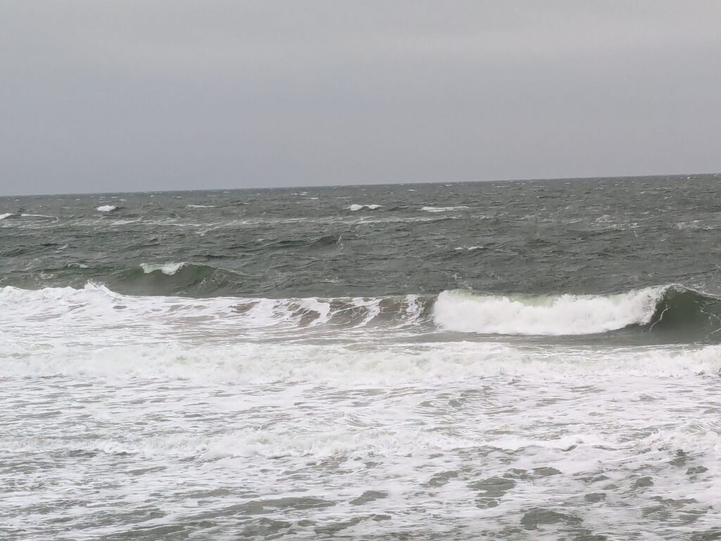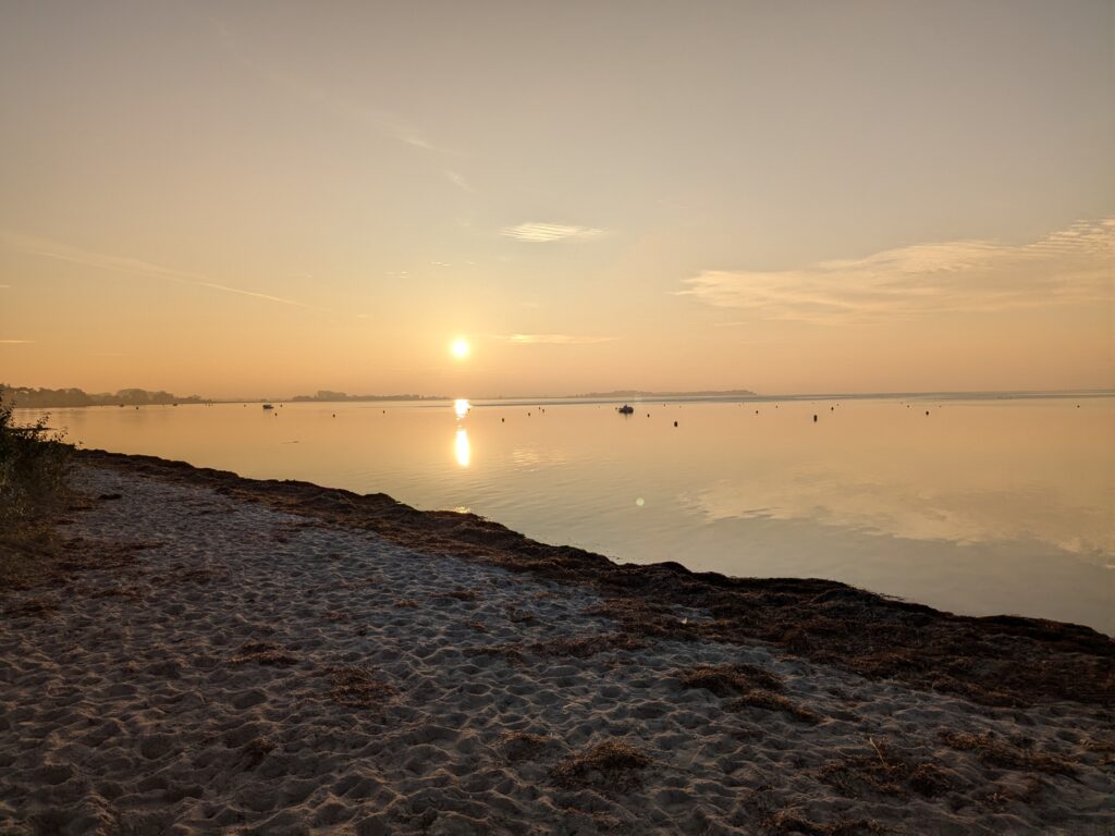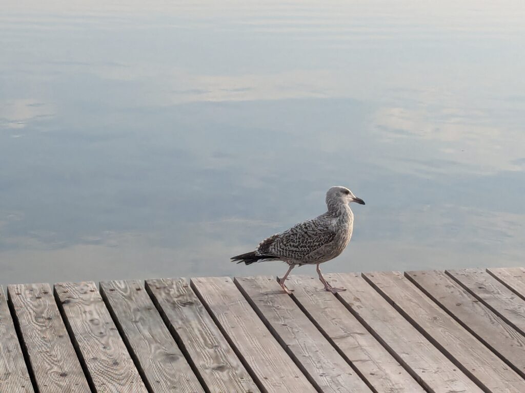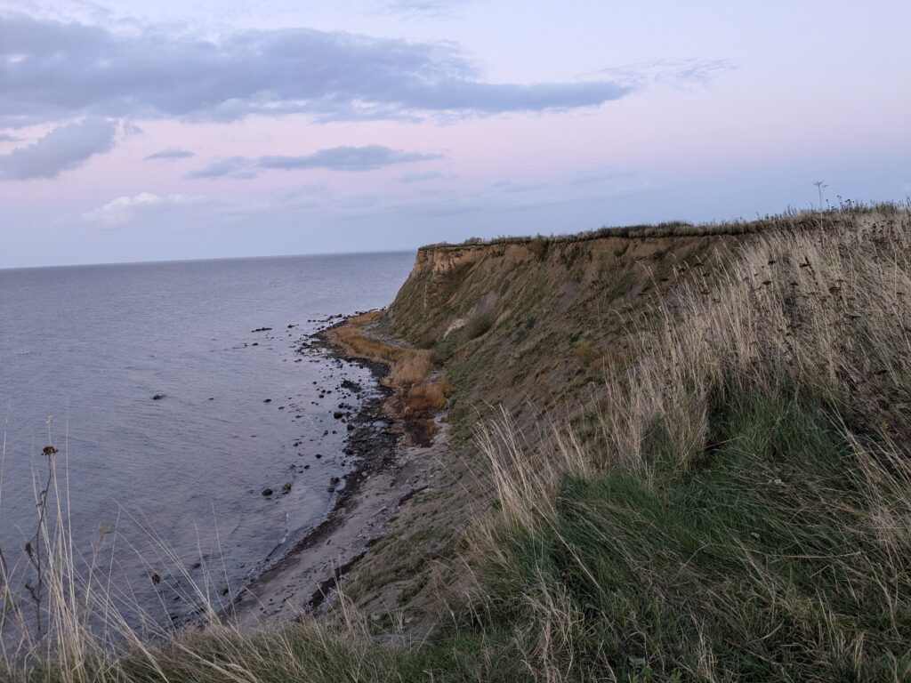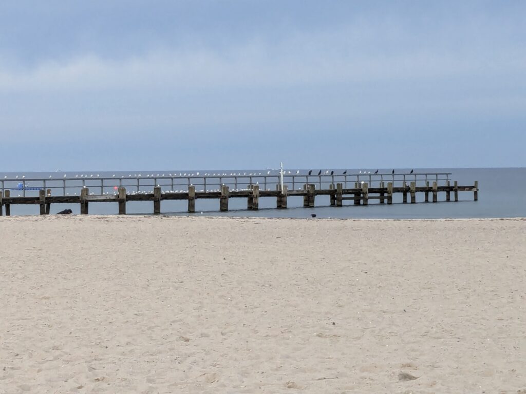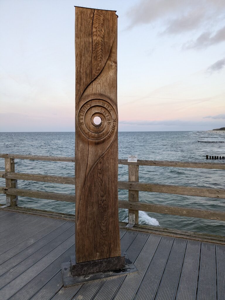 Wir lassen es langsam angehen. Frühstück um 11:00, Abfahrt um 12:00. Unser neues Ziel ist der Stellplatz an der Steilküste in Boltenhagen. Das sind knapp 60 km. Nach einer teils etwas abenteuerlichen Anfahrt erreichen wir Mittags den Stellplatz an einem kleinen, aber feinen Café. Einchecken geht problemlos im Café, der Lütte darf mit auf die Wiese, davon gibt es zwei, auf einer steht schon ein Kastenwagen, also wählen wir die Andere. Da sind wir ganz allein und das bleibt auch so. Inkl. Strom, Toilettenbenutzung (ohne Dusche) und Kurtaxe zahlen wir 26,80€. VE gibt es nicht. Wir starten mit dem Lütten nach Boltenhagen, ein Parkplatz für 2 Stunden (Parkscheinautomat) direkt am kleinen Kurpark ist schnell gefunden. Da wir keine Lust zum Kochen haben gibt es Fisch & Chips. Dann einen, den einzigen Lab-Cache. Der führt uns zur kleinen ev. Kirche und zu ein paar Punkten im Kurpark und final auf die Seebrücke. Es ist alles sehr überschaubar, das Wetter ist super und unsere Laune auch. Der Bonus zum Labcache bereitet mir dann aber Kopfschmerzen, nicht weil der schwer ist, sondern weil ich mir heftig den Kopf stoße. Dann fix zurück zum Auto, die Parkzeit läuft ab. Also zurück zum Stellplatz, oder besser gesagt zum Café. Dort lassen wir uns ein Stückchen Stachelbeer/Mohn/Sahnetorte und ein Stück Käse-Baiser schmecken. Viel besser als gestern! Nach einer Verdauungspause starten wir dann noch zu einem „kurzen“ Spaziergang zum Sonnenuntergang auf der Steilküste und schwupps sind schon wieder über 11000 Schritte auf dem Tacho. Jetzt ist aber wirklich Coaching angesagt. Gegen 19:30 haber wir allerdings noch Besuch von einer neuen Starlink-Kette, die den Himmel passiert.