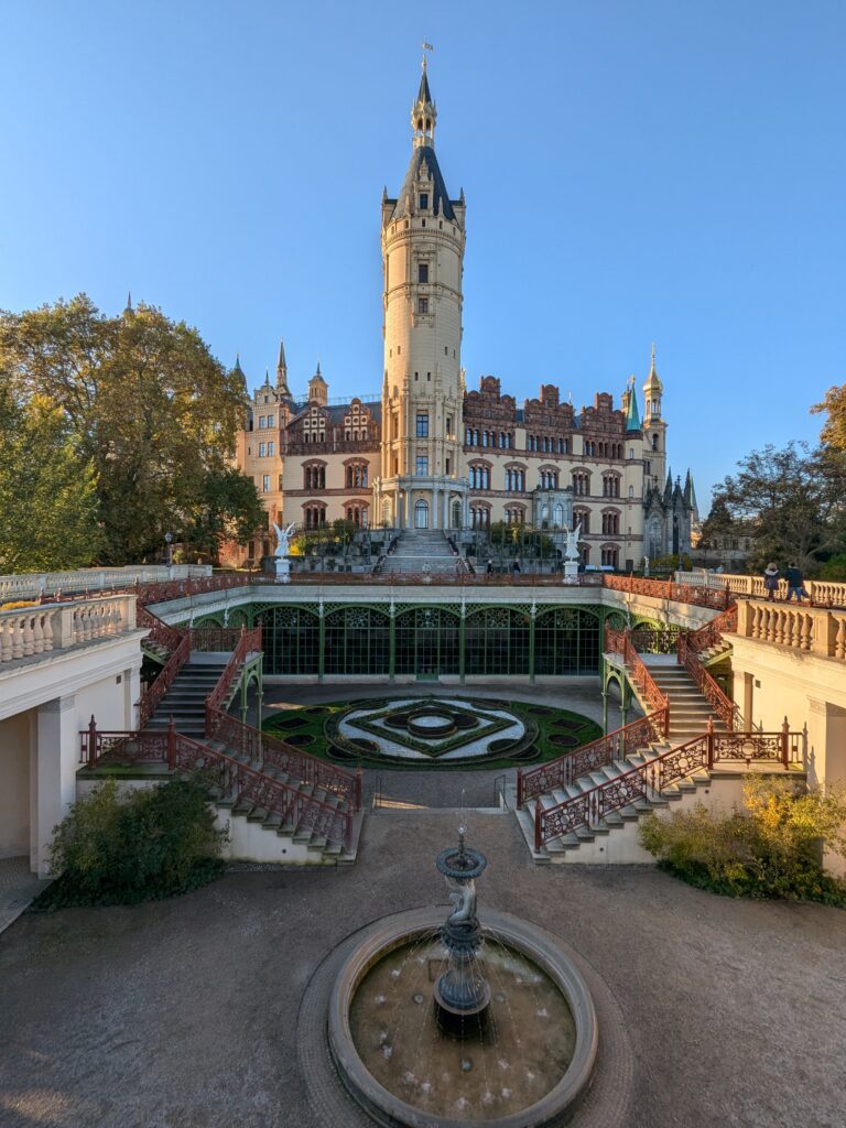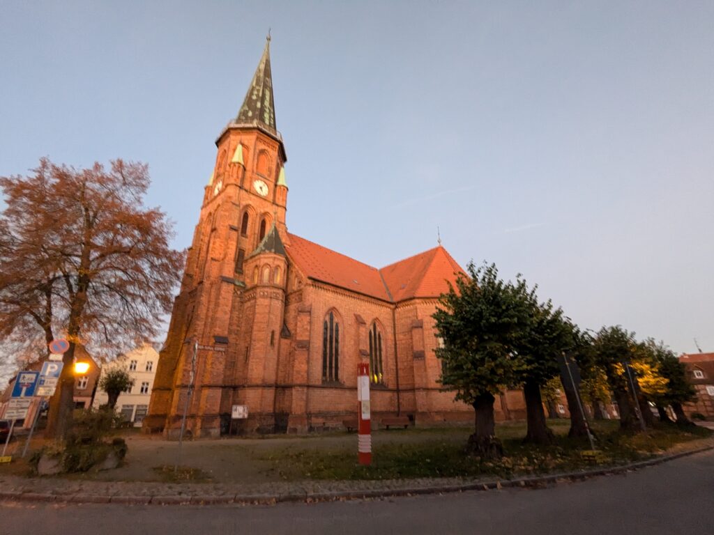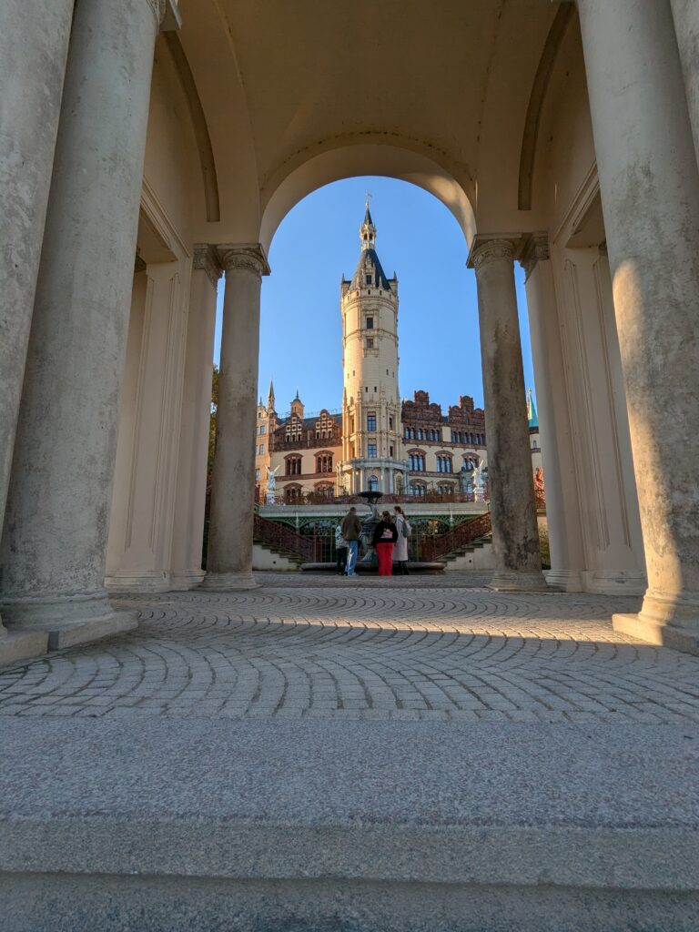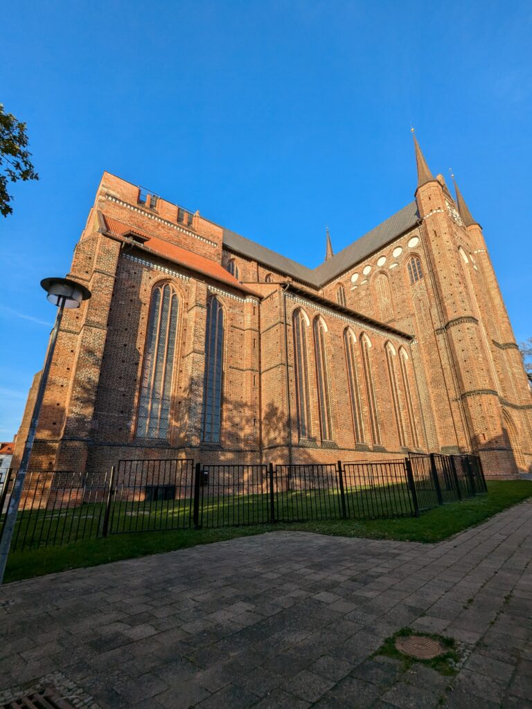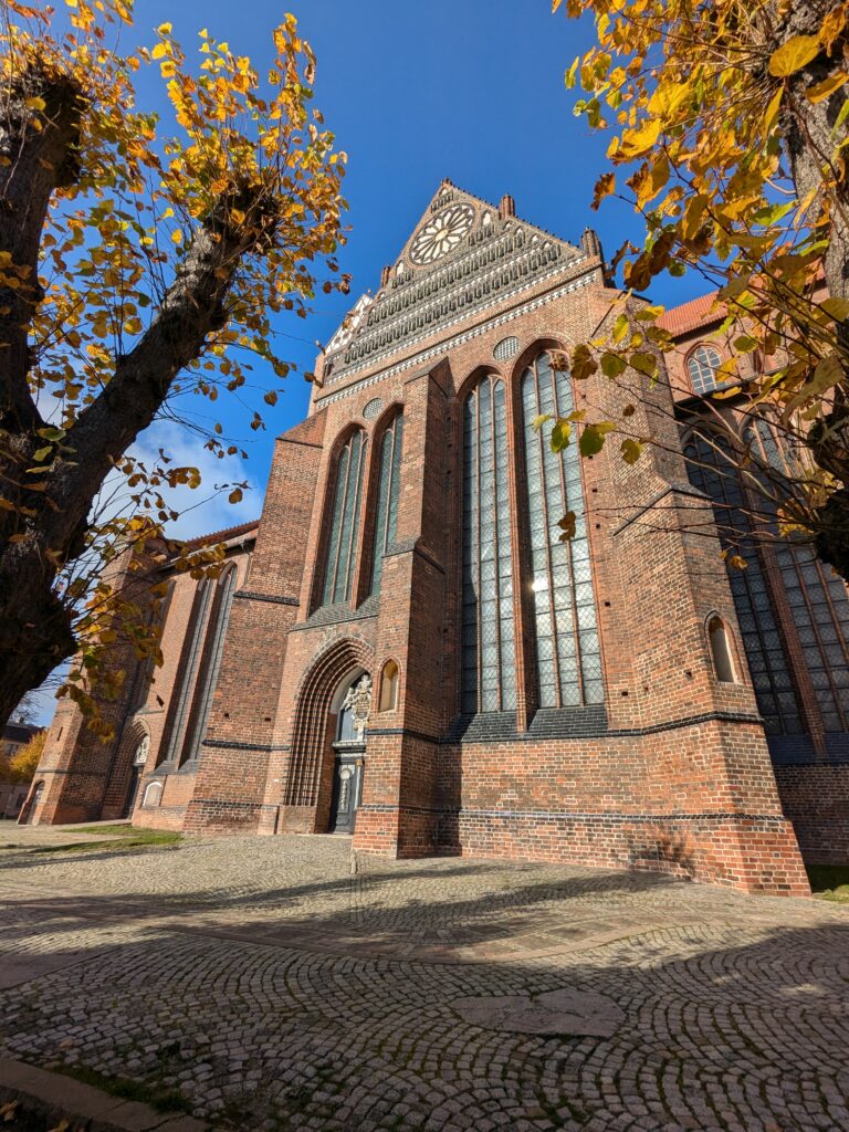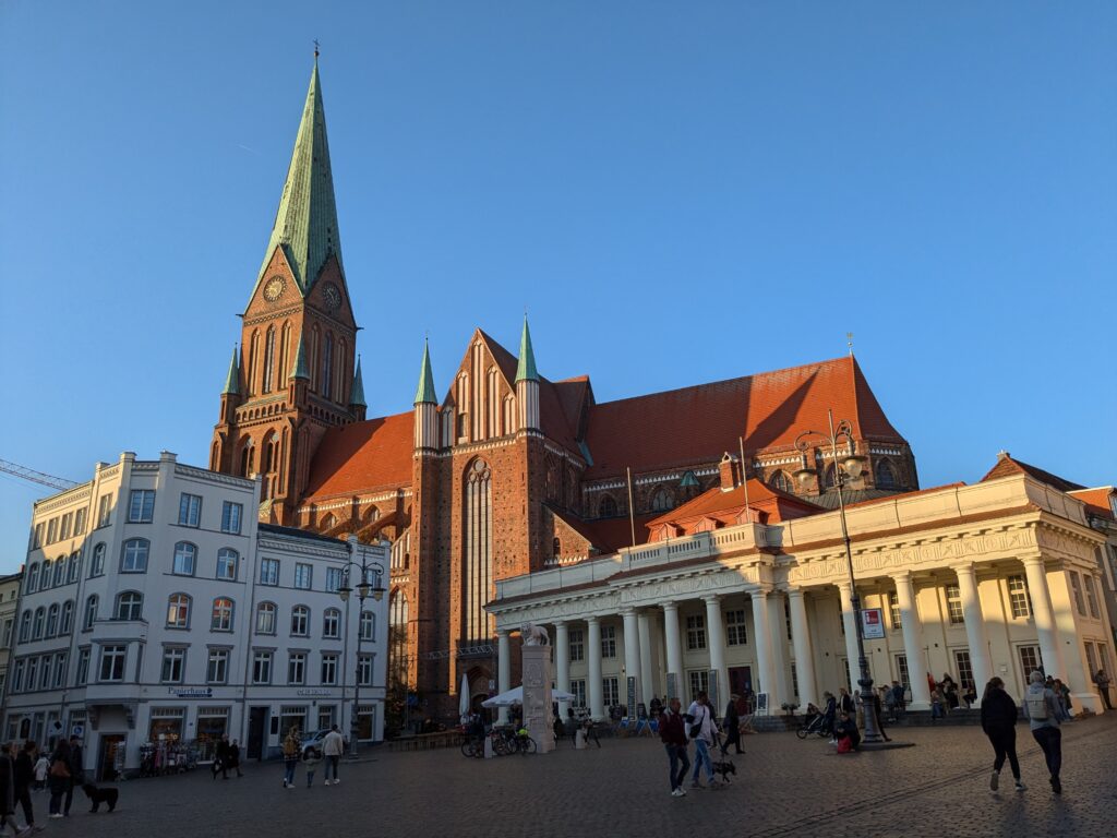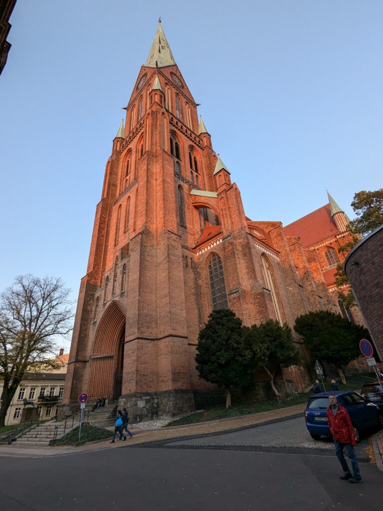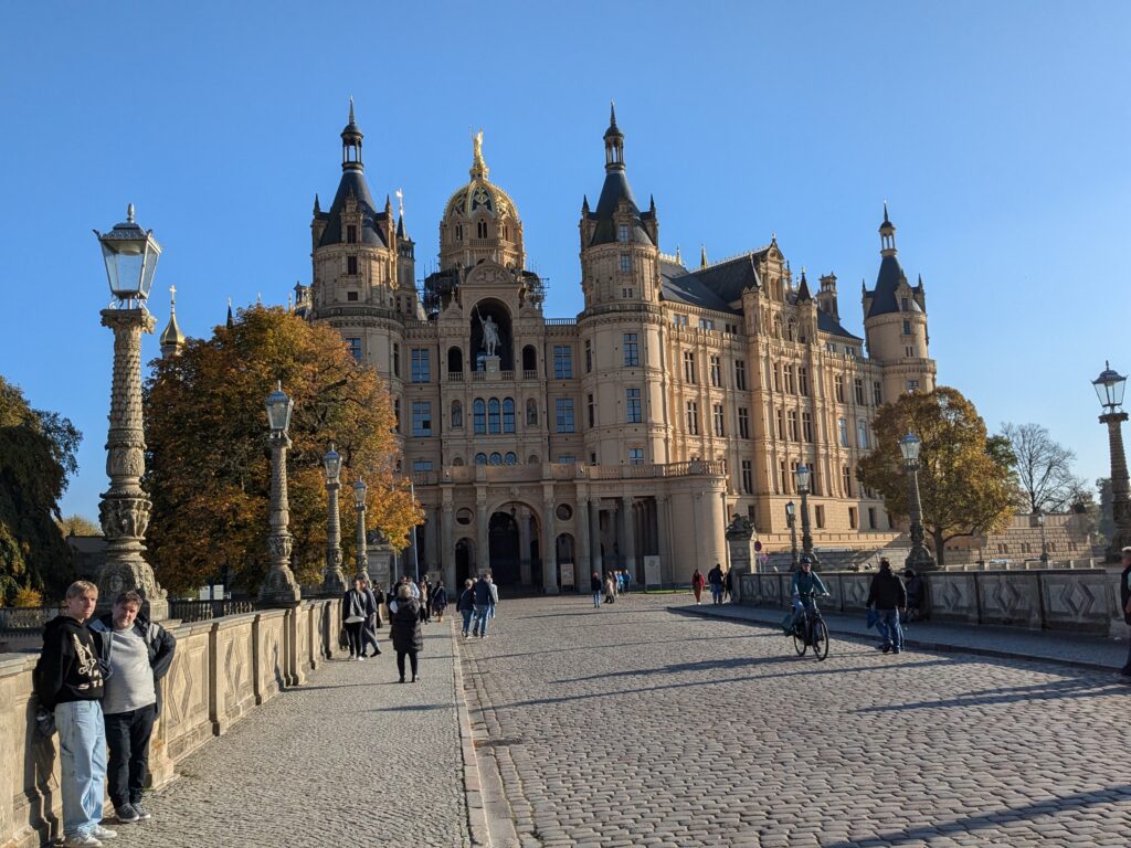Mit Schrecken habe ich gestern Abend festhestellt, dass wir nur 50km von Schwerin entfernt sind. Das hatte ich gar nicht auf dem Schirm. Also Planänderung, nächster Stopp Hangar19 am Schweriner Innensee. Nach kurzer Fahrt mit zwei Gas-Tankversuchen. Der erste funzt nicht, trotz Hilfe des Chefs geht nichts in die Tankflasche rein. Beim 2. klappt es dann, erreichen wir Schwerin. Stolze 47,- wollen sie hier für die 2 Autos und Strom. Dann starten wir entgegen dem Rat des Betreibers mit den Rädern. Guter Plan. Der „kurze Weg in die Altstadt“ ist doch länger als gedacht. Die Räder stellen wir am Dom ab, ab da geht es per Pedes weiter. Erstmal Dom Besichtigung, dann weiter zum Schloss. Super beeindruckend. Hier rutschen wir fast aus Versehen in die Führung der Schlosskirche. Kostenlos, nur um eine Spende wird gebeten. Superschön und sehr interessant. Dann ein Lab-Cache im Burggarten mit wirklich beeindruckenden Bäumen, 160 Jahre alte Riesen. Noch einen kurzen Blick in den Schlossgarten. Ist uns aber zum Erlaufen zu viel. 1 Lab-Cache machen wir noch am Stadtmodell. Da muß man nur um das Bronzemodel wandern 🙂 das kriegen wir hin. Dann gibt es eine heiße Schokolade DRAUSSEN im Cafe am Marktplatz um 17:00, Ende Oktober bei 16°, bevor wir die Räder einsammeln und zum Stellplatz zurück radeln. Hier gibt es super lecker Nudeln beim Italiener am Platz. Heute sind wir dank der Räder nicht so viel gelaufen. Nur 8000 Schritte.