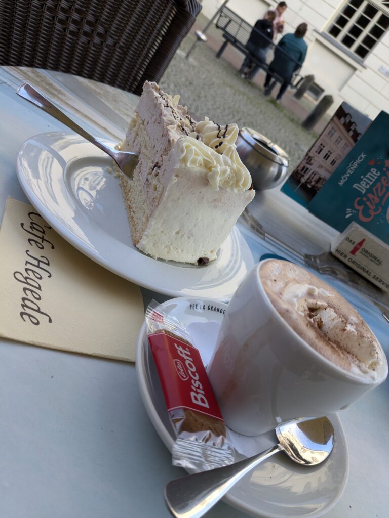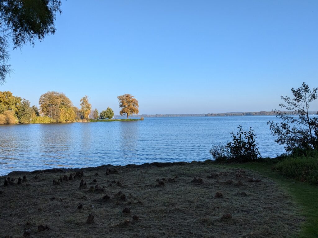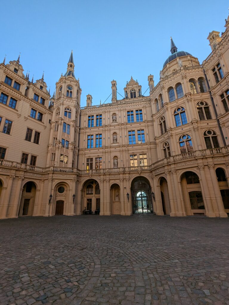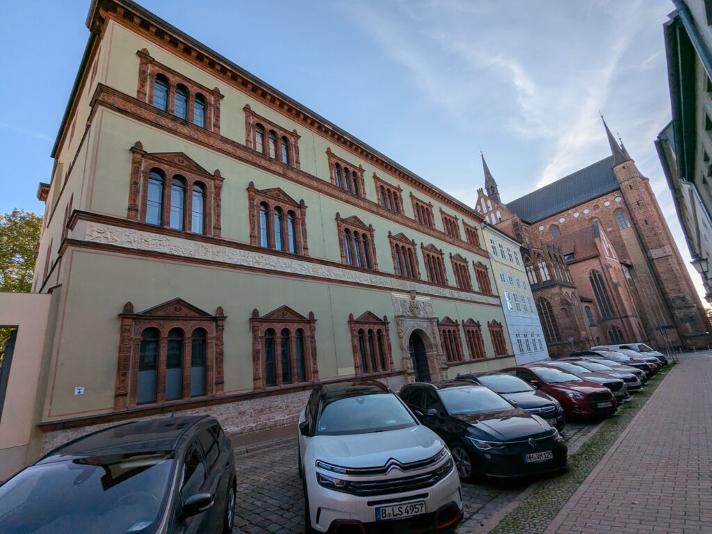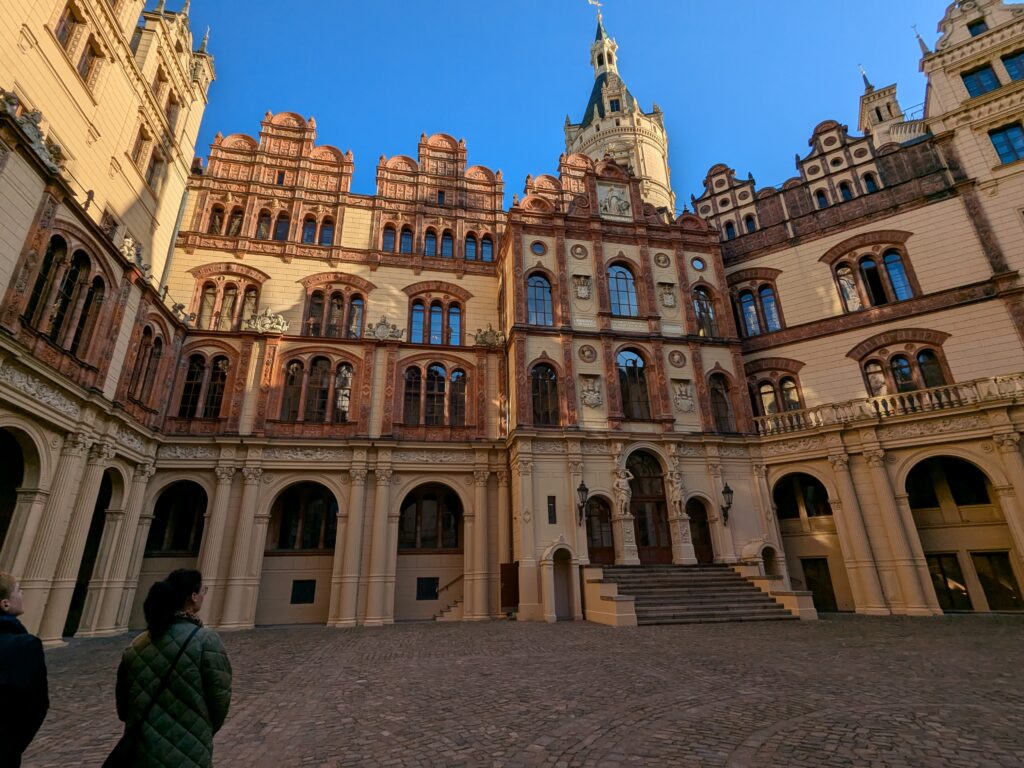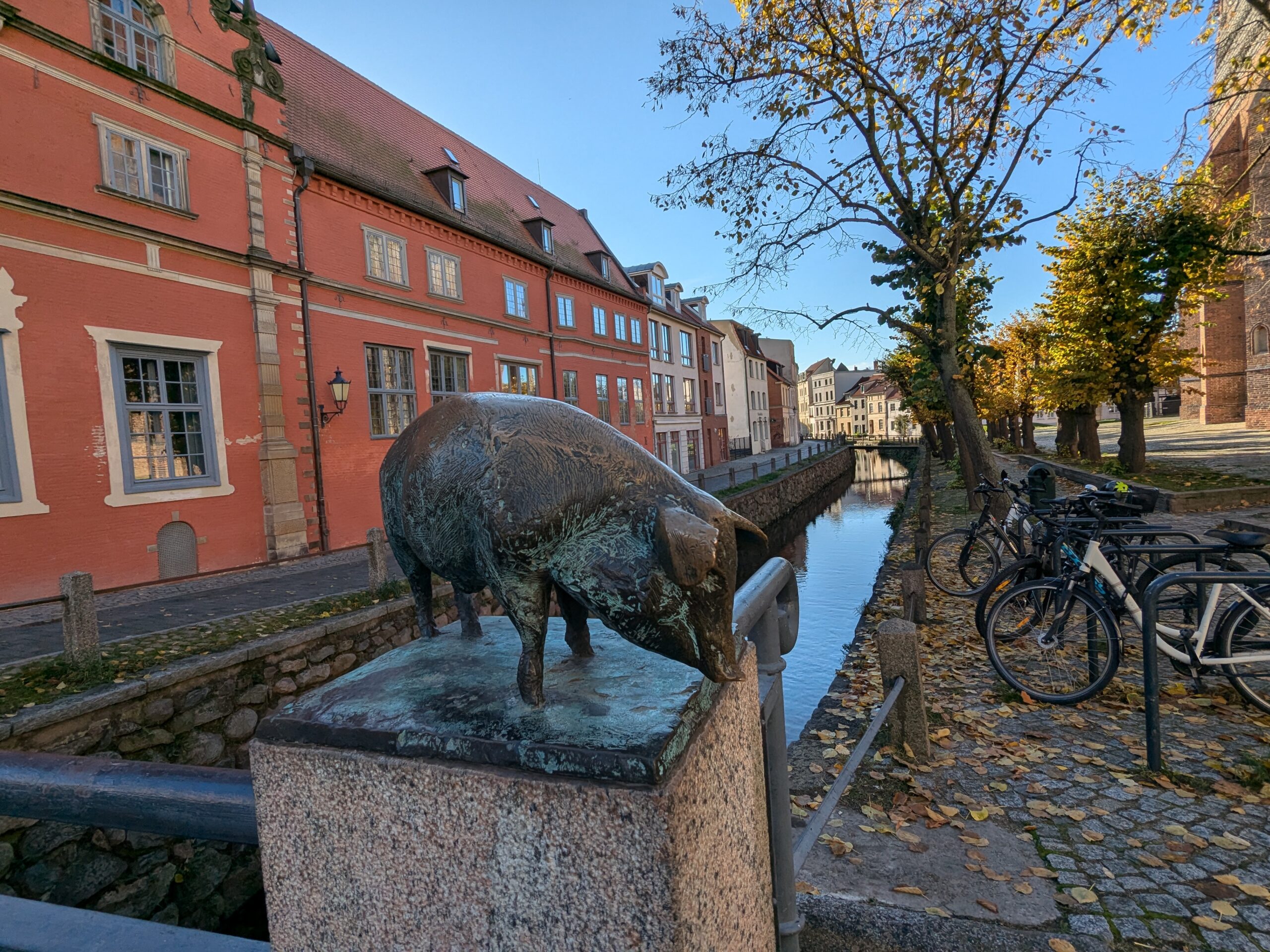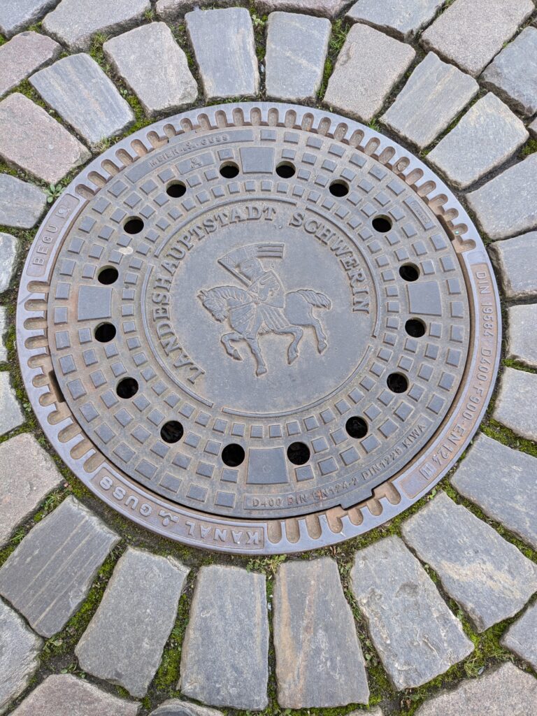 Mit Schrecken habe ich gestern Abend festhestellt, dass wir nur 50km von Schwerin entfernt sind. Das hatte ich gar nicht auf dem Schirm. Also Planänderung, nächster Stopp Hangar19 am Schweriner Innensee. Nach kurzer Fahrt mit zwei Gas-Tankversuchen. Der erste funzt nicht, trotz Hilfe des Chefs geht nichts in die Tankflasche rein. Beim 2. klappt es dann, erreichen wir Schwerin. Stolze 47,- wollen sie hier für die 2 Autos und Strom. Dann starten wir entgegen dem Rat des Betreibers mit den Rädern. Guter Plan. Der „kurze Weg in die Altstadt“ ist doch länger als gedacht. Die Räder stellen wir am Dom ab, ab da geht es per Pedes weiter. Erstmal Dom Besichtigung, dann weiter zum Schloss. Super beeindruckend. Hier rutschen wir fast aus Versehen in die Führung der Schlosskirche. Kostenlos, nur um eine Spende wird gebeten. Superschön und sehr interessant. Dann ein Lab-Cache im Burggarten mit wirklich beeindruckenden Bäumen, 160 Jahre alte Riesen. Noch einen kurzen Blick in den Schlossgarten. Ist uns aber zum Erlaufen zu viel. 1 Lab-Cache machen wir noch am Stadtmodell. Da muß man nur um das Bronzemodel wandern 🙂 das kriegen wir hin. Dann gibt es eine heiße Schokolade DRAUSSEN im Cafe am Marktplatz um 17:00, Ende Oktober bei 16°, bevor wir die Räder einsammeln und zum Stellplatz zurück radeln. Hier gibt es super lecker Nudeln beim Italiener am Platz. Heute sind wir dank der Räder nicht so viel gelaufen. Nur 8000 Schritte.