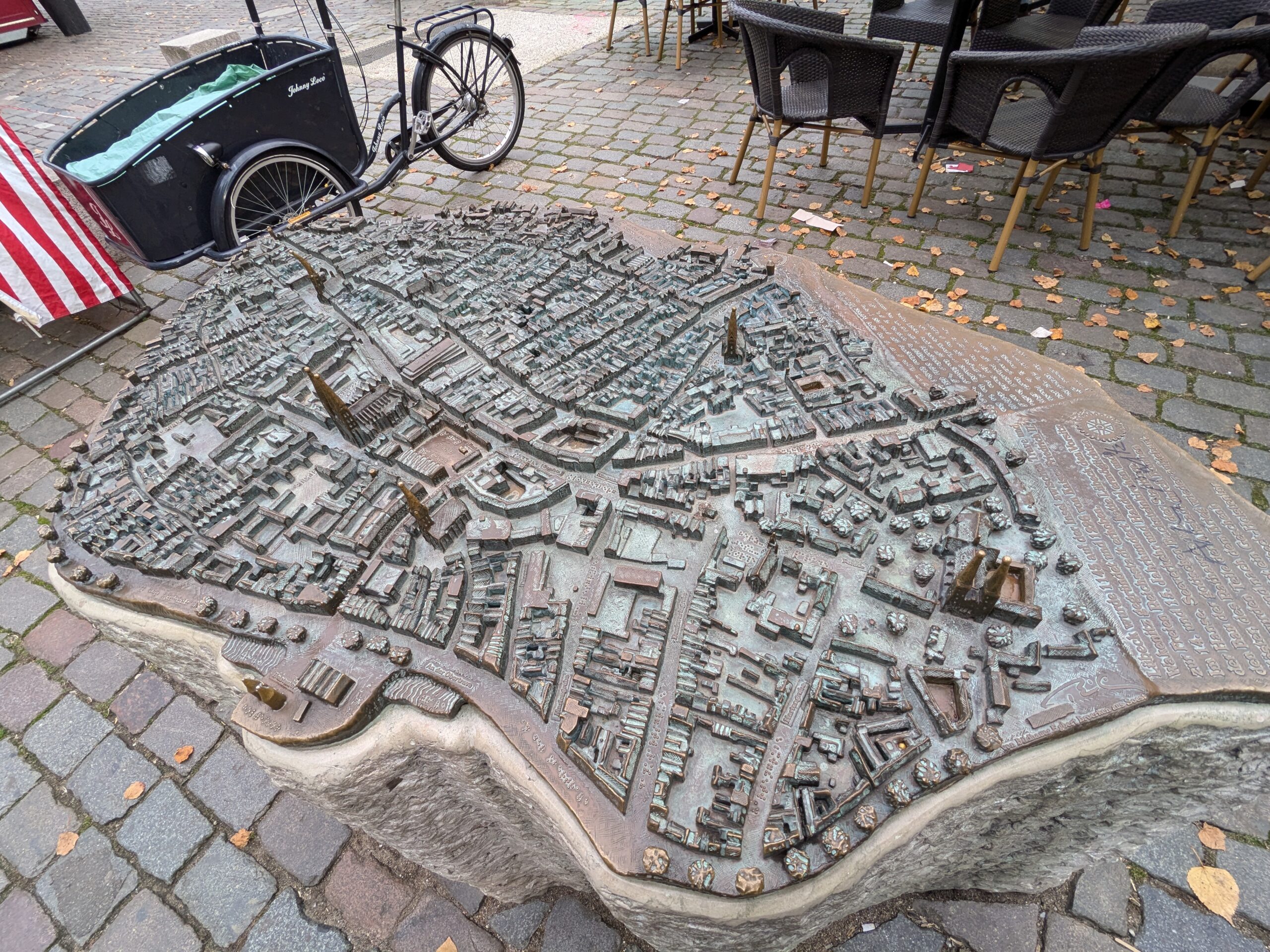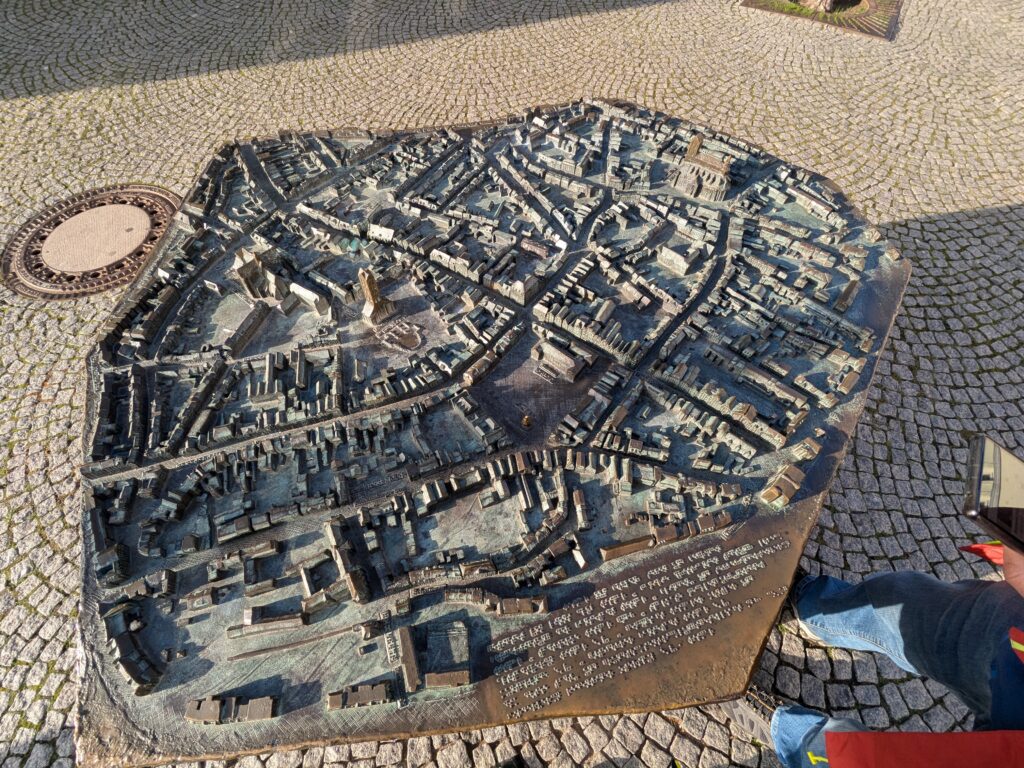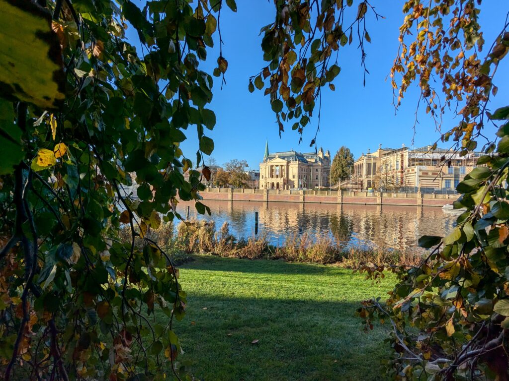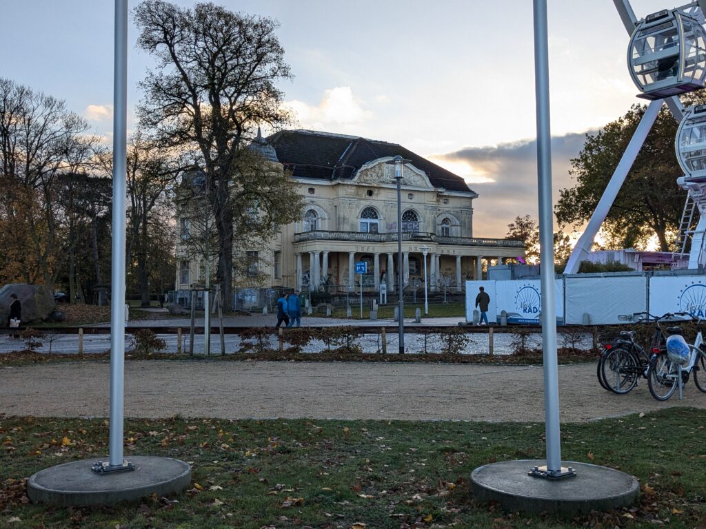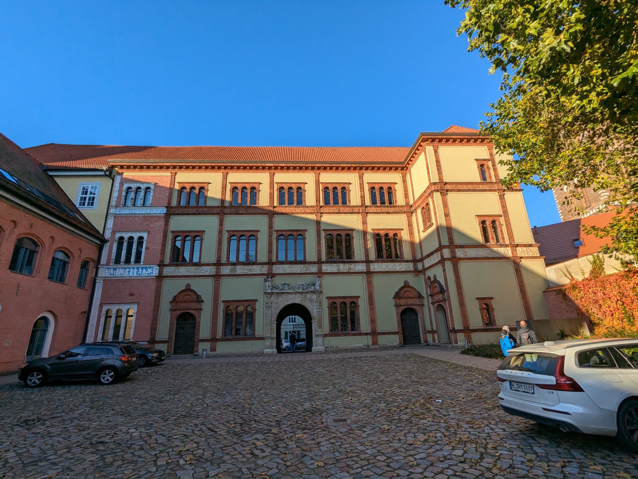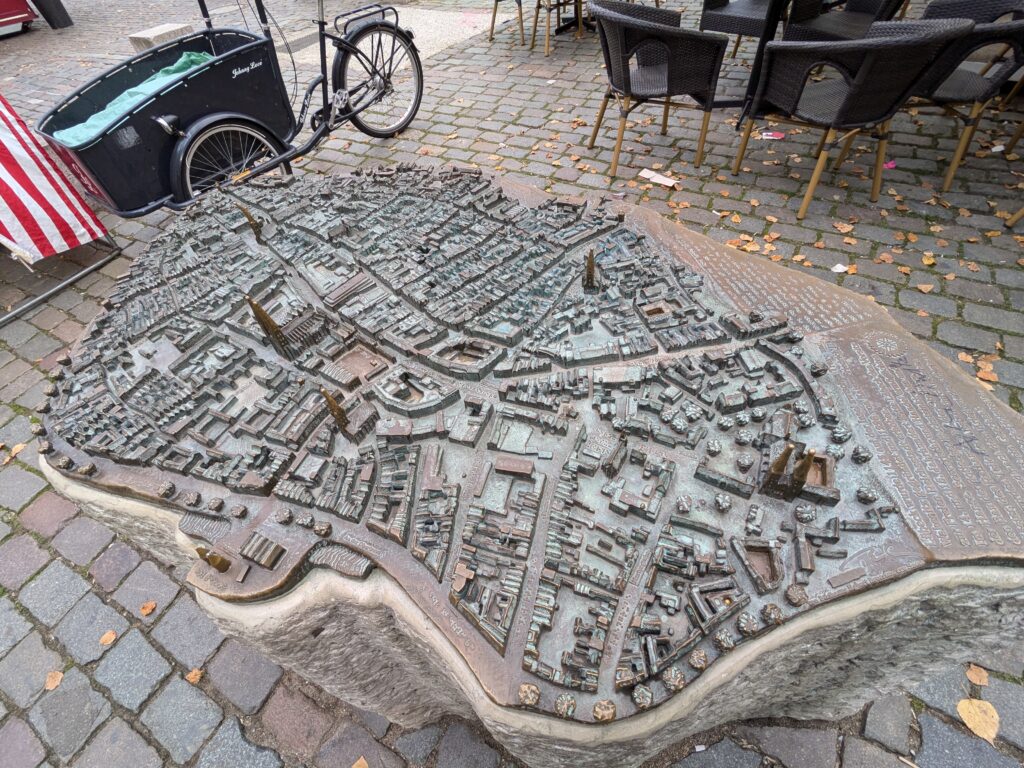 Mit Schrecken habe ich gestern Abend festhestellt, dass wir nur 50km von Schwerin entfernt sind. Das hatte ich gar nicht auf dem Schirm. Also Planänderung, nächster Stopp Hangar19 am Schweriner Innensee. Nach kurzer Fahrt mit zwei Gas-Tankversuchen. Der erste funzt nicht, trotz Hilfe des Chefs geht nichts in die Tankflasche rein. Beim 2. klappt es dann, erreichen wir Schwerin. Stolze 47,- wollen sie hier für die 2 Autos und Strom. Dann starten wir entgegen dem Rat des Betreibers mit den Rädern. Guter Plan. Der „kurze Weg in die Altstadt“ ist doch länger als gedacht. Die Räder stellen wir am Dom ab, ab da geht es per Pedes weiter. Erstmal Dom Besichtigung, dann weiter zum Schloss. Super beeindruckend. Hier rutschen wir fast aus Versehen in die Führung der Schlosskirche. Kostenlos, nur um eine Spende wird gebeten. Superschön und sehr interessant. Dann ein Lab-Cache im Burggarten mit wirklich beeindruckenden Bäumen, 160 Jahre alte Riesen. Noch einen kurzen Blick in den Schlossgarten. Ist uns aber zum Erlaufen zu viel. 1 Lab-Cache machen wir noch am Stadtmodell. Da muß man nur um das Bronzemodel wandern 🙂 das kriegen wir hin. Dann gibt es eine heiße Schokolade DRAUSSEN im Cafe am Marktplatz um 17:00, Ende Oktober bei 16°, bevor wir die Räder einsammeln und zum Stellplatz zurück radeln. Hier gibt es super lecker Nudeln beim Italiener am Platz. Heute sind wir dank der Räder nicht so viel gelaufen. Nur 8000 Schritte.
