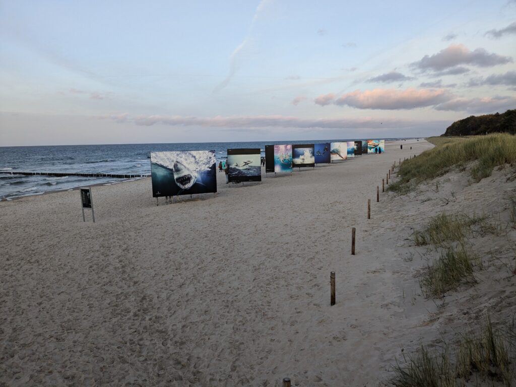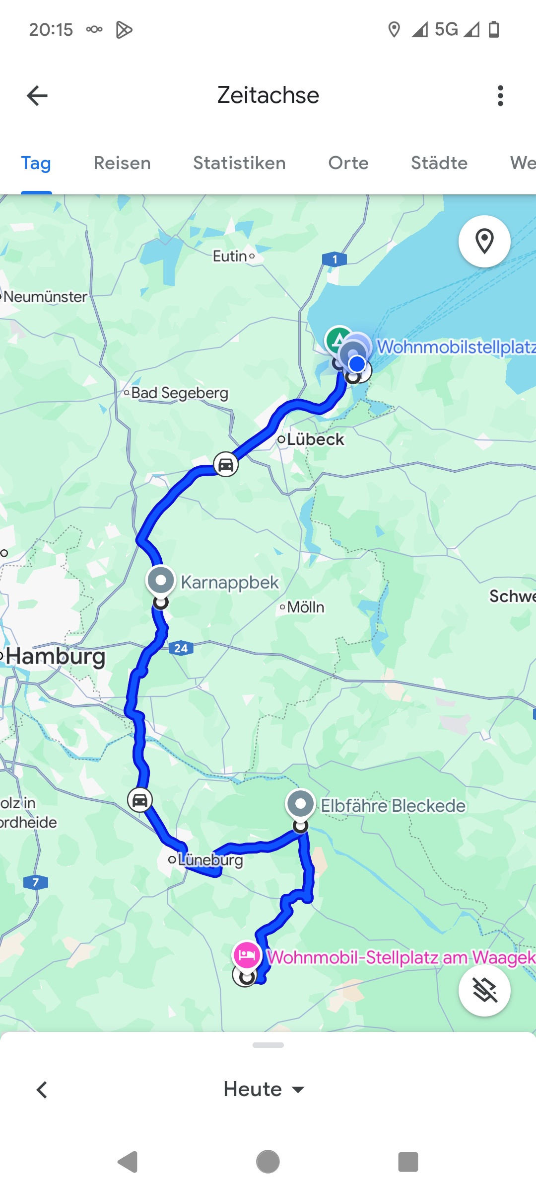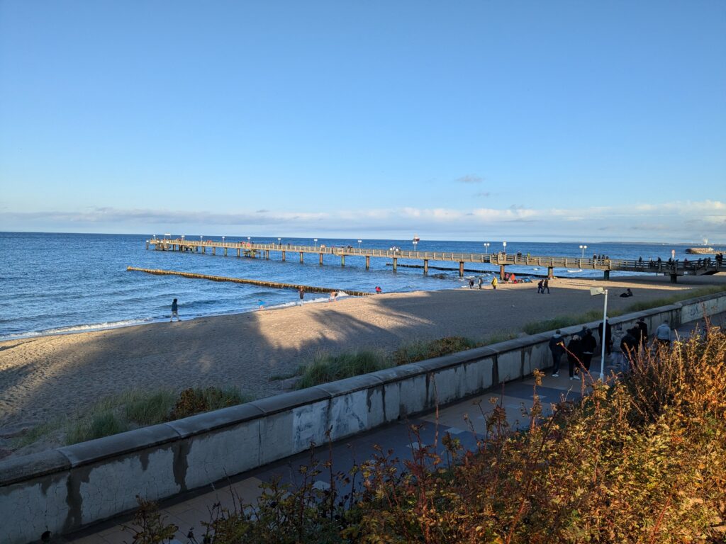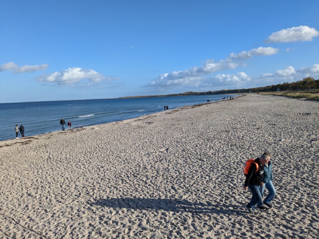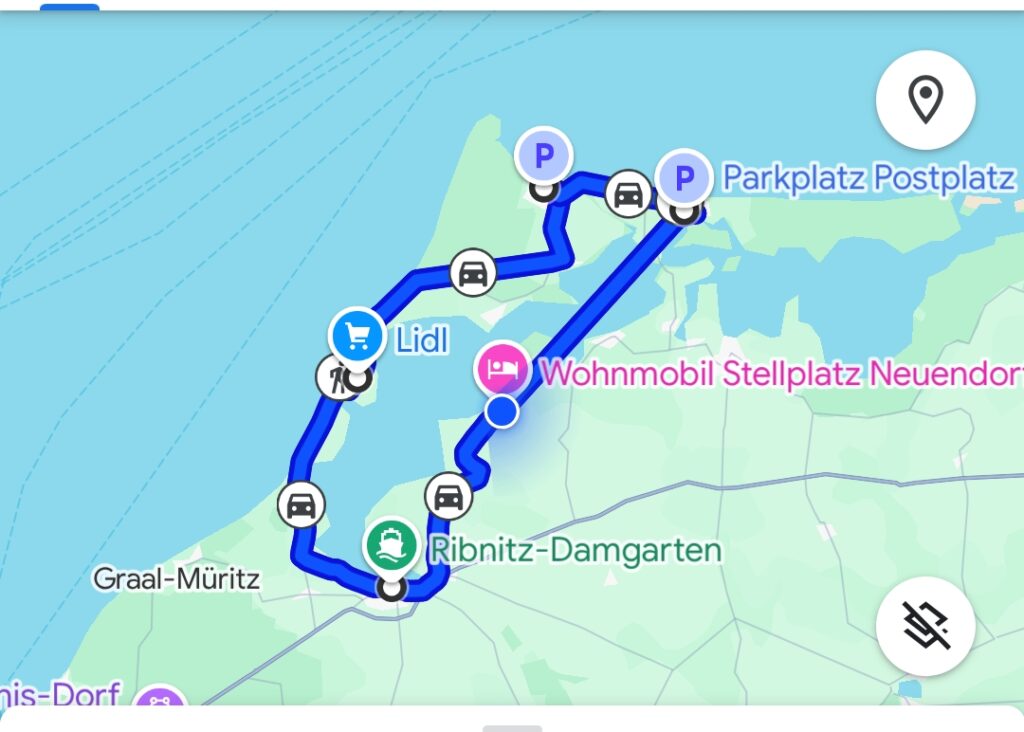 Um 8 klingelt der Wecker. Nach dem Frühstück mit Brötchen und Ei starten wir nach Norden, ein Stellplatz in Ratekau haben wir als Ziel. „Autobahn vermeiden“ ist eingestellt, aber nicht „Fähre vermeiden“, so stehen wir bei Neuhaus in der langen Schlange. Wir drehen um und fahren mit „Fähre vermeiden“ weiter. Der angesteuerte Platz in Ratekau gefällt uns nicht – weiter nach Travemünde/Kowitzberg. Viele sind abgereist und wir finden ein ruhiges Plätzchen am Rand. Nach Kaffee und Kuchen fahren wir nach Travemünde und laufen die Strandpromenade ab. Nach 7 km, 4 Adventure Labs und einem Fischbrötchen sind wir um 19:30 Uhr wieder im Womo.