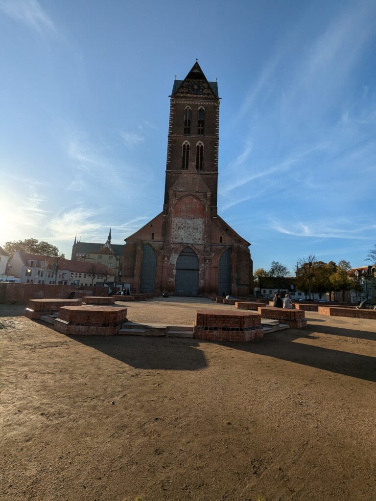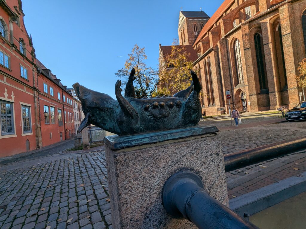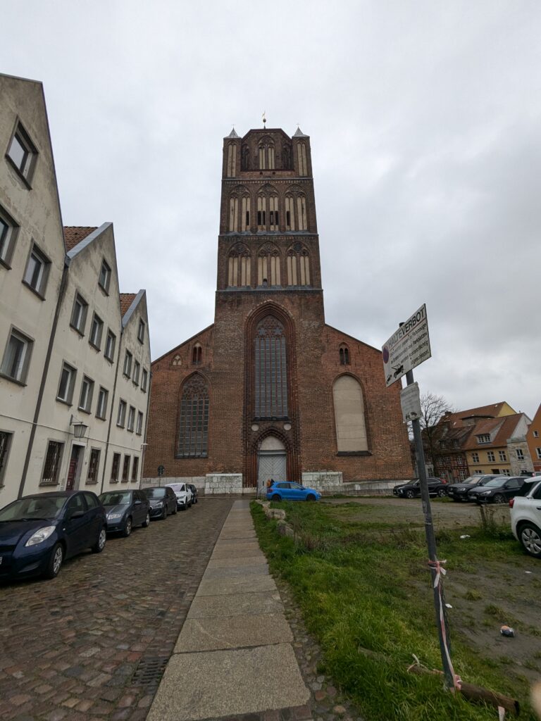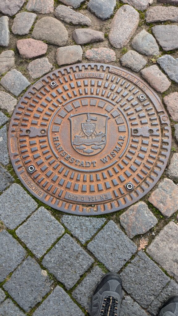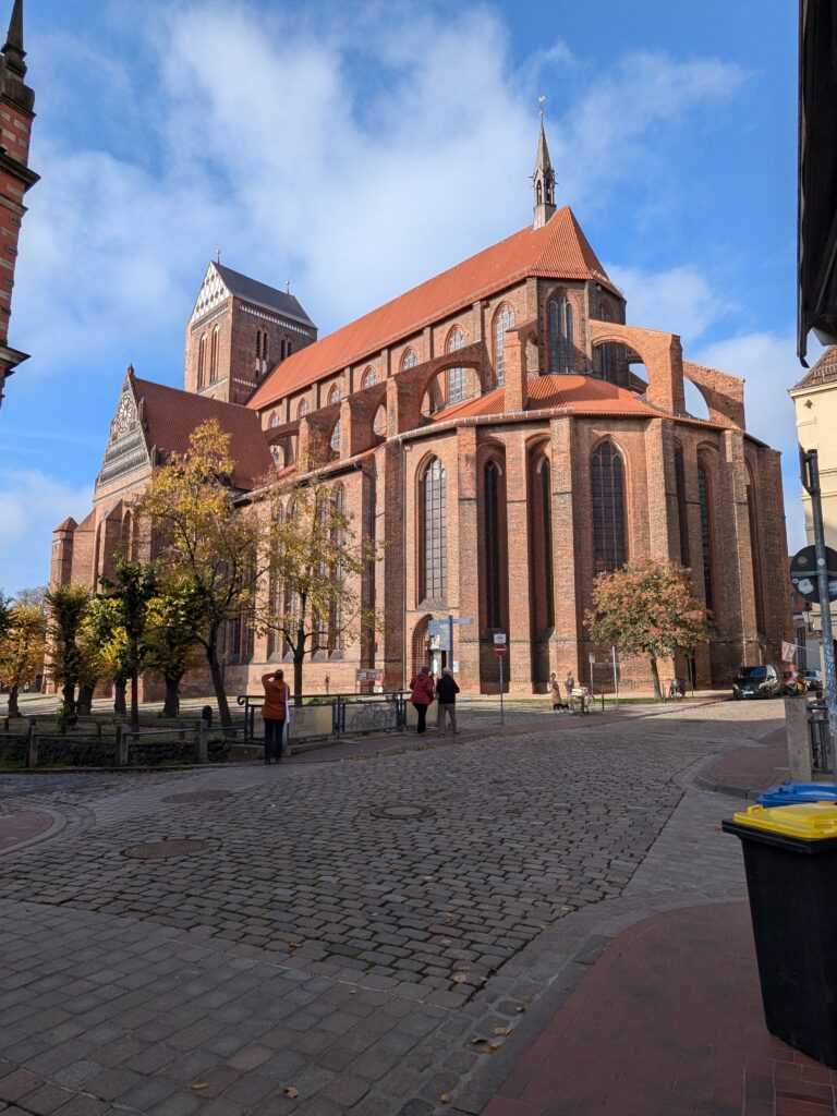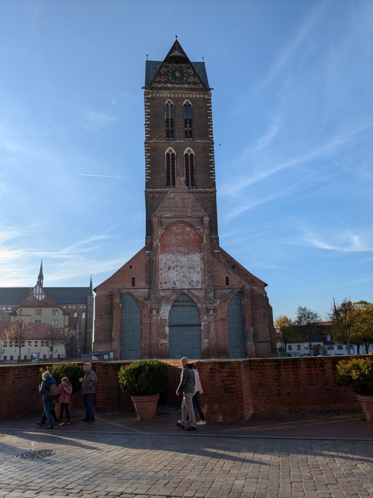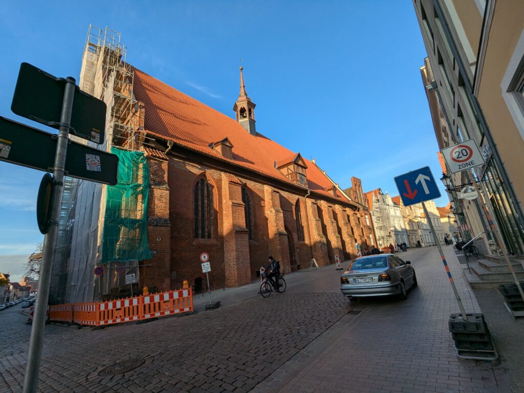 Wismar 2.0 , spontan beschließen wir noch einen Tag zu bleiben und es heute mal etwas ruhiger anzugehen. Heute jetzt aber wirklich. Zumindest nehmen wir heute die Räder. Super Idee, ganz viele Straßen hier haben Kopfsteinpflaster! Aber nicht so nettes kleines, so richtig fette Wacker, schon bei der ersten Station auf Störtebecker Spuren sind wir gut geschüttelt. Aber Kneifen gilt nicht, da wird fröhlich weiter gehoppelt. Ab und an ist sogar mal ein asphaltiertes Stück oder wir fahren einfach frech auf dem Bürgersteig. Heute besichtigen wir auch St. Georgen. Diese Kirche ist noch höher als St. Nikolai. Stolze 44m lichte Höhe misst das Hauptschiff und es sind sogar noch Reste der einst prächtigen Fresken zu sehen. Dann stehen wir vor der Heimat der „SOKO Wismar“, hier waren wir zwar gestern auch schon einmal, aber da habe ich vergessen es zu fotografieren. Schließlich gibt es auf dem Marktplatz Currywurst Pommes bevor wir weiterradeln. Um 17:00 ist dann Ende. Wir fahren zurück zum Stellplatz! Feierabend! Juchhu! Wir haben ein Dickschiff neben uns als Schallschutzmauer zur Dieselheizung.