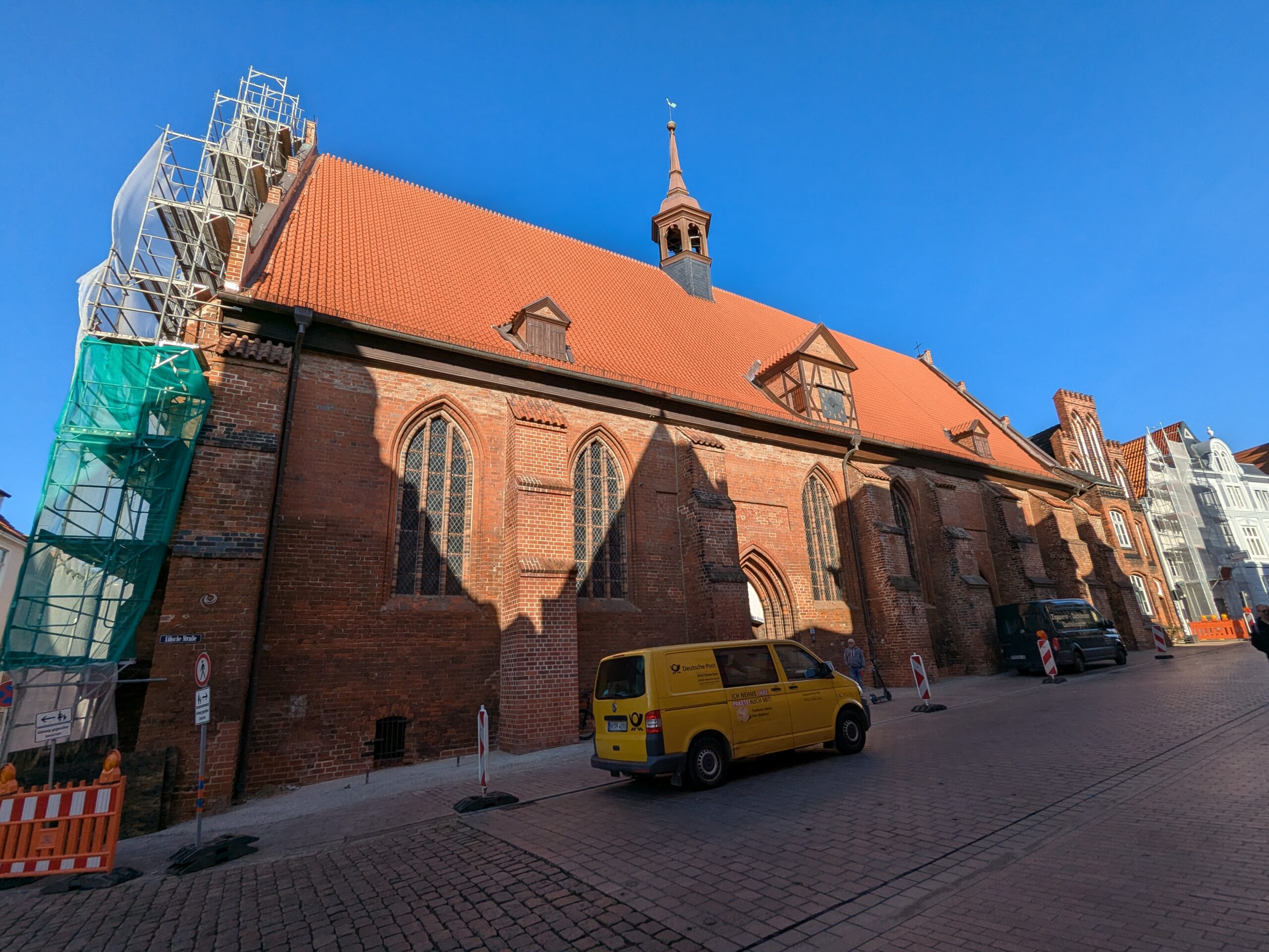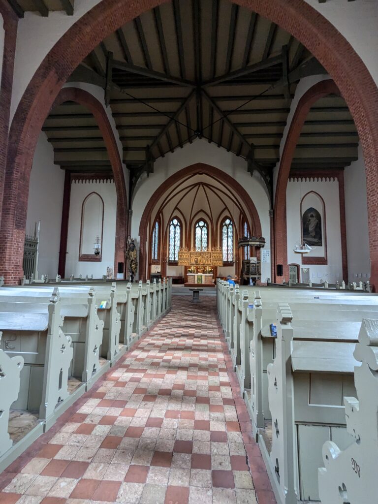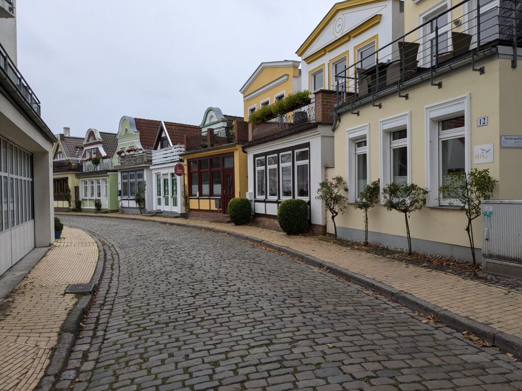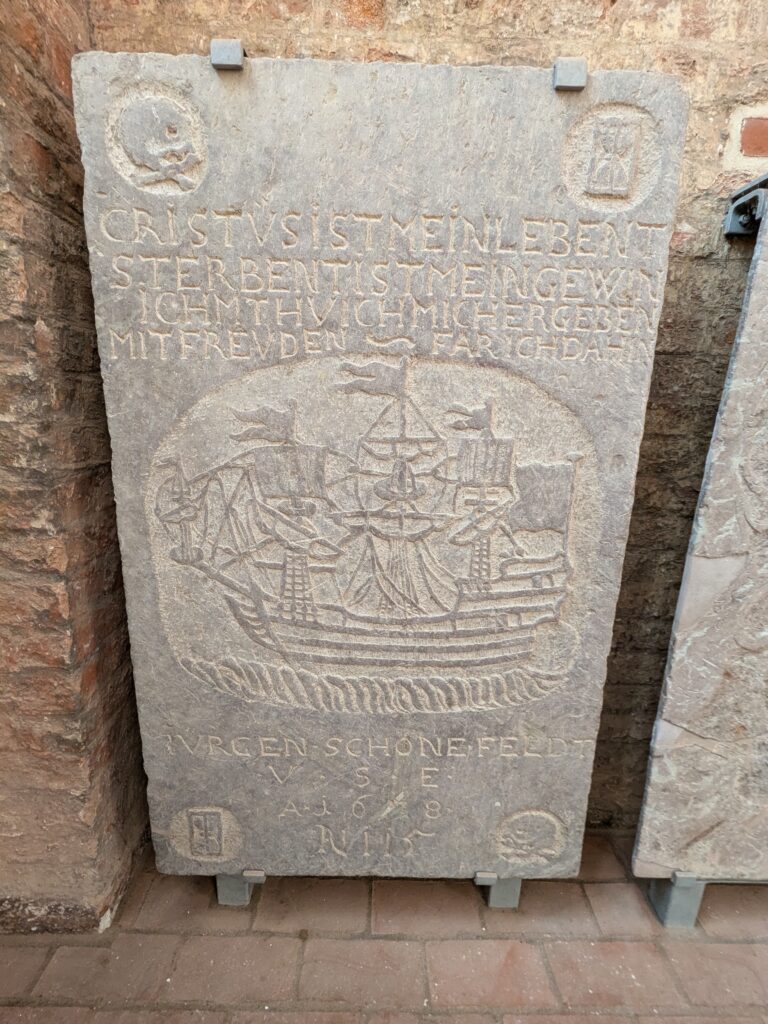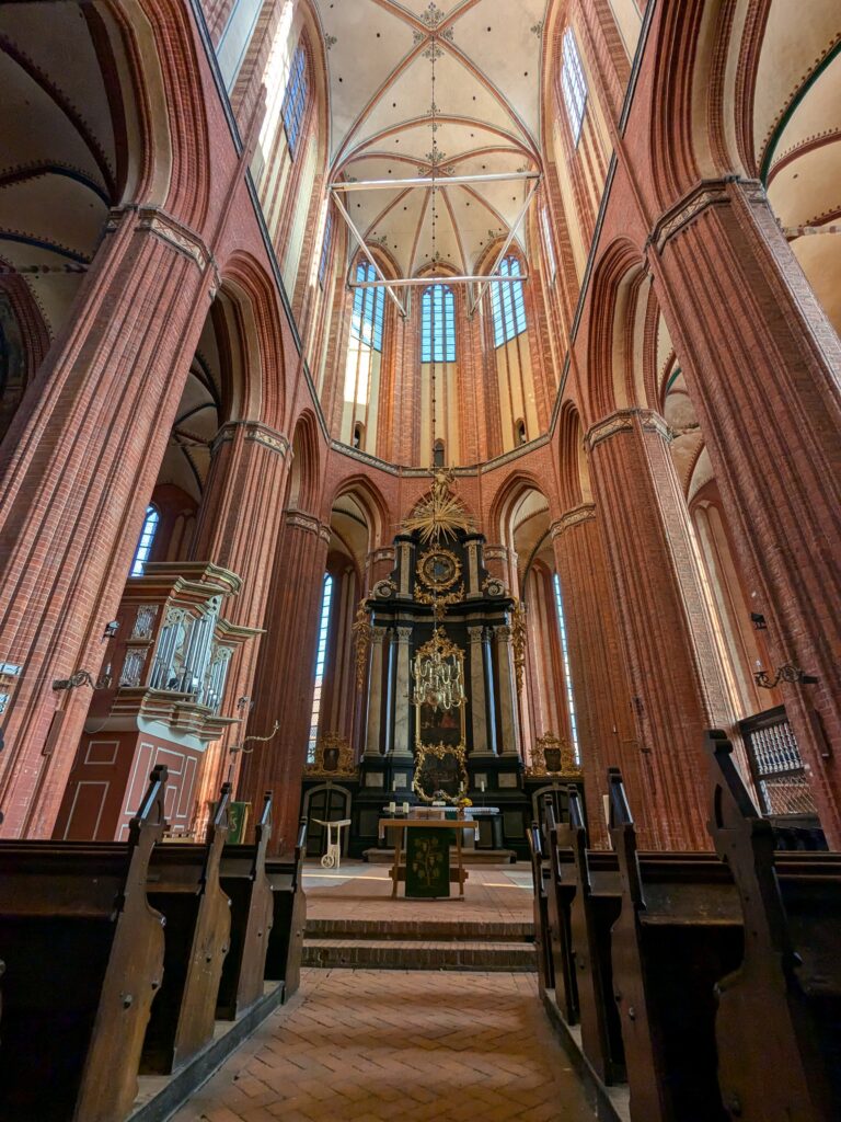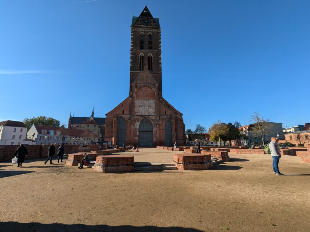 Wismar 2.0 , spontan beschließen wir noch einen Tag zu bleiben und es heute mal etwas ruhiger anzugehen. Heute jetzt aber wirklich. Zumindest nehmen wir heute die Räder. Super Idee, ganz viele Straßen hier haben Kopfsteinpflaster! Aber nicht so nettes kleines, so richtig fette Wacker, schon bei der ersten Station auf Störtebecker Spuren sind wir gut geschüttelt. Aber Kneifen gilt nicht, da wird fröhlich weiter gehoppelt. Ab und an ist sogar mal ein asphaltiertes Stück oder wir fahren einfach frech auf dem Bürgersteig. Heute besichtigen wir auch St. Georgen. Diese Kirche ist noch höher als St. Nikolai. Stolze 44m lichte Höhe misst das Hauptschiff und es sind sogar noch Reste der einst prächtigen Fresken zu sehen. Dann stehen wir vor der Heimat der „SOKO Wismar“, hier waren wir zwar gestern auch schon einmal, aber da habe ich vergessen es zu fotografieren. Schließlich gibt es auf dem Marktplatz Currywurst Pommes bevor wir weiterradeln. Um 17:00 ist dann Ende. Wir fahren zurück zum Stellplatz! Feierabend! Juchhu! Wir haben ein Dickschiff neben uns als Schallschutzmauer zur Dieselheizung.