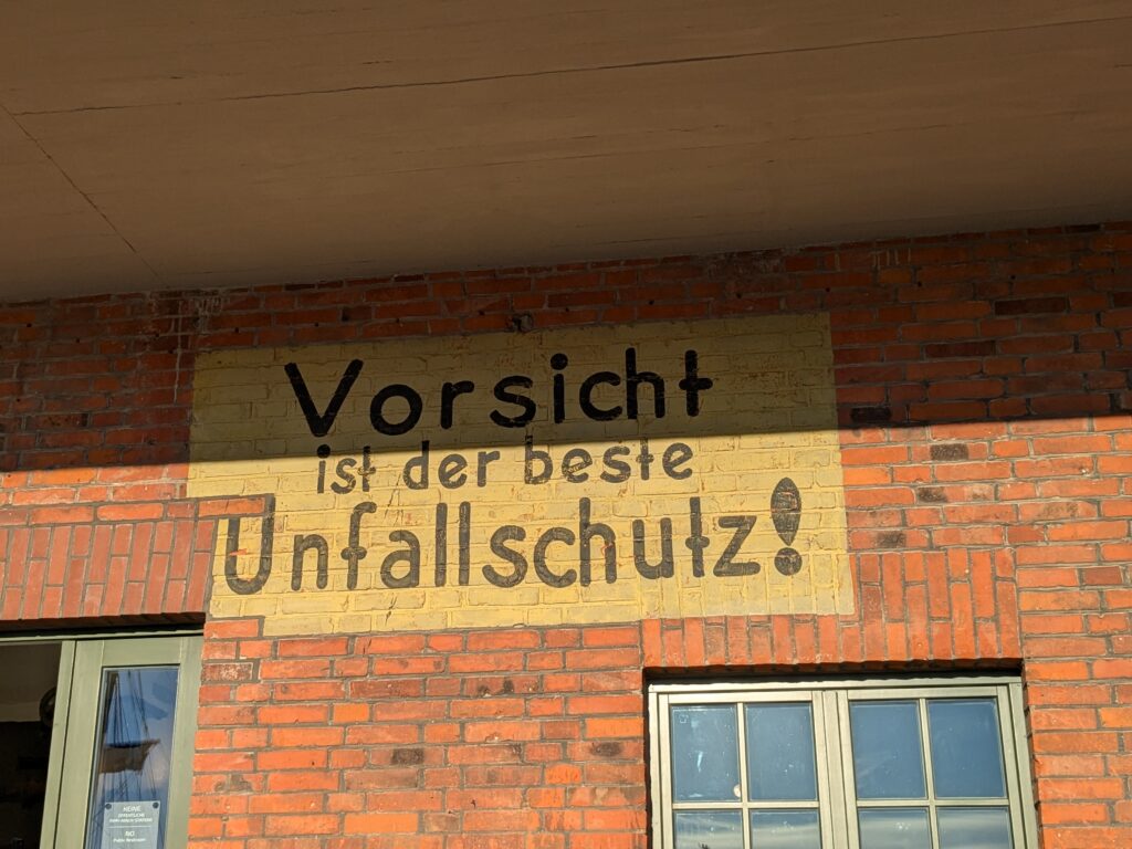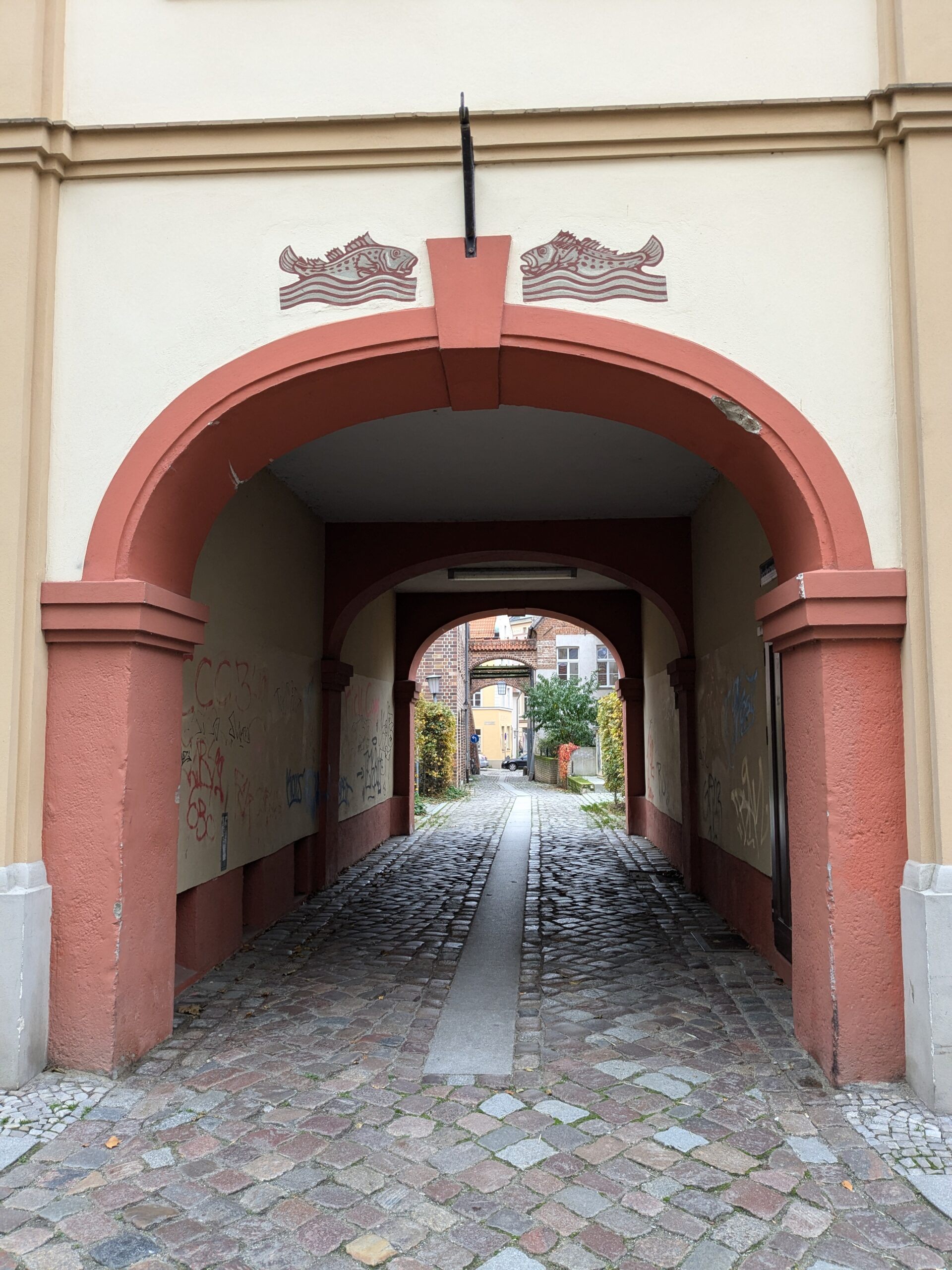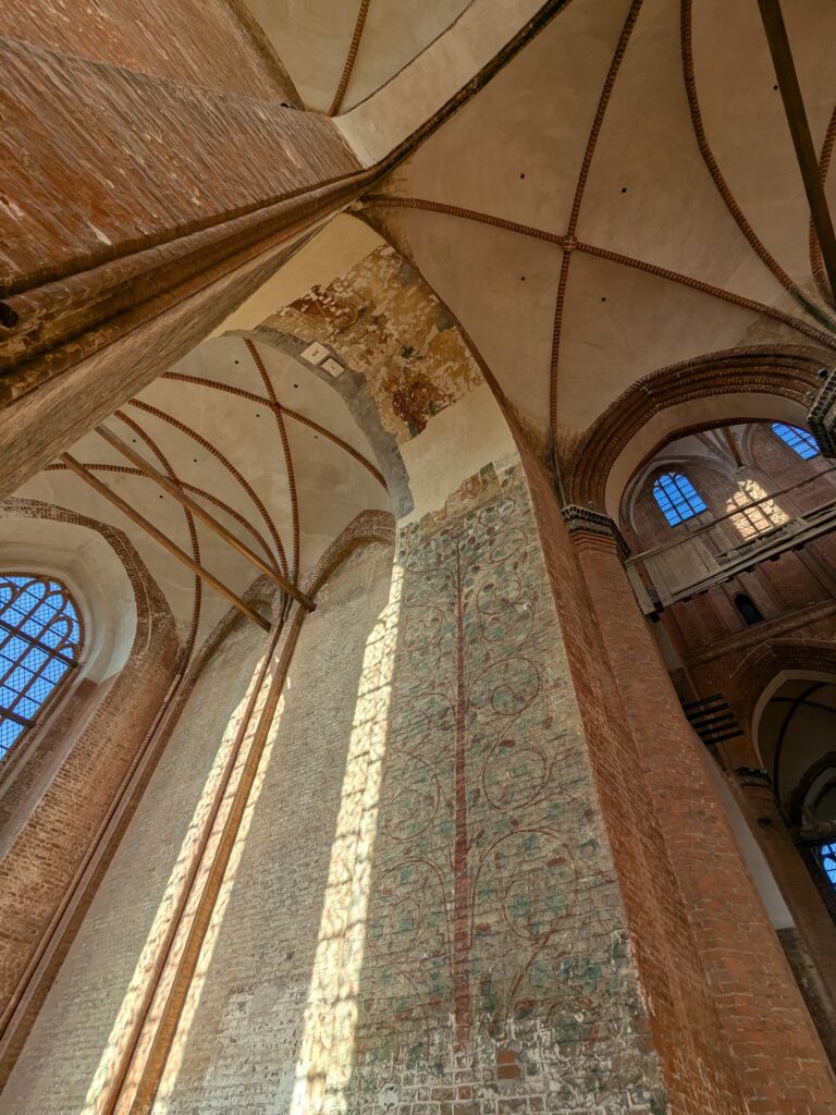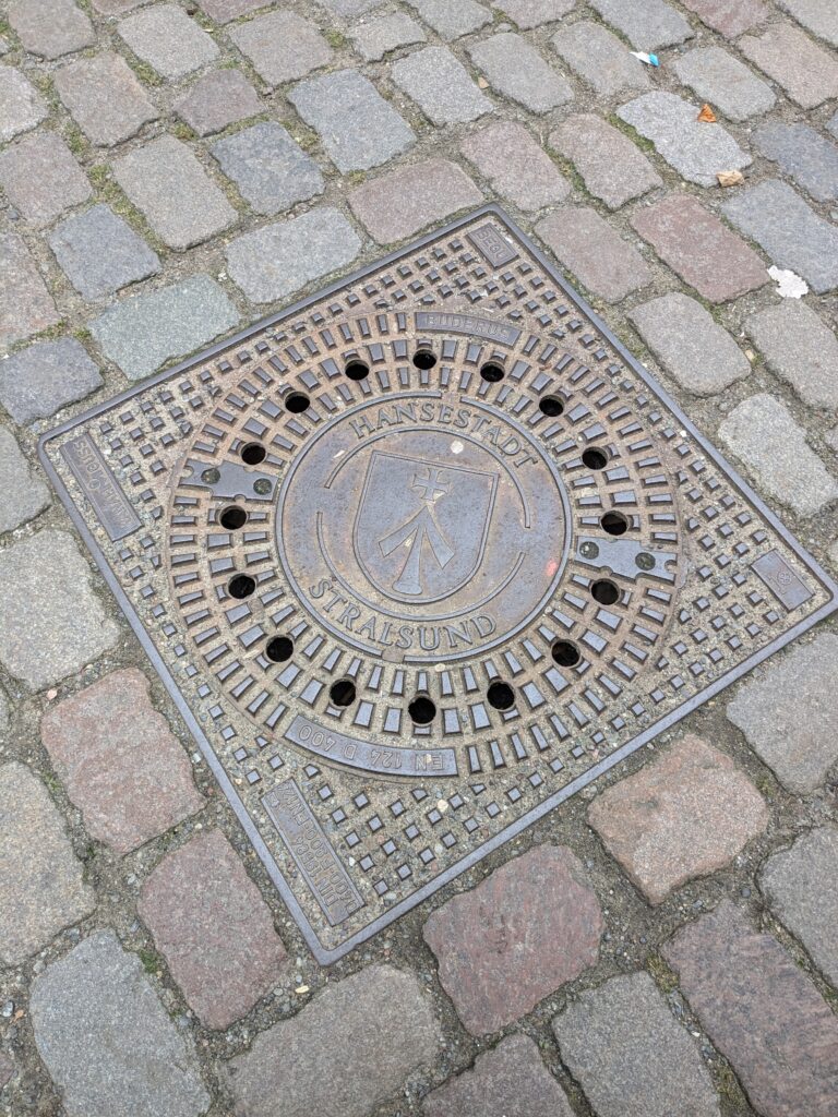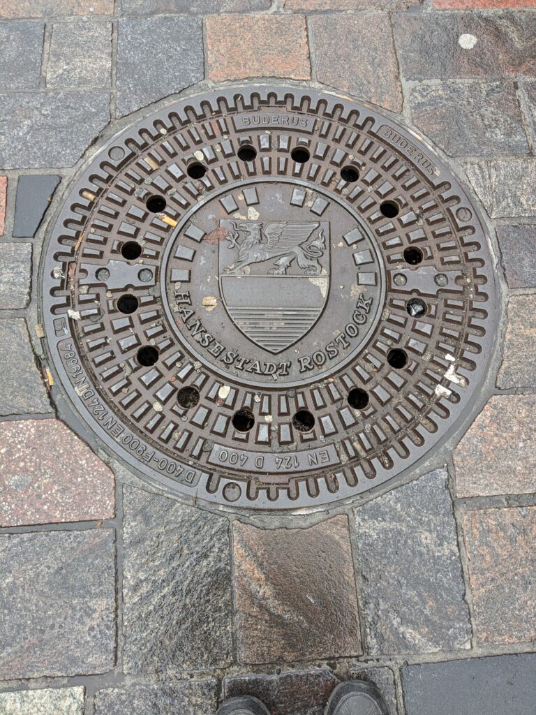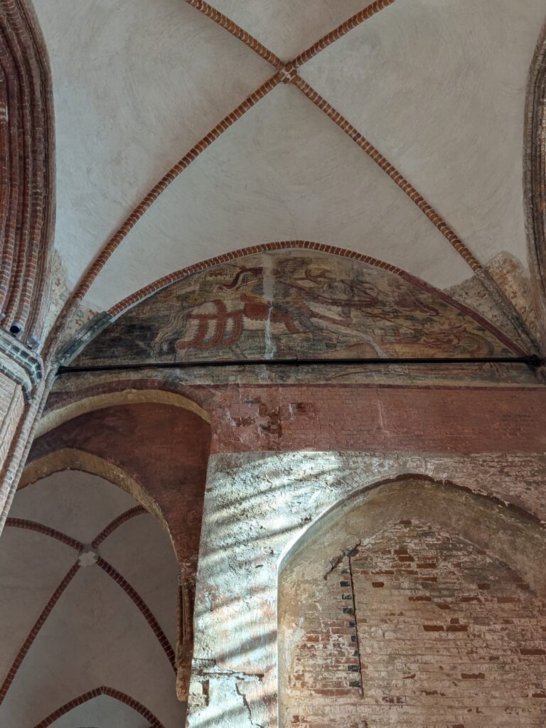 Wismar 2.0 , spontan beschließen wir noch einen Tag zu bleiben und es heute mal etwas ruhiger anzugehen. Heute jetzt aber wirklich. Zumindest nehmen wir heute die Räder. Super Idee, ganz viele Straßen hier haben Kopfsteinpflaster! Aber nicht so nettes kleines, so richtig fette Wacker, schon bei der ersten Station auf Störtebecker Spuren sind wir gut geschüttelt. Aber Kneifen gilt nicht, da wird fröhlich weiter gehoppelt. Ab und an ist sogar mal ein asphaltiertes Stück oder wir fahren einfach frech auf dem Bürgersteig. Heute besichtigen wir auch St. Georgen. Diese Kirche ist noch höher als St. Nikolai. Stolze 44m lichte Höhe misst das Hauptschiff und es sind sogar noch Reste der einst prächtigen Fresken zu sehen. Dann stehen wir vor der Heimat der „SOKO Wismar“, hier waren wir zwar gestern auch schon einmal, aber da habe ich vergessen es zu fotografieren. Schließlich gibt es auf dem Marktplatz Currywurst Pommes bevor wir weiterradeln. Um 17:00 ist dann Ende. Wir fahren zurück zum Stellplatz! Feierabend! Juchhu! Wir haben ein Dickschiff neben uns als Schallschutzmauer zur Dieselheizung.