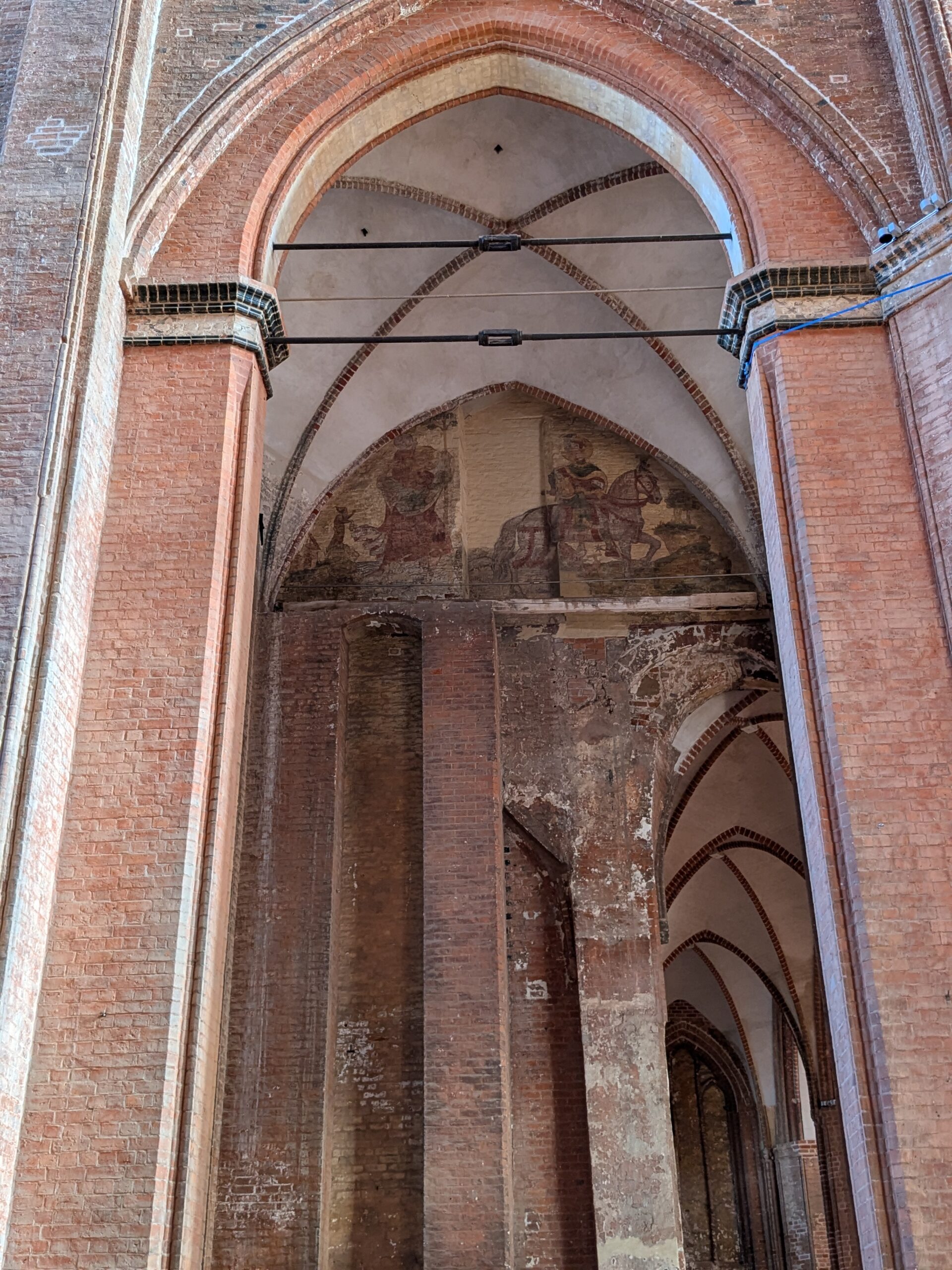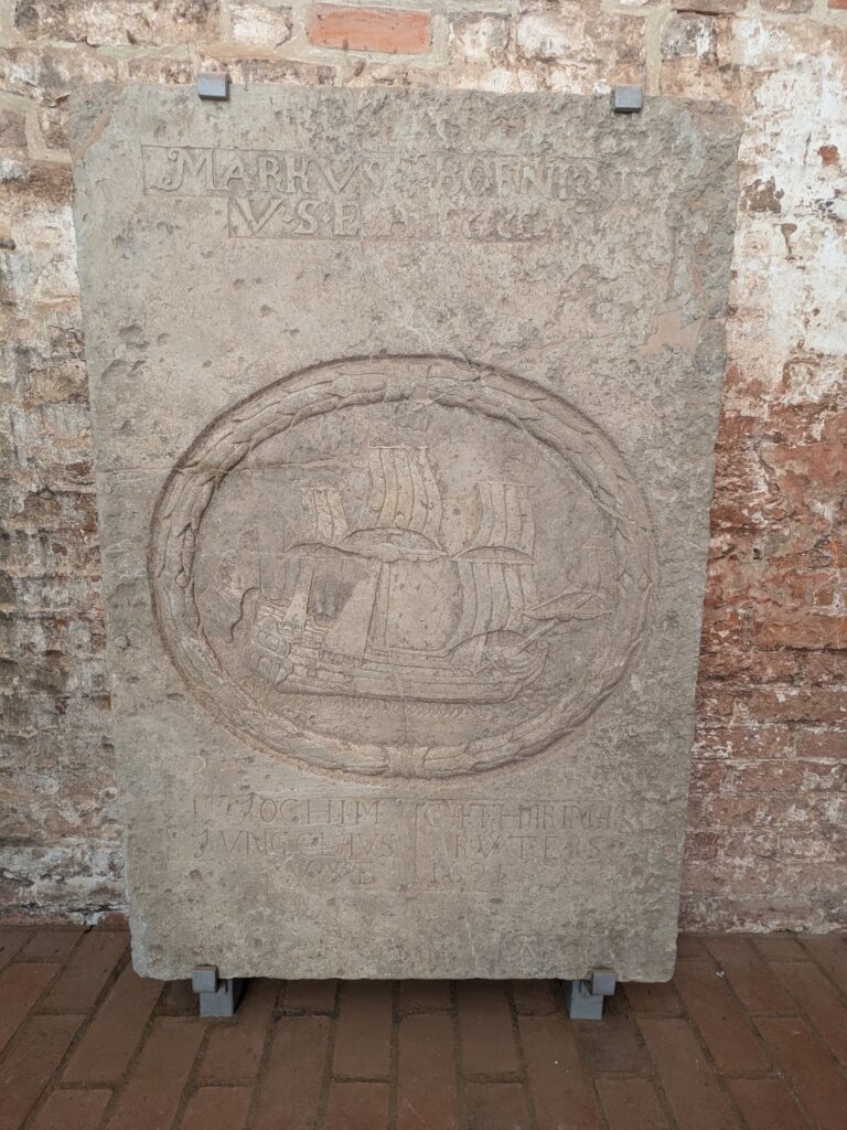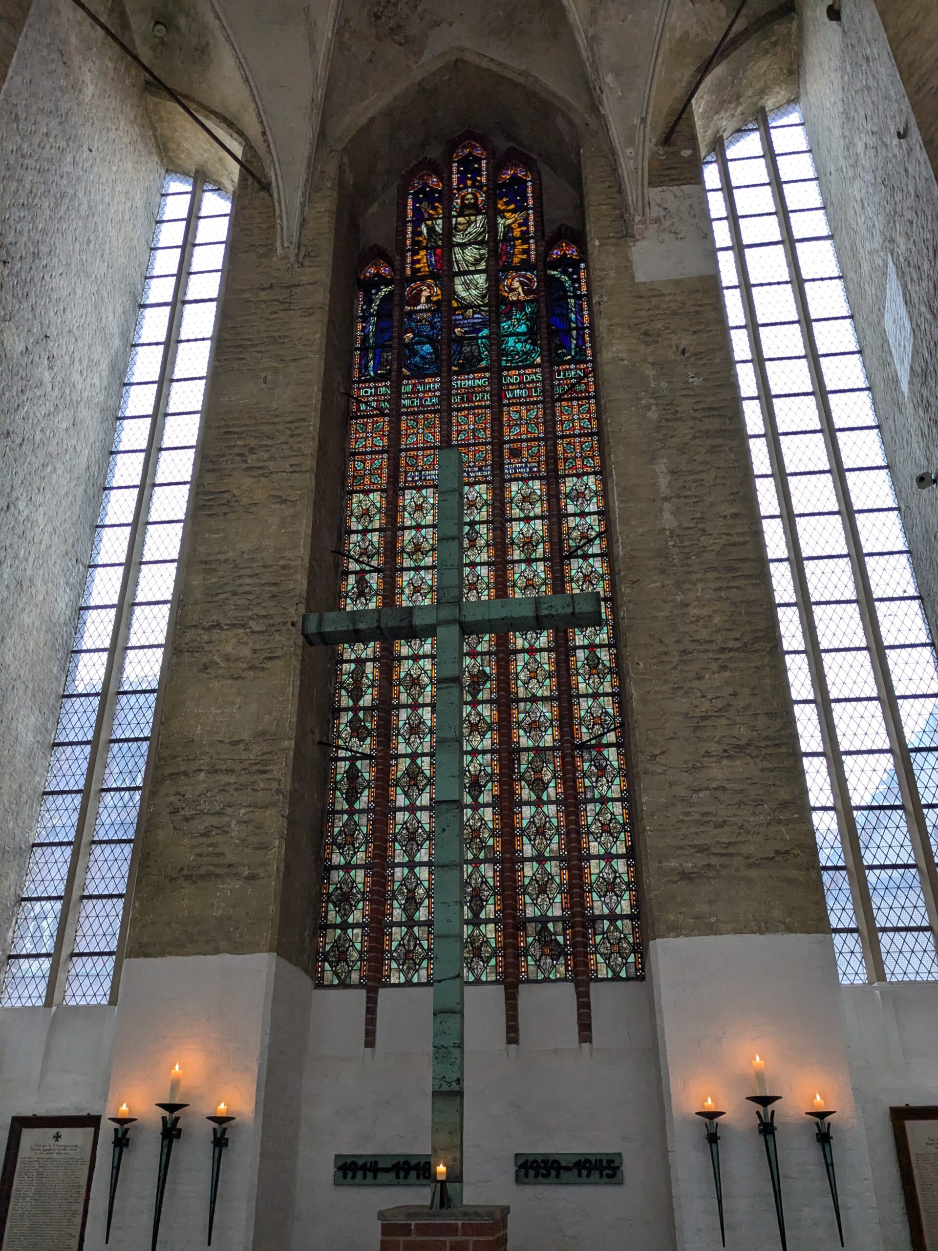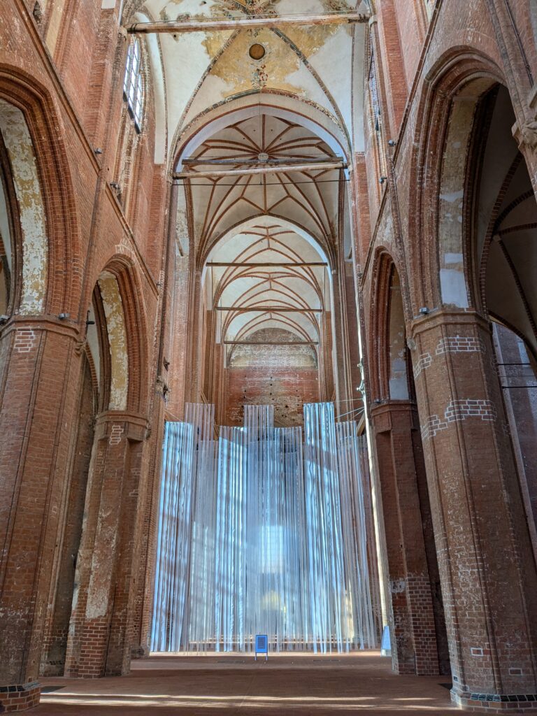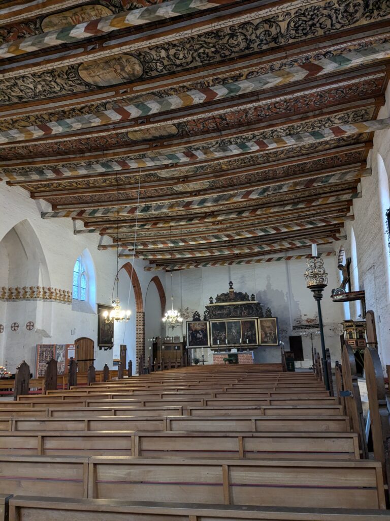 Wismar 2.0 , spontan beschließen wir noch einen Tag zu bleiben und es heute mal etwas ruhiger anzugehen. Heute jetzt aber wirklich. Zumindest nehmen wir heute die Räder. Super Idee, ganz viele Straßen hier haben Kopfsteinpflaster! Aber nicht so nettes kleines, so richtig fette Wacker, schon bei der ersten Station auf Störtebecker Spuren sind wir gut geschüttelt. Aber Kneifen gilt nicht, da wird fröhlich weiter gehoppelt. Ab und an ist sogar mal ein asphaltiertes Stück oder wir fahren einfach frech auf dem Bürgersteig. Heute besichtigen wir auch St. Georgen. Diese Kirche ist noch höher als St. Nikolai. Stolze 44m lichte Höhe misst das Hauptschiff und es sind sogar noch Reste der einst prächtigen Fresken zu sehen. Dann stehen wir vor der Heimat der „SOKO Wismar“, hier waren wir zwar gestern auch schon einmal, aber da habe ich vergessen es zu fotografieren. Schließlich gibt es auf dem Marktplatz Currywurst Pommes bevor wir weiterradeln. Um 17:00 ist dann Ende. Wir fahren zurück zum Stellplatz! Feierabend! Juchhu! Wir haben ein Dickschiff neben uns als Schallschutzmauer zur Dieselheizung.
