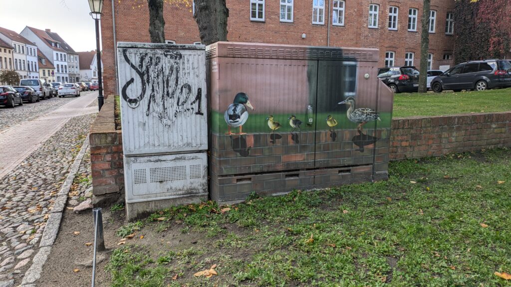 Hier sind viele Stromkästen schick bemalt, leider nicht alle.