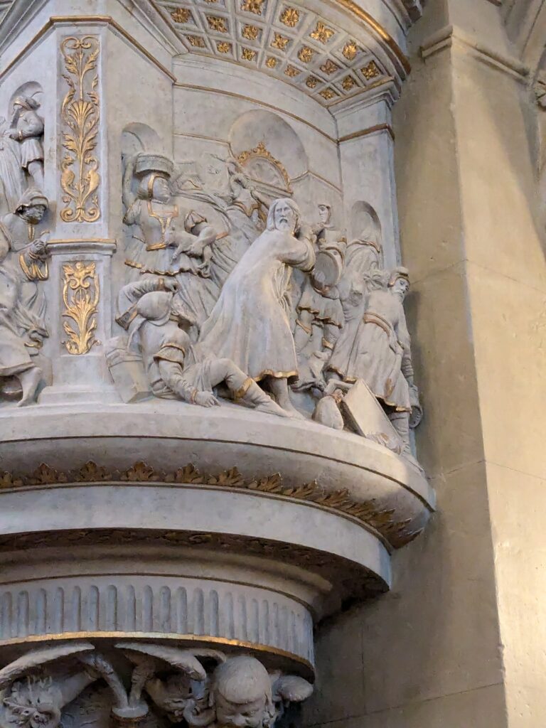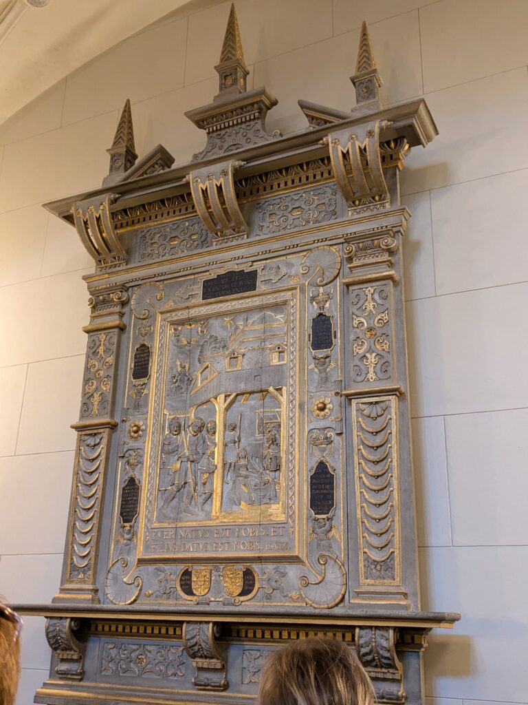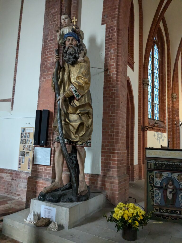 Über alles wacht ein 3,72m höher Christopherus. Nothelfer der Reisenden und Seefahrer. Um 1500 aus einem Stück Eiche geschnitzt.