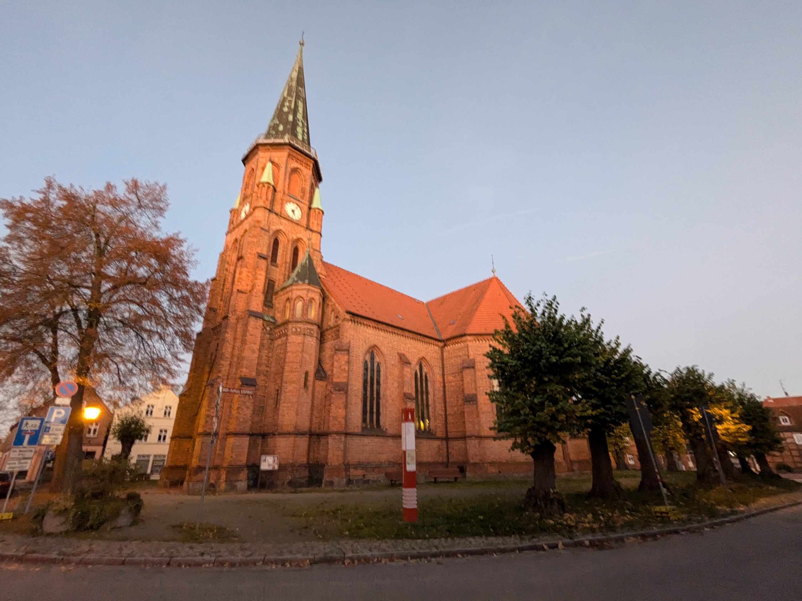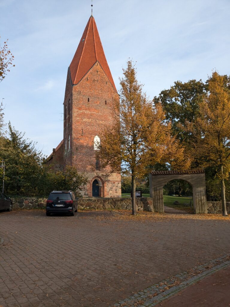 Nach einer sehr ruhigen sternenklaren Nacht, ist es heute Morgen nebelig. Wir starten mit einer Premiere, Aufbackbrötchen aus dem Lidl-Omnia. Klappt prima, nach 20 Minuten sind knusprige Brötchen fertig zum Verzehr. Dann zuppeln wir gaaanz langsam (teils mit 40kmh wegen Rollsplitt) nach Wismar. Hier laufen wir den Stellplatz am Westhafen an. Der liegt einfach optimal für die Stadtbesichtigung. Nach dem Check-in, stapfen wir los. Am Hafen gibt es erst einmal ein Matjes-Brötchen. Dann geht es wie immer auf den Spuren der Lab-Caches kreuz und quer durch die Stadt mit vielen schönen alten Häusern und drei riesigen Backsteinkirchen. St. Nikolai ist noch intakt und mit einer Kirchenschiffhöhe von 37m echt beeindruckend. Von St. Marien steht nach einem Bombenangriff 1945 nur noch der 80m hohe Turm. Der Rest der schwer zerstörten Kirche wurde 1960 gesprengt. Heute zeigen niedrige Backsteinmauern symbolisch das ursprüngliche Ausmaß der Kirche. Die Dritte, St. Georgen hat keinen richtigen Turm, hierfür ging 1544 das Geld aus. Trotzdem ein imposanter Bau, dem auch die beiden Bombentreffer 1945 nicht viel anhaben konnten. Obwohl sie einst das Schmuckstück der Stadt war, folgte von 1945-1990 Verfall und Zerstörung. Schließlich fehlte das meiste vom Dach, sowie Fenster und Türen. Am 25.01.1990 brachte ein Orkan den Giebel des Nordquerhauses zum Einsturz. Erst jetzt begann die Sanierung. Heute finden hier Konzerte und Gottesdienste statt. Nach Kaffee Kuchen auf dem Marktplatz begeben wir uns dann noch auf Nosferatus Spuren. Nosferatu-Eine Symphonie des Grauens wurde 1921 in Wismar gedreht und natürlich gibt es auch hierzu einen Lab-Cache. Dieser führt uns gegen 17:00 wieder zum Hafen. Jetzt haben wir genug. Der Schrittzähler sagt rund 11700 Schritte, also ab ins Auto, um noch etwas Urlaub zu genießen. Apropos genießen, die Freuden des Sardinen-Stadt-Campings sind allesamt da: der VW LT 28 mit H-Kennzeichen macht ein sehr kräftiges „Ratsch-bumm“, die Transe mit Aufstelldach lässt die Dieselstandheizung römern, so dass der Neuankömmling neben ihm gleich die Flucht ergreift und der letzte Ankömmling pumpt mit seinem Kompressor die Luftfederung auf, damit die Fuhre hinten nicht so doll runterhängt 😉 . Aber um 20:15 Uhr wird es ruhiger, die Satelliten-Schüsseln sind alle ausgerichtet, nur noch die SOKO Wismar rast mit Tatütata durch den Ort.