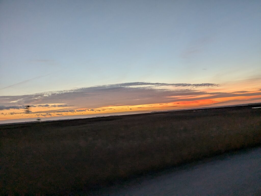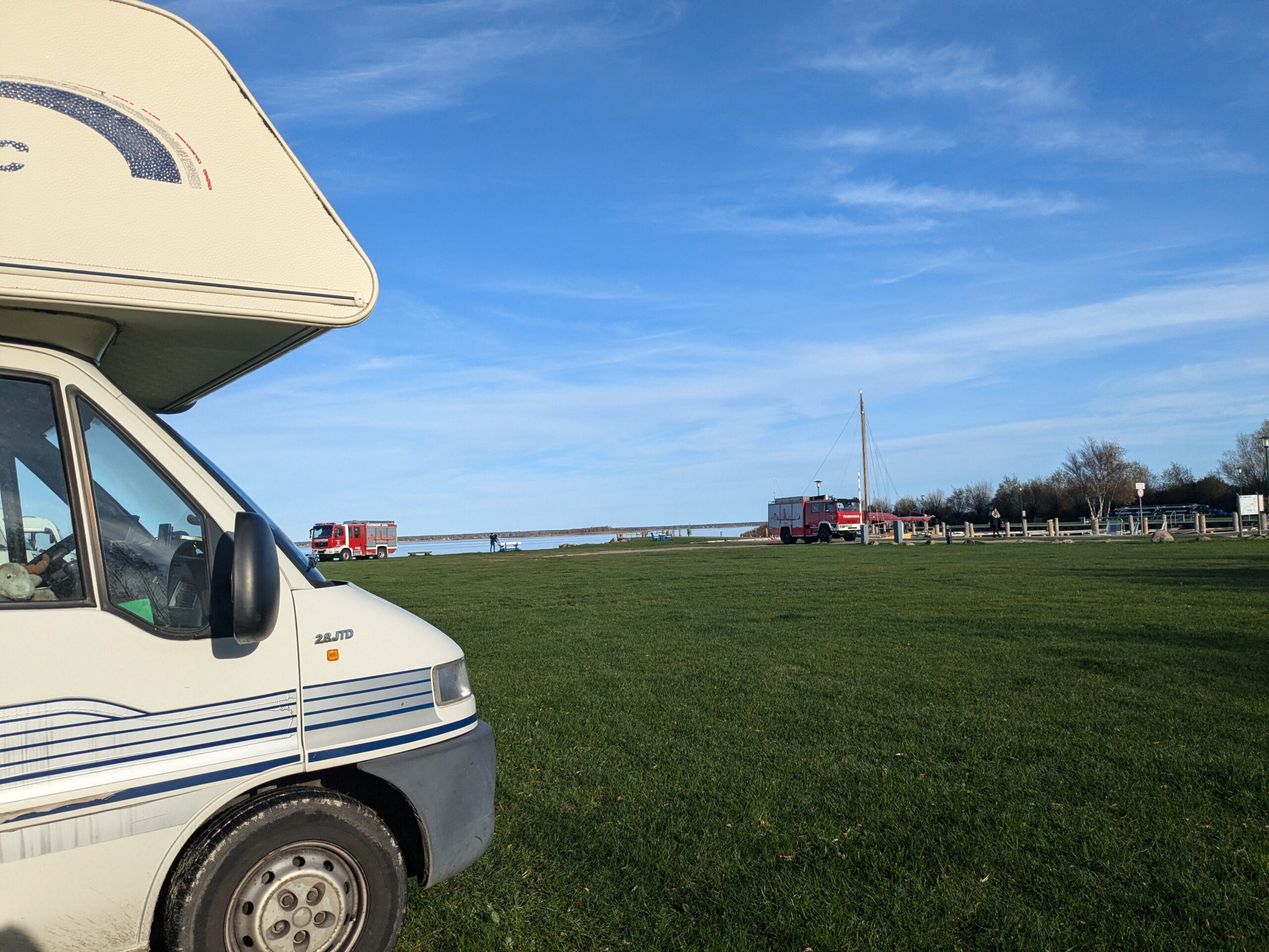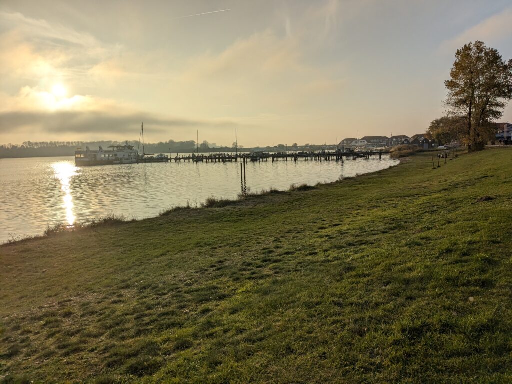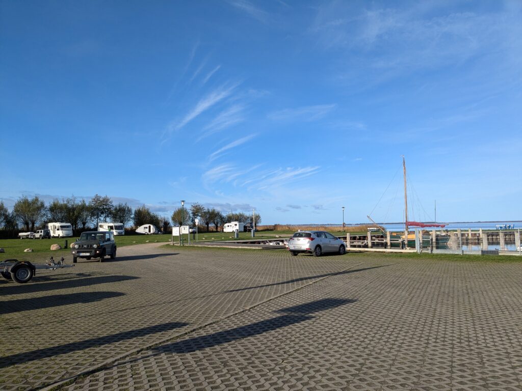 Später am Abend ist dann doch noch ein Kastencamper gekommen, der sich aber brav in die hinterste Ecke verzogen hat. Aber zu früh gefreut, gleich darauf kommt der obligatorische Kuschelcamper und quetscht dicht neben uns. Nur mit Mühe ist Ralf vom Umparken abzuhalten. Wir wollen morgen ja eh weiter. Nach dem Frühstück geht es dann los. Erstmal wieder durch den mautpflichtigen Tunnel (5,10 € für den Lütten, 13,90 fürs Womo) unter der Warnow, das erspart uns das Verkehrschaos von Rostock. Dann weiter bis Saal OT Neuendorf am Hafen, hier auf dem Wasserwanderrastplatz finden wir ein Plätzchen. 2 Mobile sind schon da, aber es ist ausreichend Platz mit Blick auf den Darßer Bodden. Leider nieselt es wieder und ist ziemlich ungemütlich. Unsere Laune ist auch nicht so toll, im Wobi leuchten zwei Warnleuchten. Das heißt, die Anzeige der Einspritzung leuchtet, die für’s Vorglühen zuckt ab und zu. Der Motor läuft aber rund??? Während Ralf auf Ursachensuche geht, koche ich Nudeln mit Tomatensoße und Mettbällchen. Ergebnis: Suche nicht plausibel, keine Lösung, Essen lecker. Nach dem Essen kommt dann auch der Hafenmeister. Wir checken ein und vertagen das Lämpchenproblem, um erstmal nach Zingst zu fahren. Hier geht es zunächst zum Darß, dann durch den durchaus netten Ort zur Seebrücke. Und schließlich im Abendrot zurück zum Stellplatz für 24 € inkl. Strom und Kurtaxe.Toilette ist super und Duschen kostet extra. Weil’s so ruhig ist, gleich für 2 Nächte.
