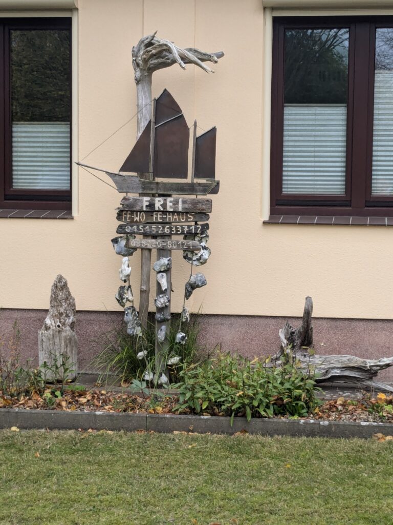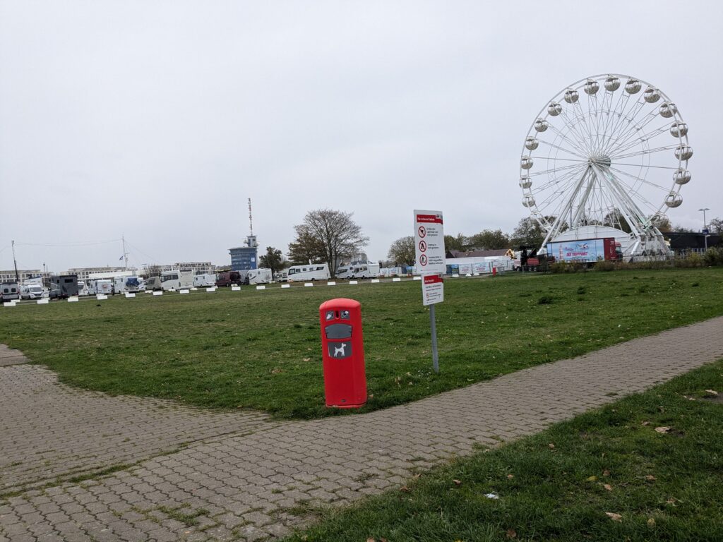 Gegen 11 sind wir auch fertig und fahren Richtung Warnemünde. Kurz vorher wollen wir auf einen Stellplatz an der „Hauptstrasse“, war ne kleine Nebenstraße mit Kopfsteinpflaster, bin ich erstmal vorbei gefahren. Im 2. Anlauf entdecke ich die Womo-Schilder und bin reingefahren. Eine Riesenwiese mit ca. 50 Plätzen und wir sind die Einzigen. Der Lütte parkt am Rand und für 25,50 € ist alles da, Strom, Ver- und Entsorgung. Schuhe sollen wir nicht draussen lassen, die holt sich der Fuchs! Danach schlendern wir durch Warnemünde, absolvieren 3 Lab-Cache, essen Scholle mit Pommes. Nach über 9000 Schritten machen wir Feierabend und sitzen bei leichtem Nieselregen um 17 Uhr im Halloween-Womo. Den Regen hatten wir schon den ganzen Nachmittag, war aber nicht tragisch.