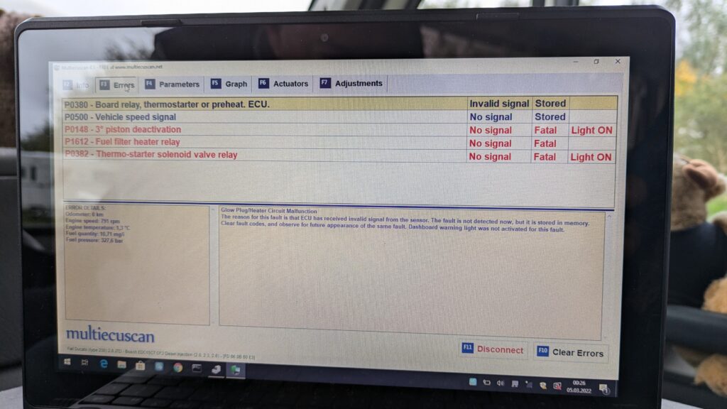 Heute nochmal am Vormittag das Motorproblem angegangen. Die Tage rumgesucht nach einer möglichen Lösung, und Zack, gleich Volltreffer. Sicherung F11 im Motorraum unter einer geschraubten Abdeckung ist durch, neue rein, gleich wieder durch. Also die Heizung für die Kurbelgehäuseentlüftung abgeklemmt, neue Sicherung und alles OK. Fehlermeldungen sind weg und nix leuchtet im Armaturenbrett. Geht erstmal so, die Heizung wird nur bei Minusgraden wirklich gebraucht.