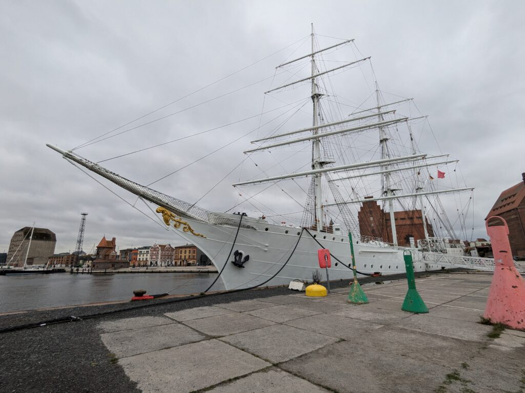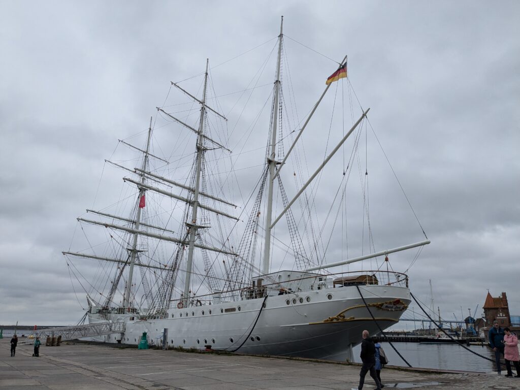 Die Sanitäranlagen sind Tip top, nur die Dusche ist kaputt, die geht nicht aus und Ralf muß die vollen 5 Minuten duschen. Heute starten wir mit dem Ford nach Stralsund. Nach gut 40 Minuten finden wir am Hafen einen Parkplatz, weil heute Feiertag ist, für umsonst. Zuerst geht es zur Gorch Fock 1. (1933) Das Erste der 6 Schiffen der Gorch Fock Baureihe. Das Letzte ist die Gorch Fock 2 (1958) Segelschulschiff der Marine. Die Gorch Fock 1 wurde 1945 von ihrer Besatzung versenkt, 1947 von den Sowjets gehoben und in Stand gesetzt. Heute liegt sie nicht mehr seetüchtig hier als Museumsschiff.