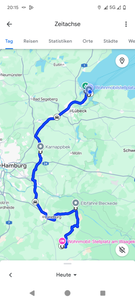 Tina muss heute noch Arbeiten, ich habe viel Zeit und fahre noch Gas und Diesel tanken. Das Auto ist fertig, nur die Fahrräder muss ich noch aufladen. Nach einem Dönerteller geht es um 14 Uhr los. Die A7 ist rot, also nehmen wir die B3 nach Celle, grobe Richtung: Lübeck. Ach so, wir wollen nicht nach Frankreich (Regen-Chaos) und auch nicht zur Nordsee (Hochwasser um 18:00 und 6:00, sonst Matsch), gestern haben wir beschlossen, zur Ostsee zu fahren 😉 . In Bad Bevensen finden wir Platz auf dem Stellplatz am Waagekai, direkt am Elbe-Seitenkanal, 7 € + Strom sind schnell bezahlt.