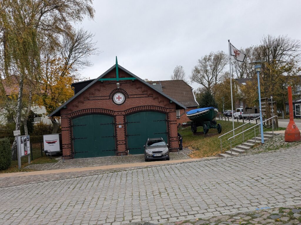 Neben dem Bootschupen liegt ein altes Rettungsboot auf einem Pferdekarren.