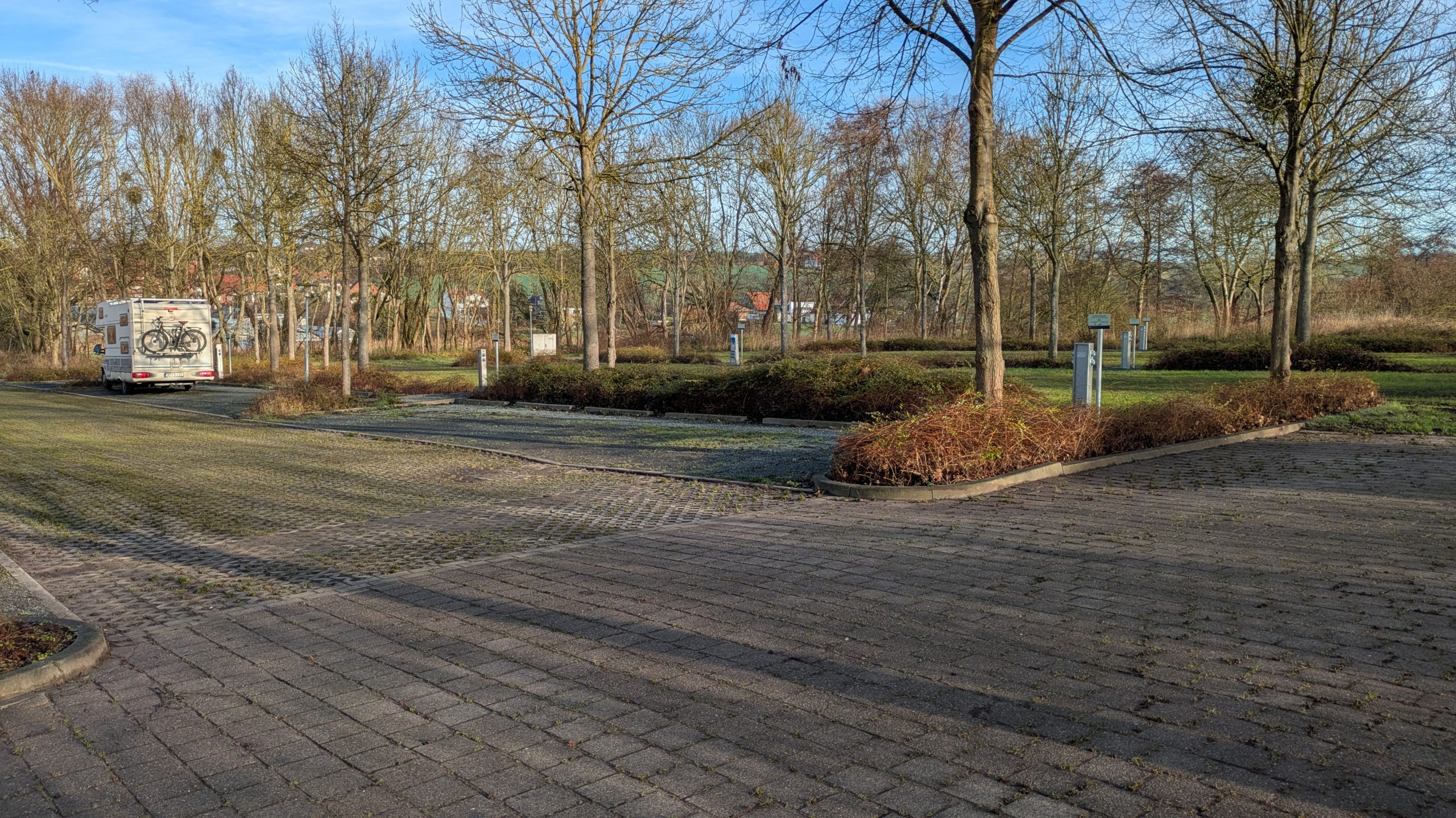 Um 11 Uhr fahre ich los, um die ganzen Geschenke der Tochter zu bringen. War ein wenig viel, um es im Zug zu transportieren. Es ist nicht so viel los auf der A7 und ich komme gut durch. Ein Wopper zum Mittag ist auch noch drin. Ich schaffe auch noch ein Nickerchen und Espresso auf einem Wanderparkplatz. Nach dem Abladen geht es auf der B27 nach Westen, Stellplatz Duderstadt habe ich mir ausgesucht. Sonderbar, da stand doch was mit Strom. Ach so, Duderstadt hat 2 Stellplätze, ich bin am Schwimmbad angekommen, der hat keinen Strom, ich bin ganz alleine mit einem Dixi-Klo 😉 . Es ist noch früh, also fahre ich noch zum 2. Platz am Adenauerring. Auch ganz alleine und mit Stromanschlüssen. Alles neu gemacht, nur noch EC-Cash. Wasser ist da und Strom geht auch. Ausfahren und Bezahlen mit QR-Code-Ticket, dass man beim Einfahren ziehen muss. Ich bleibe auf dem vorderen Teil mit geschotterten Plätzen, der hintere Teil ist ganz schön matschig, besser dort nicht parken. Hier ist längsparken angesagt, keine direkten Tür-Nachbarn. Kommt auch keiner mehr. Nach einem wenig Basteln im Schrank gönne ich mir eine kleine Dönerbox vom Dönerstand direkt am Stellplatz. Kurios ist, ich bezahle mit dem neu eingerichtetem Google-Pay via PayPal, das Geld geht nach Dänemark!