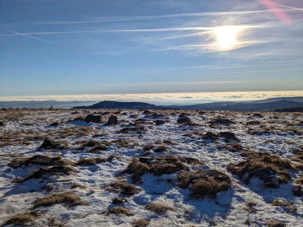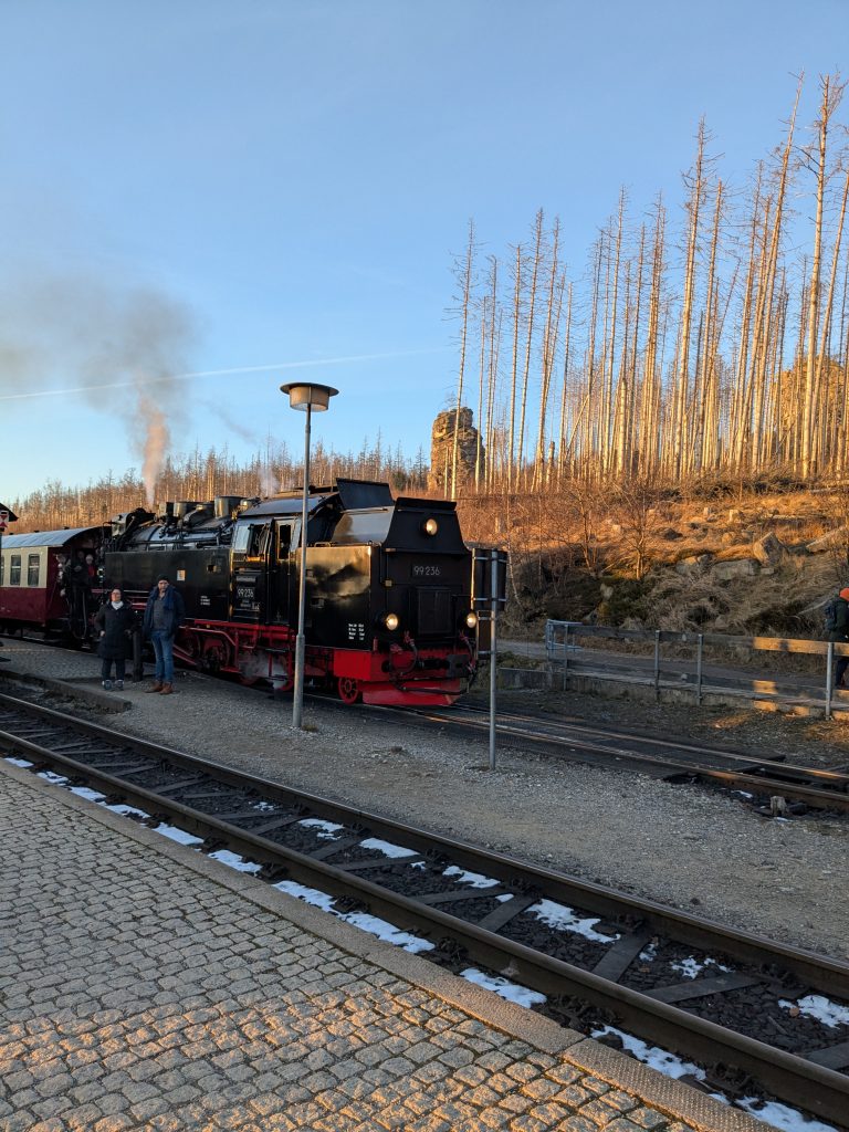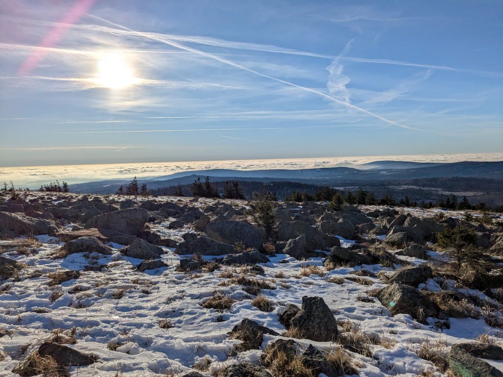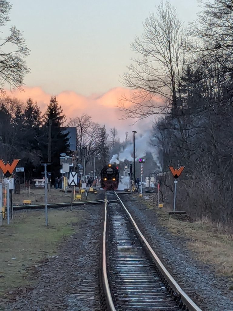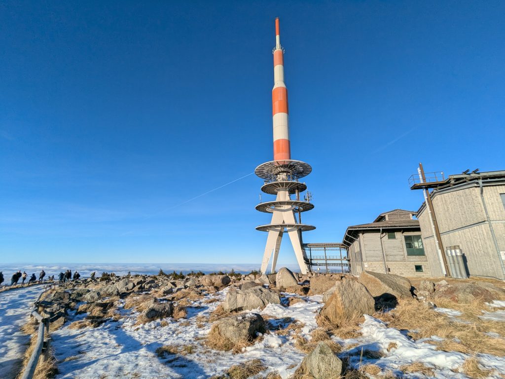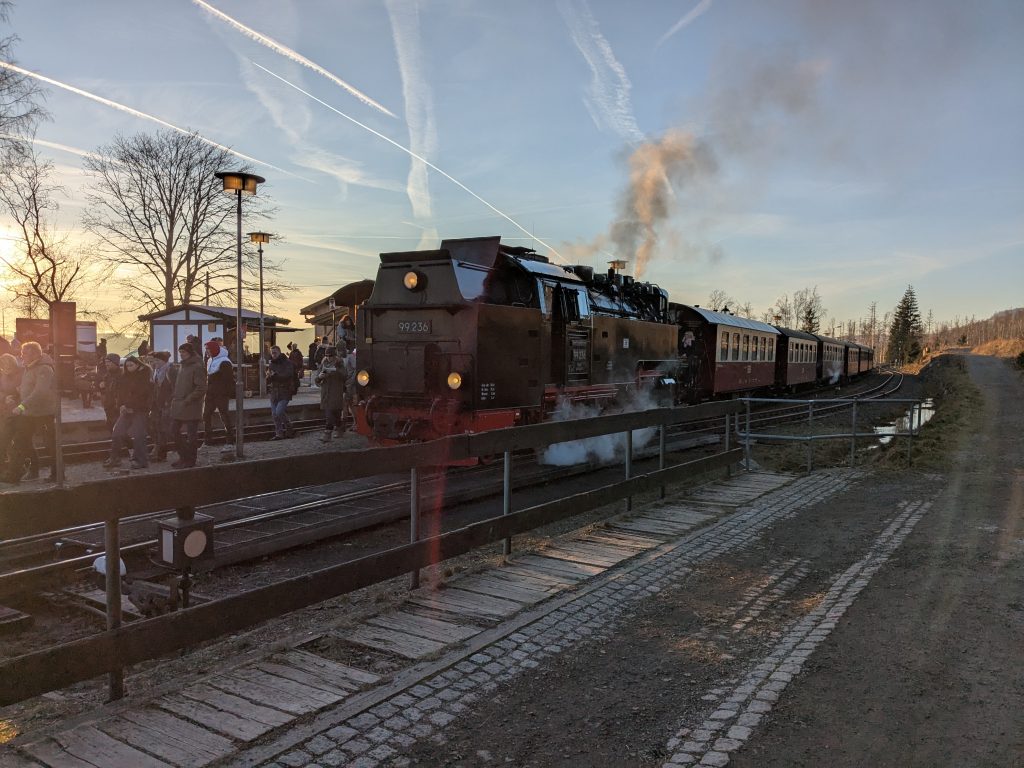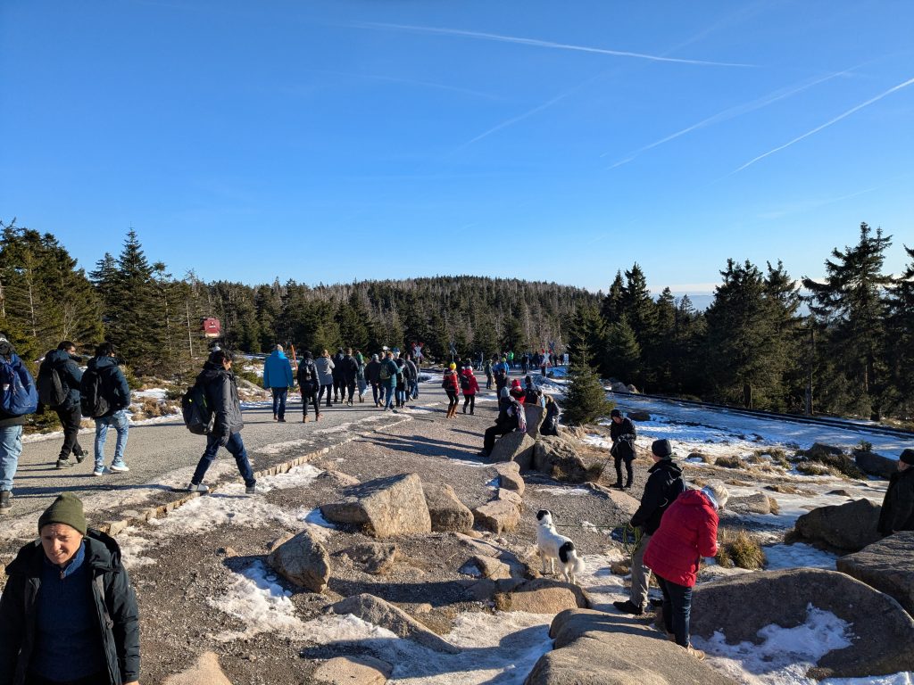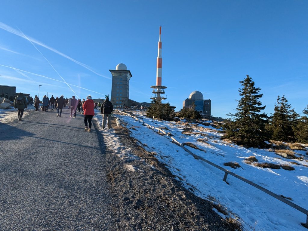 Gestern hatten wir die ganz tolle Idee, heute auf den Brocken zu gehen. Falsch, die Idee war auf den Brocken zu fahren und runter zu laufen. Also klingelt um 7:00 der Wecker. Duschen, Frühstücken, Stullen schmieren und um kurz nach 9:00 Abfahrt nach Wernigerode. Wir finden auch gleich einen Parkplatz am Bahnhof und stehen Minuten später in der rappelvollen Schalterhalle. 🙁 . Ein Blick ins Internet zeigt, bis 14:00 sind alle Züge ausgebucht. Das war gestern noch nicht, aber das Traumwetter hat wohl alle Brockentouris aus ihren Löchern gejagt. Aber wir haben uns heute den Brocken in den Kopf gesetzt. Also, neuer Plan. Wir fahren nach Schierke und laufen hoch und wieder runter. Einen Parkplatz finden wir hier gegen 10:00 problemlos an der Sommerrodelbahn, den Rucksack gesattelt und auf geht’s. Der erste km ist noch lustig. Dann wird es steil und nass. Später wird es steil und steinig, und irgendwann steil, steinig, vereist und very muddy. Ganz toll, statt der von Google veranschlagten 2 Stunden, erreichen wir nach 3 Stunden die letzten 1,4 km zum Brocken auf einer breiten geschotterten „Straße“. Hier schiebt sich die Touristenkarawane zum Gipfel. Endlich oben entlohnt der Blick allerdings für die Strapazen. Hier oben ist alles vereist. Hier braucht man Schlittschuhe und keine Wanderstiefel. Ganz vorsichtig ein paar Fotos gemacht und ab zum Rückweg. Aber, wir haben 10 km und über 16000 Schritte steil bergauf auf dem Tacho und wenn wir zurück laufen sind wir erst in der Dunkelheit zurück. Also berappen wir stolze 72,-€ für die Rückfahrt mit der Brockenbahn. Wir sind früh am Bahnsteig. Und das ist auch gut so. Wir bekommen noch einen Sitzplatz. Mit 10 Minuten Verspätung startet die Heimfahrt mit rappelvollen Waggons. 50 Minuten und 2 medizinische Notfälle später sind wir dann in Schierke am Bahnhof und dürfen miterleben, dass ein sch… geparkter Pkw den Rettungseinsatz verhindert. Super! Wir machen uns auf den Weg noch mal 1,5km zu unserem Dicken. Wenig später und mit einem leckeren Döner im Gepäck landen wir wieder auf dem Stellplatz und sinken endlich auf unser Sofa. Fazit: Überlege dir gut, was du dir in den Kopf setzt und ob deine ach so tolle Idee die Strapazen lohnt. 🙂 . Aber alles in allem war es ein toller Tag.