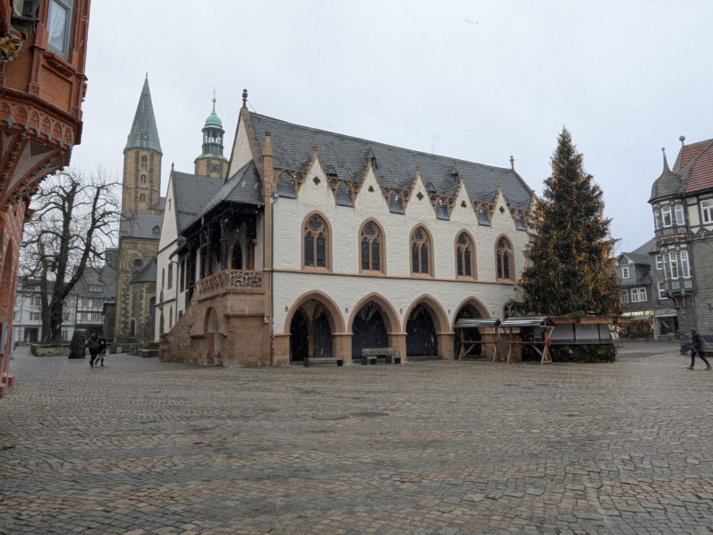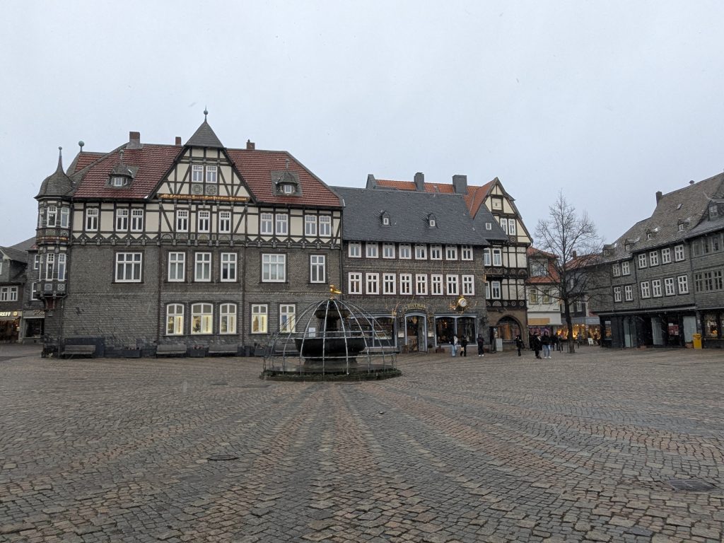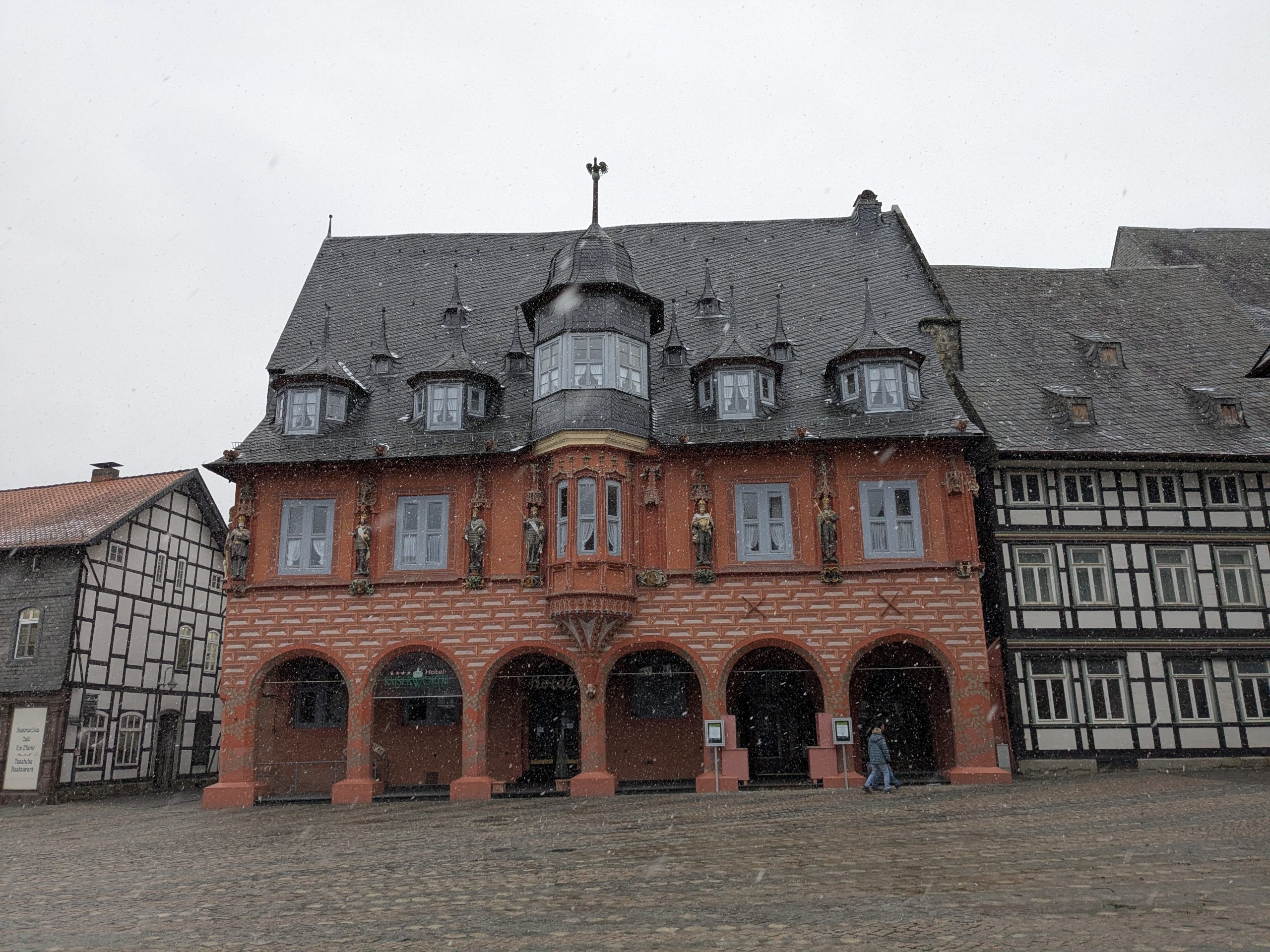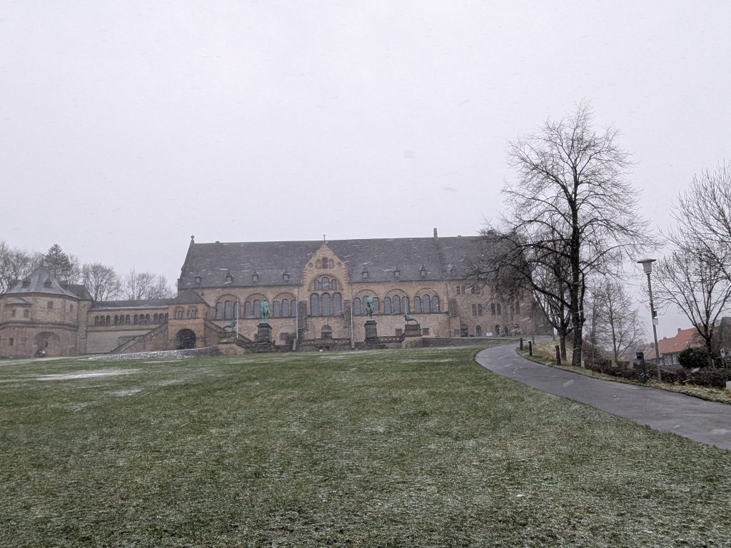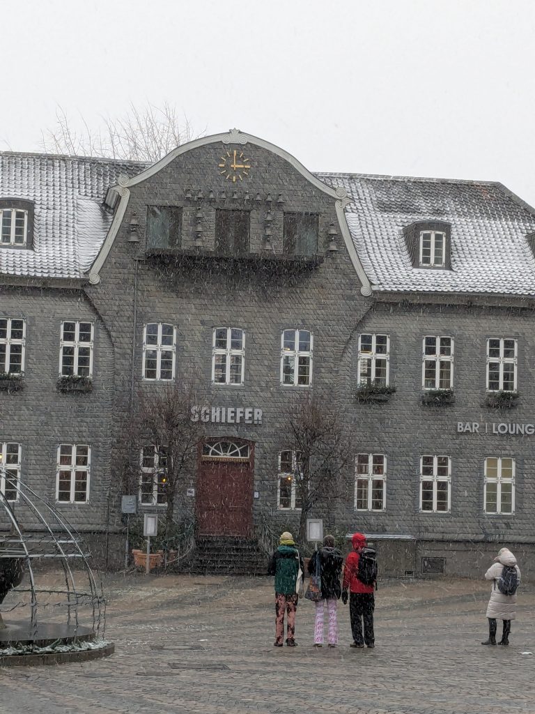 Der Wetterbericht sagt teils leichter Schneefall. Als wir gegen Mittag in Richtung Goslar aufbrechen, fliegt ab und an leichter Schneegriesel. In Goslar finden wir schnell einen Parkplatz in einem Parkhaus Nähe der Altstdt. Allerdings fährt Ralf beim Einparken fast unseren linken Außenspiegel an eine Betonpfeiler ab.: -( Zum Glück nur fast. Wir starten die Besichtigung. Die Altstadt ist toll, viele schöne alte Häuser, leider weht ein eisig kalter Wind. Nach einiger Zeit müssen wir uns erstmal in einen Asia Imbiss bei Nudelsuppe und Huhn sezuan aufwärmen. Danach geht die Site-seeing Tour weiter. Inzwischen hat leichter Schneefall eingesetzt. Es ist kalt und ungemütlich. Als wir die Kaiserpfalz erreichen reicht unsere Motivation nur noch für ein kurzes Foto. Auf dem Marktplatz warten wir dann unter den Rathaus Arkaden auf das Glockenspiel. Es spielt dann auch, aber die Figuren kommen nicht raus. Wahrscheinlich haben sie keine geeignete Winterkleidung. 😉 Der Schnee wird immer stärker und wir haben genug. Auf dem Weg zurück zum Parkhaus finden wir noch einen netten kleinen Laden mit Glas und Holzschmuck, wo ich endlich neue Glasschneeflocken und eine kleine Harzhexe bekomme, dann geht es endlich zurück nach Ilsenburg. Auf der Rückfahrt herrscht dichtes Schneetreiben und auf dem Stellplatz liegen 8,5 cm Neuschnee.