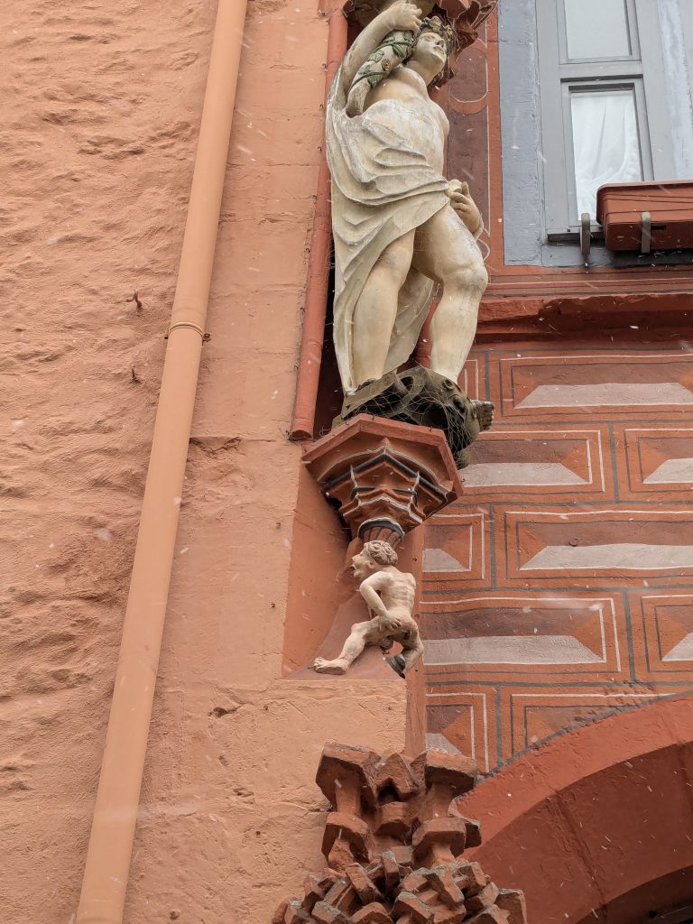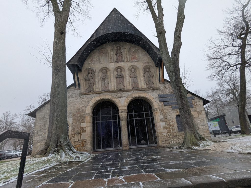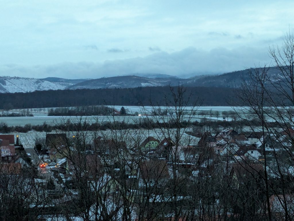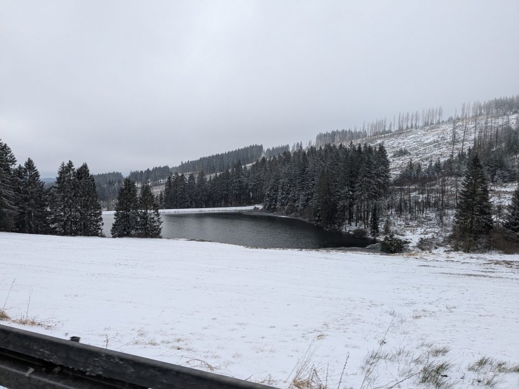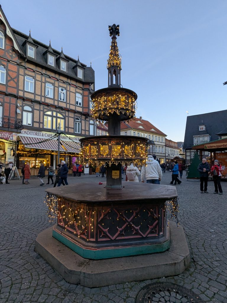 Der Wetterbericht sagt teils leichter Schneefall. Als wir gegen Mittag in Richtung Goslar aufbrechen, fliegt ab und an leichter Schneegriesel. In Goslar finden wir schnell einen Parkplatz in einem Parkhaus Nähe der Altstdt. Allerdings fährt Ralf beim Einparken fast unseren linken Außenspiegel an eine Betonpfeiler ab.: -( Zum Glück nur fast. Wir starten die Besichtigung. Die Altstadt ist toll, viele schöne alte Häuser, leider weht ein eisig kalter Wind. Nach einiger Zeit müssen wir uns erstmal in einen Asia Imbiss bei Nudelsuppe und Huhn sezuan aufwärmen. Danach geht die Site-seeing Tour weiter. Inzwischen hat leichter Schneefall eingesetzt. Es ist kalt und ungemütlich. Als wir die Kaiserpfalz erreichen reicht unsere Motivation nur noch für ein kurzes Foto. Auf dem Marktplatz warten wir dann unter den Rathaus Arkaden auf das Glockenspiel. Es spielt dann auch, aber die Figuren kommen nicht raus. Wahrscheinlich haben sie keine geeignete Winterkleidung. 😉 Der Schnee wird immer stärker und wir haben genug. Auf dem Weg zurück zum Parkhaus finden wir noch einen netten kleinen Laden mit Glas und Holzschmuck, wo ich endlich neue Glasschneeflocken und eine kleine Harzhexe bekomme, dann geht es endlich zurück nach Ilsenburg. Auf der Rückfahrt herrscht dichtes Schneetreiben und auf dem Stellplatz liegen 8,5 cm Neuschnee.
