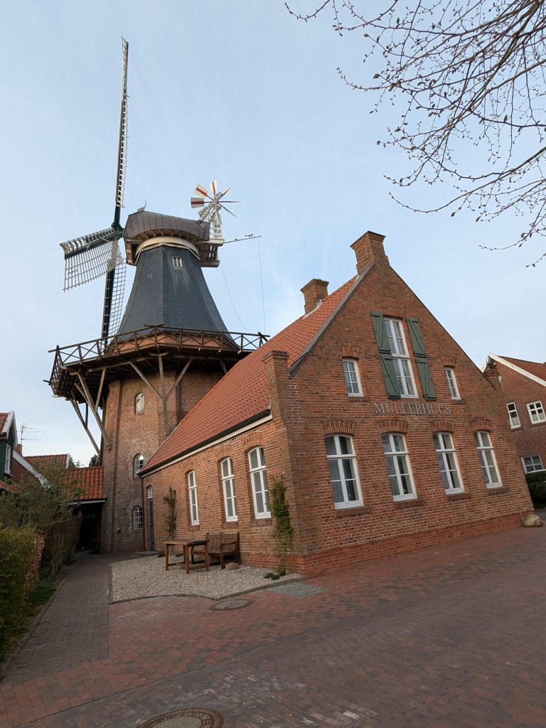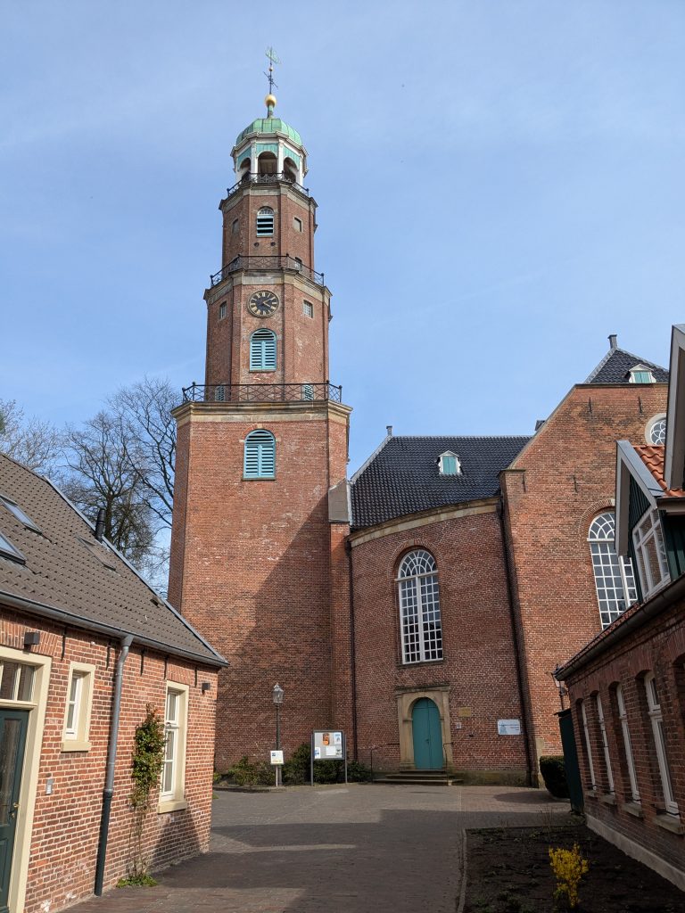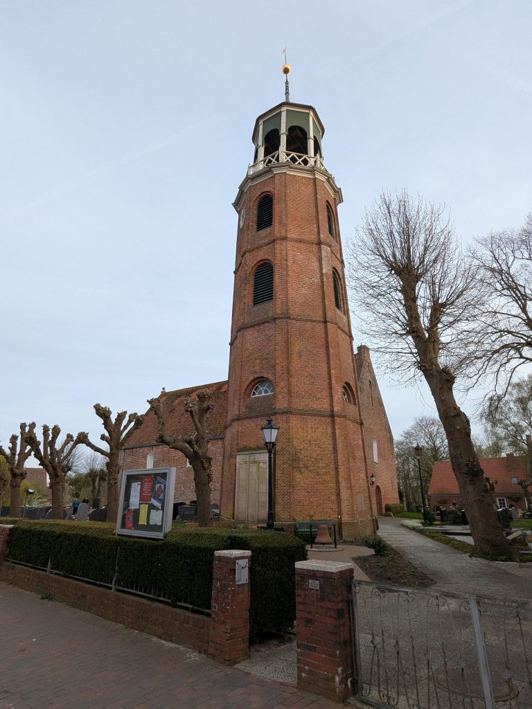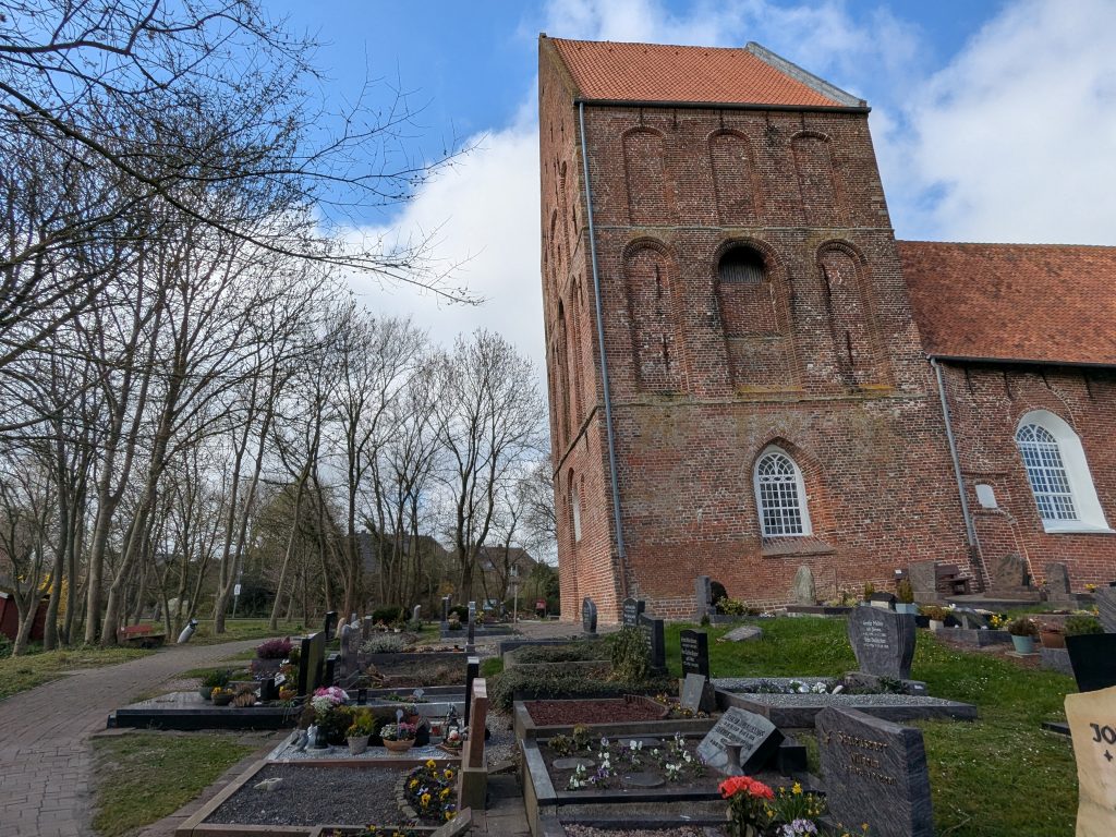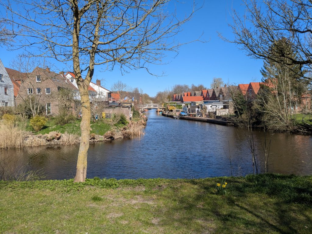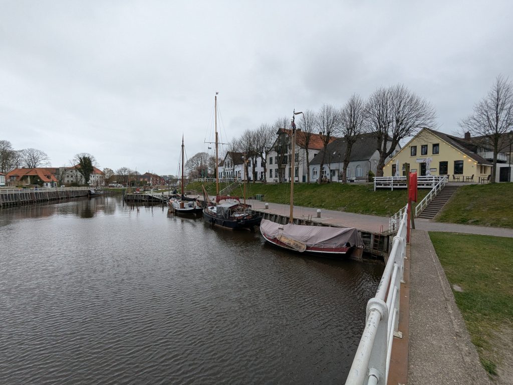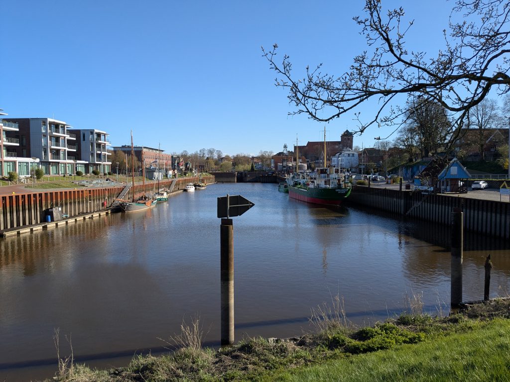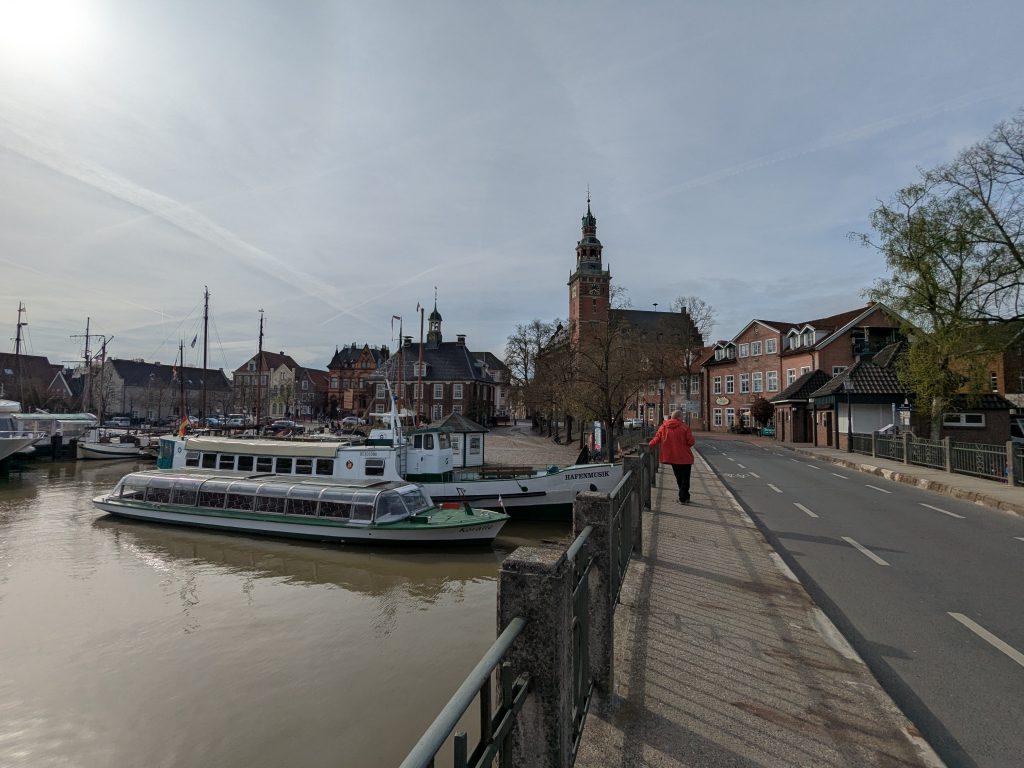 Mal wieder lange geschlafen und dann war auch noch die Dusche kaputt, ging nicht aus 😉 . Wir wollen es mal mit einem richtigen Campingplatz in Leer versuchen, klappt wieder nicht, Mittagspause von 12 – 15 Uhr, 2 Stunden warten, nee, so wird das nichts mit dem Geld verdienen. Nächster Stellplatz unter der Ems durch in Ditzum. 1. Versuch Ankerplatz: kein Platz für den Ford, auch nicht für Geld, 2. Versuch Am Deich, der Lütte parkt kostenlos und es gibt einen netten Eckplatz, der Nachbarhund erhebt sich und ich kann Parken. 22 € und Brötchenservice. Nach dem Essen geht es in die tobende City von Leer, wieder unter der Ems durch. Am historischen Hafen genießen wir einen ostfriesischen Tee mit Kuchen. Ein Labcache zeigt uns die Altstadt von Leer, wir besuchen auch noch 2 Drehorte der Friesland Krimis, „Habedanks Bestattungsunternehmen“ und „Insa Scherzingers Apotheke“, dann wieder durch den Emstunnel 14 km durch die vielen …um’s (Jemgum, Midlum, Critzum, Hatzum) bis nach Ditzum . Die Anmeldung ist jetzt besetzt und ist fix erledigt. Nach einem schnellen Espresso laufen wir in den Ort, Fischbrötchen für den Abend ergattern. Ein Labcache mit Episoden aus dem Frieslandkrimi mit Brocki (den ich in Göttingen auf dem Stellplatz getroffen habe) und Süher führt uns durch Ditzum: kleiner Hafen, Windmühle, die Ems vorm Deich und die Kirche.