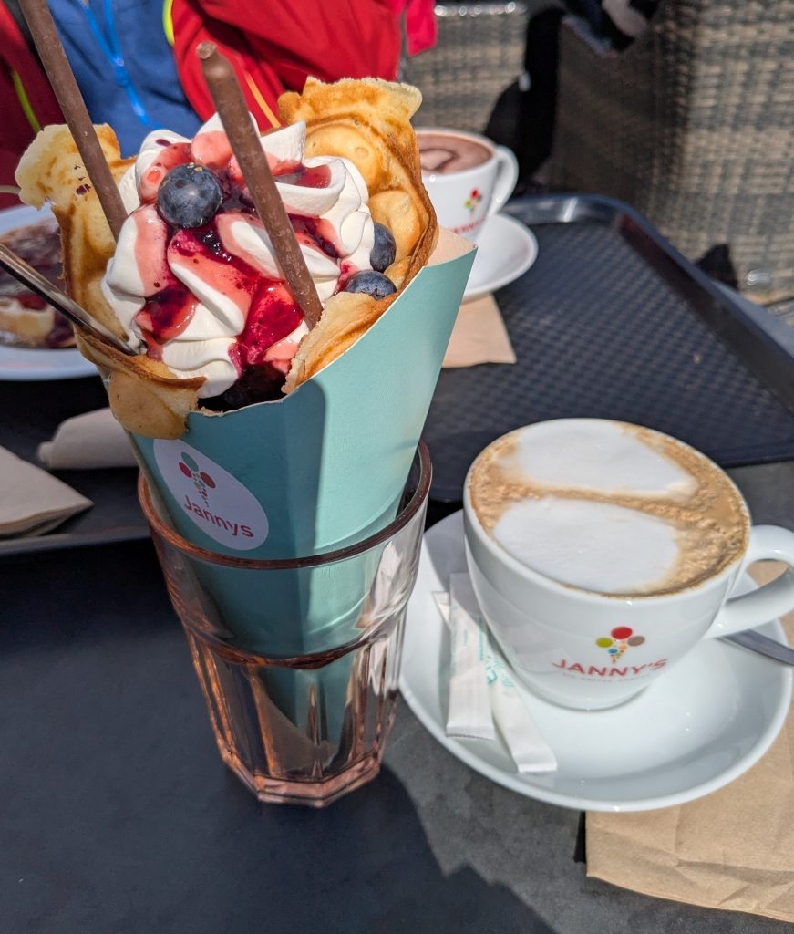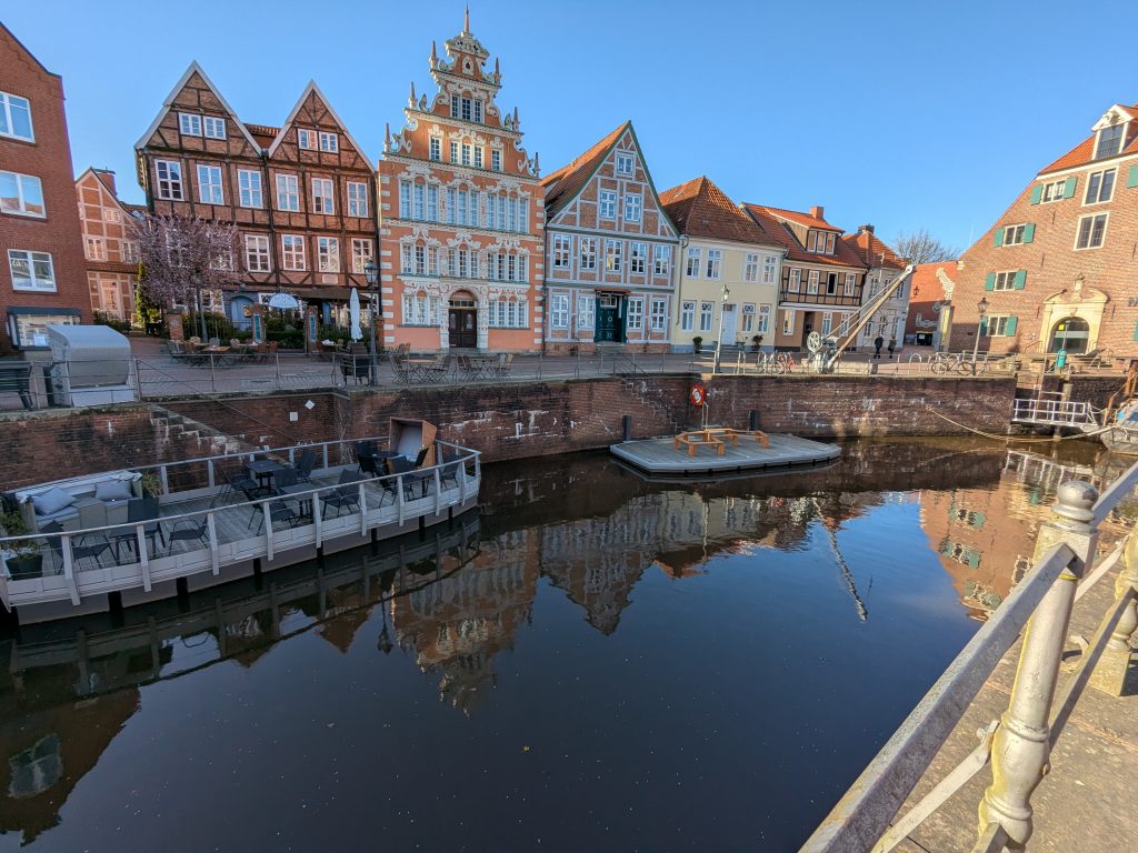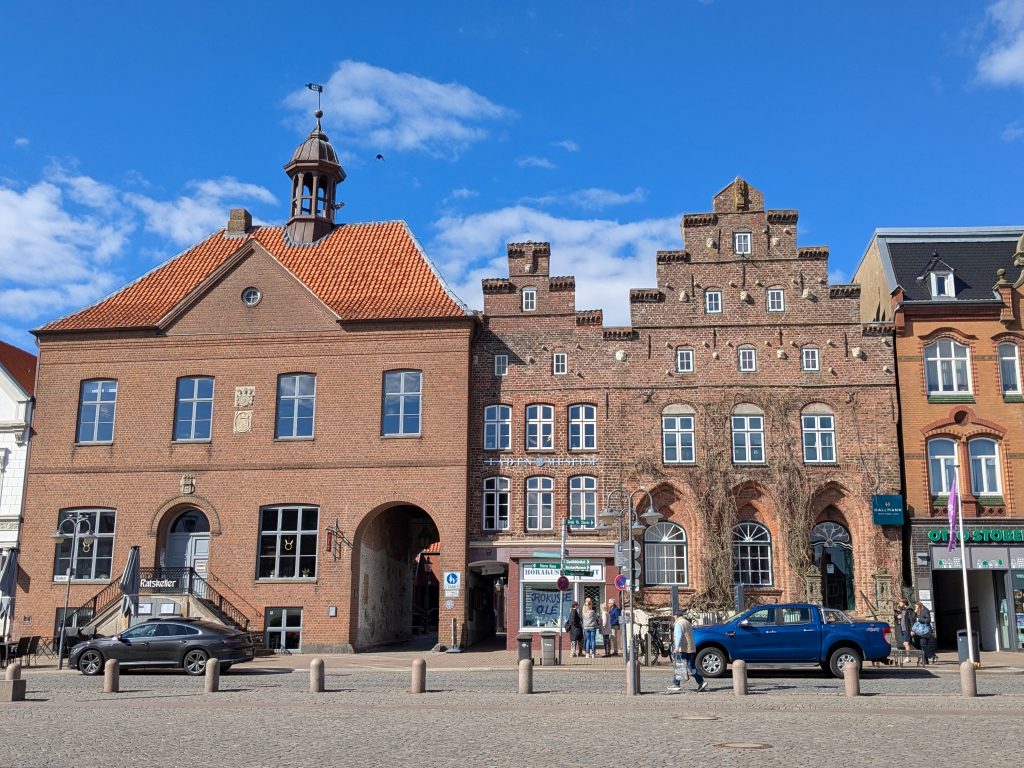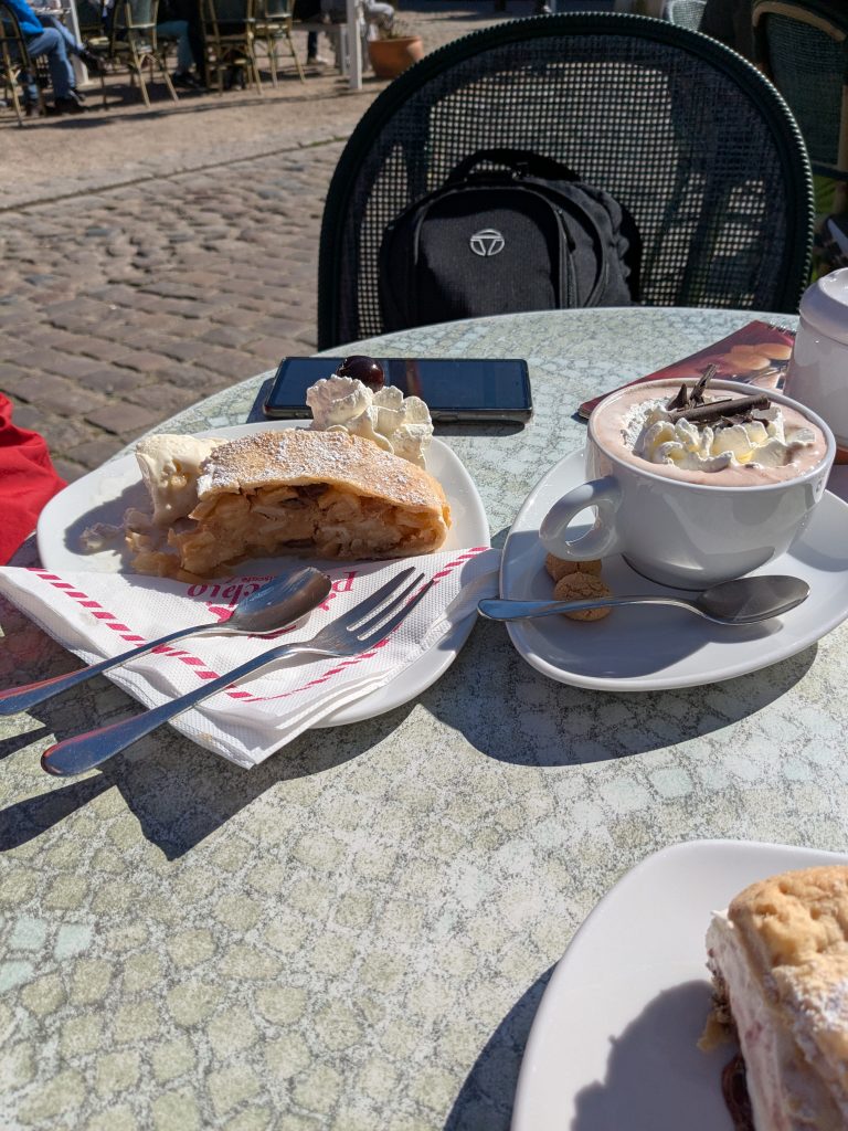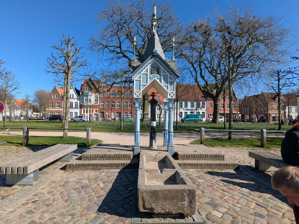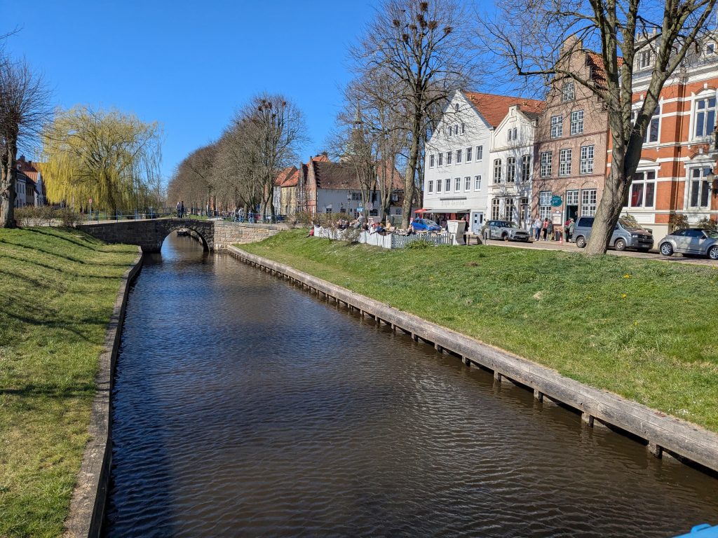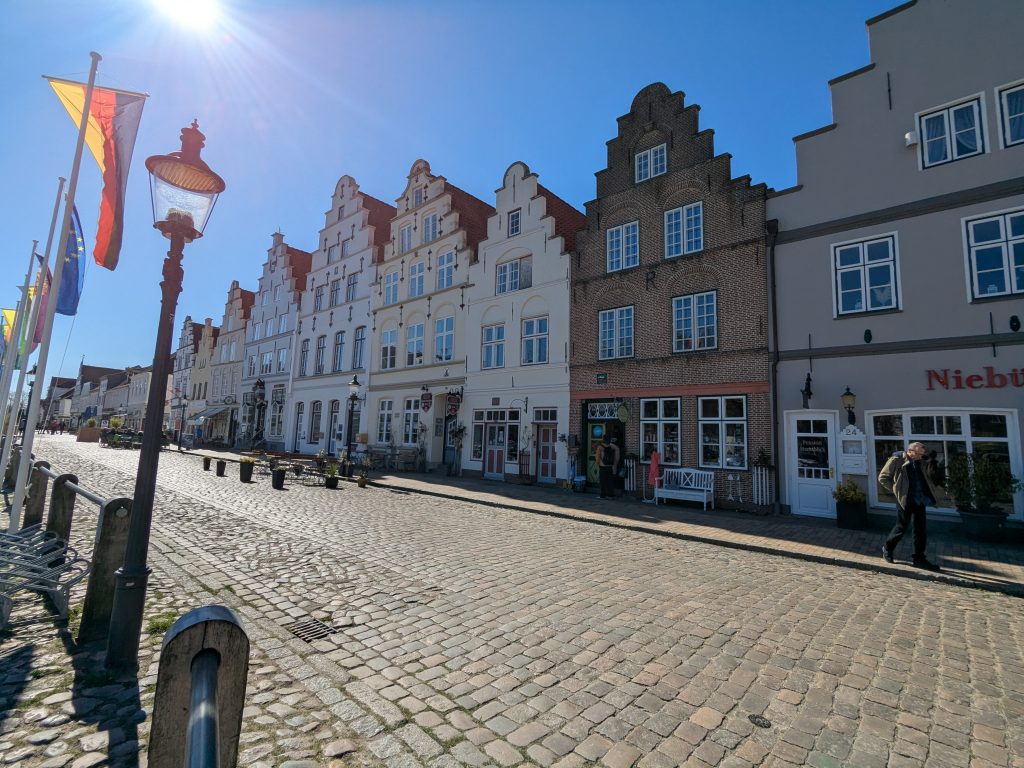 Um 11 geht es weiter nach Norden. Ziel ist der Stellplatz in Friedrichstadt. Hier ist es gut gefüllt. Nach einem schnellen Mittagessen laufen wir in die Stadt. 2 Labcaches werden fast absolviert, fast, weil wir bei dem einen bis zur Eiderbrücke laufen müssen: später. Um 15 Uhr gibt es in der Sonne auf dem Marktplatz warmen Apfelstrudel, Friesentorte, Kakao und Cappuccino. Nach der Eiderbrücke sitzen wir gemütlich im Womo. Ach, da war ja noch der eine Bonus, also noch mal raus und einen riesen Umweg auf die andere Hafenseite, wo wir unter strenger Beobachtung den Bonus finden und loggen. Nach insgesamt 13708 Schritten sind wir dann wieder am Wobi.