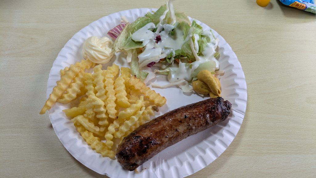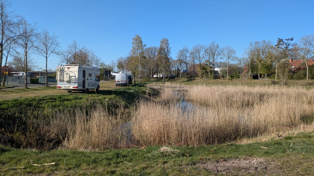 Um 11:30 starten zum 1. Teil der Heimreise, „Autobahn vermeiden“ ist aktiviert, so eiern wir durch die Landschaft, bis in Papenburg die erste Brücke über die Ems kommt. Es geht weiter auf schnurgeraden Landstrassen nach Bad Zwischenahn. Beide Stellplätze voll belegt. Gut, erstmal außerhalb Parken und mit dem Kleinen zum Mittagessen wieder rein. Eine üppige Matjesplatte mit Bratkartoffeln schaffen wir ganz gut. Weiter geht es, Stellplatz Edewecht: voll. Weiter nach Wardenburg: Stellplatz ohne alles, aber noch Platz. Es ist fast 16:30 Uhr, wir bleiben. Ist zwar ein Industriegebiet und man hört die Autobahn in der Nähe, aber wir stehen auf einer Wiese an einem einem kleinen See. Bezahlen müssen wir hier nichts.