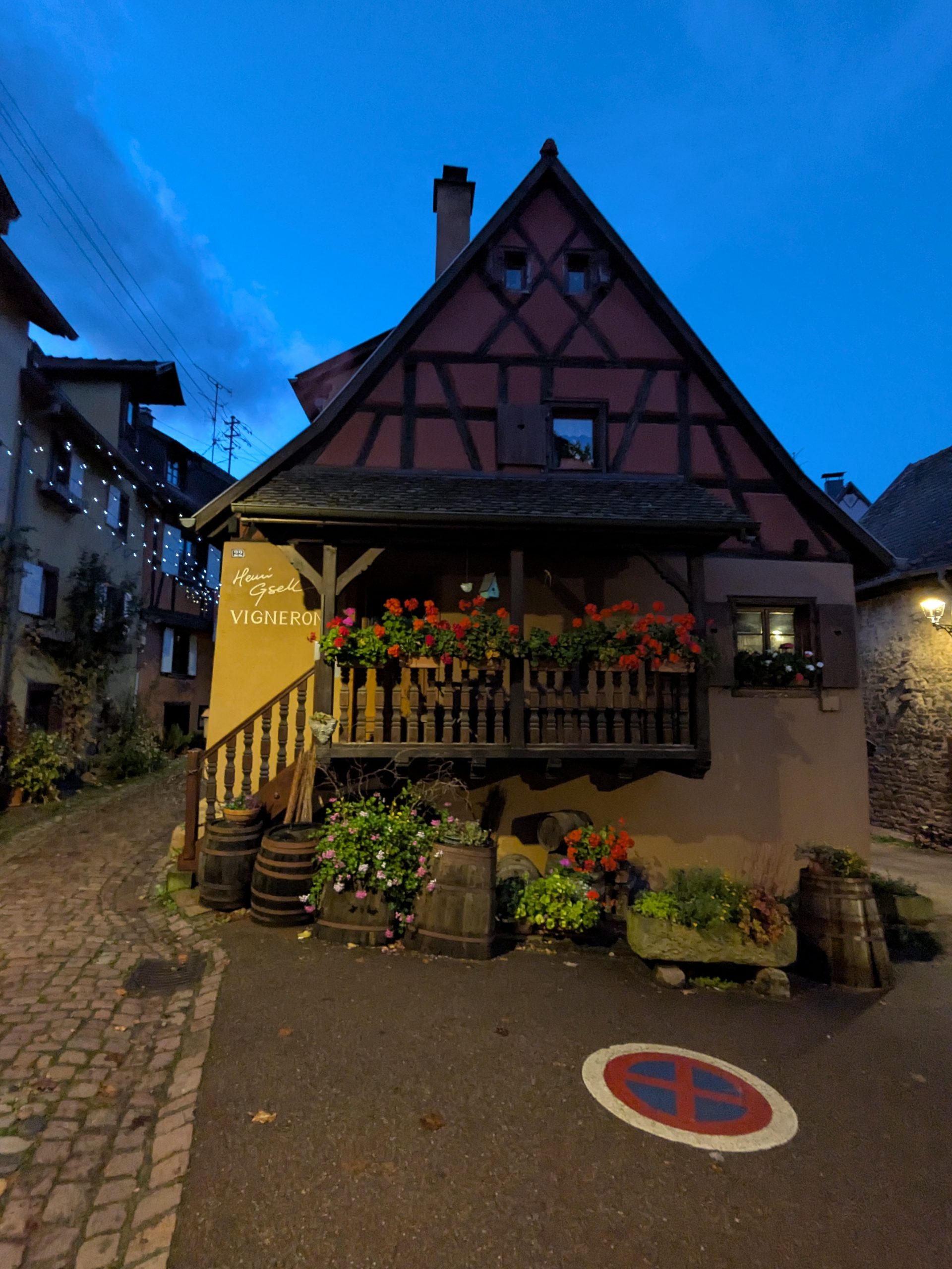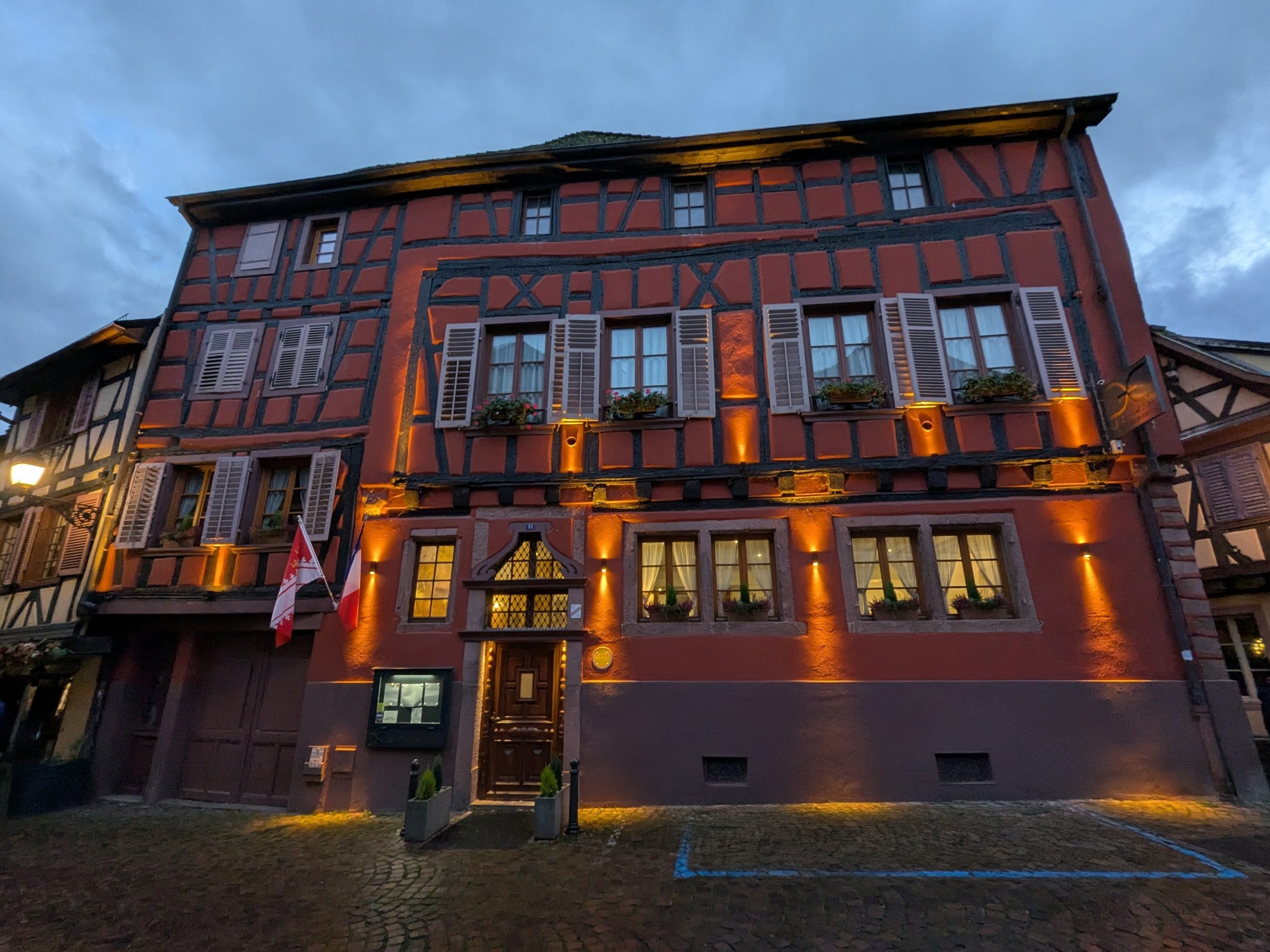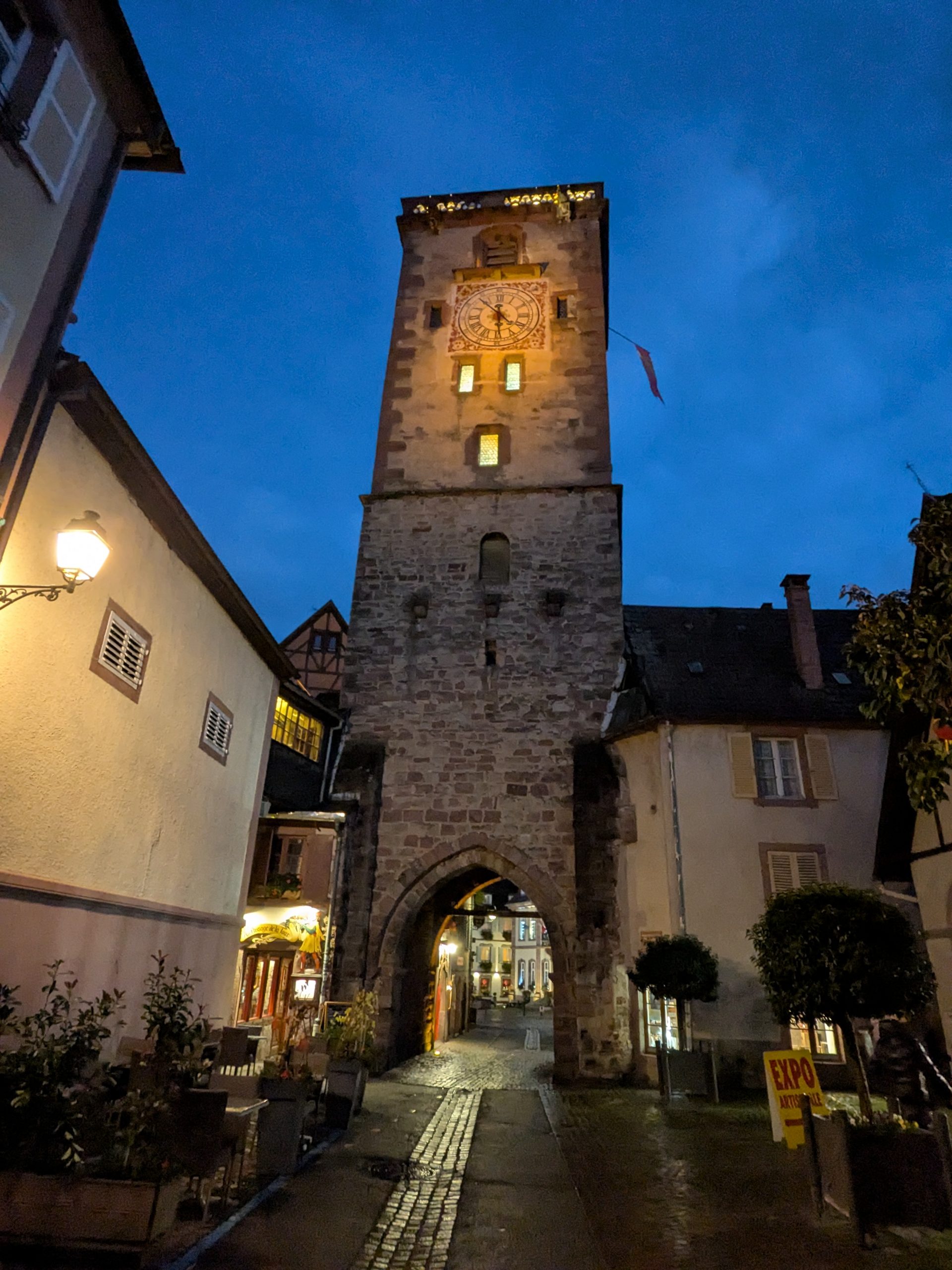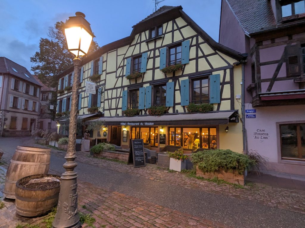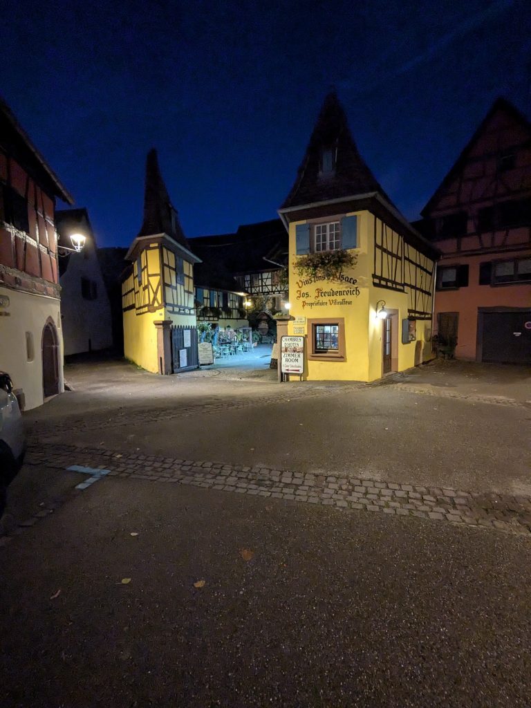 Abends soll es aufhören zu regnen, also schnappen wir uns gegen 18:00 den „Dicken“ und fahren 5 Minuten ins Dorf. Der Wetterbericht hat gelogen, es tröpfelt fröhlich weiter, aber wir lassen uns nicht abschrecken und machen einen Abendspaziergang durch Obernai. Hübsch mit der Beleuchtung und viel besser als im Sommer 22 mit den Touristenmassen. Sogar die Lokale sind fast leer, aber bei den Preisen ist das wohl auch kein Wunder, 14,00-17,80€ für ein Garlette. Wir freuen uns schon auf lecker Lieu noir (Fisch) mit Salat und Baguette.