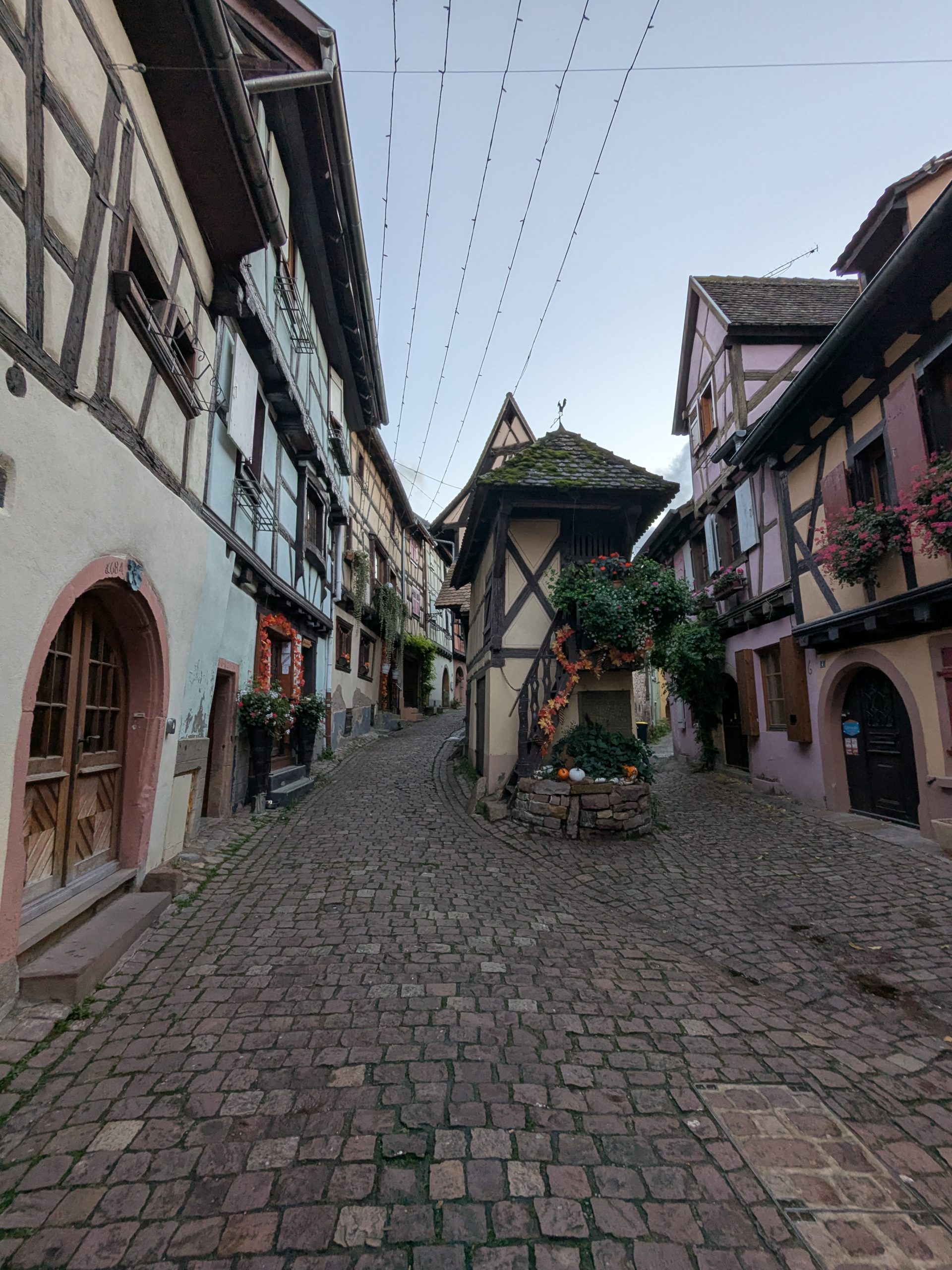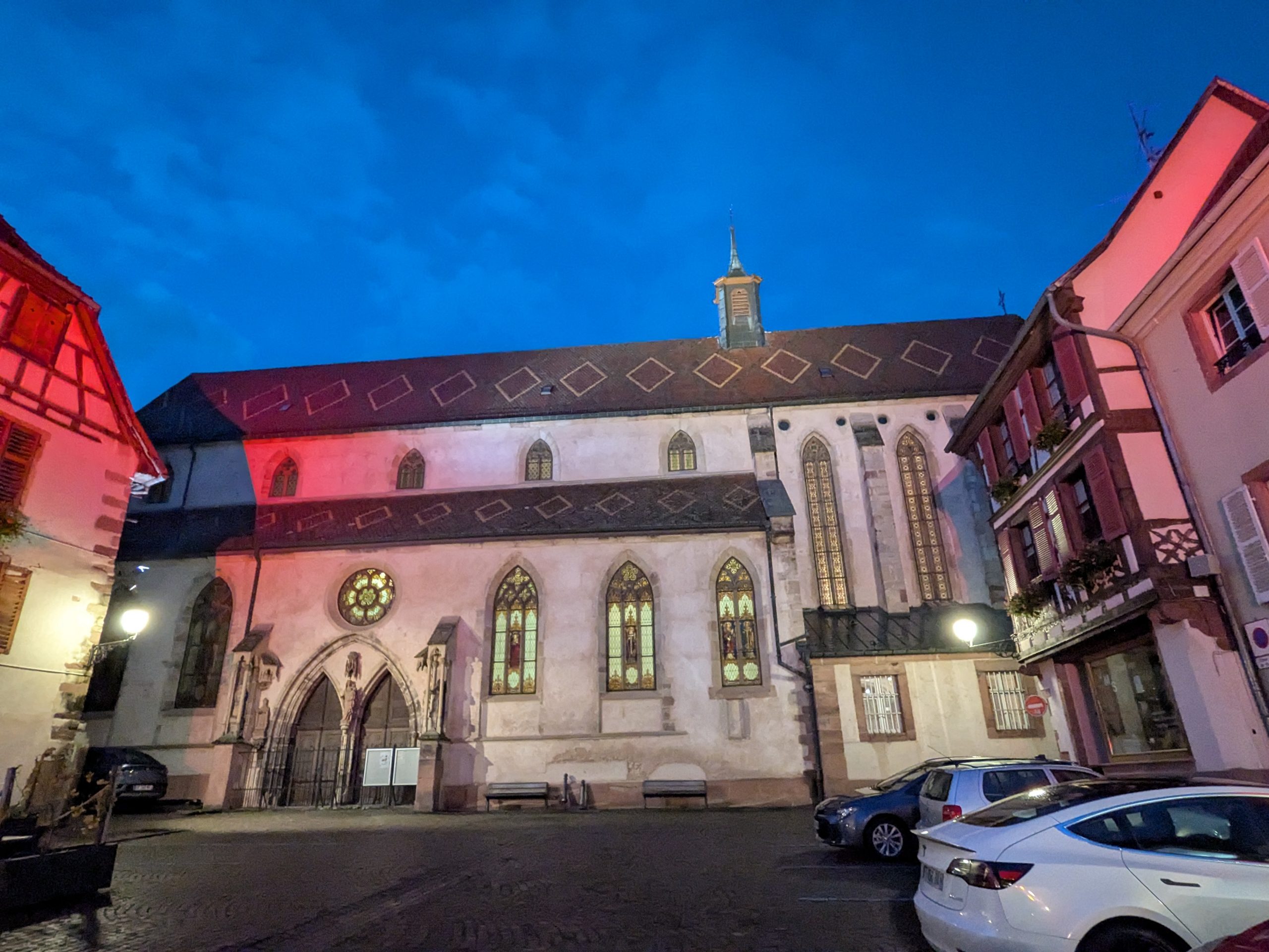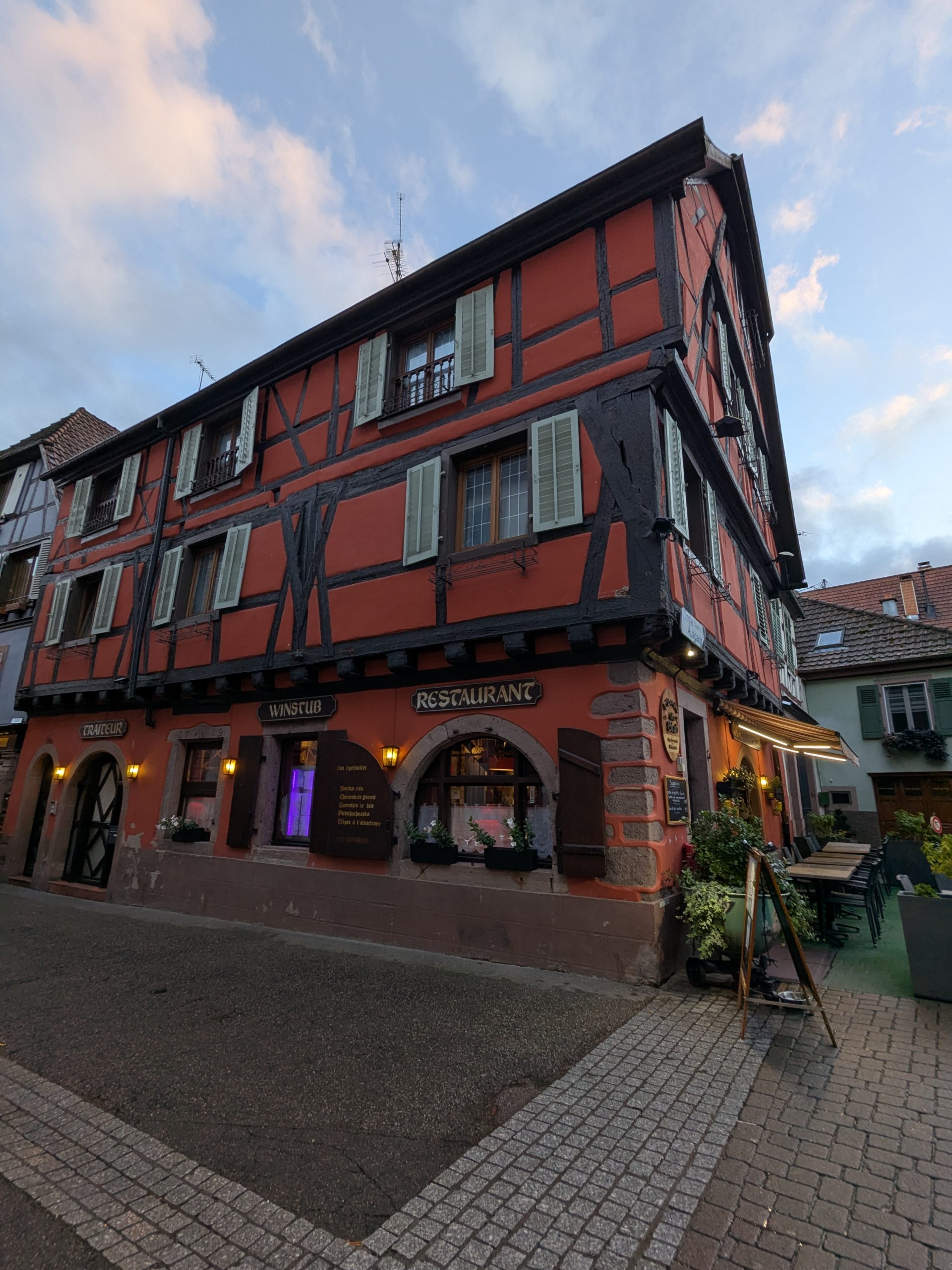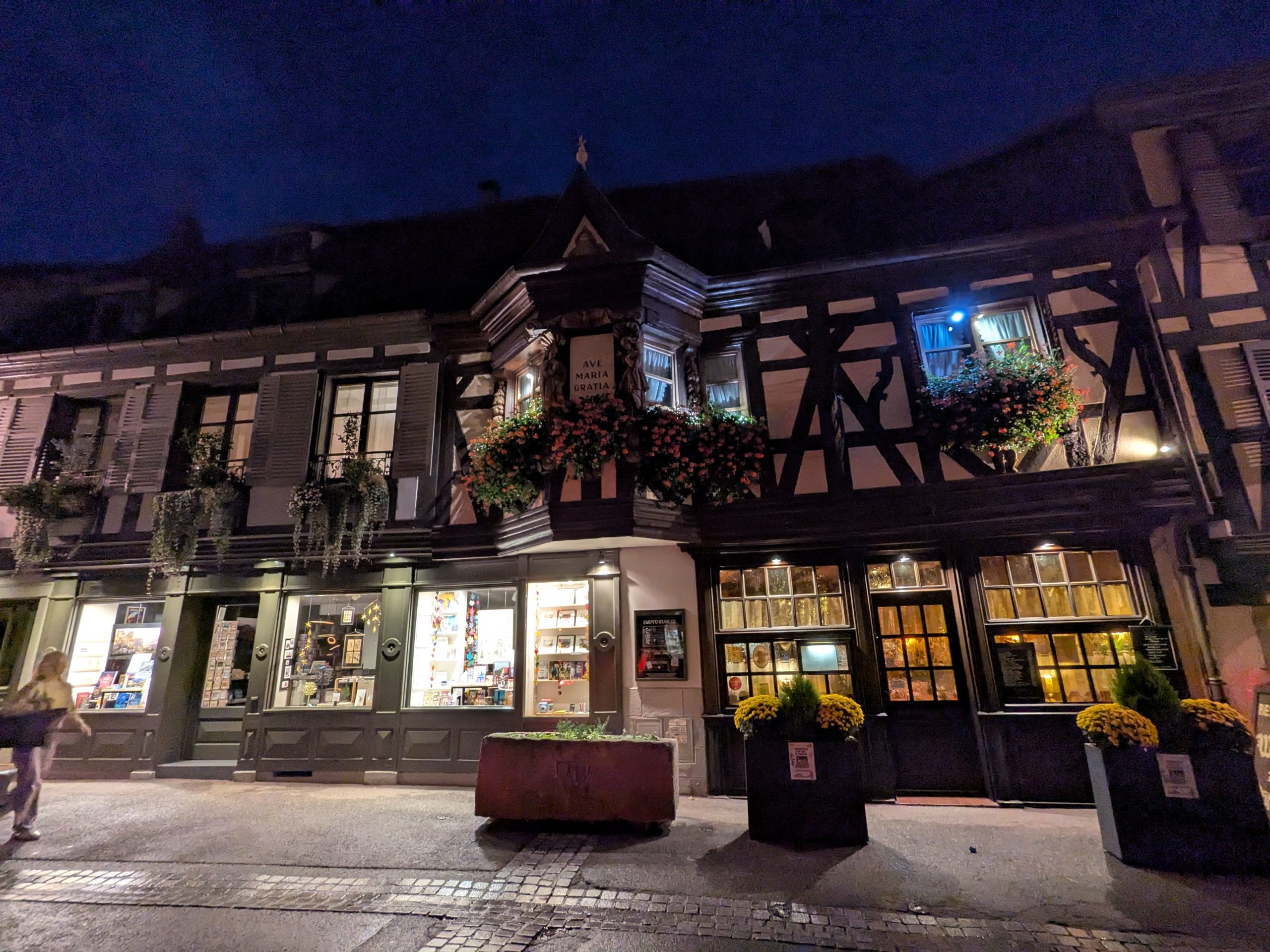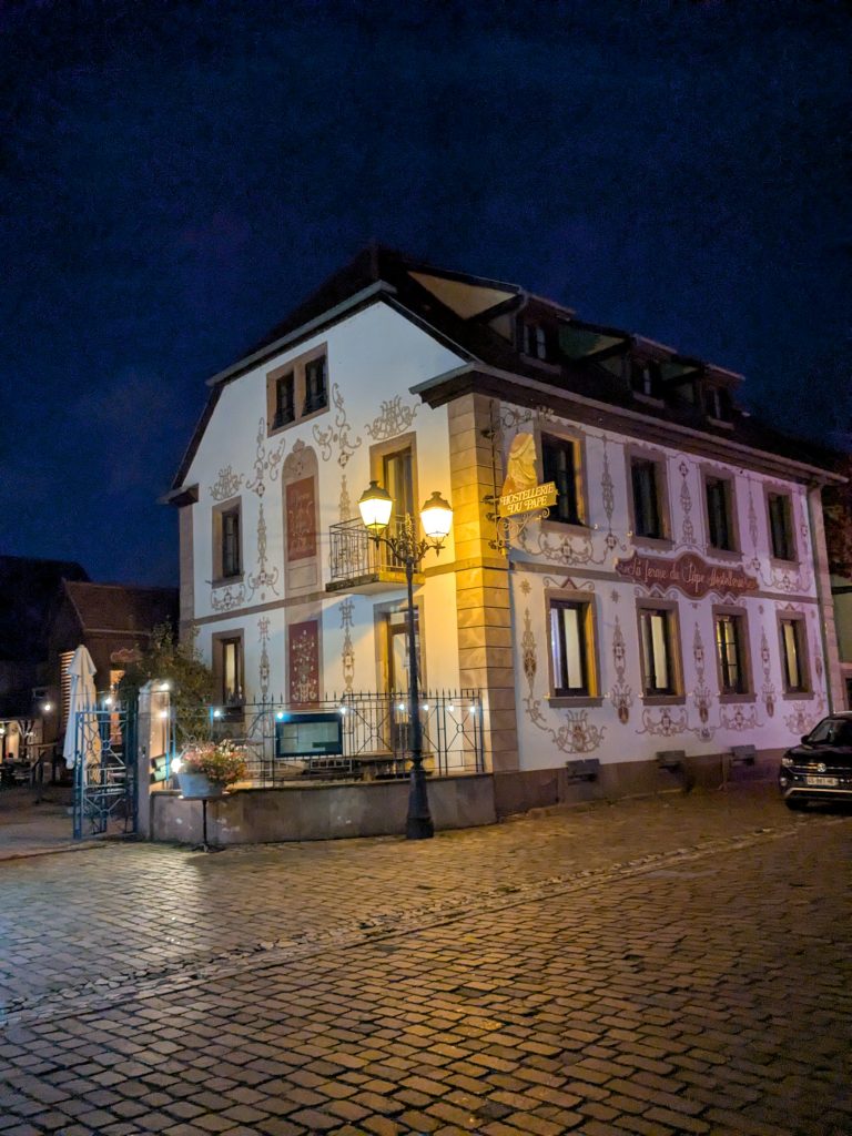 Abends soll es aufhören zu regnen, also schnappen wir uns gegen 18:00 den „Dicken“ und fahren 5 Minuten ins Dorf. Der Wetterbericht hat gelogen, es tröpfelt fröhlich weiter, aber wir lassen uns nicht abschrecken und machen einen Abendspaziergang durch Obernai. Hübsch mit der Beleuchtung und viel besser als im Sommer 22 mit den Touristenmassen. Sogar die Lokale sind fast leer, aber bei den Preisen ist das wohl auch kein Wunder, 14,00-17,80€ für ein Garlette. Wir freuen uns schon auf lecker Lieu noir (Fisch) mit Salat und Baguette.