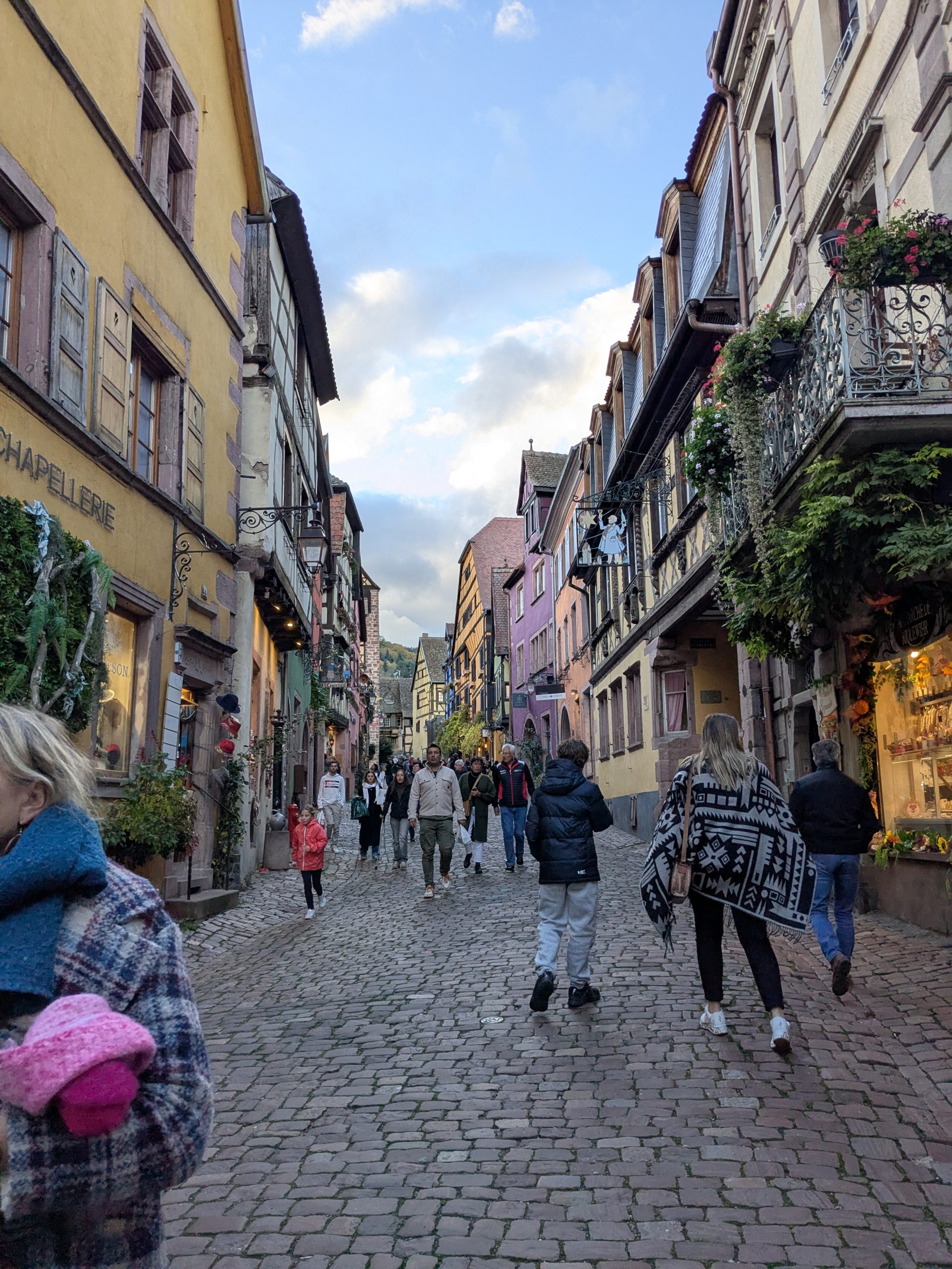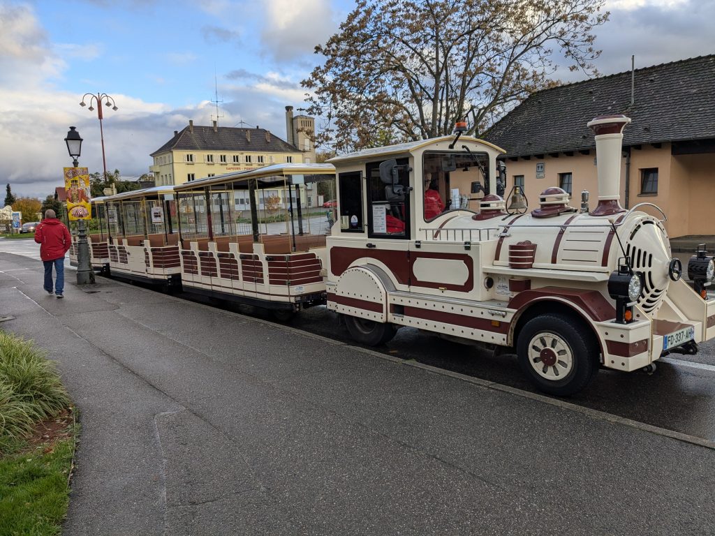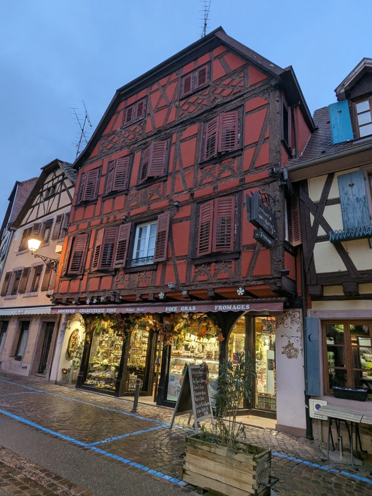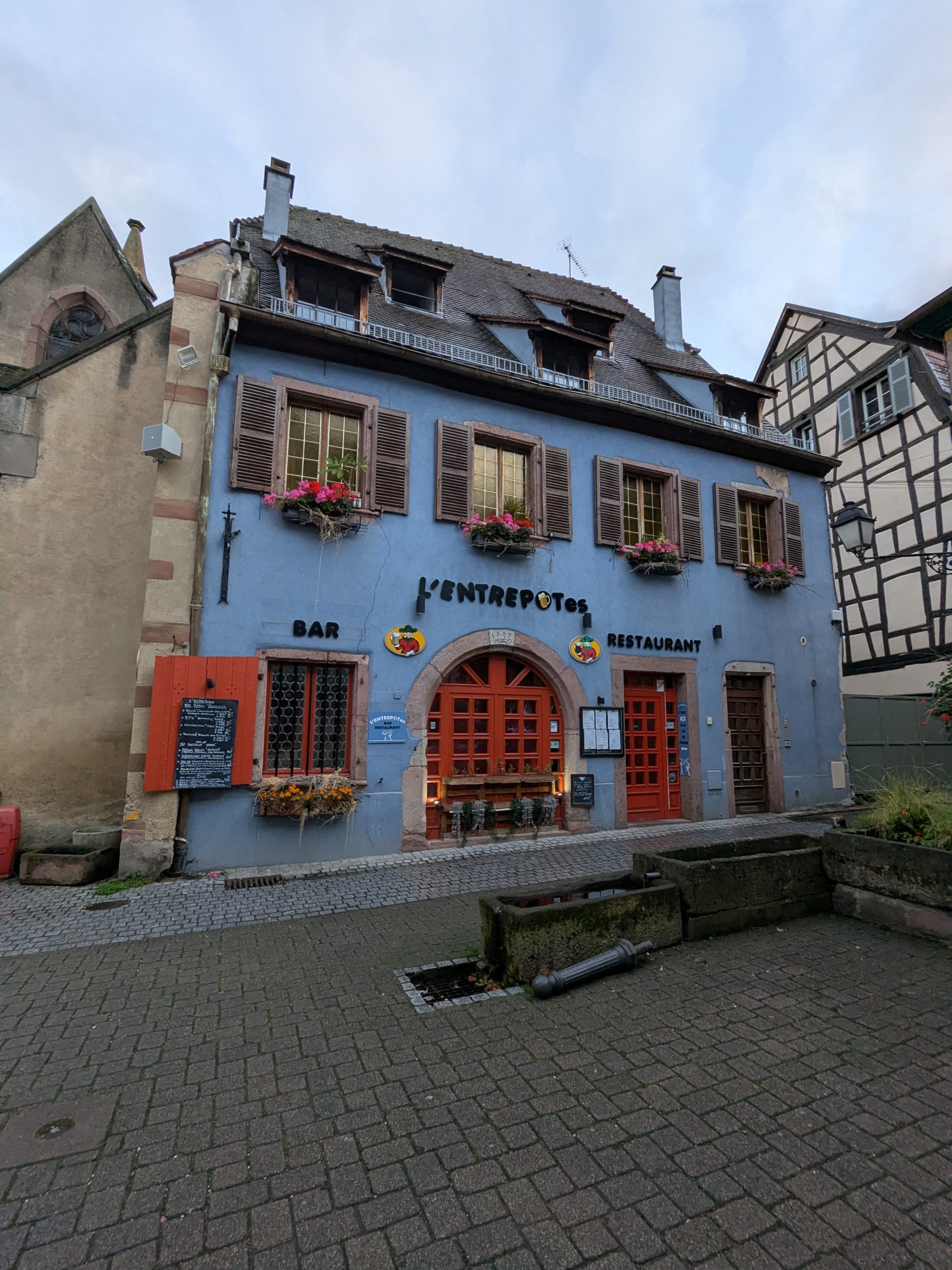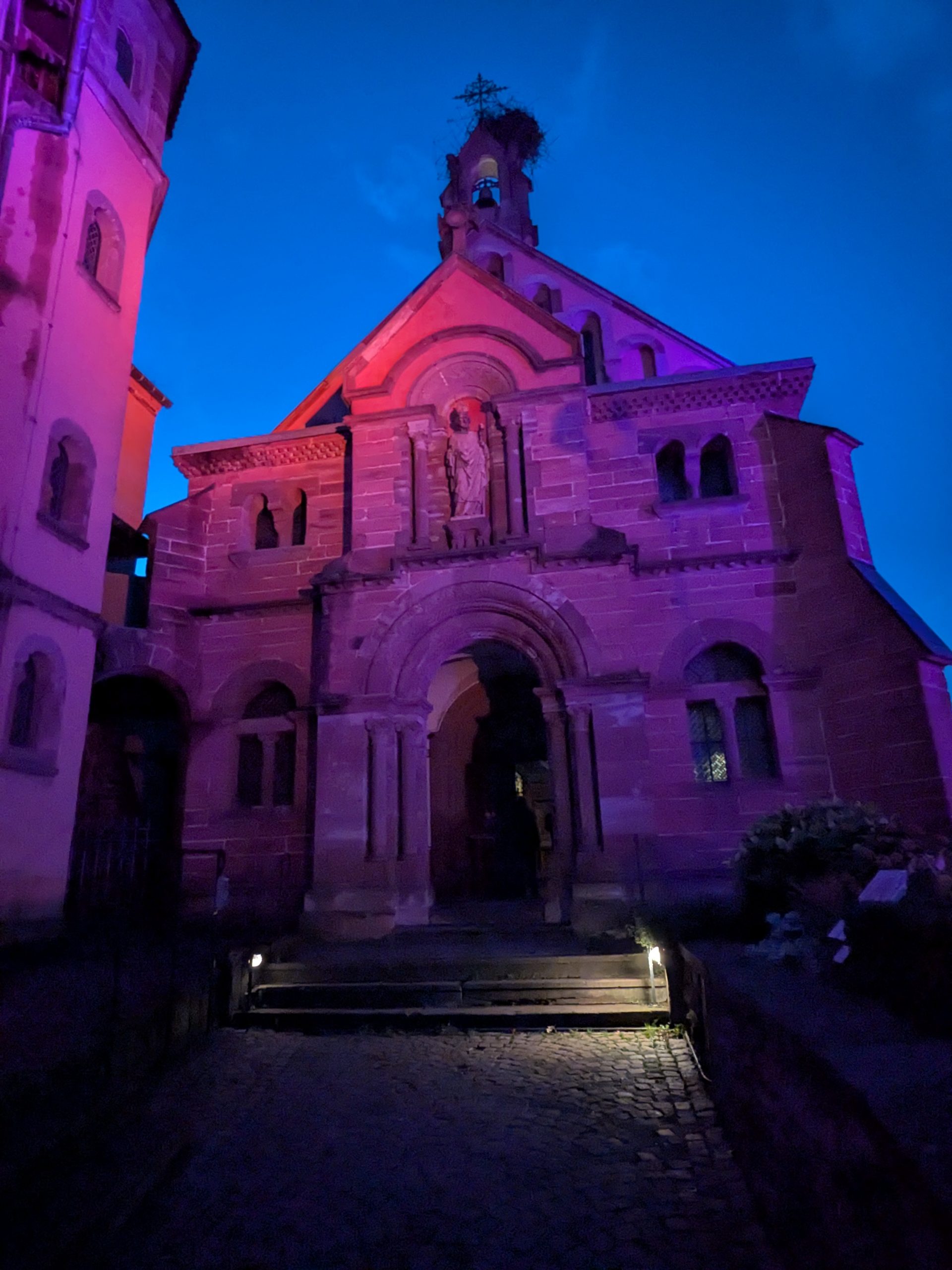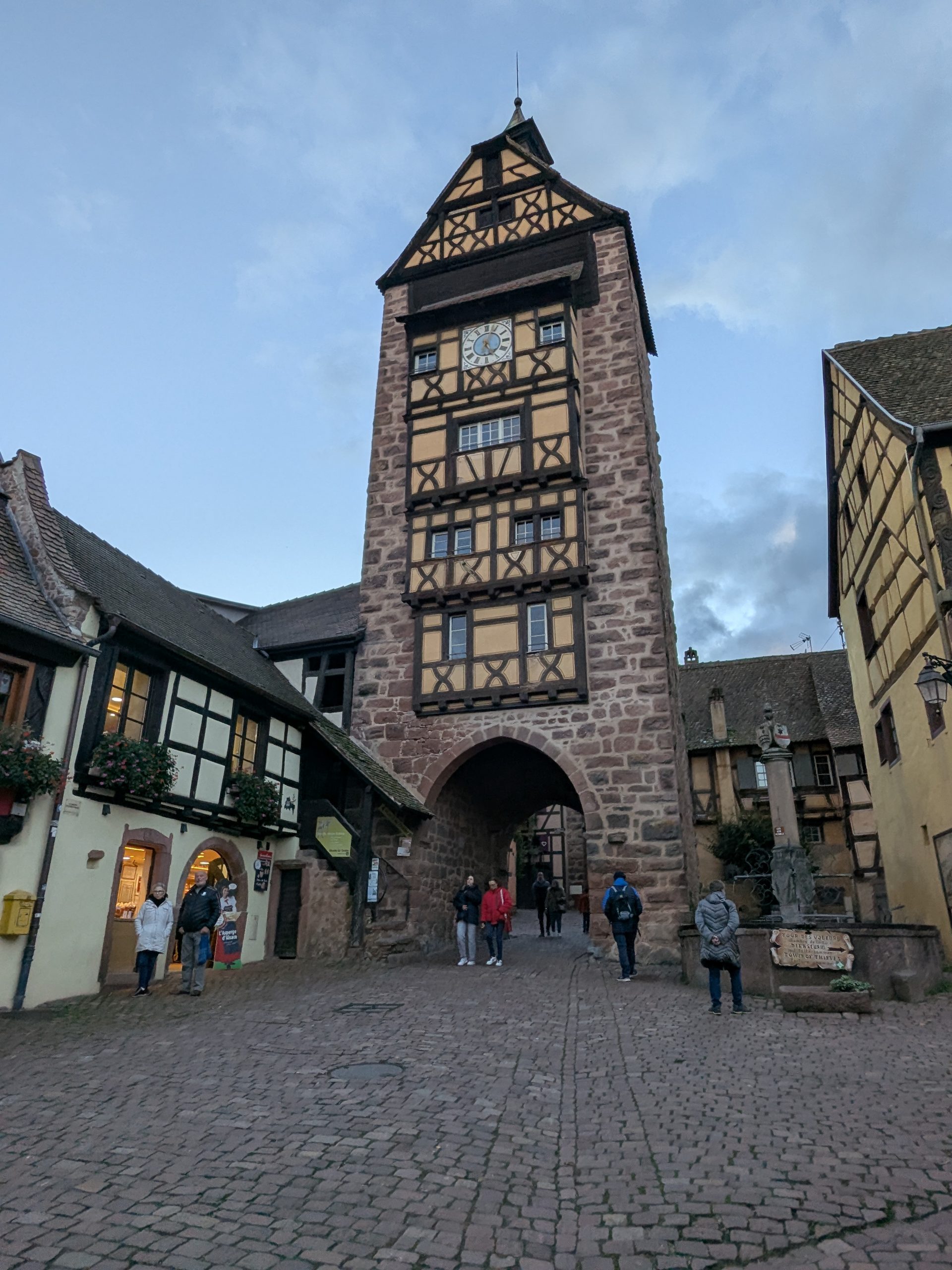 Abends soll es aufhören zu regnen, also schnappen wir uns gegen 18:00 den „Dicken“ und fahren 5 Minuten ins Dorf. Der Wetterbericht hat gelogen, es tröpfelt fröhlich weiter, aber wir lassen uns nicht abschrecken und machen einen Abendspaziergang durch Obernai. Hübsch mit der Beleuchtung und viel besser als im Sommer 22 mit den Touristenmassen. Sogar die Lokale sind fast leer, aber bei den Preisen ist das wohl auch kein Wunder, 14,00-17,80€ für ein Garlette. Wir freuen uns schon auf lecker Lieu noir (Fisch) mit Salat und Baguette.