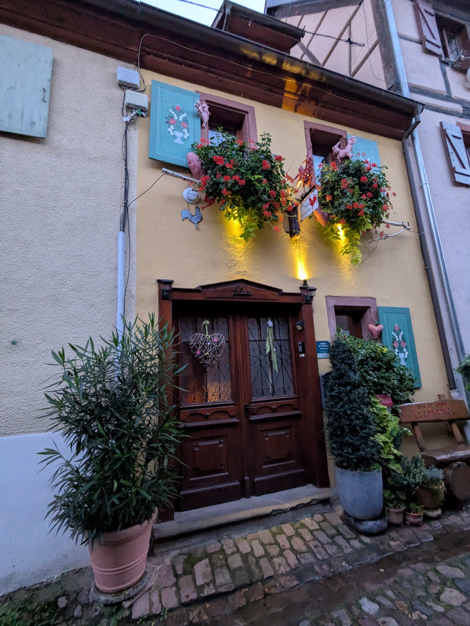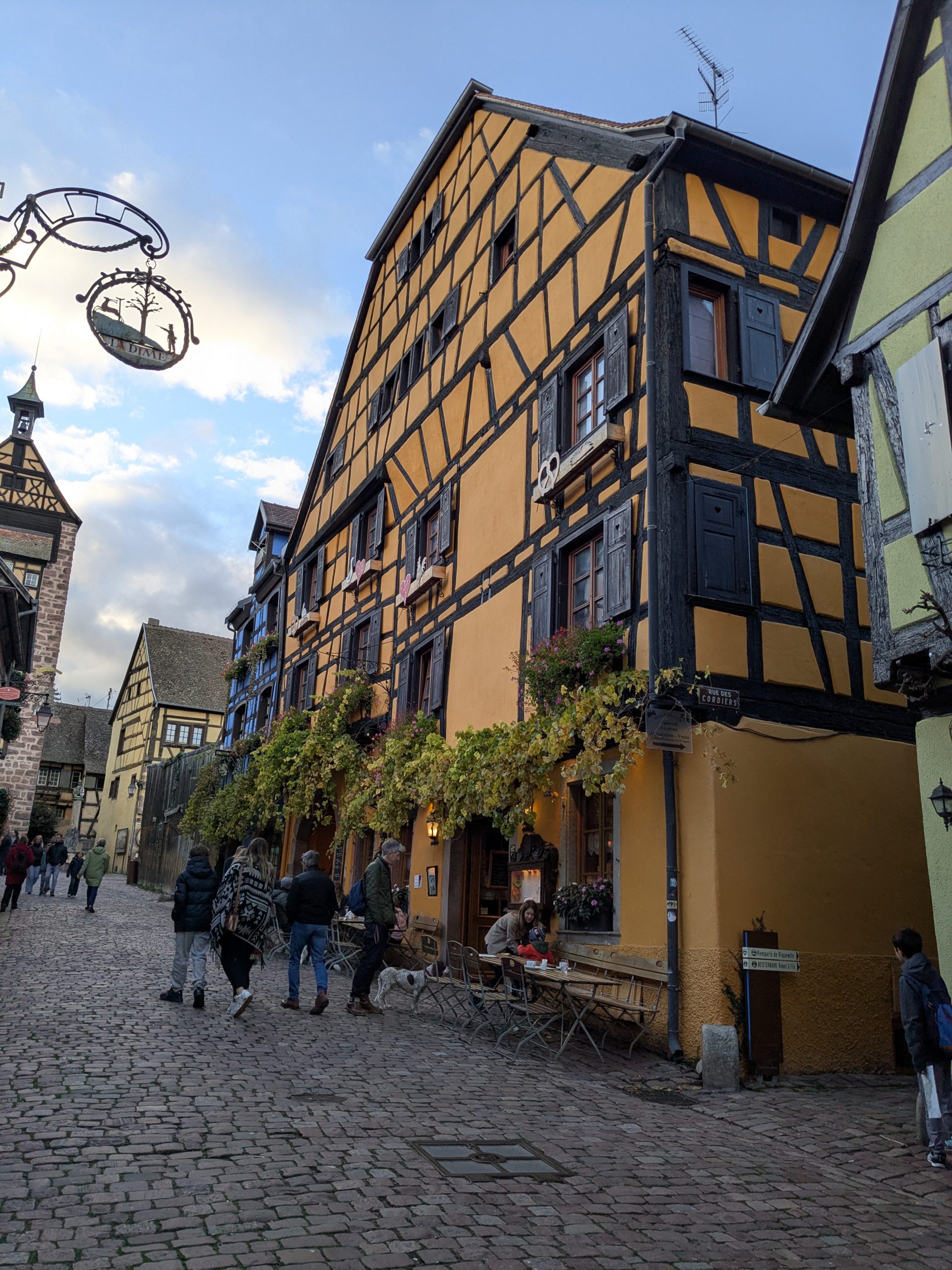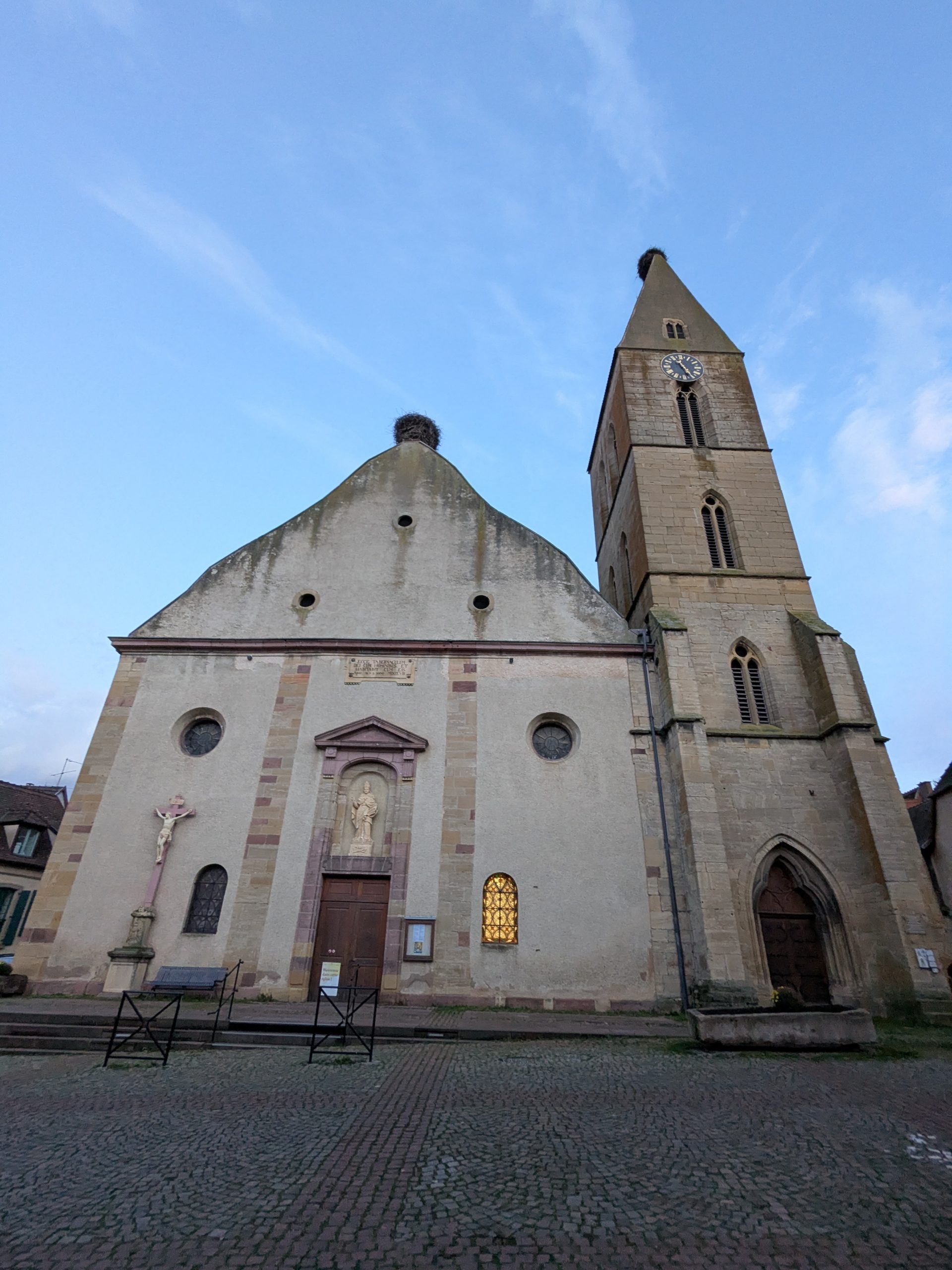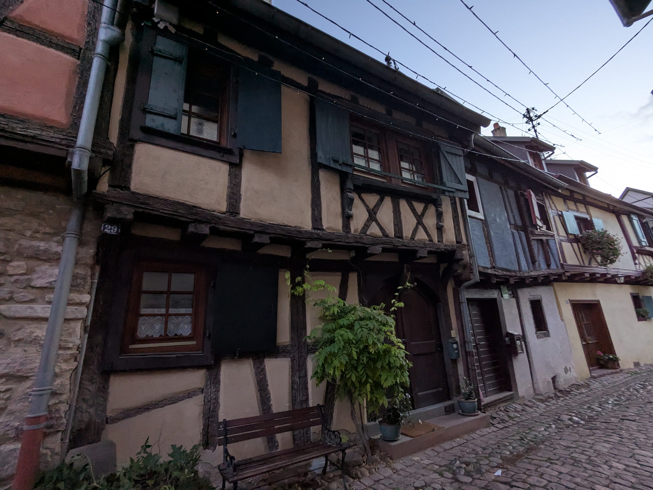 Abends soll es aufhören zu regnen, also schnappen wir uns gegen 18:00 den „Dicken“ und fahren 5 Minuten ins Dorf. Der Wetterbericht hat gelogen, es tröpfelt fröhlich weiter, aber wir lassen uns nicht abschrecken und machen einen Abendspaziergang durch Obernai. Hübsch mit der Beleuchtung und viel besser als im Sommer 22 mit den Touristenmassen. Sogar die Lokale sind fast leer, aber bei den Preisen ist das wohl auch kein Wunder, 14,00-17,80€ für ein Garlette. Wir freuen uns schon auf lecker Lieu noir (Fisch) mit Salat und Baguette.
