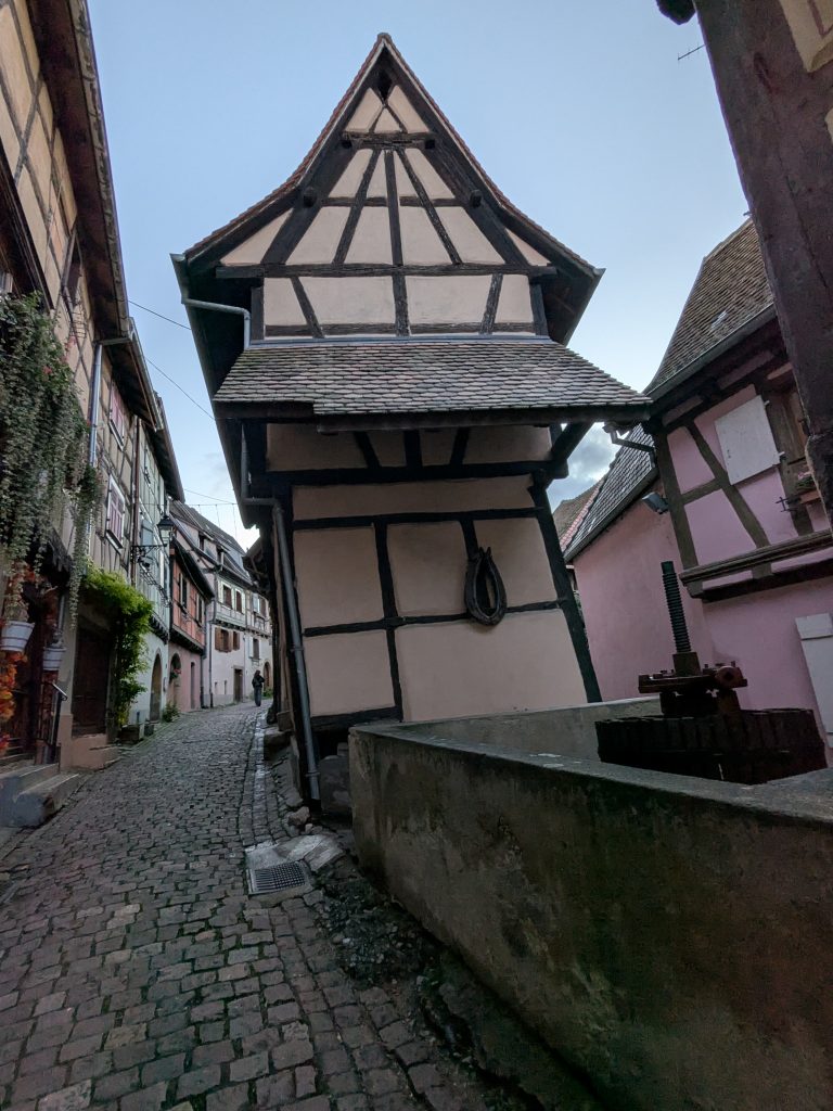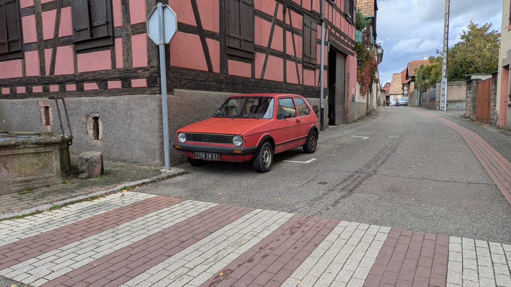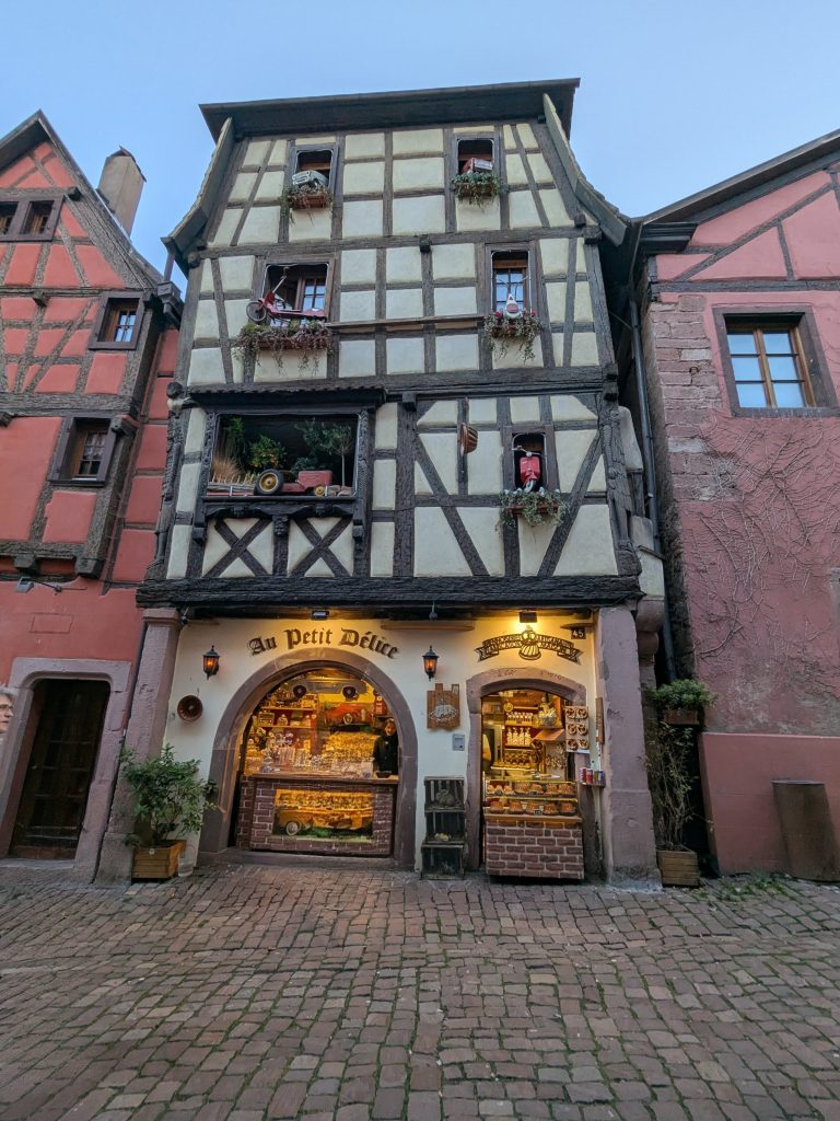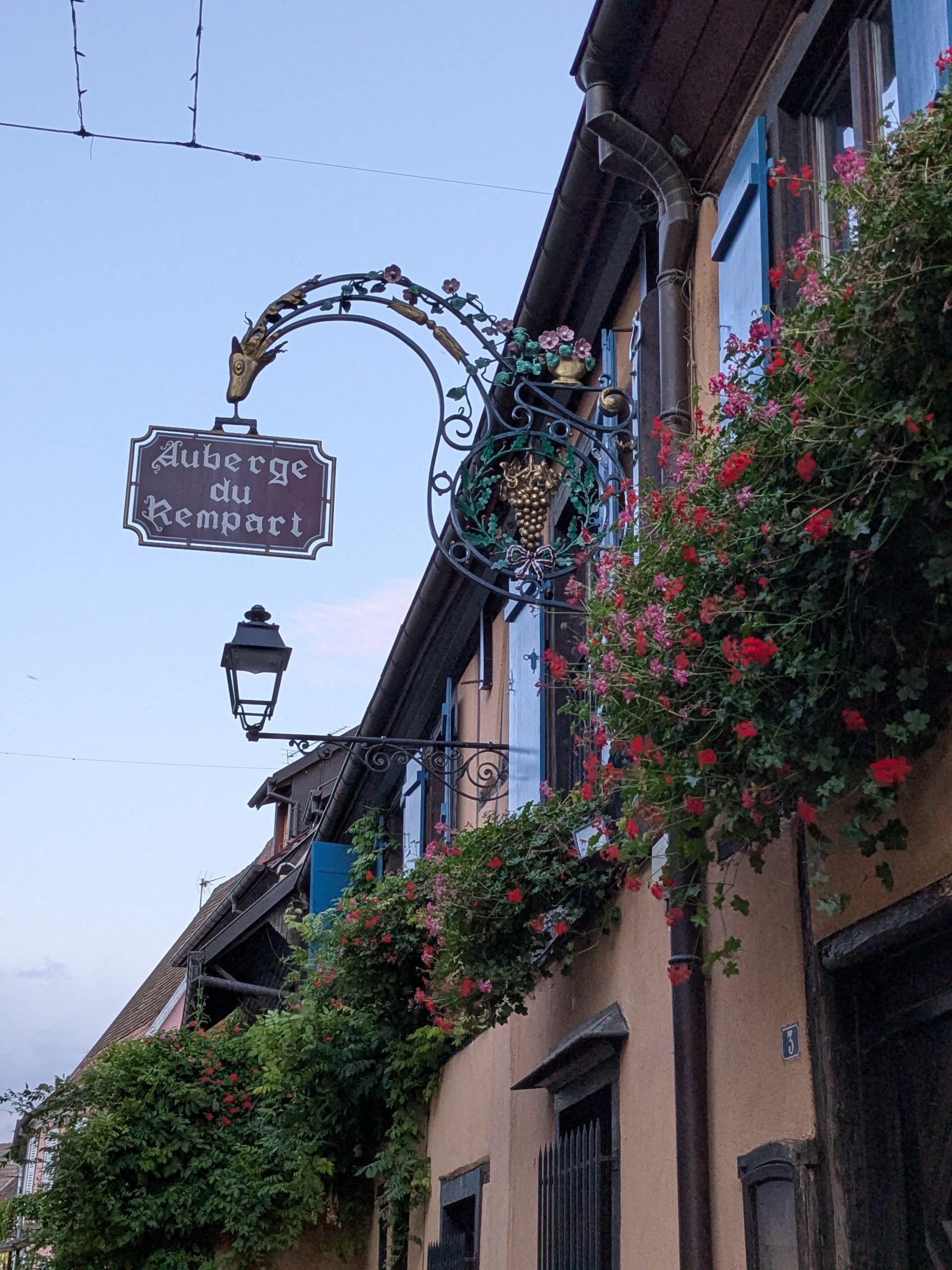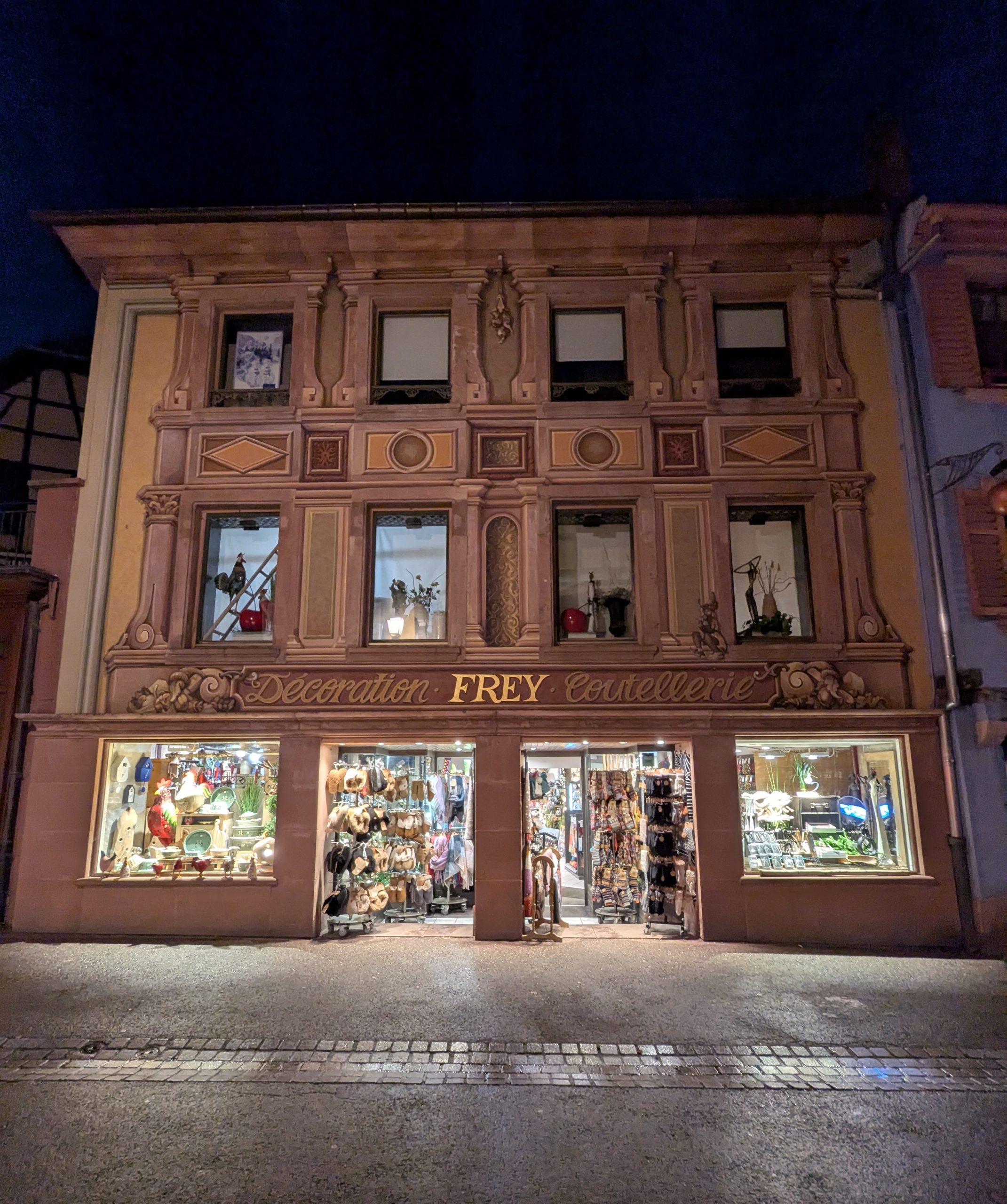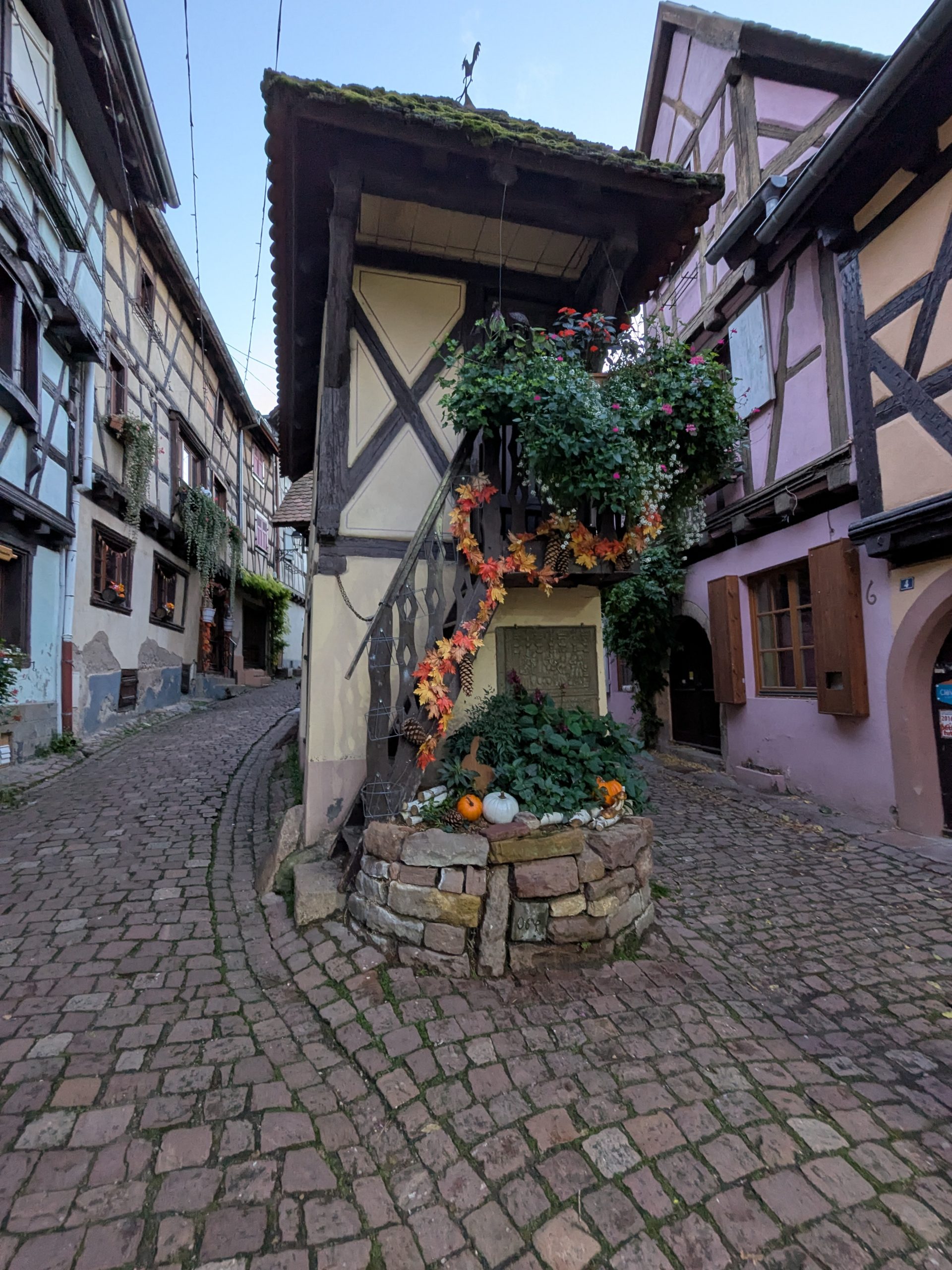 Abends soll es aufhören zu regnen, also schnappen wir uns gegen 18:00 den „Dicken“ und fahren 5 Minuten ins Dorf. Der Wetterbericht hat gelogen, es tröpfelt fröhlich weiter, aber wir lassen uns nicht abschrecken und machen einen Abendspaziergang durch Obernai. Hübsch mit der Beleuchtung und viel besser als im Sommer 22 mit den Touristenmassen. Sogar die Lokale sind fast leer, aber bei den Preisen ist das wohl auch kein Wunder, 14,00-17,80€ für ein Garlette. Wir freuen uns schon auf lecker Lieu noir (Fisch) mit Salat und Baguette.