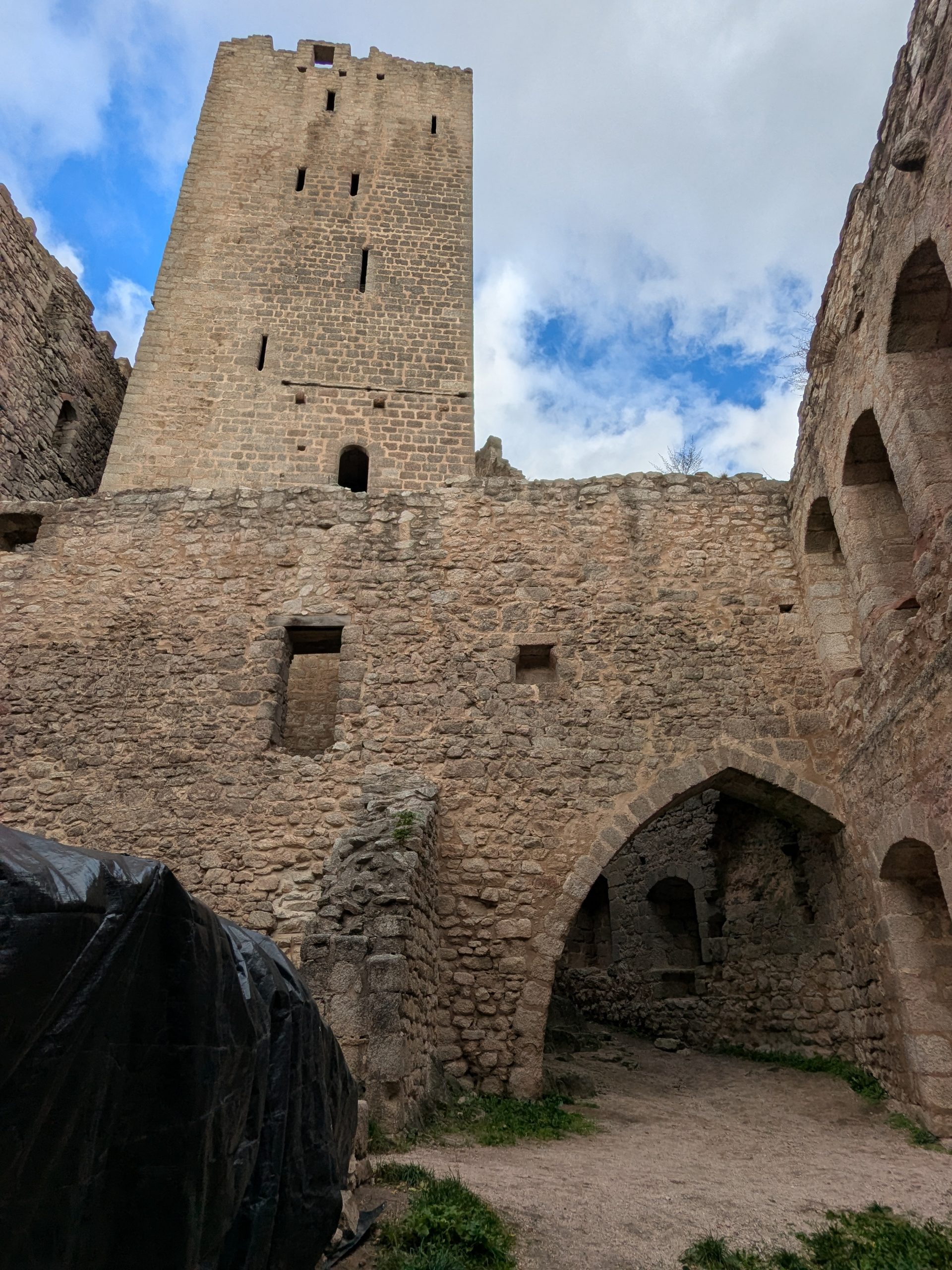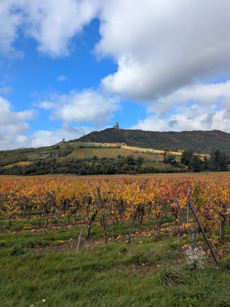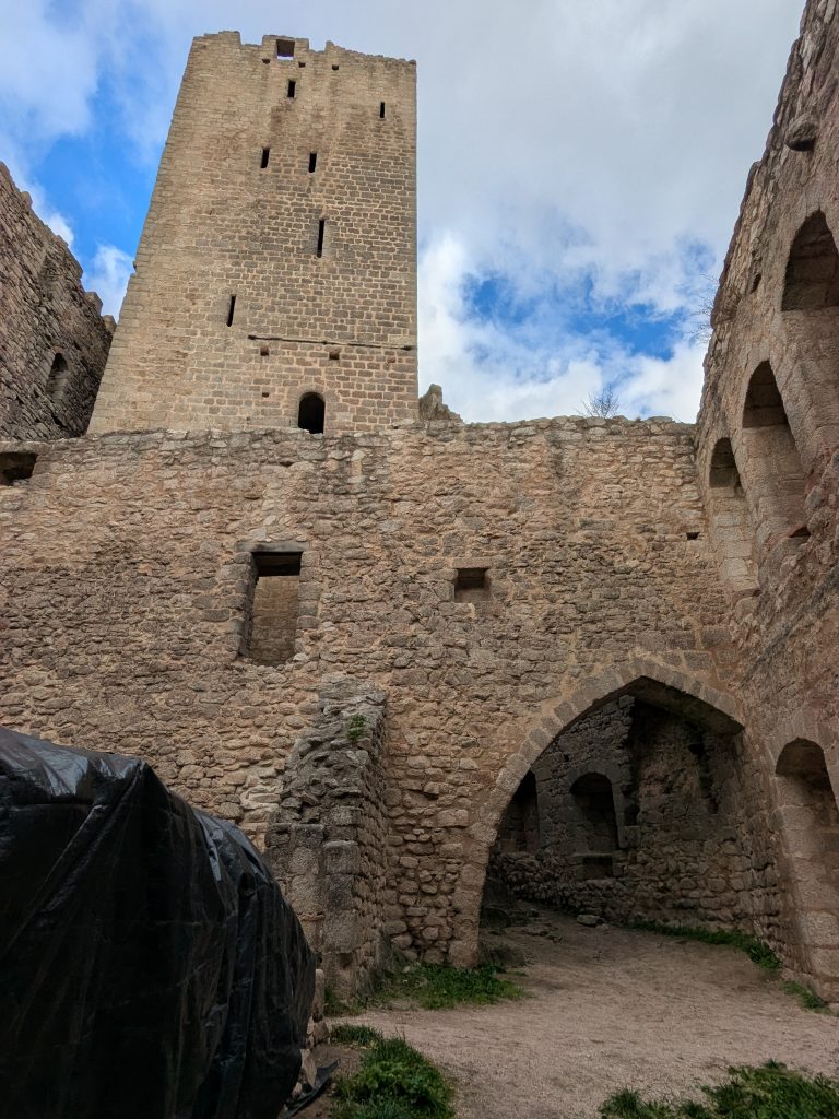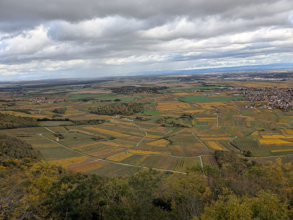 Es soll den ganzen Vormittag stark regnen, also kein Wecker und lange schlafen. Um 14 Uhr starten wir Richtung Colmar, um die Burgruine Hohlandsberg zu besichtigen. Die Straße schlängelt sich steil den Berg hoch und das letzte Stückchen laufen wir noch hoch, um festzustellen, dass man direkt vorm Eingang auch hätte Parken können. Die Aussicht ist grandios. Nachdem alles beguckt ist, fahren wir nach Eguisheim. Ein grosser Parkplatz mit Stellplatz für Wohnmobile am Eingang zum Ort ist vorhanden. Wir laufen durch die Gässchen und wundern uns über die schiefen Häuser, ein Labcache wird nicht ganz absolviert, der letzte Punkt liegt weit außerhalb, da sind wir zu faul.