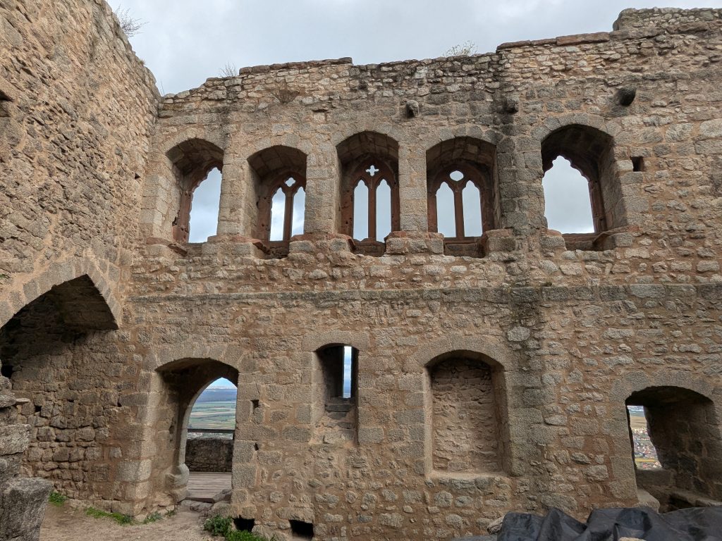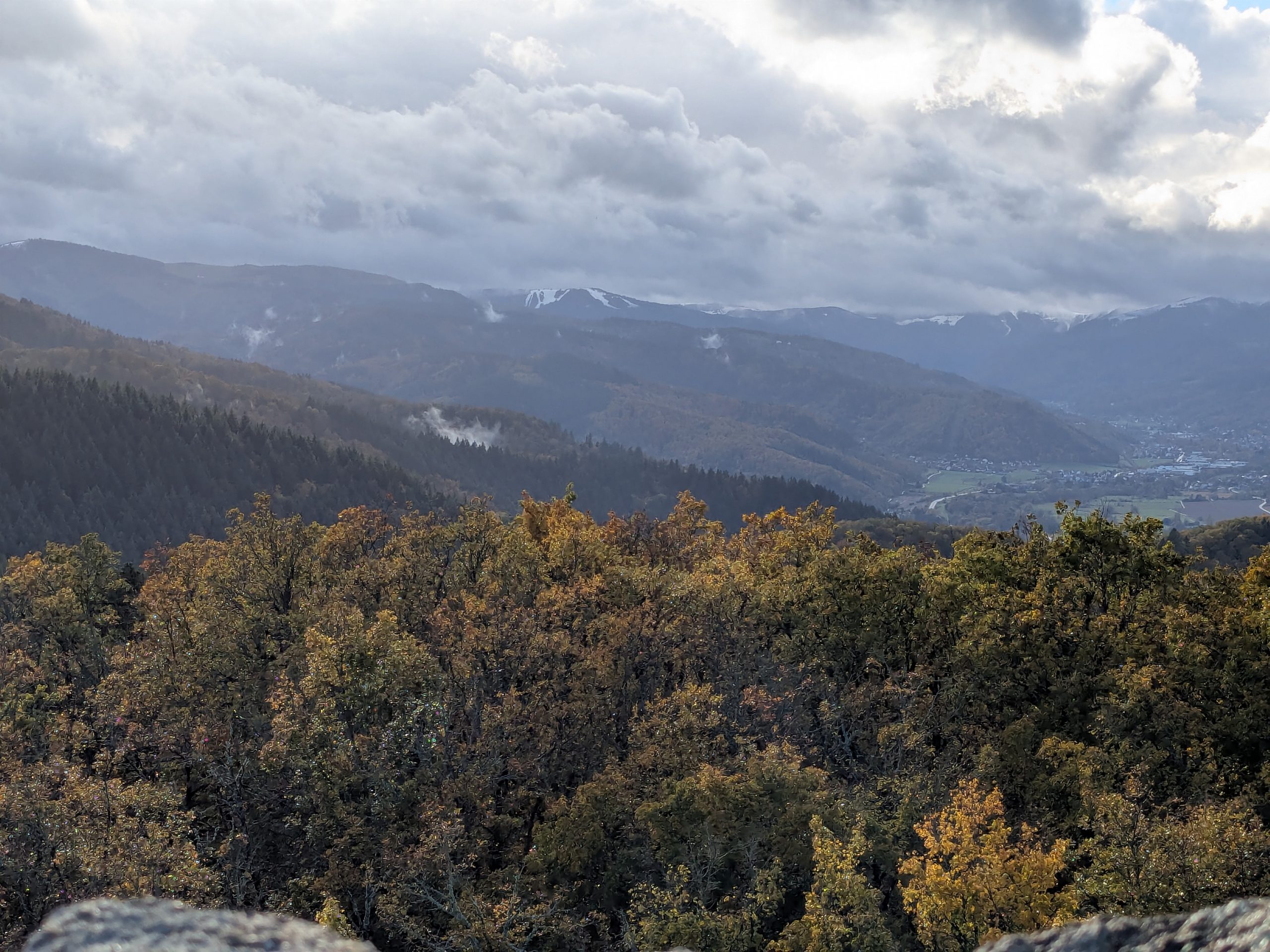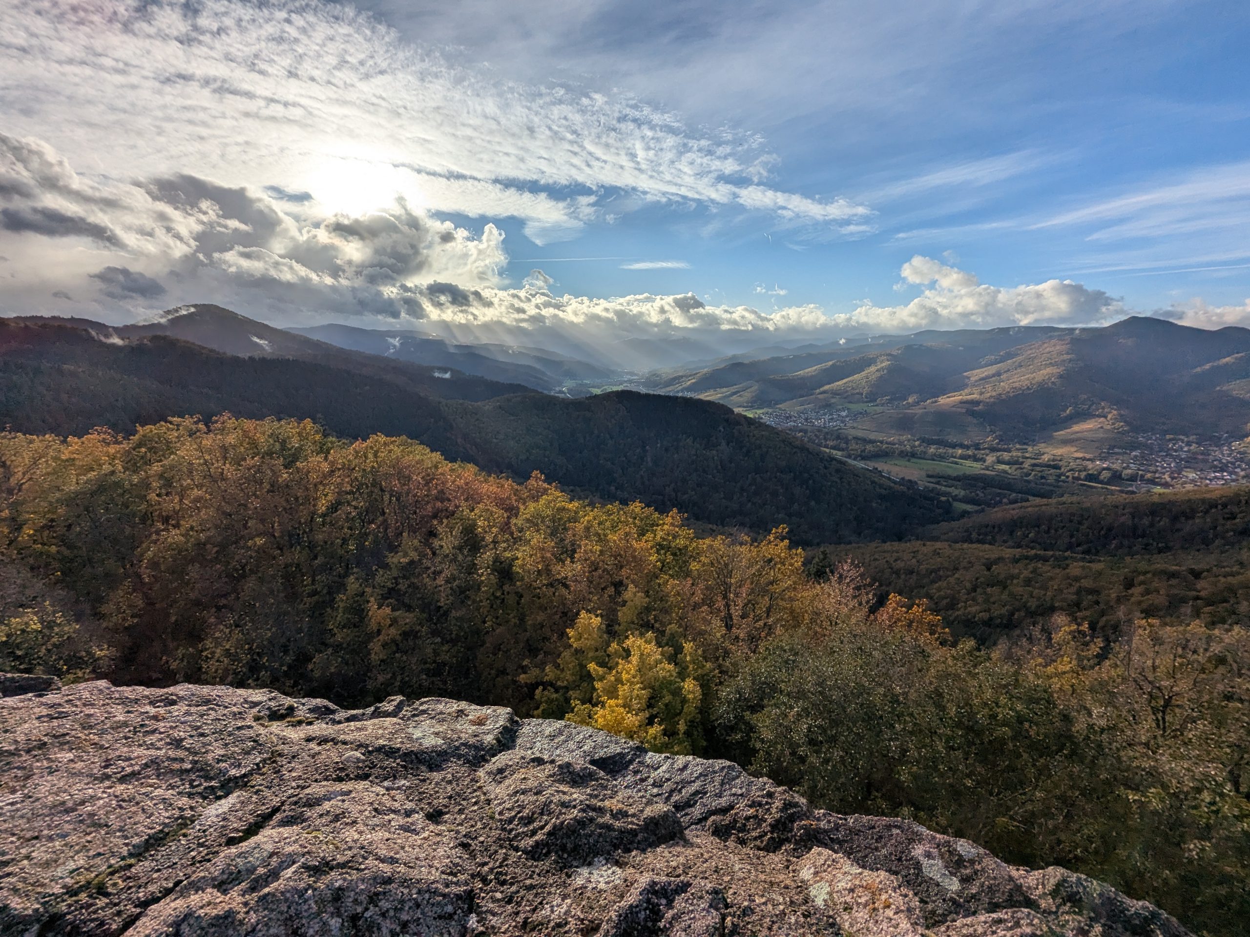 Es soll den ganzen Vormittag stark regnen, also kein Wecker und lange schlafen. Um 14 Uhr starten wir Richtung Colmar, um die Burgruine Hohlandsberg zu besichtigen. Die Straße schlängelt sich steil den Berg hoch und das letzte Stückchen laufen wir noch hoch, um festzustellen, dass man direkt vorm Eingang auch hätte Parken können. Die Aussicht ist grandios. Nachdem alles beguckt ist, fahren wir nach Eguisheim. Ein grosser Parkplatz mit Stellplatz für Wohnmobile am Eingang zum Ort ist vorhanden. Wir laufen durch die Gässchen und wundern uns über die schiefen Häuser, ein Labcache wird nicht ganz absolviert, der letzte Punkt liegt weit außerhalb, da sind wir zu faul.