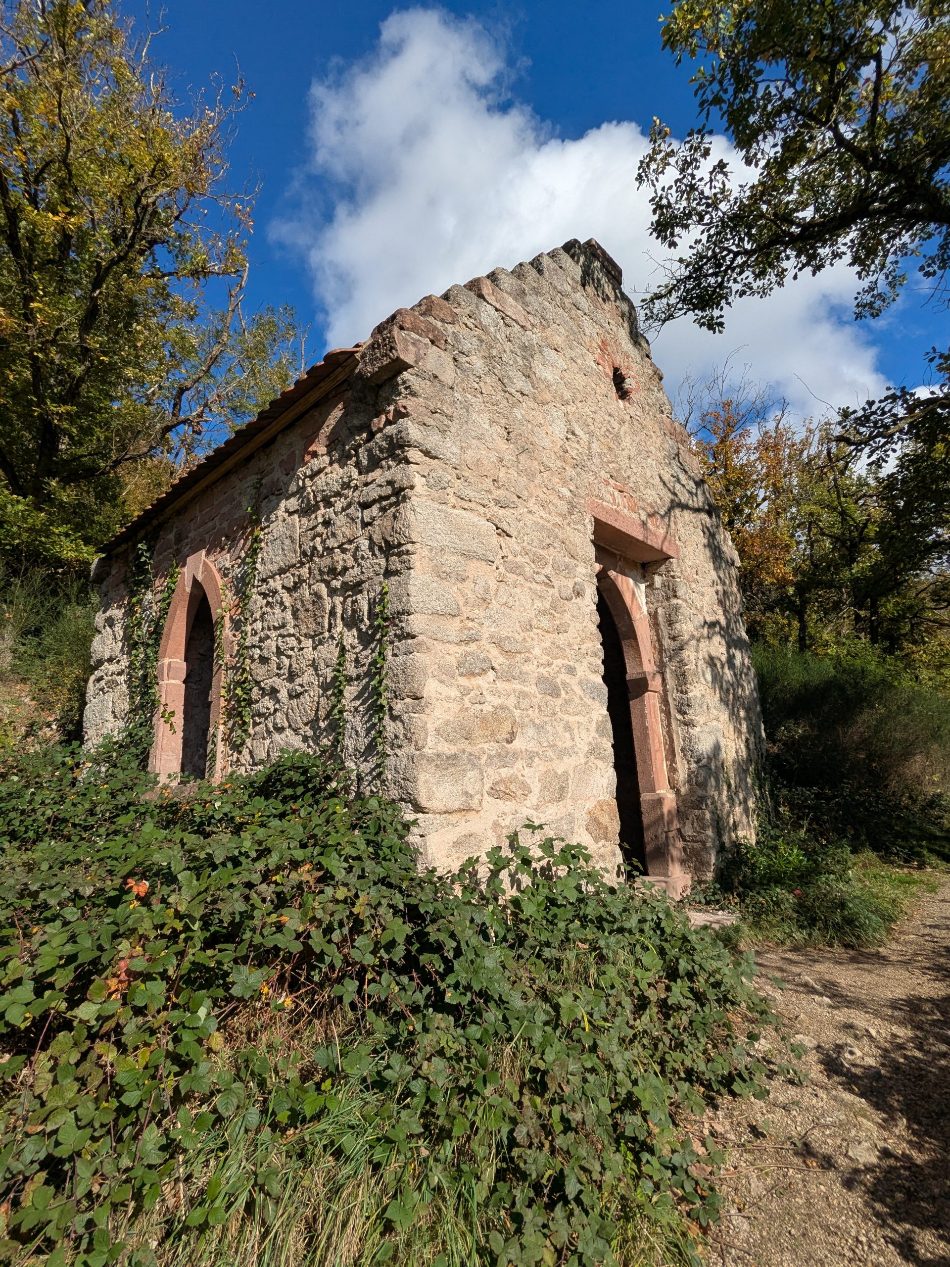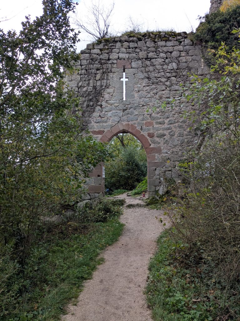 Die Nacht war herrlich ruhig, kein Getröpfel und kein Wind. Wir haben uns entschlossen, eine kleine Wanderung zur Ortenbourg zu machen. Google sagt vom Parkplatz zur Burg sind es 20 Minuten zu Fuß, größtenteils flach. Wie das gehen soll, ist mir ein Rätsel, die Burg liegt, wie sollte es anders sein, oben auf einem Berg. Lassen wir uns mal überraschen. Nach dem Frühstück packen wir den Rucksack, mit Stullen und allem was man so braucht. Unsere Erfahrungen hier mit auswärtiger Versorgung sind eher schlecht. Nicht etwa, dass das Essen hier schlecht wäre, nein, es gibt einfach keins. Lokale und Cafés sind selten und dann meist geschlossen. Mit dem Dicken fahren wir genau dahin wo wir gestern schon waren. Einmal durch Scherwiller und dann ein Stückchen den Berg hoch. Leider wirklich nur ein Stückchen, bis zur Burg ist noch ein ganzes Stück Berg übrig 🙁 . Wir parken bei der Auberge de la Huhmelmuhle (geschlossen) und stapfen los. Schnell stellen wir fest, Google lügt! Wenn das hier größtenteils flach ist, möchte ich nicht wissen, was steil ist. Aber es hilft nichts, keuchend geht es weiter bergauf, über Steine und Baumwurzeln. Erster Stopp, die Kapelle, kurz verschnaufen und einen Cache loggen. Dann weiter zur Ruine Ramstein, ist nicht mehr ganz so viel davon da, aber die Aussicht ist super. Einen Cache später, quälen wir uns die letzten Meter bis Ortenstein hoch. 1,5 Stunden hat das ganze mit Pausen und Cachen gedauert. Ca. 250 Höhenmeter sind es gewesen. Wir werden mit einer netten Ruine und einer weiteren schönen Aussicht, sowie einem Picknick in den altehrwürdigen Mauern belohnt. Der Rückweg ist dann fast ein Kinderspiel, trotzdem brauchen wir gute 30 Minuten, bis wir wieder am Auto sind. Die Hoffnung auf einen Kaffee in der Auberge müssen wir auch aufgeben, die öffnet erst um 19:00. Passt, dann sind hier bestimmt noch viele Wanderer unterwegs 😉 . Wir fahren noch nach Kintzheim, dort soll es noch eine Burgruine geben. Aber dort angekommen sehen wir, daß die dazu gehörige Adlerwarte vor 10 Minuten geschlossen hat und obwohl Google behauptet, die Ruine ist rund um die Uhr geöffnet, haben wir da so unsere Zweifel, sie liegt nämlich in der Adlerwarte. Also fahren wir lieber zurück zum Campingplatz und relaxen dort.