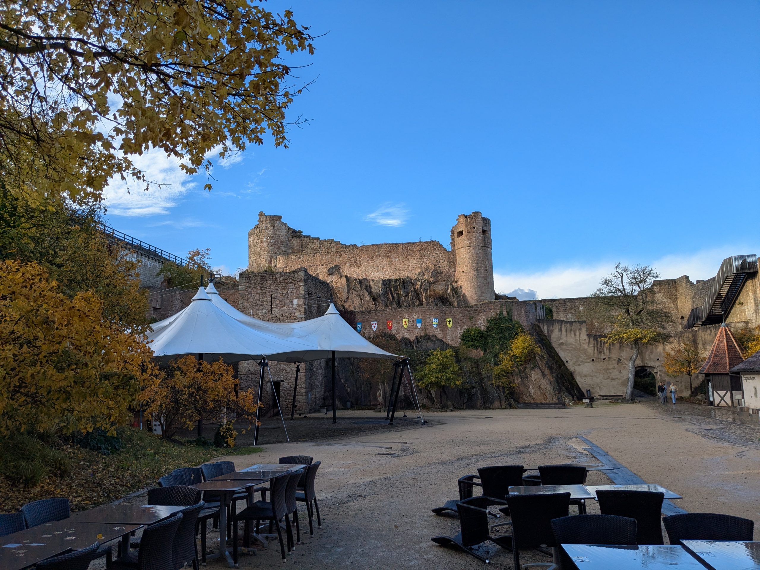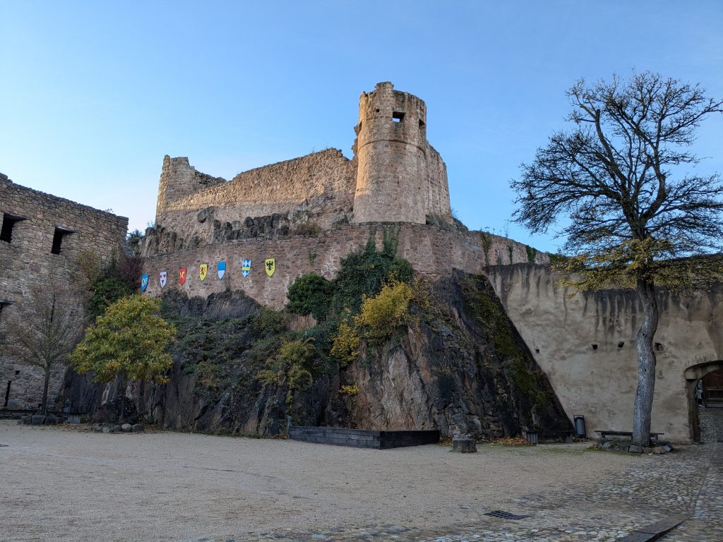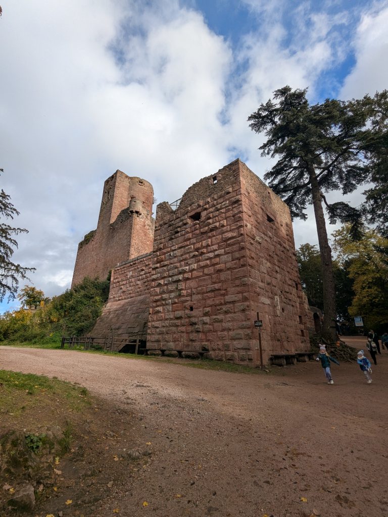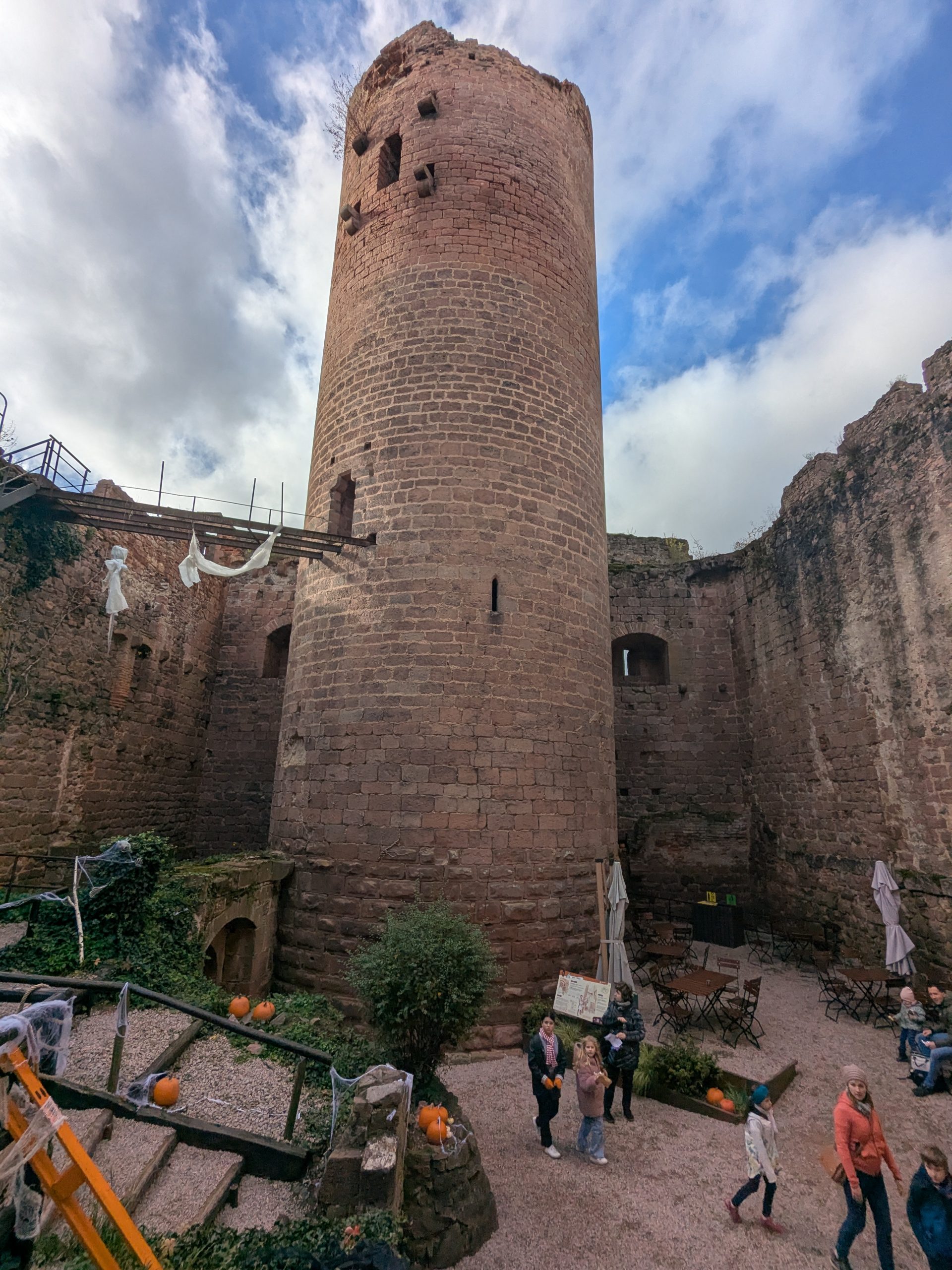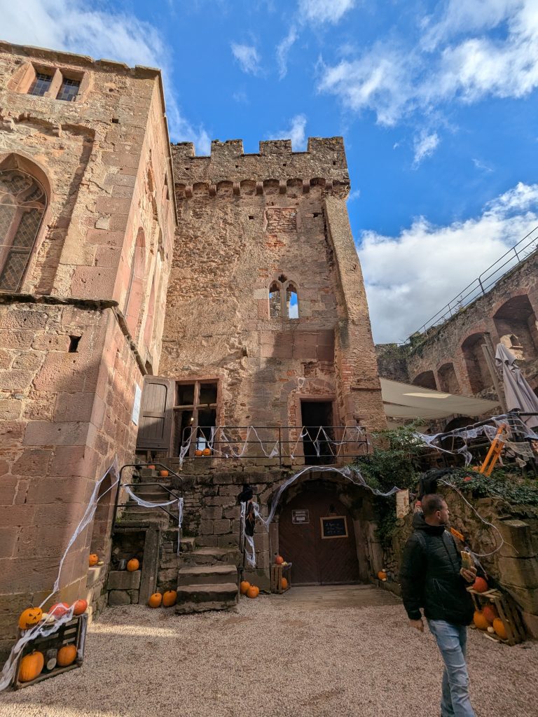 Die Nacht war herrlich ruhig und wir haben lange geschlafen. Um 10:00 Uhr hat sich Ralf aus dem Bett gekegelt. Um 12:00 starten wir nach Graufthal, um dort die Felsenhäuser zu besichtigen. Pünktlich zum Start, setzt der Regen ein 🙁 Trotzdem ist die Besichtigung sehr interessant. Bis 1958 hat hier die letzte Bewohnerin, Catherina Ottermann, ohne Wasser und Strom gelebt. Zum Teil lebten hier Familien mit 6 bis 10 Kindern und ihren Ziegen in den kleinen Häuschen. Nach dem Tod von Catherina verfielen die Häuser und würden ab 1985 originalgetreu nach alten Fotos restauriert. Nach der Besichtigung starten wir trotz Regen zum Chateau Lichtenberg. Hier gibt es wegen des Regens erst einmal Espresso im Häuschen der Bushaltestelle. Punkt 14:30 hört der Regen, wie von der App vorhergesagt, auf und wir stapfen mal wieder einen Berg hoch zum Chateau. Hier ist leider Halloween ausgebrochen und überall treiben sich verkleidete Kinder (und Erwachsene) rum. Wir lassen uns aber nicht abschrecken, auch wenn wir für die schlechte Halloween-Deko 2€ mehr Eintritt zahlen müssen. (10€ anstatt 8€/Pers.) Dafür gibt es aber eine grandiose Aussicht. Nach 1,5 Stunden haben wir alles besichtigt und es geht zurück zum Campingplatz, vorher drehen wir noch eine kurze Runde durch Niederbronn. Fazit, nicht wirklich sehenswert. Also ab zum Wobi.