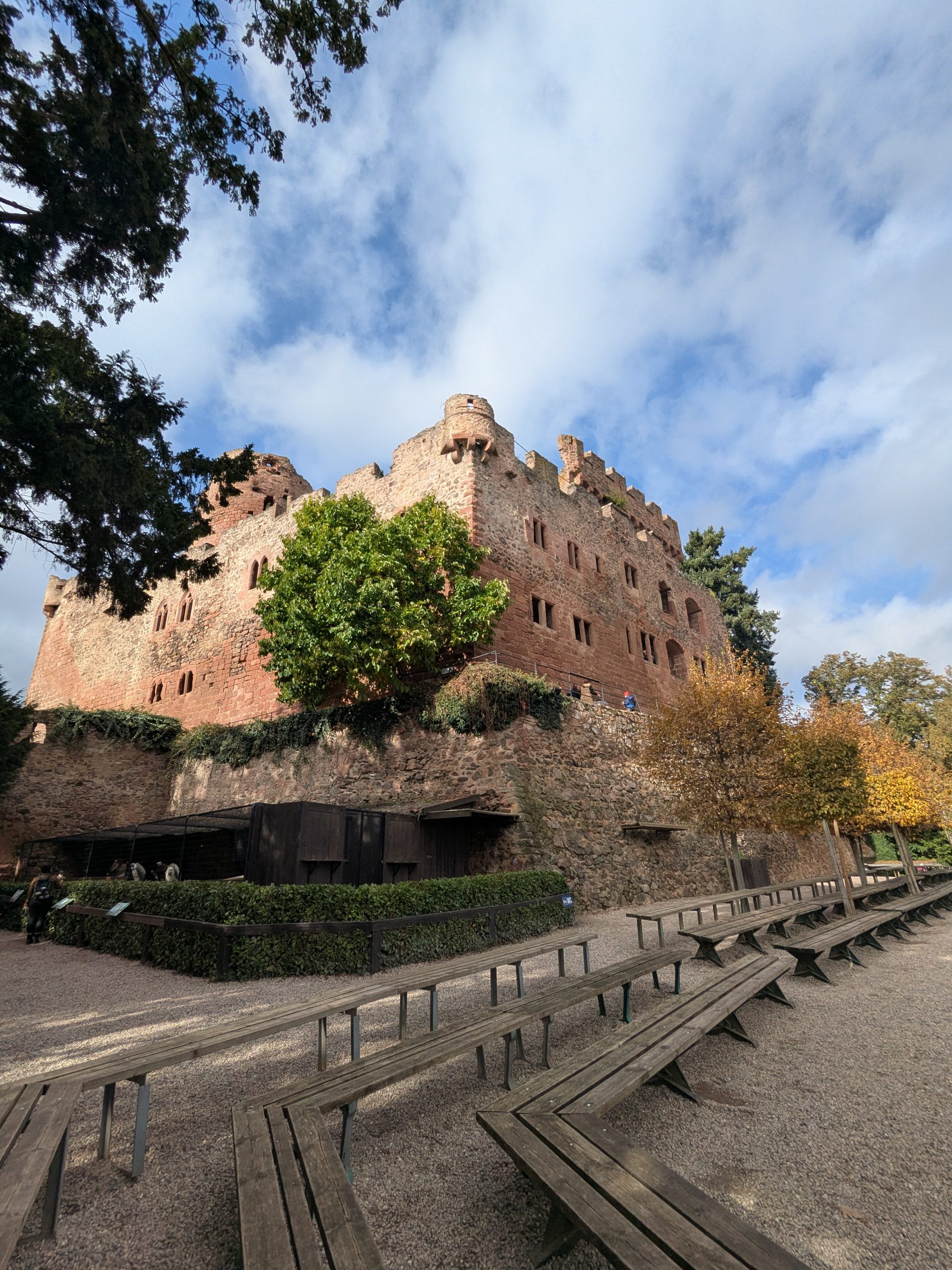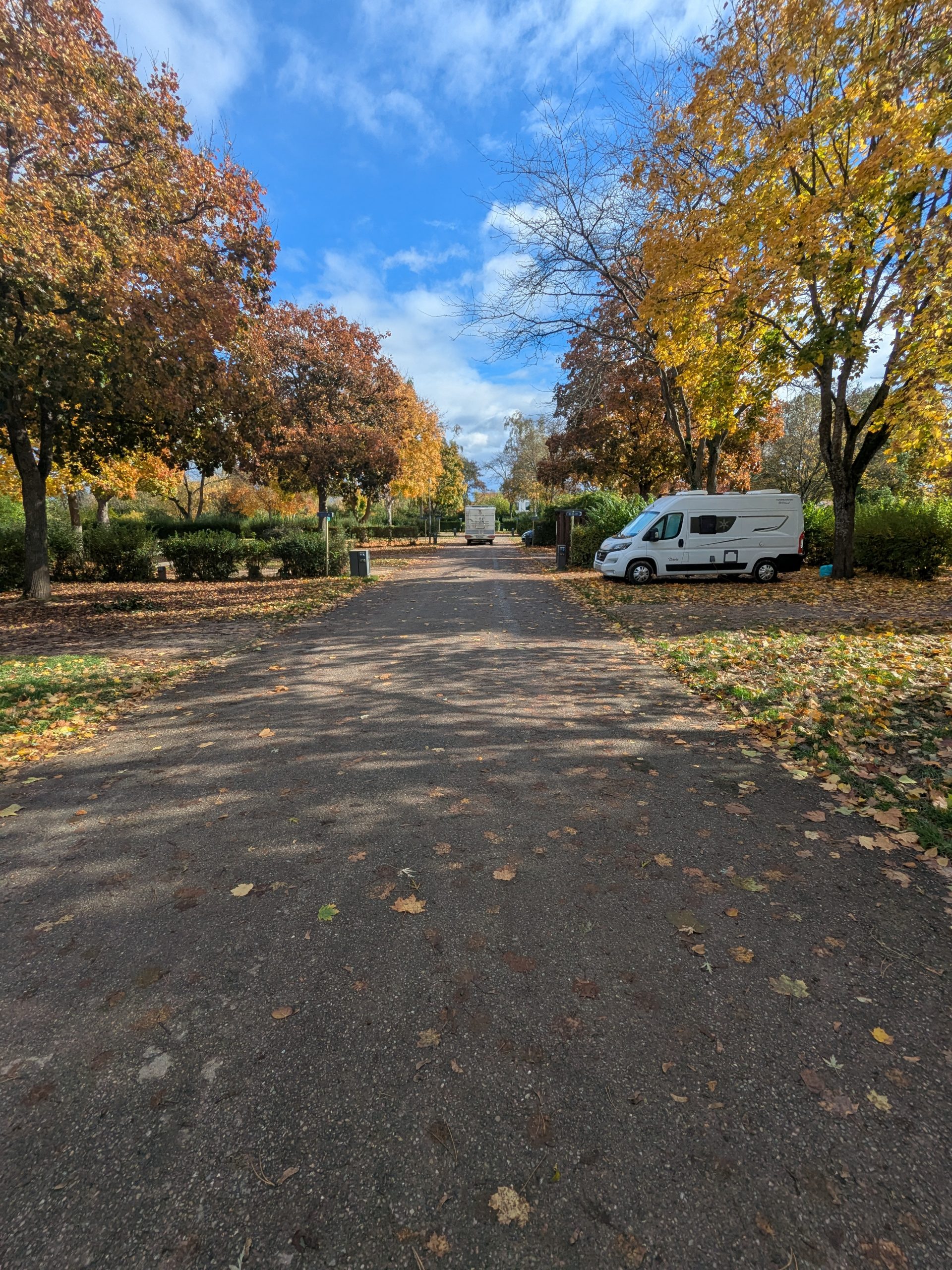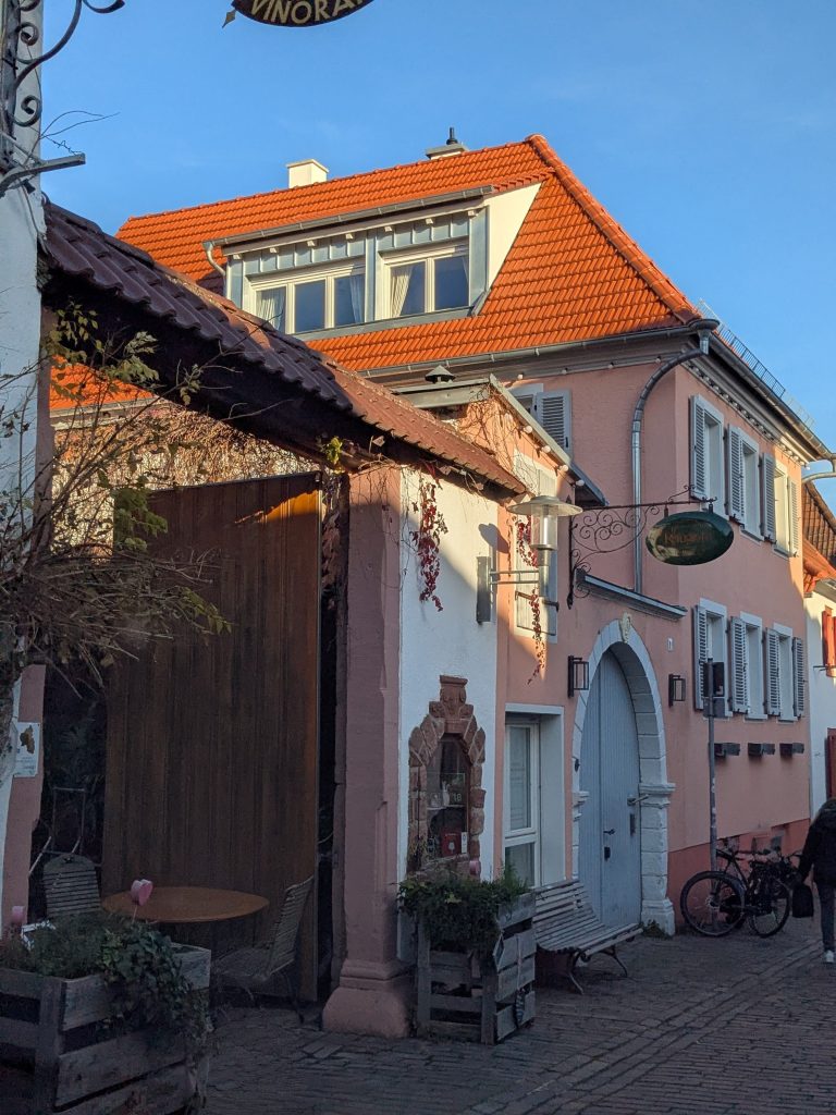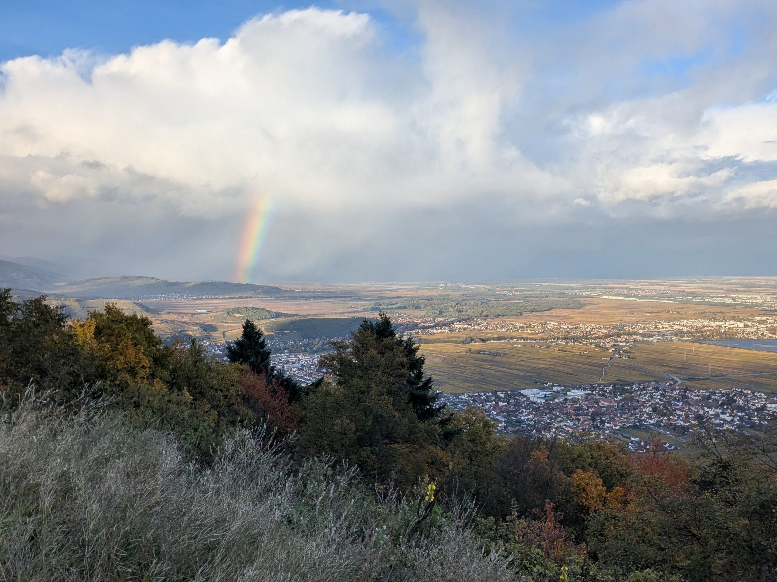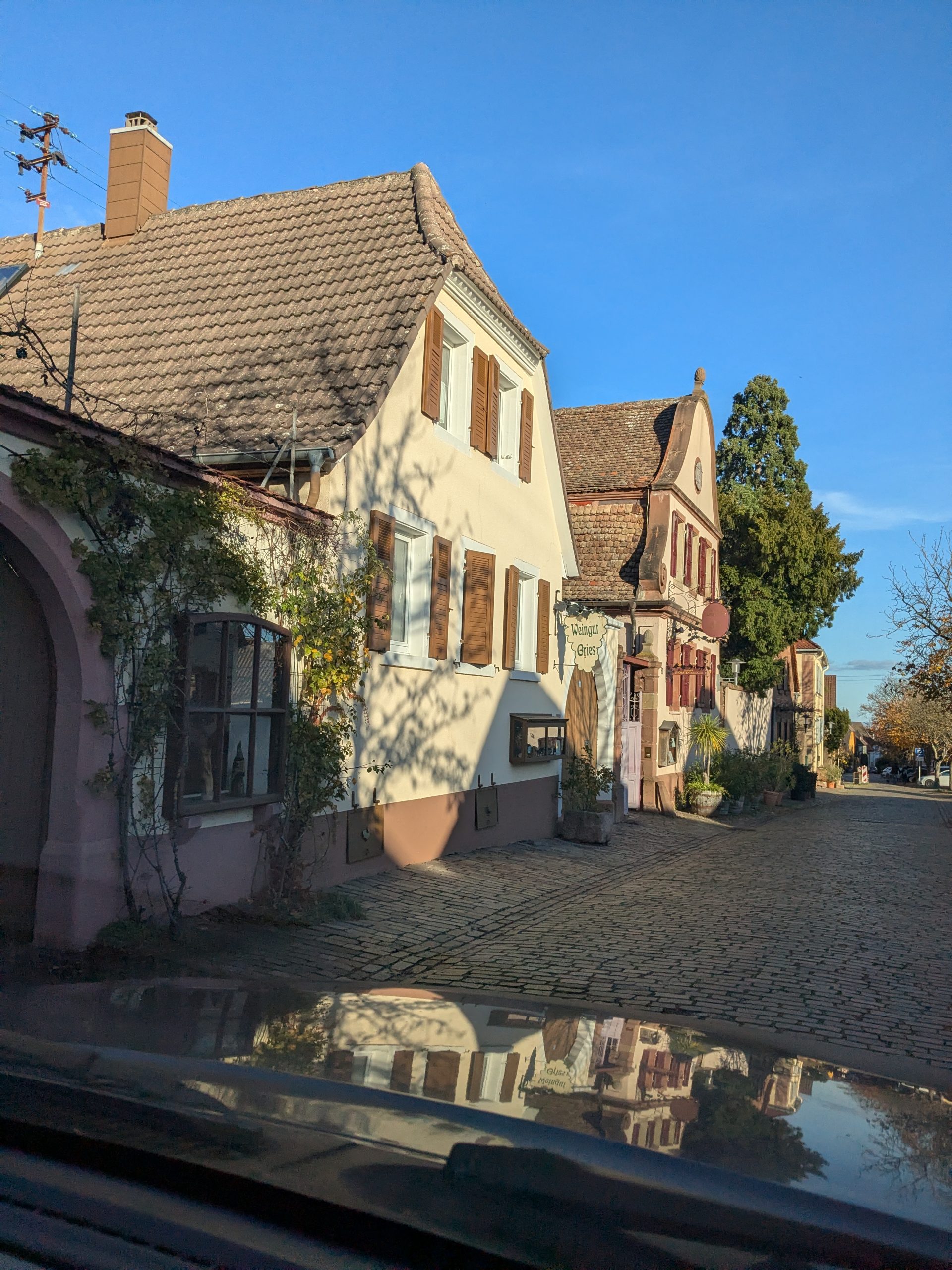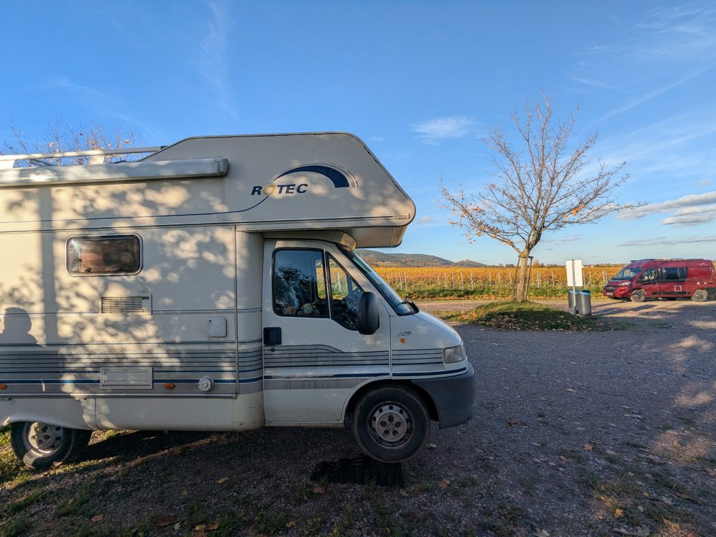 Heute ist Abreise, wir wollen ganz gemächlich wieder Richtung Heimat aufbrechen. Ralf bekommt von den ganzen niedlichen Dörfern hier Sodbrennen. 😉 und wir wollen uns auch evtl. noch mit Larissa in Wiesbaden treffen. Also klingelt der Wecker um 8:00. Ich bin aber schon vorher wach und werde mit super Morgenstimmung begrüßt. Um 10:30 Uhr starten wir dann. Erstmal wieder zur Raststätte Haut Koenigsbourg, Gas und Benzin tanken. Dann noch schnell den Bongo entleeren. Das haben wir bei der Entsorgung auf dem Campingplatz vergessen. Als nächstes gibt es ein Problem mit der Route. Google will uns partout über die Stadtautobahn durch Straßburg schicken. Dürfen wir aber ohne Crit’Air-Vignette nicht. Als ganz old school aufpassen und die richtige Autobahn nehmen. Gleich darauf wissen wir auch wo das Problem lag. Die Autobahn die wir nehmen dürfen (A355) kostet Maut und wir hatten Maut vermeiden eingeschaltet. Dann erreichen wir die Grenze und damit die Zollkontrolle! Ja, es gibt sie wieder, es lebe Europa 🙁 und kaum zurück in Deutschland haben wir endlich wieder einen Stau! Wie haben wir das vermisst. Bei Rhodt unter Riedburg finden wir einen Stellplatz ohne Alles, dafür mit Aussicht direkt in den Weinbergen. Es kostet 10 Euro, bezahlen wir per App PayByPhone. 2022 haben wir hier schon auf einem anderen Platz übernachtet, deshalb geht es auch gleich zum Chinesen in Edenkoben, den wir bereits kennen. Danach starten wir nach Landau in der Pfalz. Hier geht verkehrstechnisch gar nichts, aber irgendwann haben wir den Dicken geparkt und laufen los, um ein paar Labcaches zu machen. Es gibt zwar ein paar ganz nette Momente, aber im Großen und Ganzen: Landau kann man machen, muss man aber nicht. Eine Altstadt gibt es nicht so wirklich, ist wohl bei einem Großbrand 1689 abgefackelt. Also, ab zum Wobi, relaxen und schmökern durch den neuen „Asterix in Lusitanien“ 😉 .