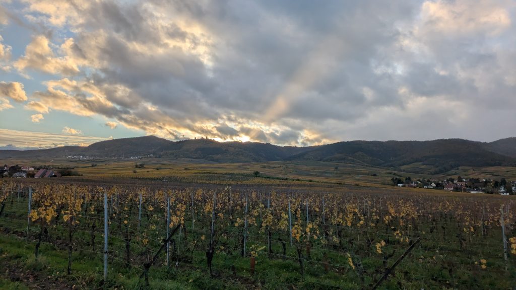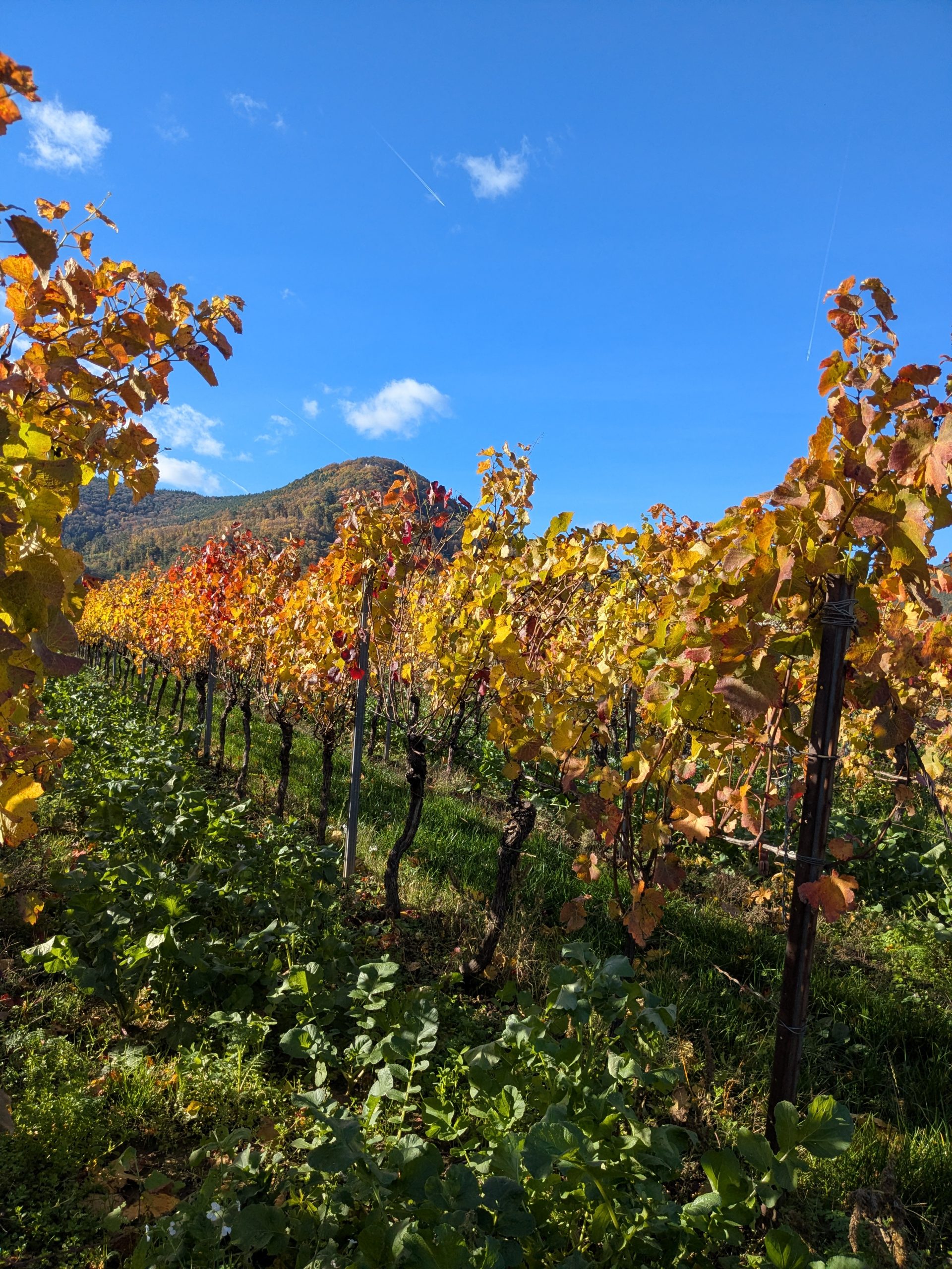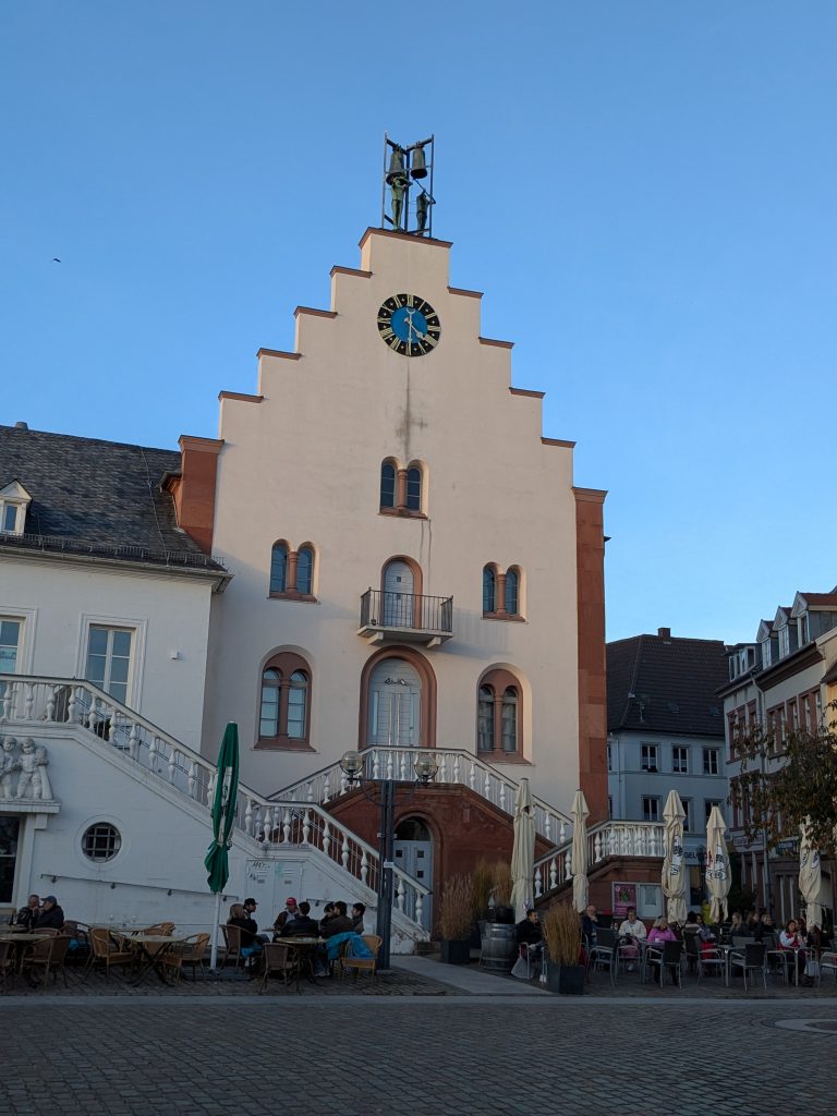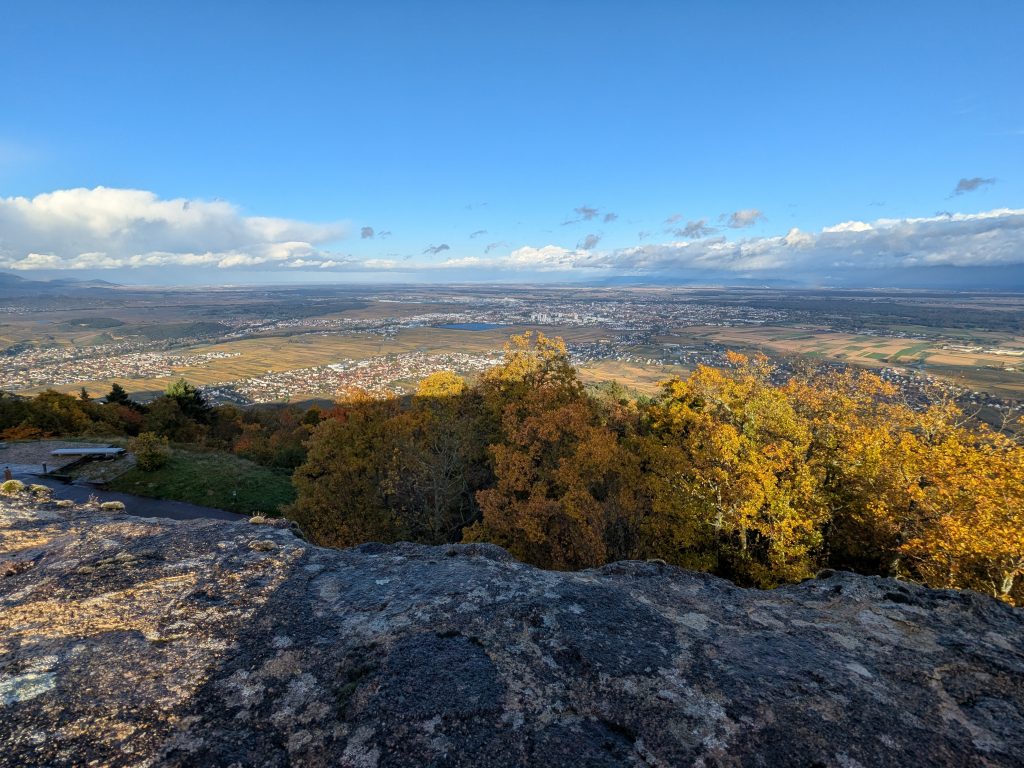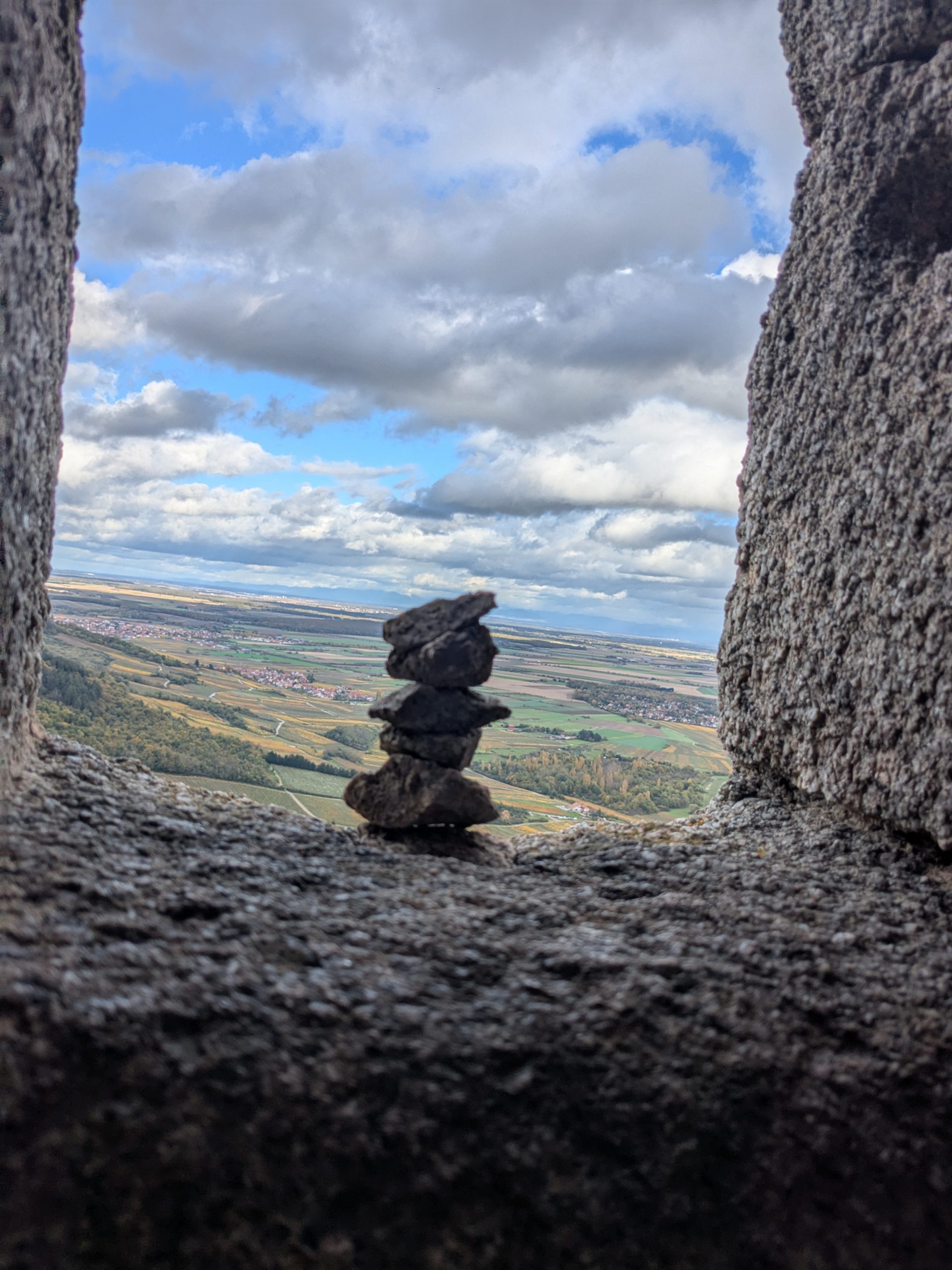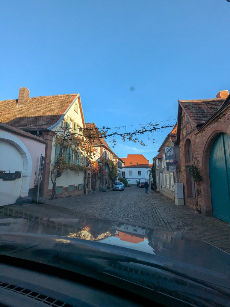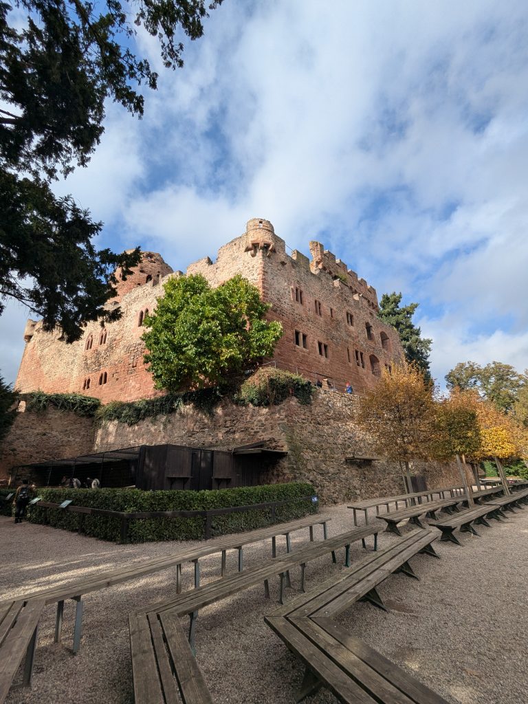 Heute ist Abreise, wir wollen ganz gemächlich wieder Richtung Heimat aufbrechen. Ralf bekommt von den ganzen niedlichen Dörfern hier Sodbrennen. 😉 und wir wollen uns auch evtl. noch mit Larissa in Wiesbaden treffen. Also klingelt der Wecker um 8:00. Ich bin aber schon vorher wach und werde mit super Morgenstimmung begrüßt. Um 10:30 Uhr starten wir dann. Erstmal wieder zur Raststätte Haut Koenigsbourg, Gas und Benzin tanken. Dann noch schnell den Bongo entleeren. Das haben wir bei der Entsorgung auf dem Campingplatz vergessen. Als nächstes gibt es ein Problem mit der Route. Google will uns partout über die Stadtautobahn durch Straßburg schicken. Dürfen wir aber ohne Crit’Air-Vignette nicht. Als ganz old school aufpassen und die richtige Autobahn nehmen. Gleich darauf wissen wir auch wo das Problem lag. Die Autobahn die wir nehmen dürfen (A355) kostet Maut und wir hatten Maut vermeiden eingeschaltet. Dann erreichen wir die Grenze und damit die Zollkontrolle! Ja, es gibt sie wieder, es lebe Europa 🙁 und kaum zurück in Deutschland haben wir endlich wieder einen Stau! Wie haben wir das vermisst. Bei Rhodt unter Riedburg finden wir einen Stellplatz ohne Alles, dafür mit Aussicht direkt in den Weinbergen. Es kostet 10 Euro, bezahlen wir per App PayByPhone. 2022 haben wir hier schon auf einem anderen Platz übernachtet, deshalb geht es auch gleich zum Chinesen in Edenkoben, den wir bereits kennen. Danach starten wir nach Landau in der Pfalz. Hier geht verkehrstechnisch gar nichts, aber irgendwann haben wir den Dicken geparkt und laufen los, um ein paar Labcaches zu machen. Es gibt zwar ein paar ganz nette Momente, aber im Großen und Ganzen: Landau kann man machen, muss man aber nicht. Eine Altstadt gibt es nicht so wirklich, ist wohl bei einem Großbrand 1689 abgefackelt. Also, ab zum Wobi, relaxen und schmökern durch den neuen „Asterix in Lusitanien“ 😉 .