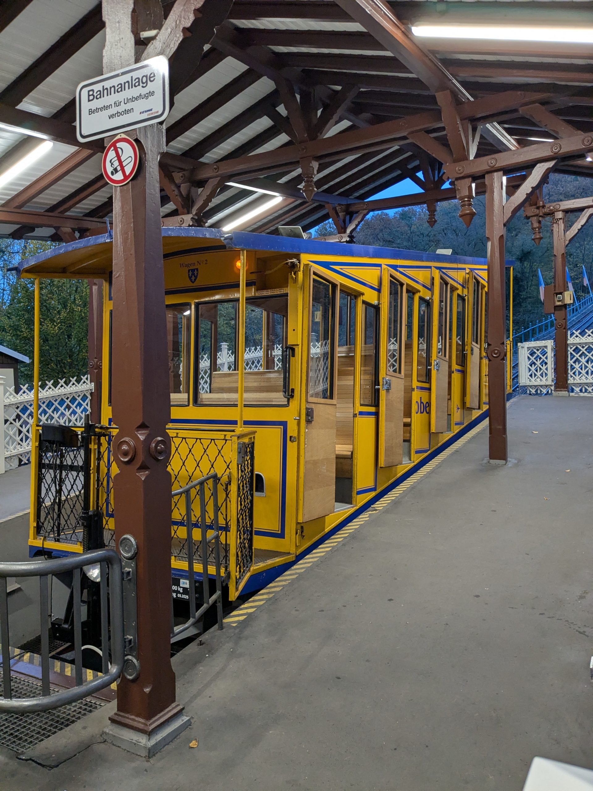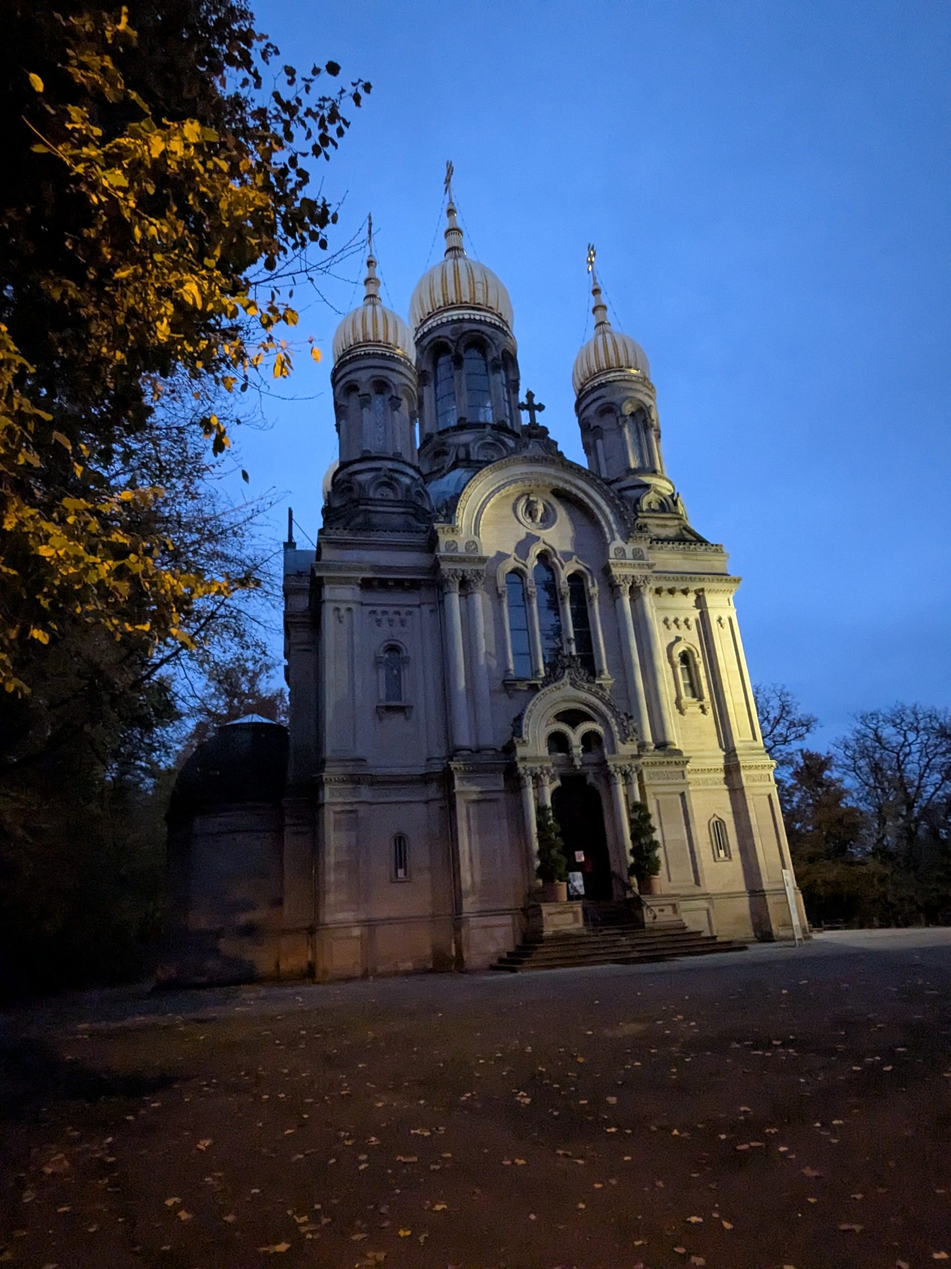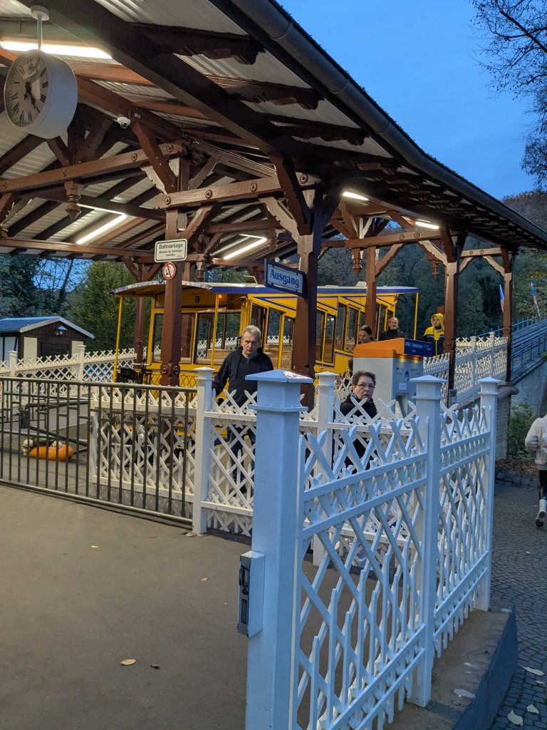 Die Nacht war ruhig, nur der Wecker um 8:00 stört die Idylle. Hilft nichts, wir sind nachher in Wiesbaden mit Larissa verabredet. Ein Schlafplätzchen ist schnell online in Eppstein (2 Dörfer neben Larissas) gebucht. Ganz entspannt geht es über die Autobahn nach Niedernhausen. Hier gibt es einen Mittags-Döner, bevor wir kurz nach 14:00 im Projekt Eppstein einchecken. Der Empfang ist super nett, der Platz schön am Berg gelegen, die Plätze terassiert, leider ist unserer ganz oben. Google würde den Weg „größtenteils flach“ nennen ?. Es geht jedenfalls gut bergan, ca. 65 Höhenmeter. Wohnwagen werden hier grundsätzlich mit dem Trecker hochgezogen. Dafür ist die Aussicht gut und der Stellplatz (38 €) hat sogar eine Gepflasterte Ecke für die Tür. Die Sanies sind neu und super sauber. Also nichts zu meckern, außer dass wir nachher den ganzen Berg wieder hoch laufen müssen. Der Dicke parkt unten vor dem Platz. Um 17:00 sammeln wir Larissa vor dem Statistischen Bundesamt in Wiesbaden ein und fahren zur Nerobergbahn. Die ist von 1888 und total niedlich. Gemütlich geht es den Berg 438 m hoch. Oben gibt es einen Pseudotempel, eine russisch orthodoxe Kirche und eine schöne Aussicht auf Wiesbaden. Dann wieder bergab, und ab zum Inder. Auf der Rückfahrt treffen wir jede Menge Monster, Zombies, Geister und was sich sonst noch so an Halloween herumtreibt. Ist echt viel hier, wir waren die letzten Jahre immer irgendwo im nirgendwo, keine Ahnung was so in Hannover ab geht. Auf der Landstraße hat es dann auf der Gegenspur noch ein Wildschwein erwischt. Und dann noch der blöde Berg. Wir sind jedenfalls heilfroh, als wir endlich im Wobi auf dem Sofa sitzen.