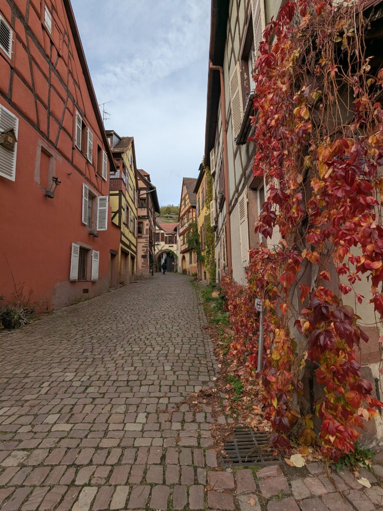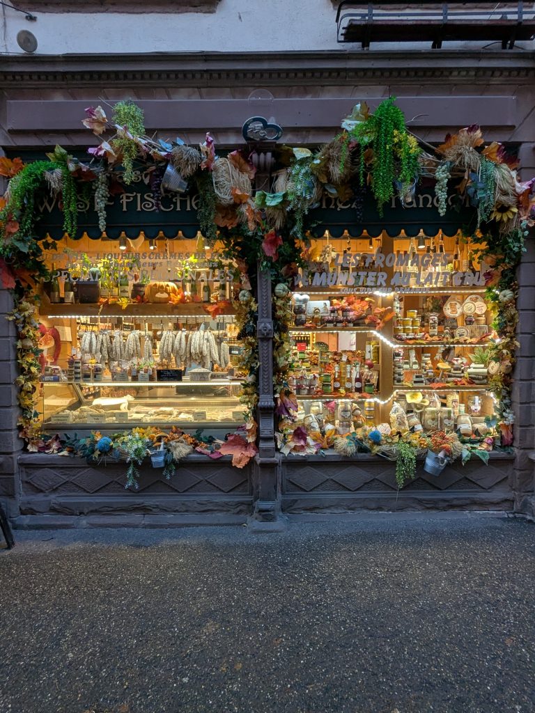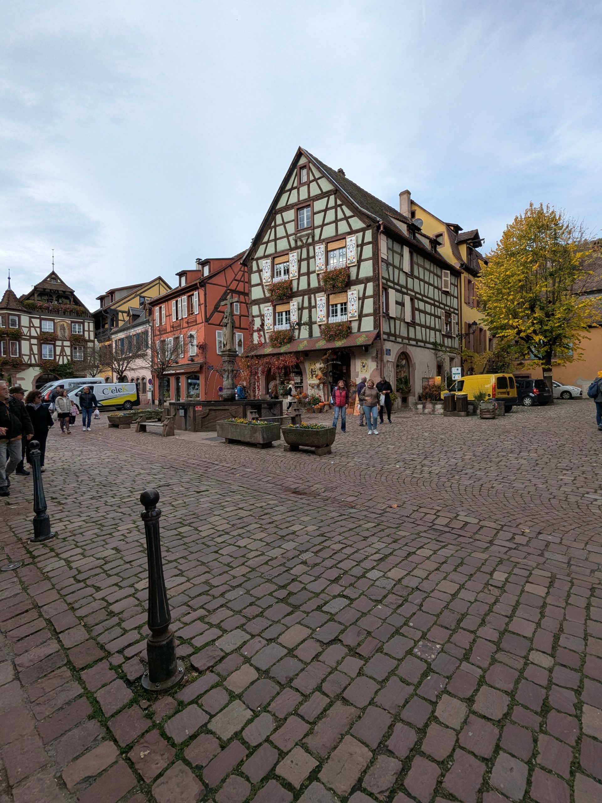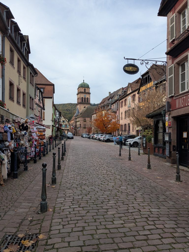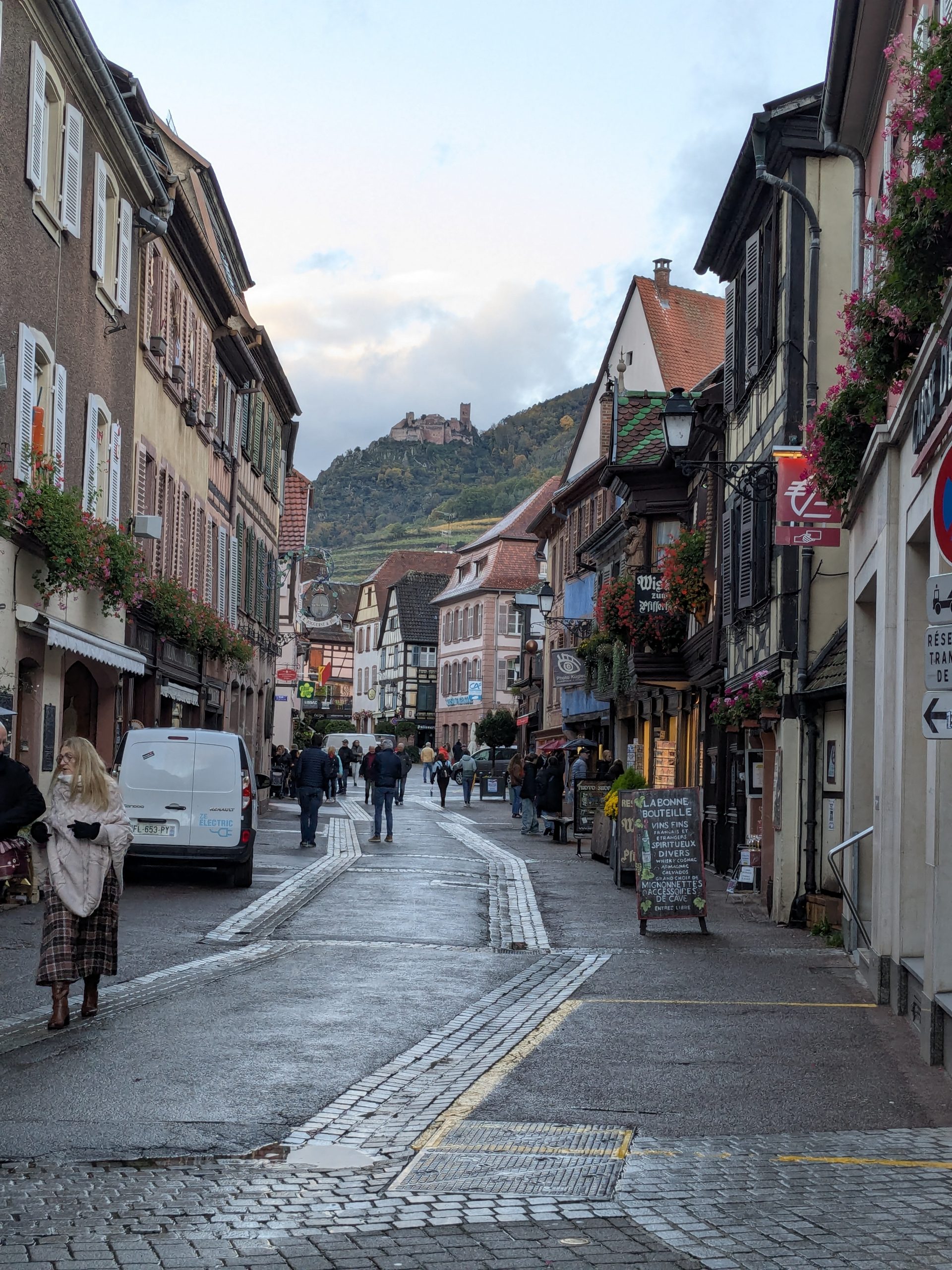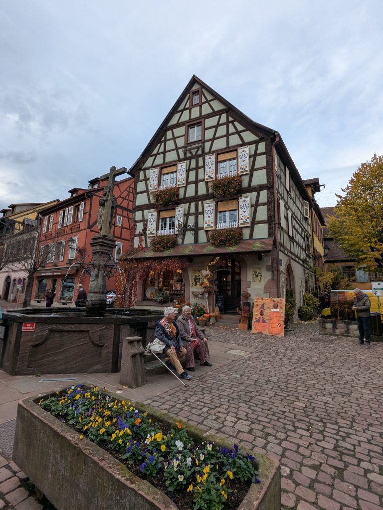 Wir haben lange geschlafen und zum Mittag gefrühstückt bevor wir nach Kaysersberg aufbrechen. Hier waren wir zwar 2022 schon, aber wir wollen es uns noch einmal ansehen. Ich muss Ralf aber hoch und heilig versprechen, dass wir nicht zur Burg hochsteigen. Nach kurzer Fahrt lässt der Parkplatz böses erahnen. Mit Mühe quetschen wir den Dicken in die letzte Parklücke. Das kann ja heiter werden. Doch schon ein paar Schritte weiter bemerken wir, dass es gar nicht so schlimm ist. Es ist wirklich nicht sehr voll. Wir schlendern durch die Straßen, bis hin zum Schweitzer Center. Hat nichts mit den Eidgenossen zu tun, liegt neben dem Geburtshaus von gleichnamigen Albert. Dann schlendern wir zurück und begeben uns auf die Suche nach etwas Essbaren. Aber es gibt wieder mal nur Tarte für viel Geld und jede Menge Süsskram für noch mehr Geld. 10 Macarons für 22,-€, und komische Minigebäckkugeln in Alkohol, Gugelhupfe, Früchte-, Honig- und Gewürzbrot und Lebkuchen, aber nicht mal ein normales Pain au chocolate oder ein belegtes Baguette. Aus lauter Verzweiflung essen wir schließlich etwas Gewürzbrot mit Blaubeeren. Und ich kaufe für ein Vermögen Trüffelkäse zum Abendessen. Dann geht es noch einmal fix in den Intermaché und dann zurück zum Campingplatz.