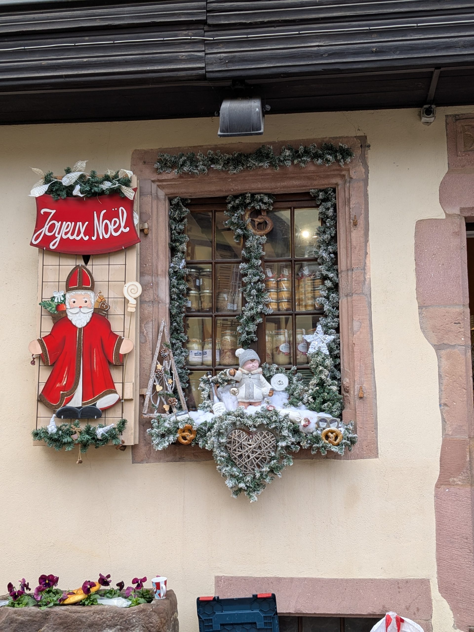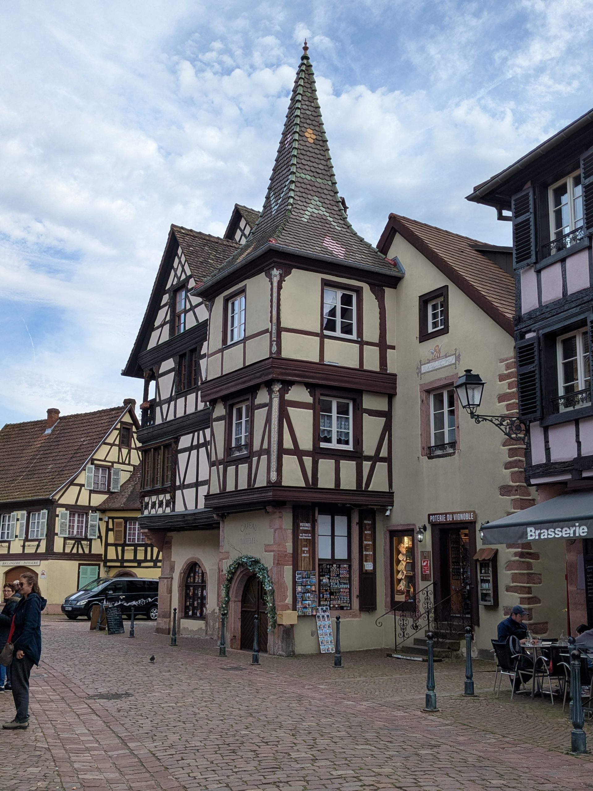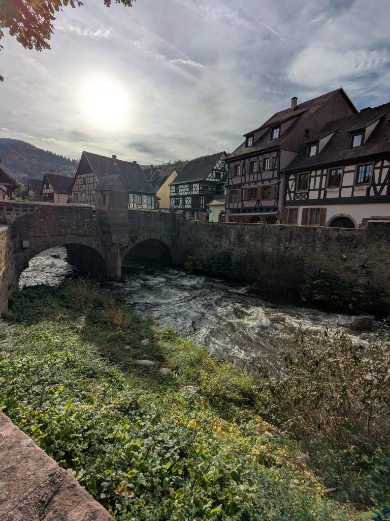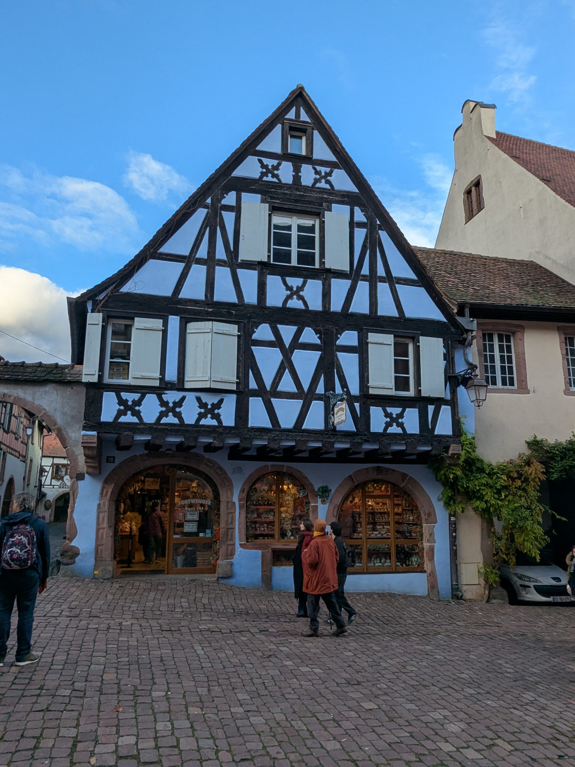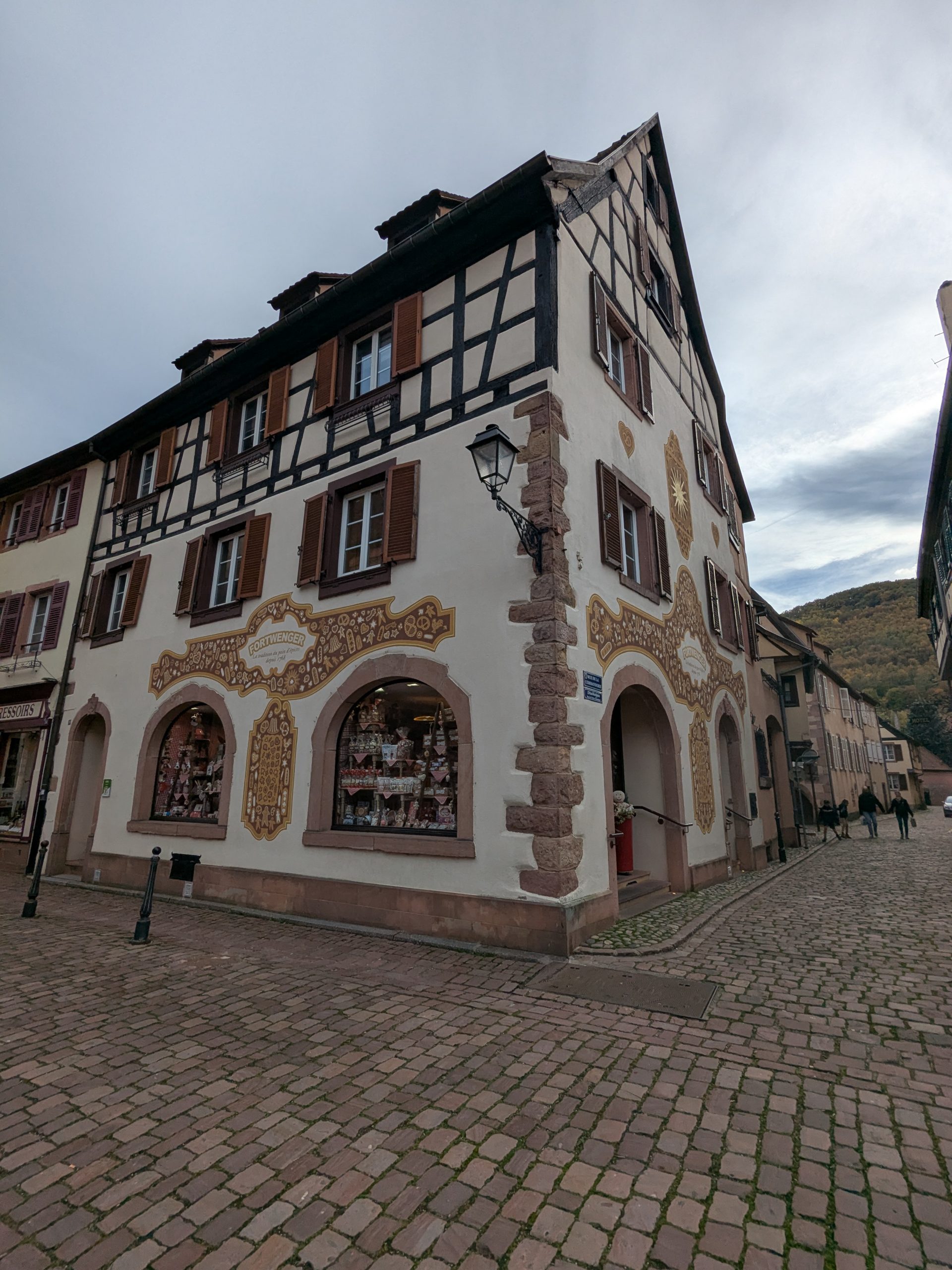 Wir haben lange geschlafen und zum Mittag gefrühstückt bevor wir nach Kaysersberg aufbrechen. Hier waren wir zwar 2022 schon, aber wir wollen es uns noch einmal ansehen. Ich muss Ralf aber hoch und heilig versprechen, dass wir nicht zur Burg hochsteigen. Nach kurzer Fahrt lässt der Parkplatz böses erahnen. Mit Mühe quetschen wir den Dicken in die letzte Parklücke. Das kann ja heiter werden. Doch schon ein paar Schritte weiter bemerken wir, dass es gar nicht so schlimm ist. Es ist wirklich nicht sehr voll. Wir schlendern durch die Straßen, bis hin zum Schweitzer Center. Hat nichts mit den Eidgenossen zu tun, liegt neben dem Geburtshaus von gleichnamigen Albert. Dann schlendern wir zurück und begeben uns auf die Suche nach etwas Essbaren. Aber es gibt wieder mal nur Tarte für viel Geld und jede Menge Süsskram für noch mehr Geld. 10 Macarons für 22,-€, und komische Minigebäckkugeln in Alkohol, Gugelhupfe, Früchte-, Honig- und Gewürzbrot und Lebkuchen, aber nicht mal ein normales Pain au chocolate oder ein belegtes Baguette. Aus lauter Verzweiflung essen wir schließlich etwas Gewürzbrot mit Blaubeeren. Und ich kaufe für ein Vermögen Trüffelkäse zum Abendessen. Dann geht es noch einmal fix in den Intermaché und dann zurück zum Campingplatz.
